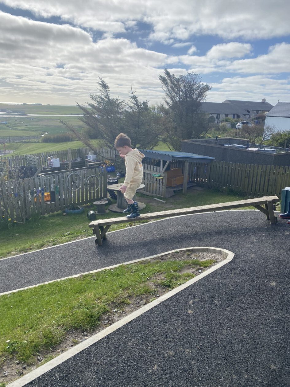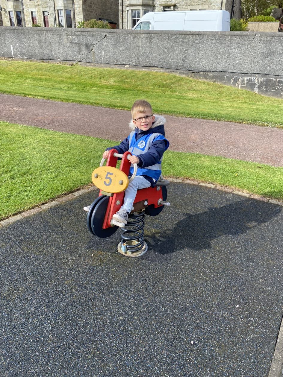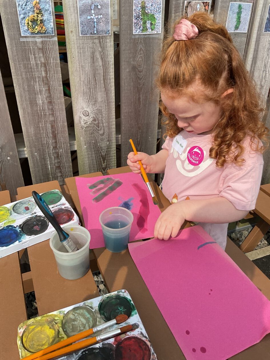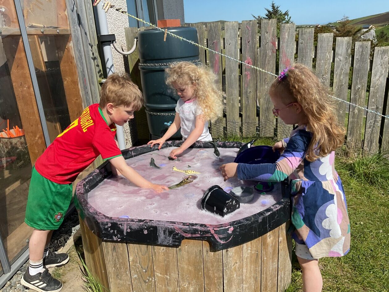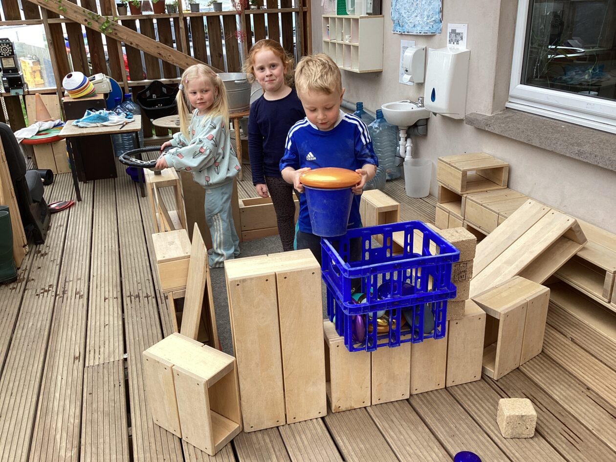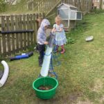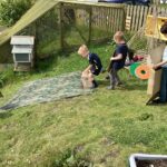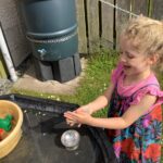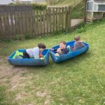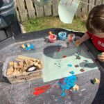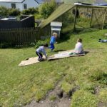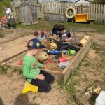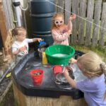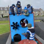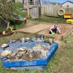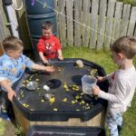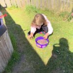 The bairns have been experimenting with different ways to slide down the steep hill in the garden. They have used cardboard, cushions, carpet tiles and slithery breeks! We have also seen lots of engagement with water play and managed to get the solar fountain working as the sun made a bit of a reappearance. We headed to the playpark one afternoon too and the bairns played chasing games, spun on the swings, tried to walk up the slide and got wobbly as jelly on a plate.