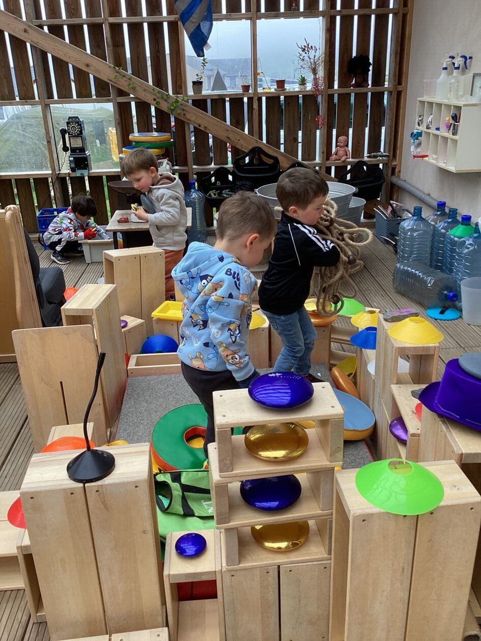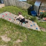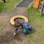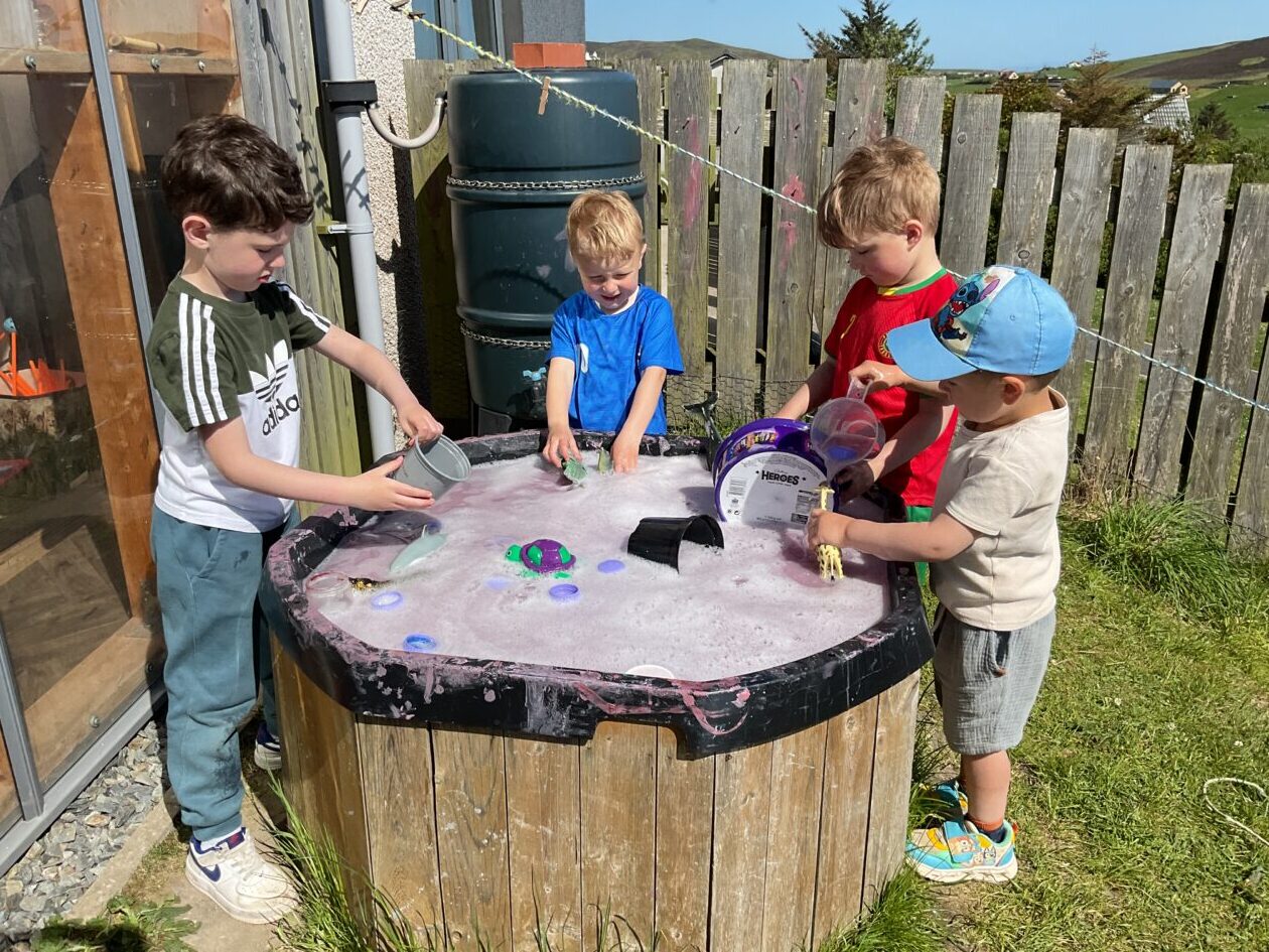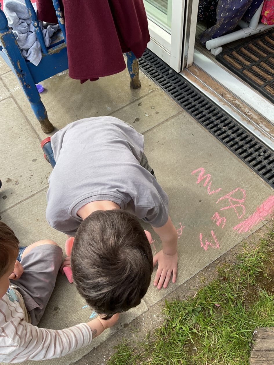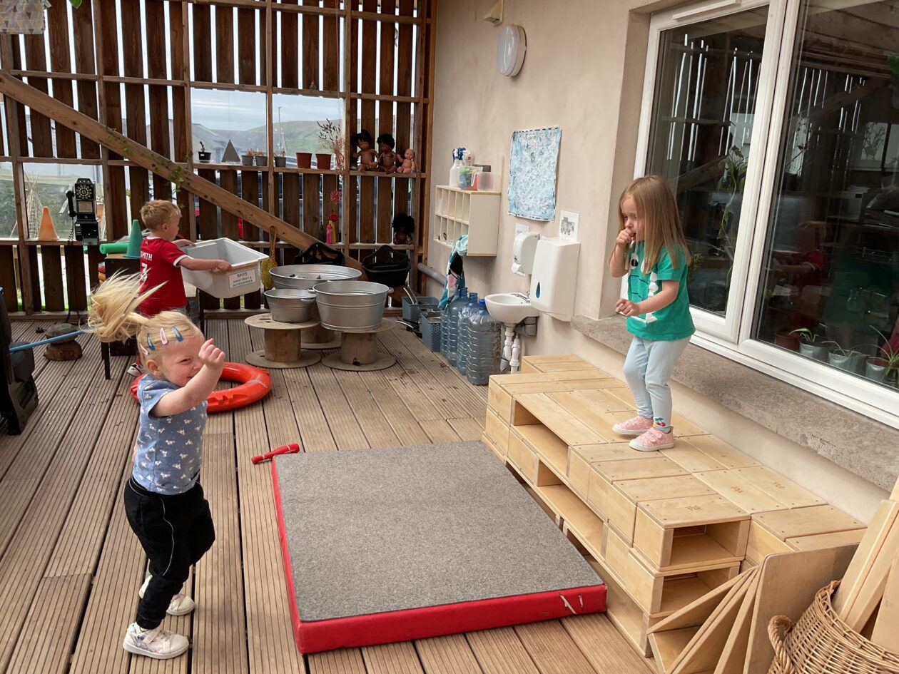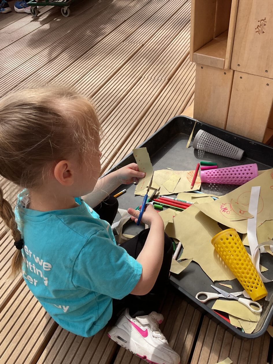 The bairns have been experimenting with different ways to slide down the steep hill in the garden. They have used cardboard, cushions, carpet tiles and slithery breeks! We have also seen lots of engagement with water play and managed to get the solar fountain working as the sun made a bit of a reappearance. We headed to the playpark one afternoon too and the bairns played chasing games, spun on the swings, tried to walk up the slide and got wobbly as jelly on a plate.