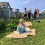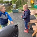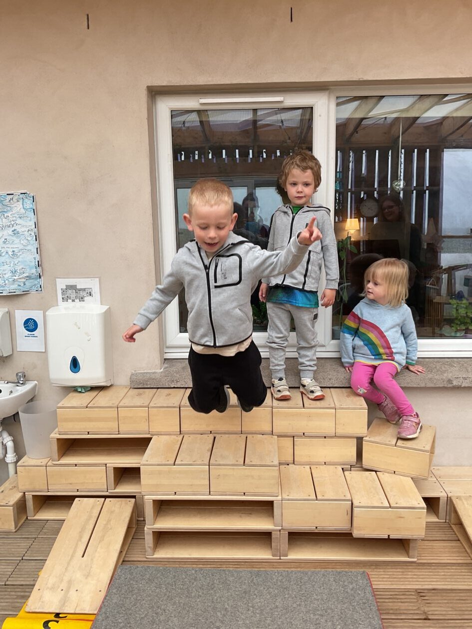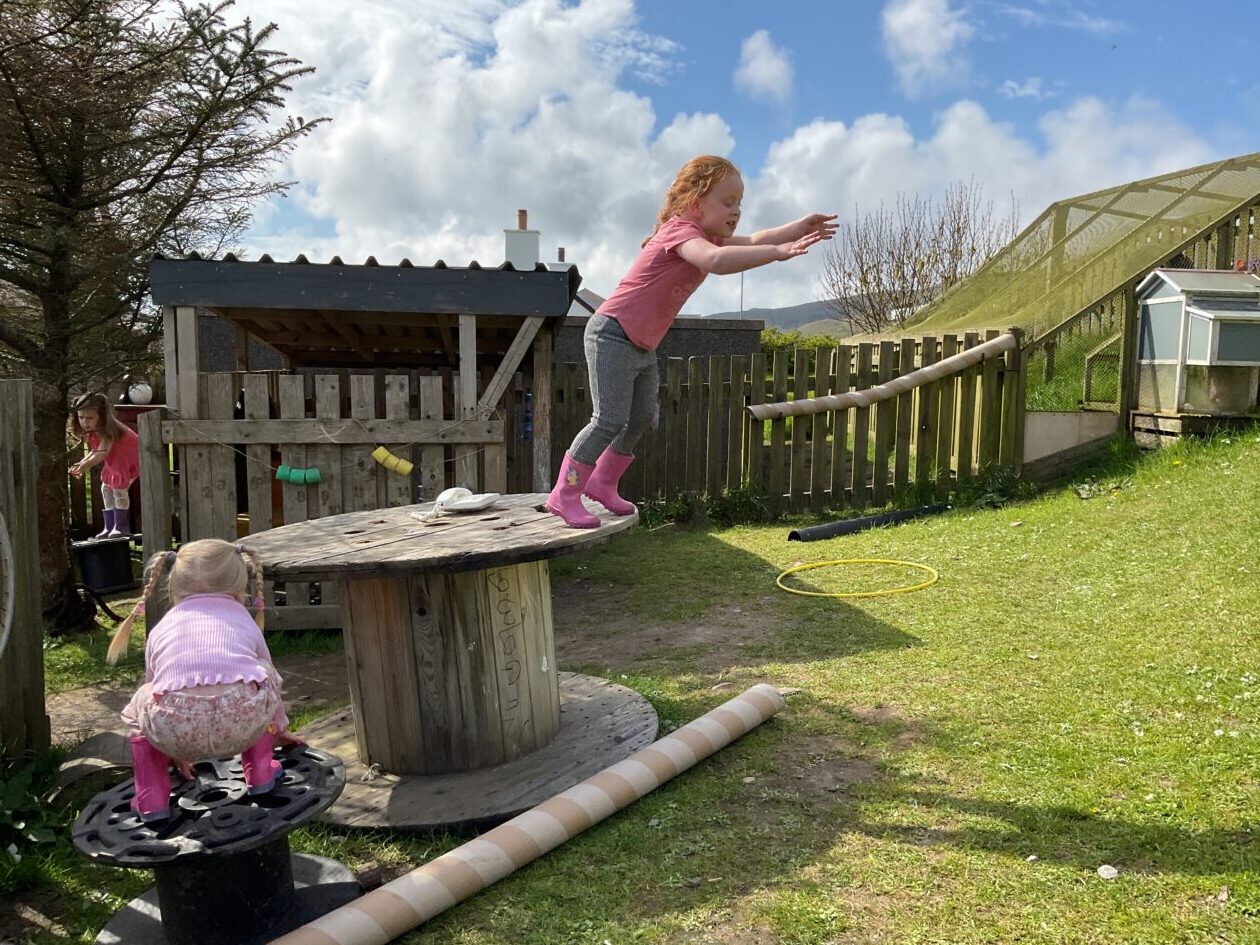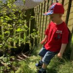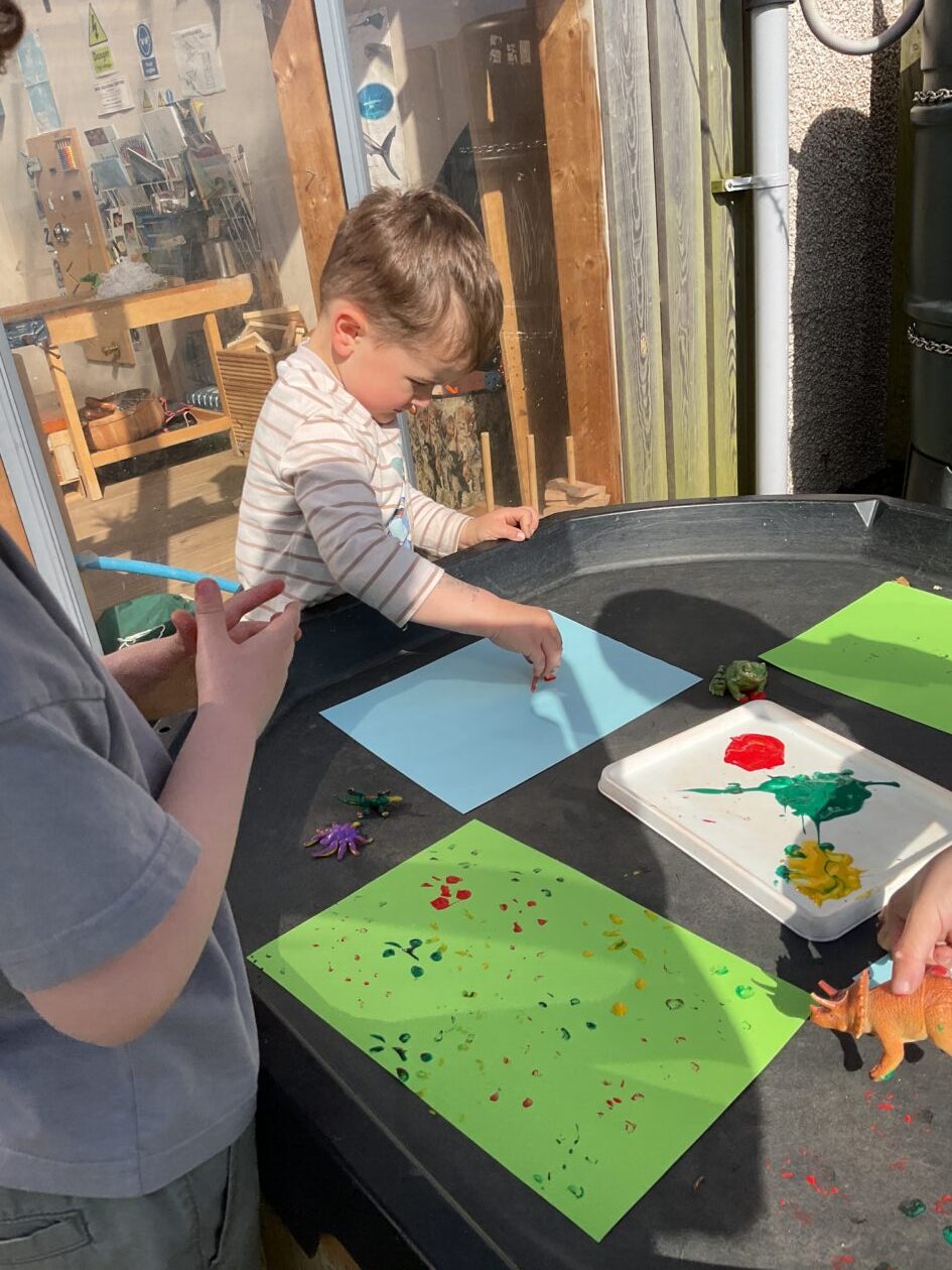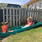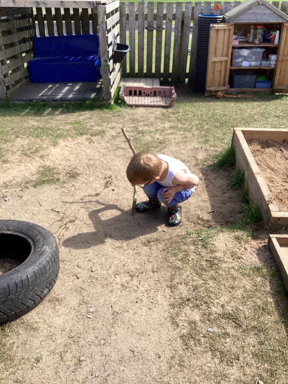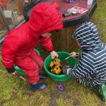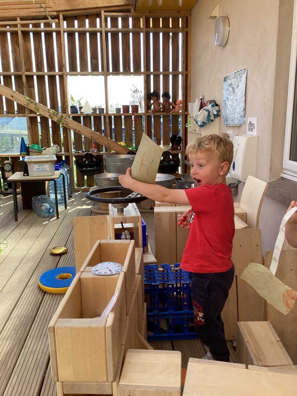 The bairns have been experimenting with different ways to slide down the steep hill in the garden. They have used cardboard, cushions, carpet tiles and slithery breeks! We have also seen lots of engagement with water play and managed to get the solar fountain working as the sun made a bit of a reappearance. We headed to the playpark one afternoon too and the bairns played chasing games, spun on the swings, tried to walk up the slide and got wobbly as jelly on a plate.