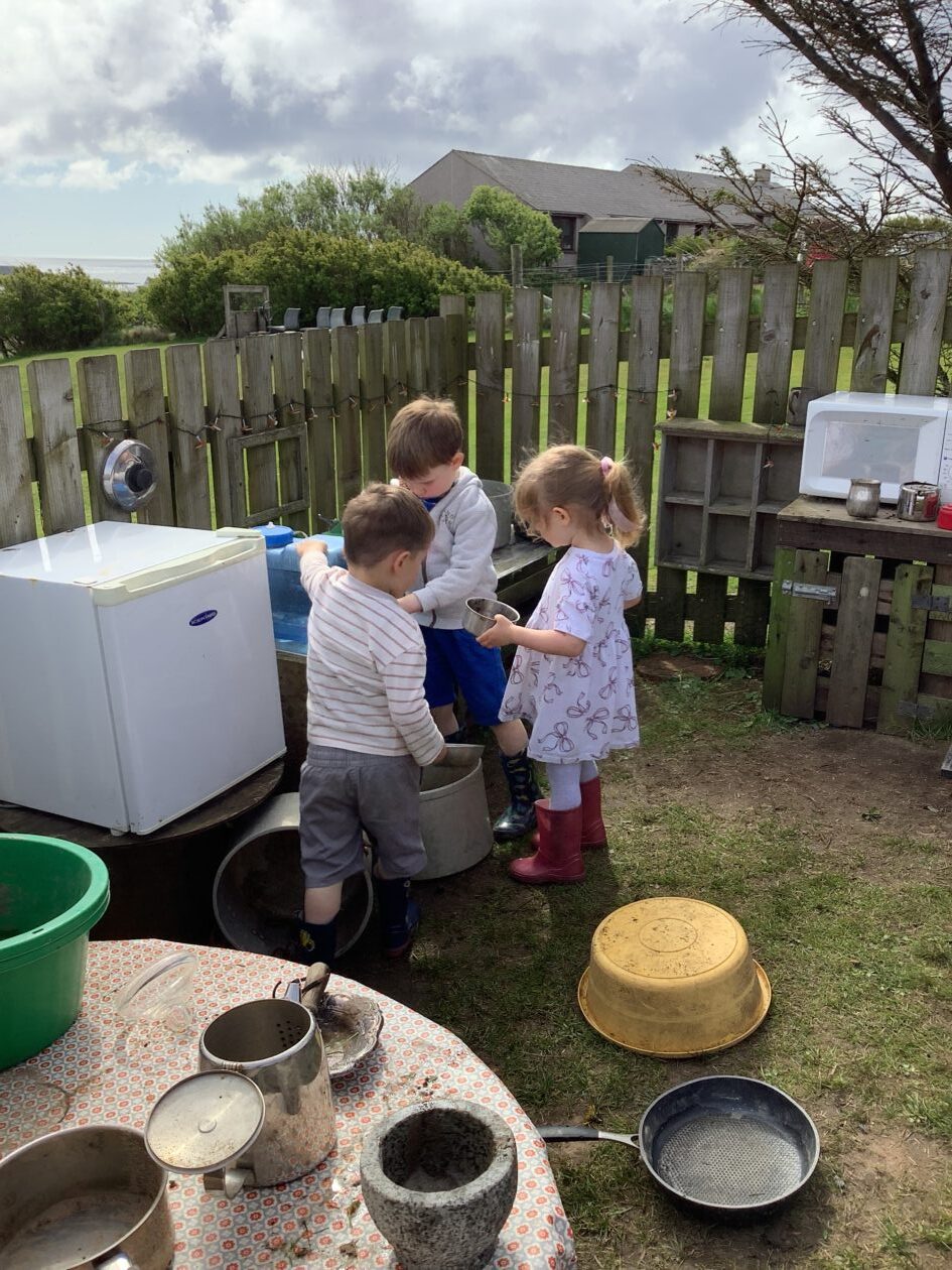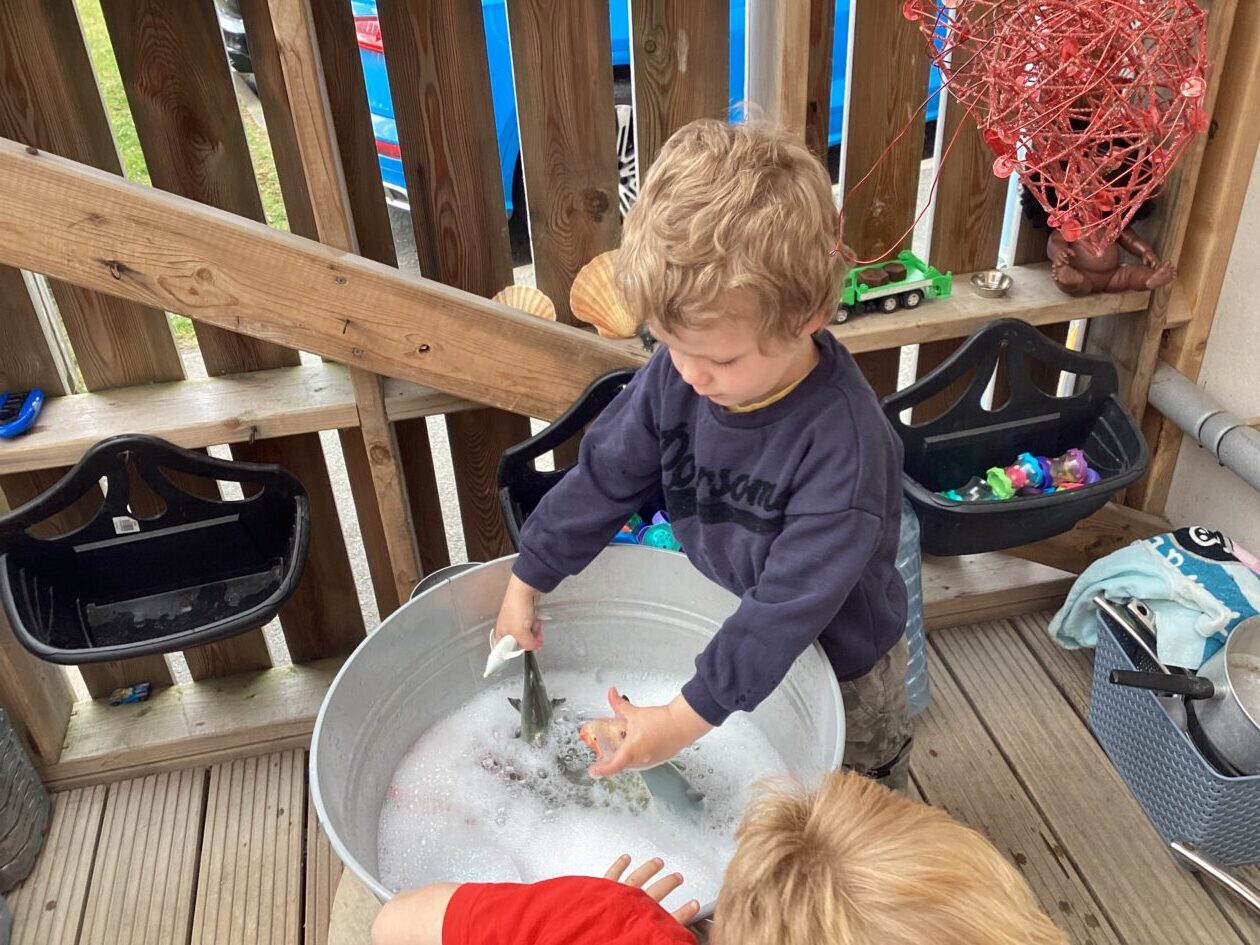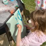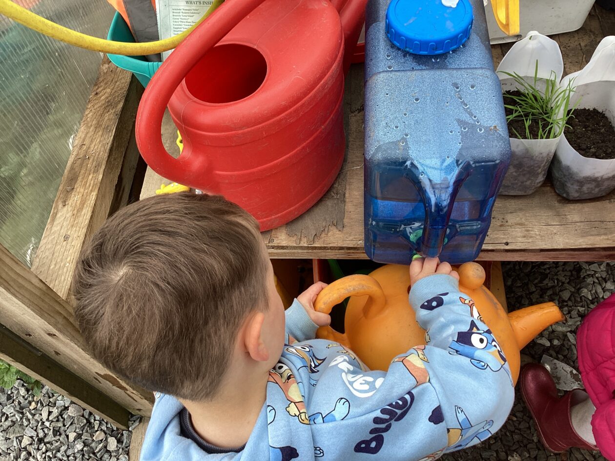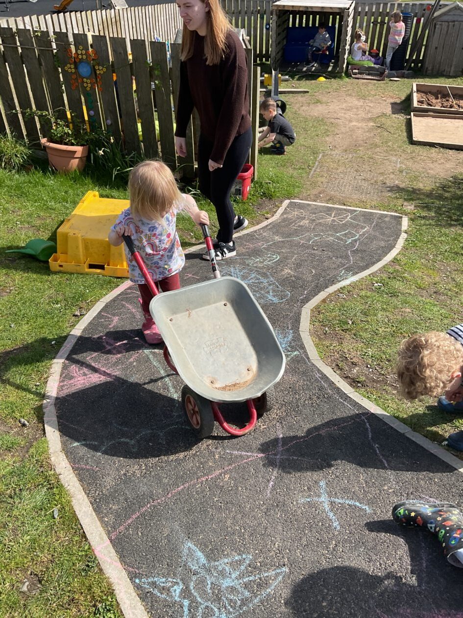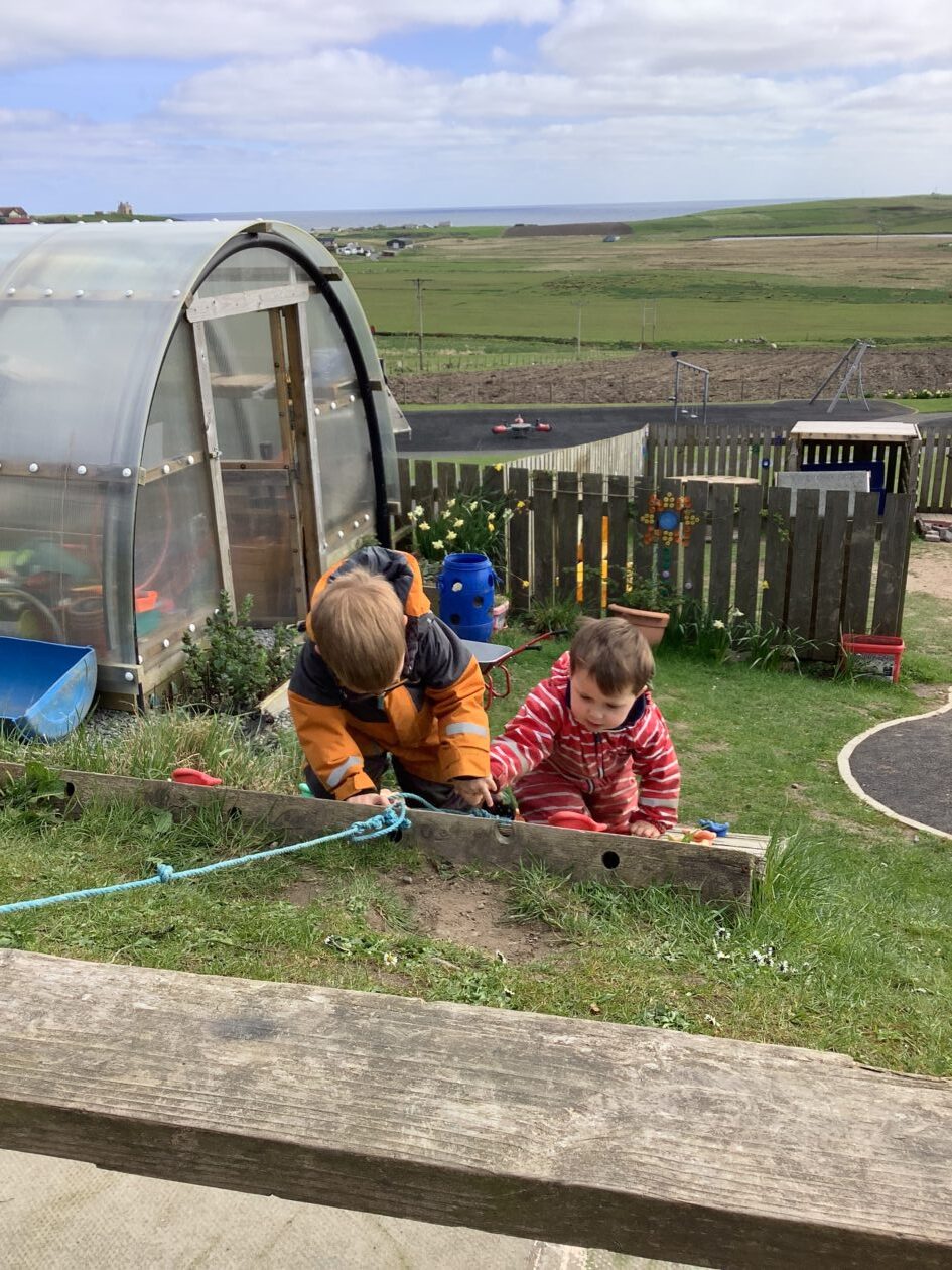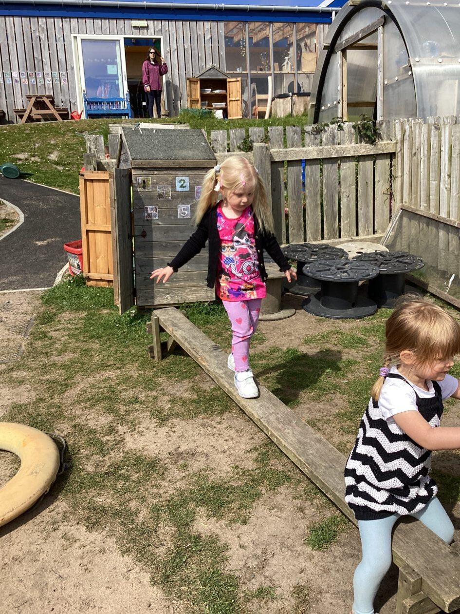 The bairns have been experimenting with different ways to slide down the steep hill in the garden. They have used cardboard, cushions, carpet tiles and slithery breeks! We have also seen lots of engagement with water play and managed to get the solar fountain working as the sun made a bit of a reappearance. We headed to the playpark one afternoon too and the bairns played chasing games, spun on the swings, tried to walk up the slide and got wobbly as jelly on a plate.