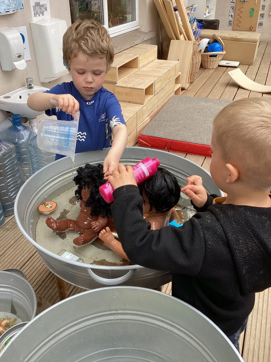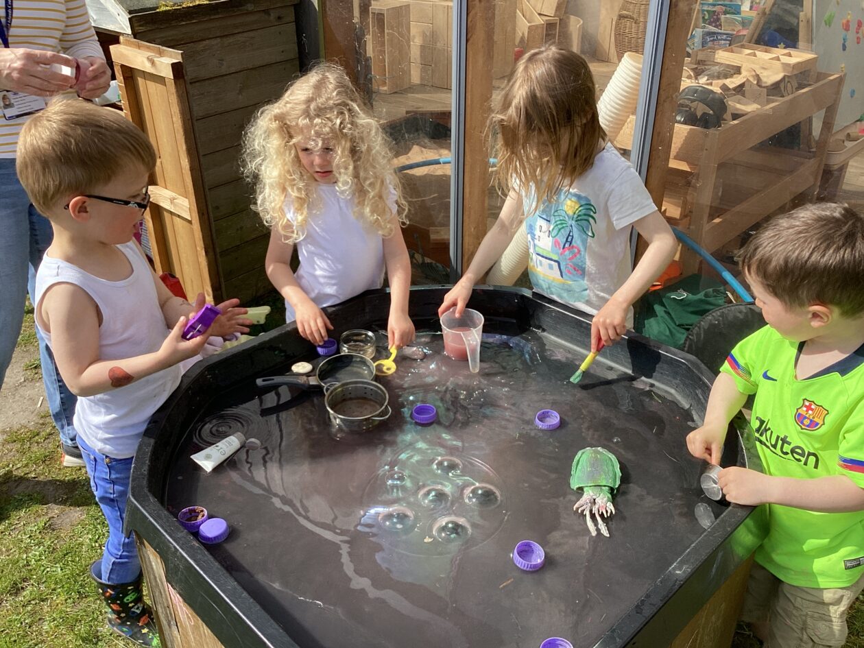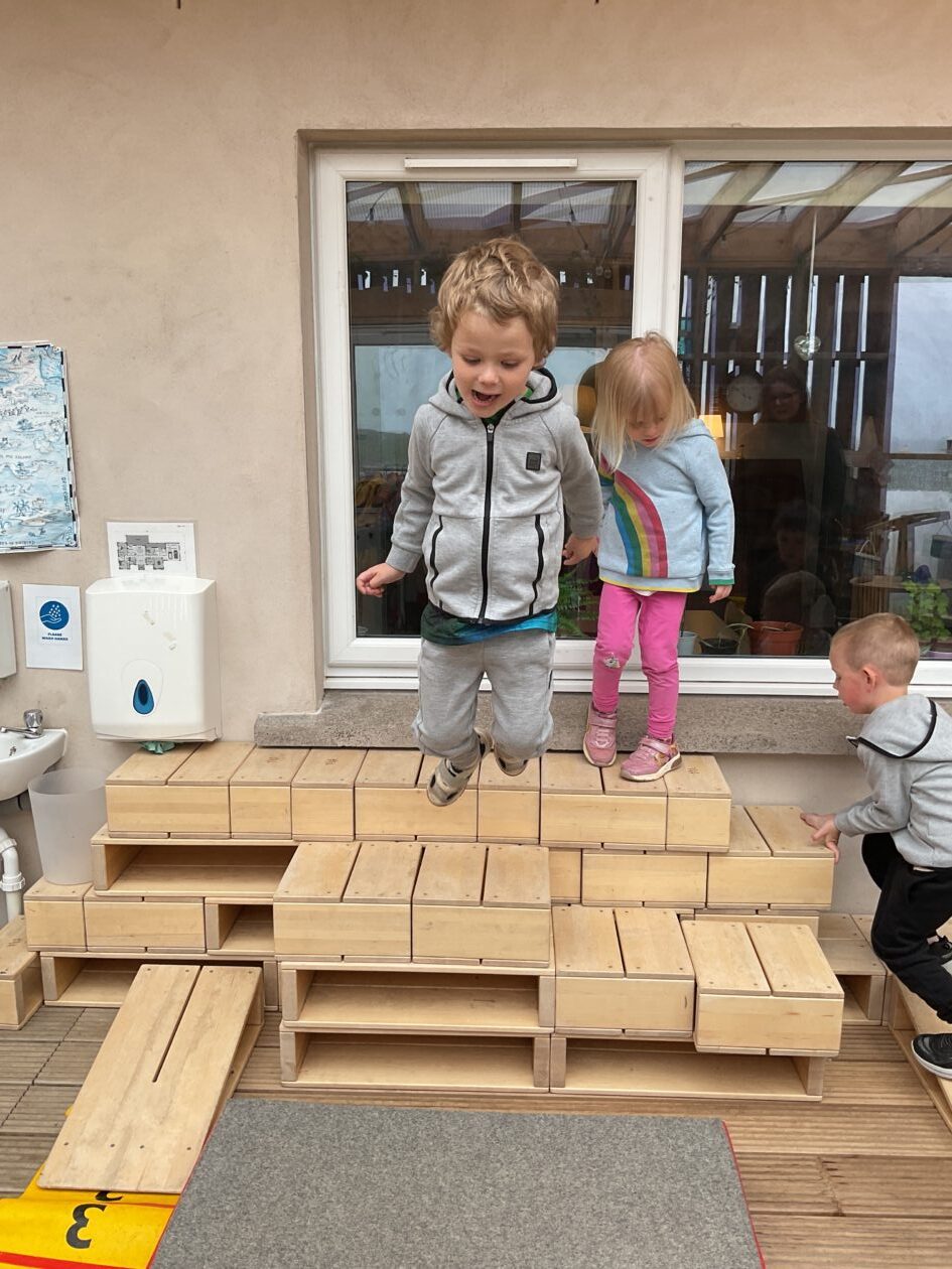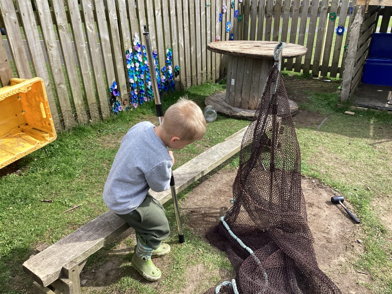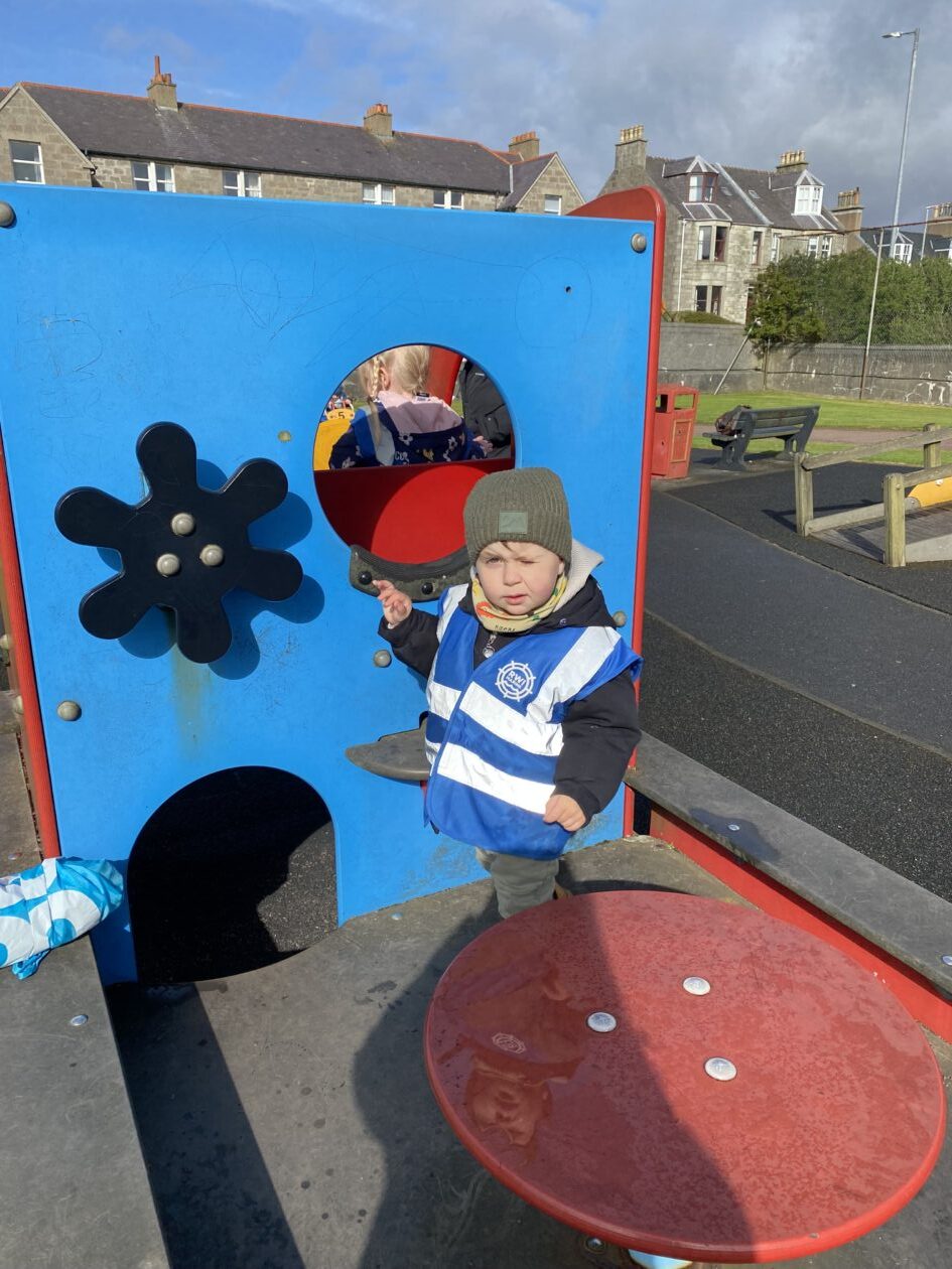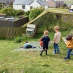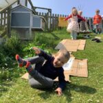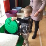 The bairns have been experimenting with different ways to slide down the steep hill in the garden. They have used cardboard, cushions, carpet tiles and slithery breeks! We have also seen lots of engagement with water play and managed to get the solar fountain working as the sun made a bit of a reappearance. We headed to the playpark one afternoon too and the bairns played chasing games, spun on the swings, tried to walk up the slide and got wobbly as jelly on a plate.