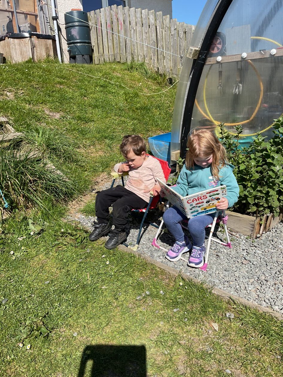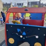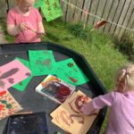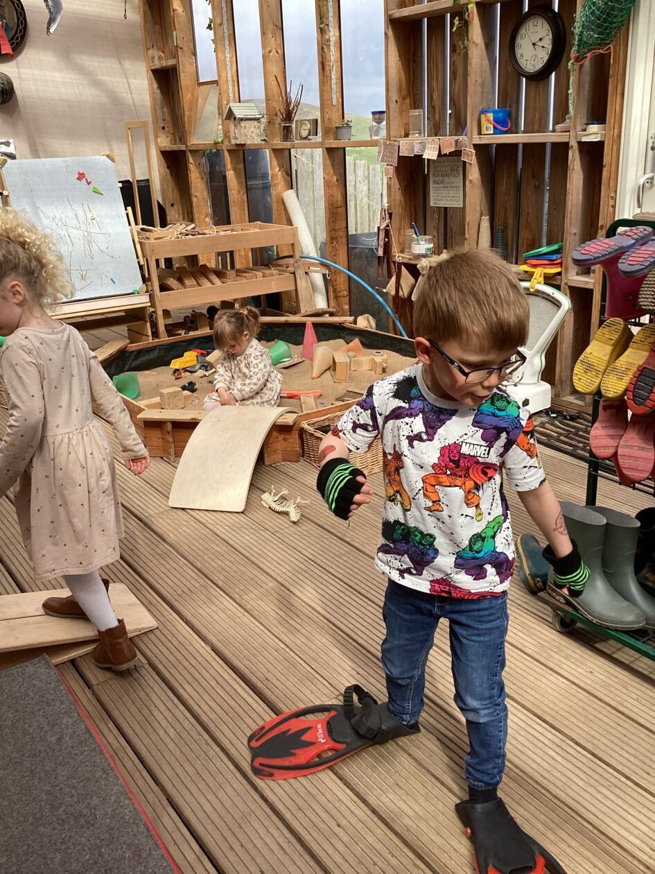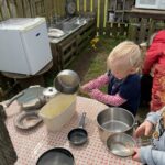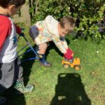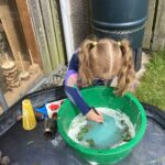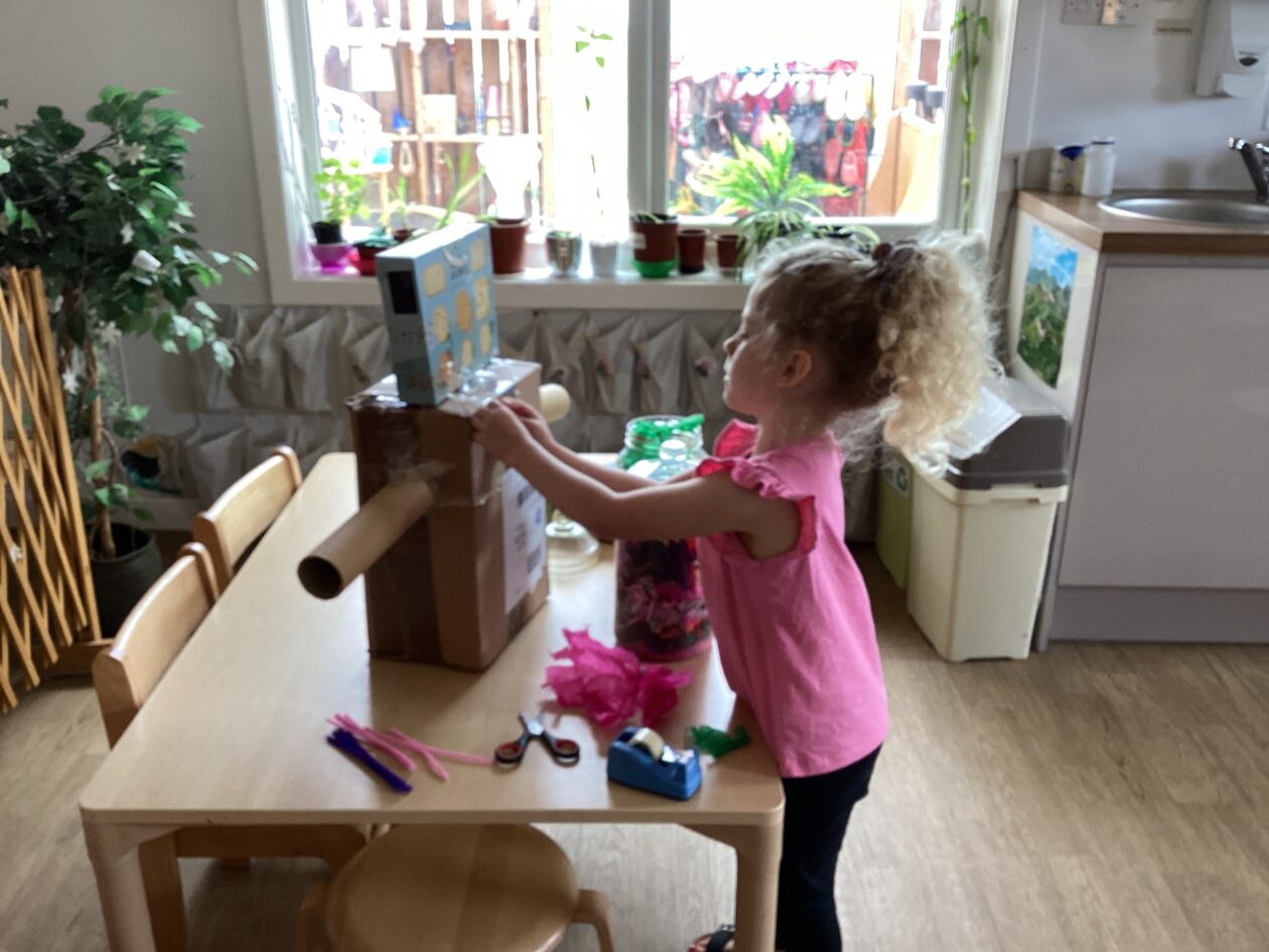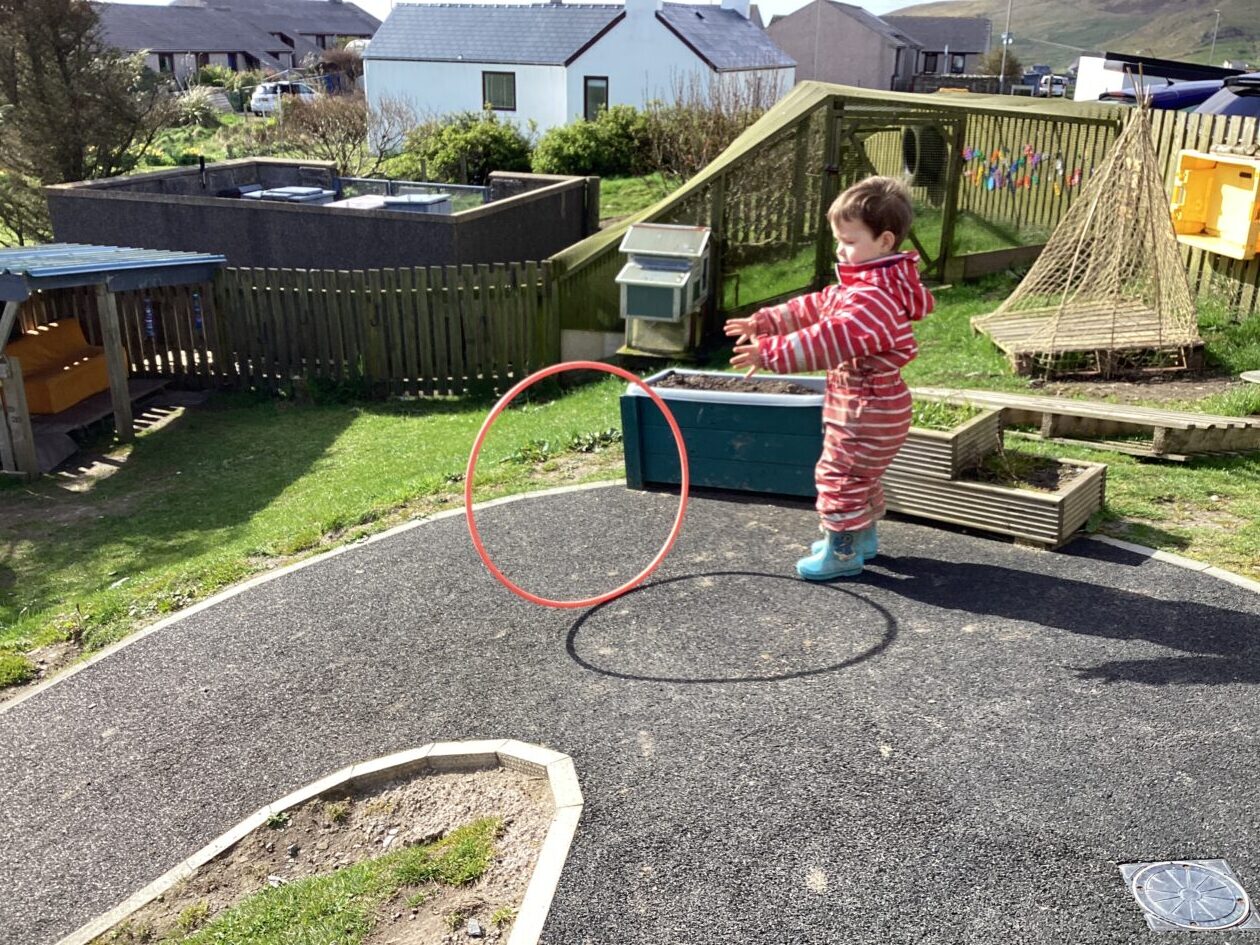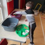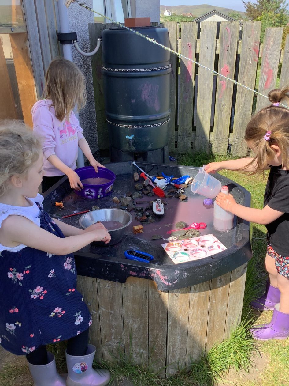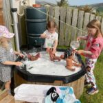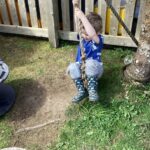 The bairns have been experimenting with different ways to slide down the steep hill in the garden. They have used cardboard, cushions, carpet tiles and slithery breeks! We have also seen lots of engagement with water play and managed to get the solar fountain working as the sun made a bit of a reappearance. We headed to the playpark one afternoon too and the bairns played chasing games, spun on the swings, tried to walk up the slide and got wobbly as jelly on a plate.