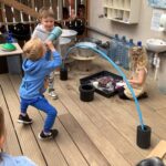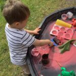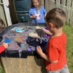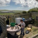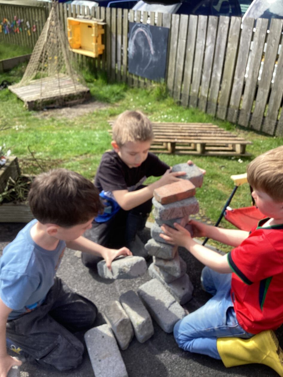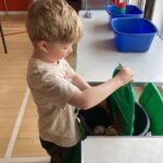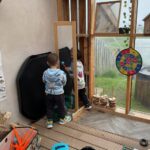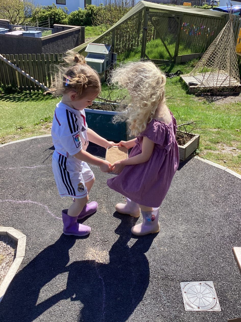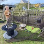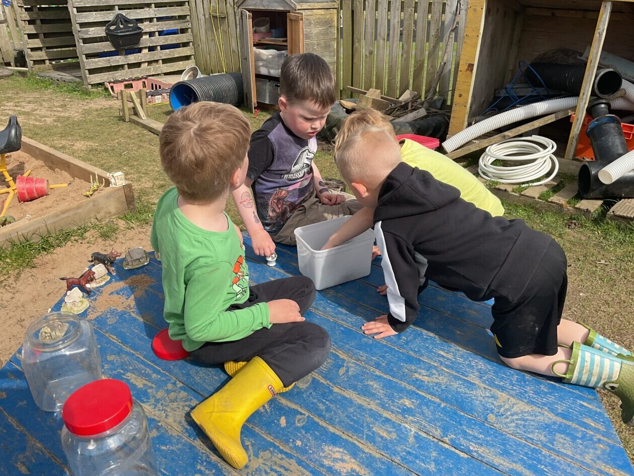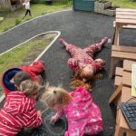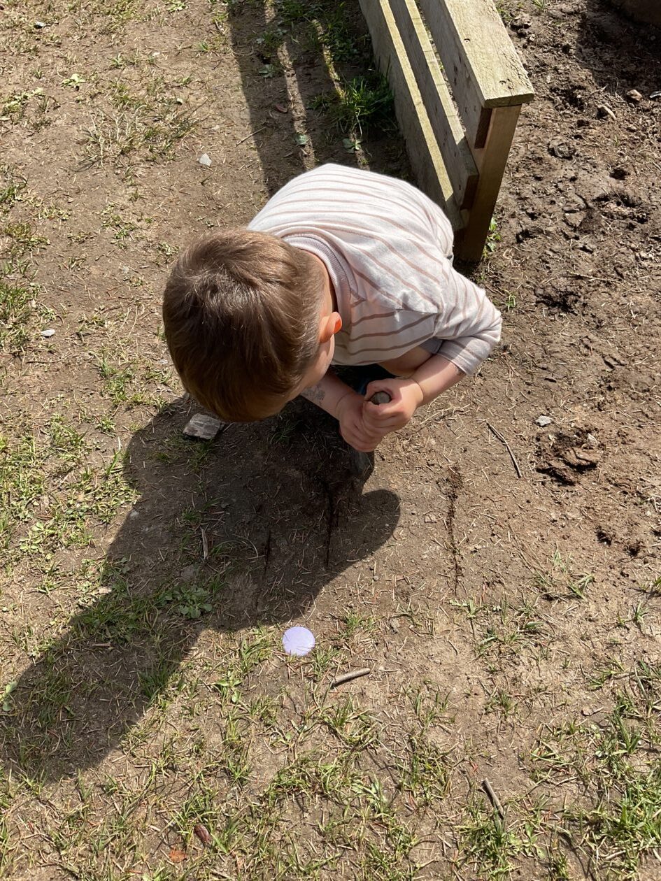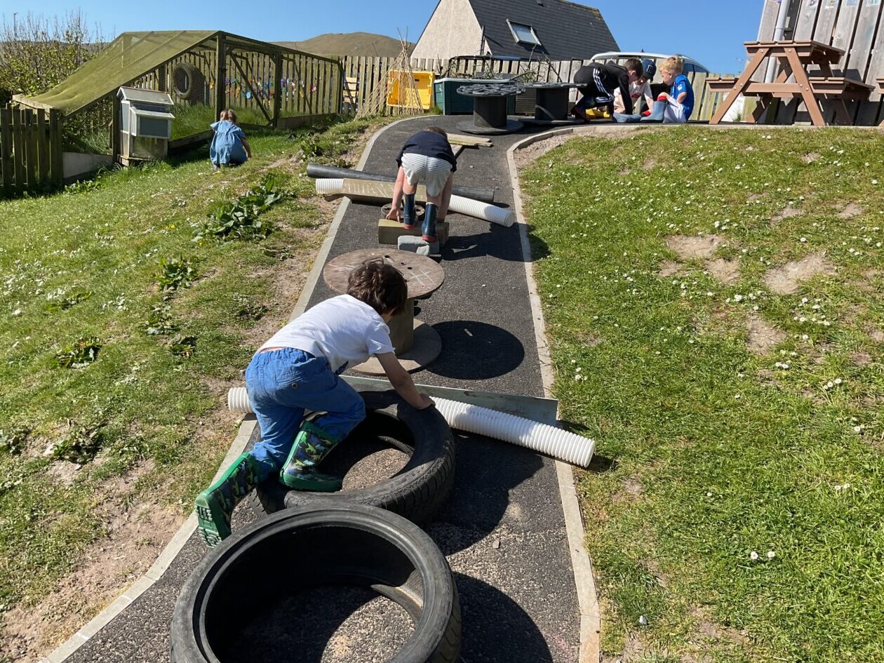 The bairns have been experimenting with different ways to slide down the steep hill in the garden. They have used cardboard, cushions, carpet tiles and slithery breeks! We have also seen lots of engagement with water play and managed to get the solar fountain working as the sun made a bit of a reappearance. We headed to the playpark one afternoon too and the bairns played chasing games, spun on the swings, tried to walk up the slide and got wobbly as jelly on a plate.