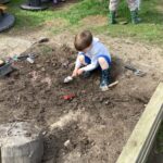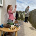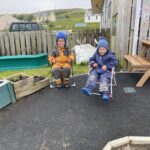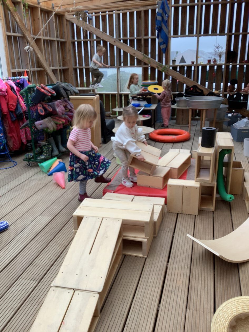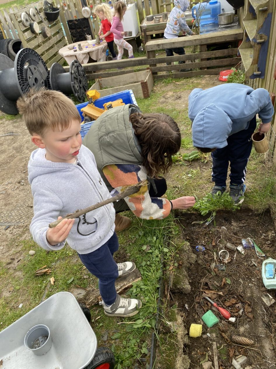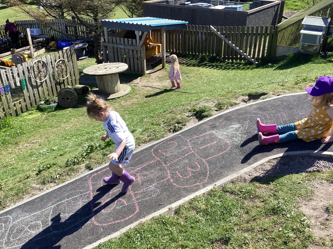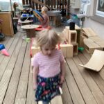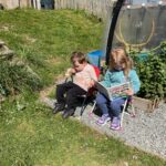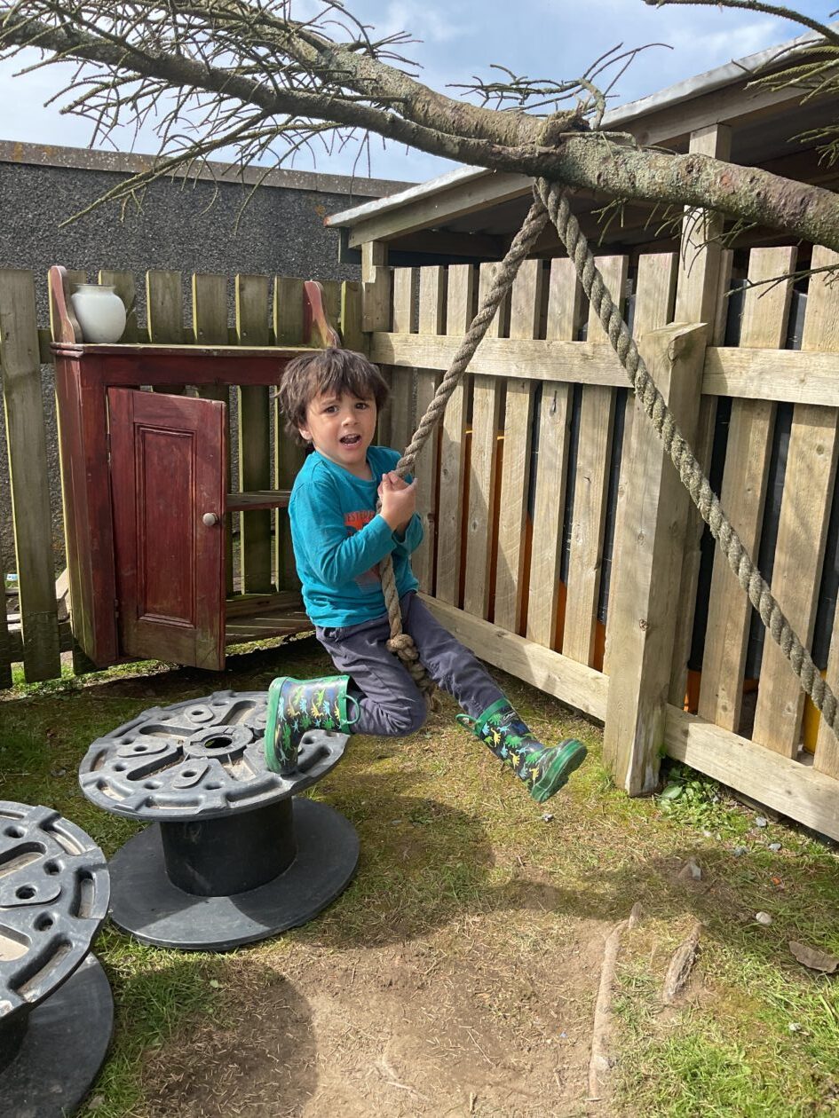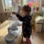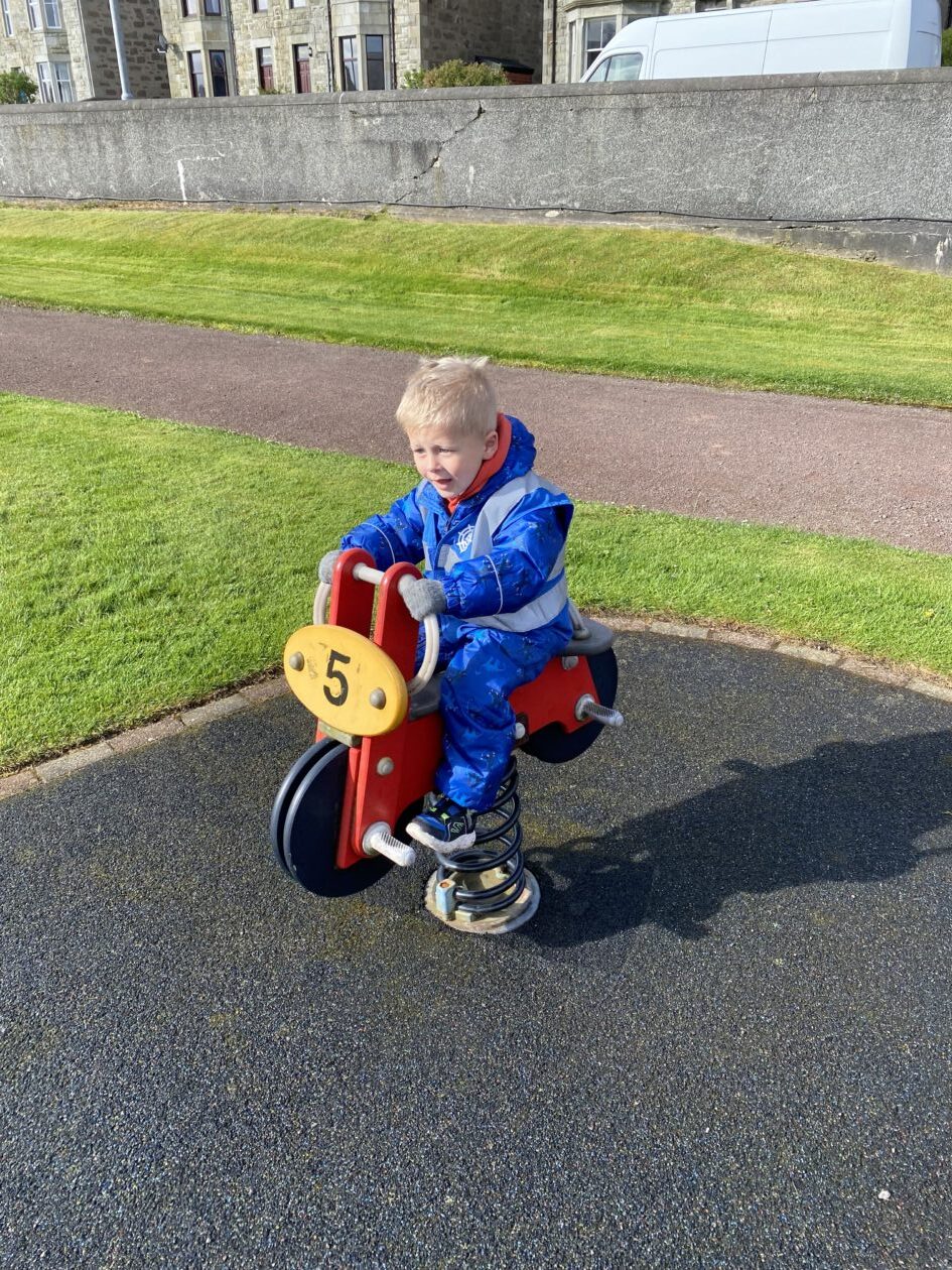 The bairns have been experimenting with different ways to slide down the steep hill in the garden. They have used cardboard, cushions, carpet tiles and slithery breeks! We have also seen lots of engagement with water play and managed to get the solar fountain working as the sun made a bit of a reappearance. We headed to the playpark one afternoon too and the bairns played chasing games, spun on the swings, tried to walk up the slide and got wobbly as jelly on a plate.