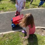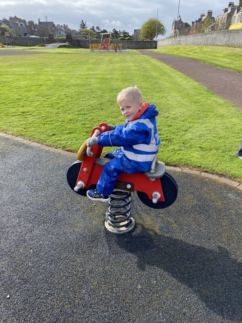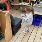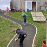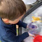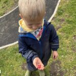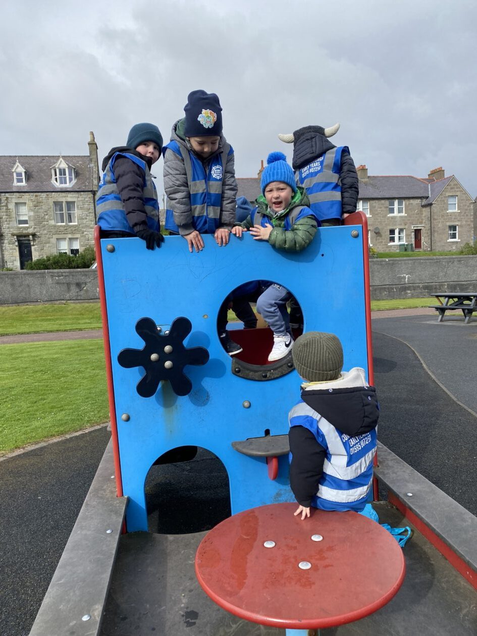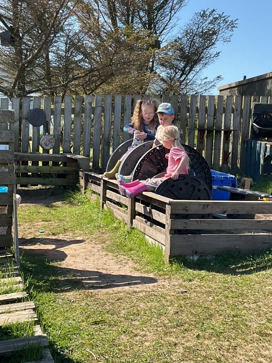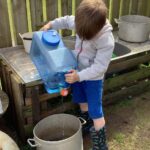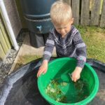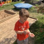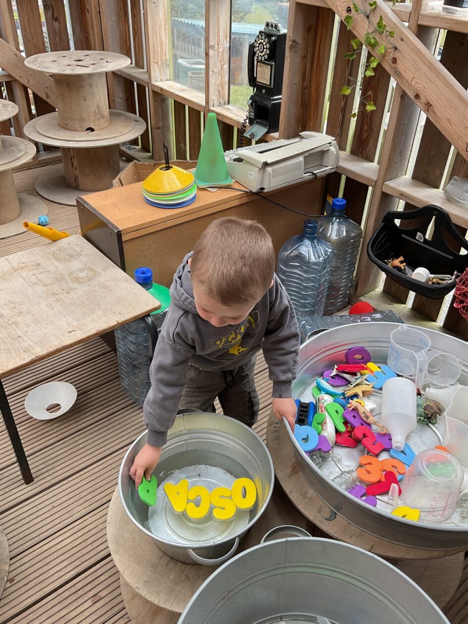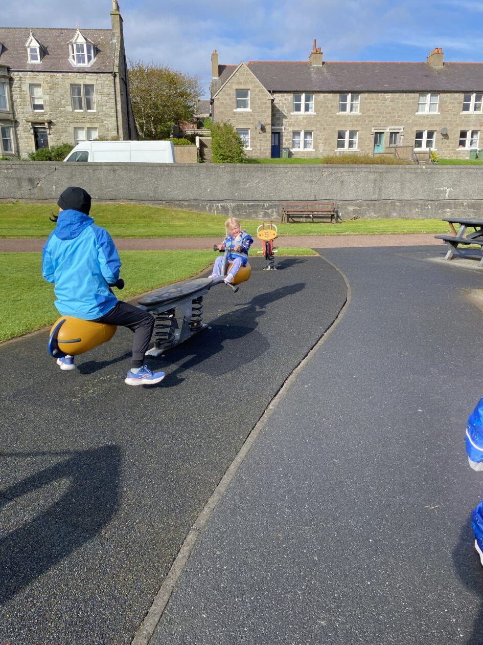 The bairns have been experimenting with different ways to slide down the steep hill in the garden. They have used cardboard, cushions, carpet tiles and slithery breeks! We have also seen lots of engagement with water play and managed to get the solar fountain working as the sun made a bit of a reappearance. We headed to the playpark one afternoon too and the bairns played chasing games, spun on the swings, tried to walk up the slide and got wobbly as jelly on a plate.