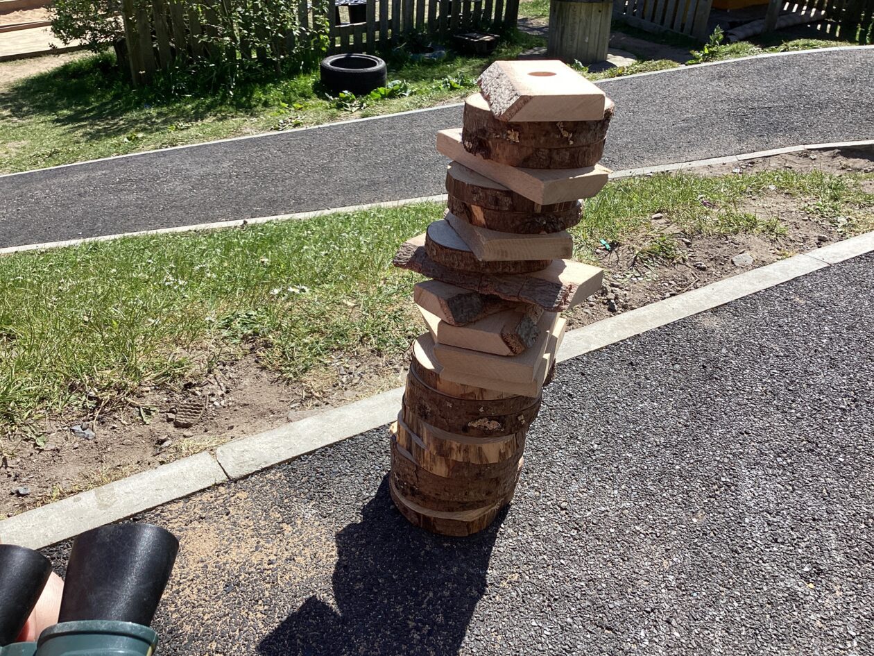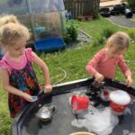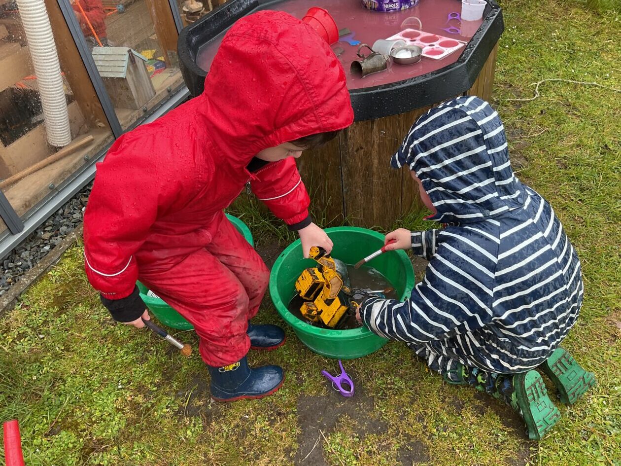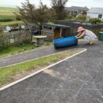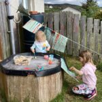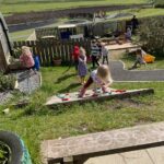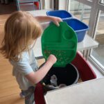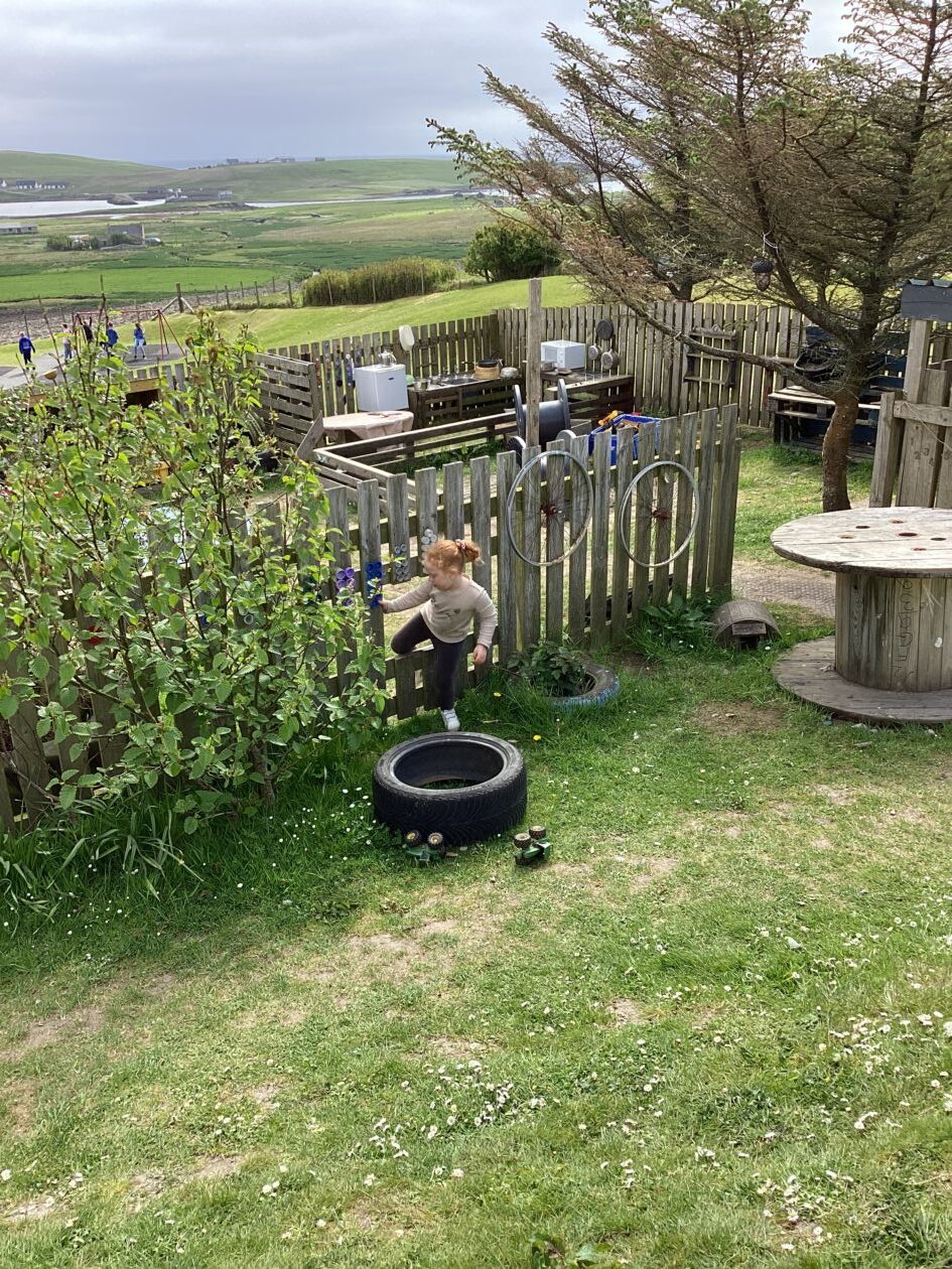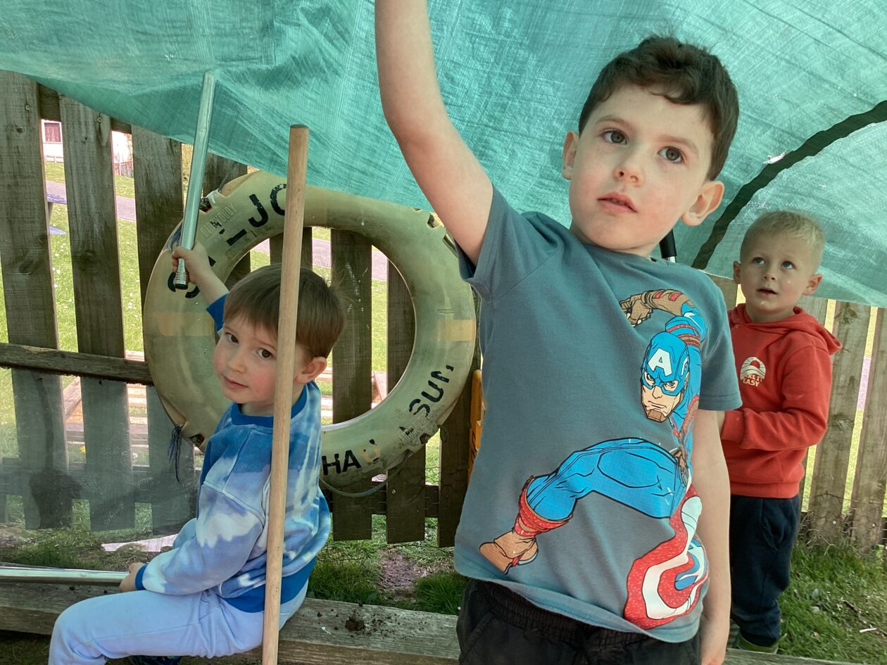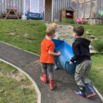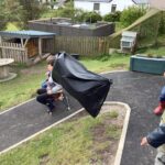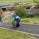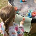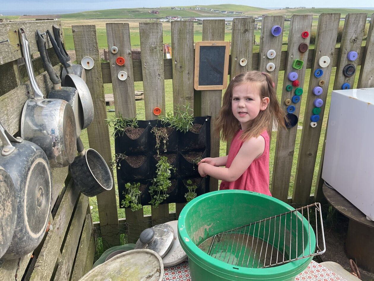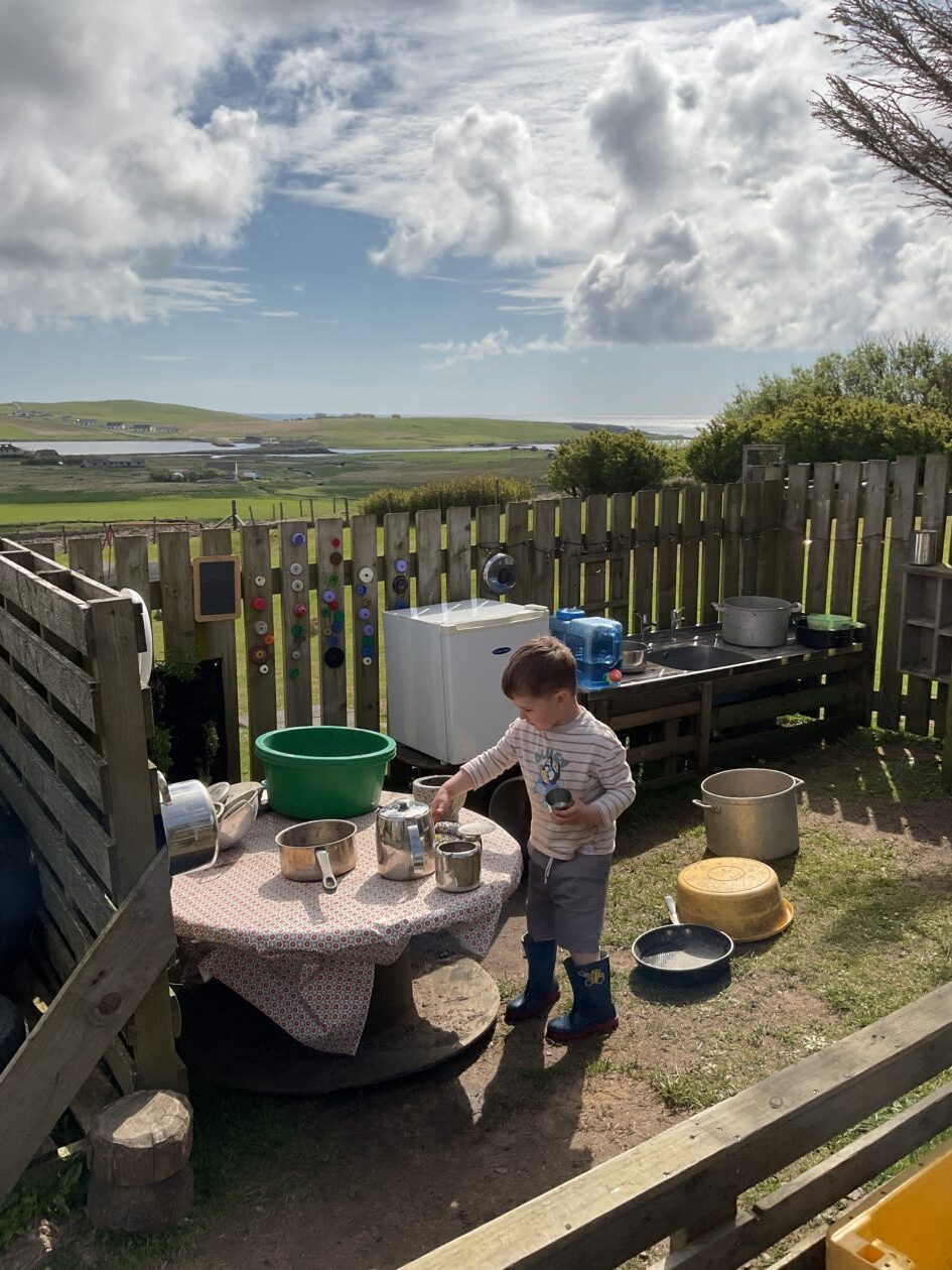 The bairns have been experimenting with different ways to slide down the steep hill in the garden. They have used cardboard, cushions, carpet tiles and slithery breeks! We have also seen lots of engagement with water play and managed to get the solar fountain working as the sun made a bit of a reappearance. We headed to the playpark one afternoon too and the bairns played chasing games, spun on the swings, tried to walk up the slide and got wobbly as jelly on a plate.
