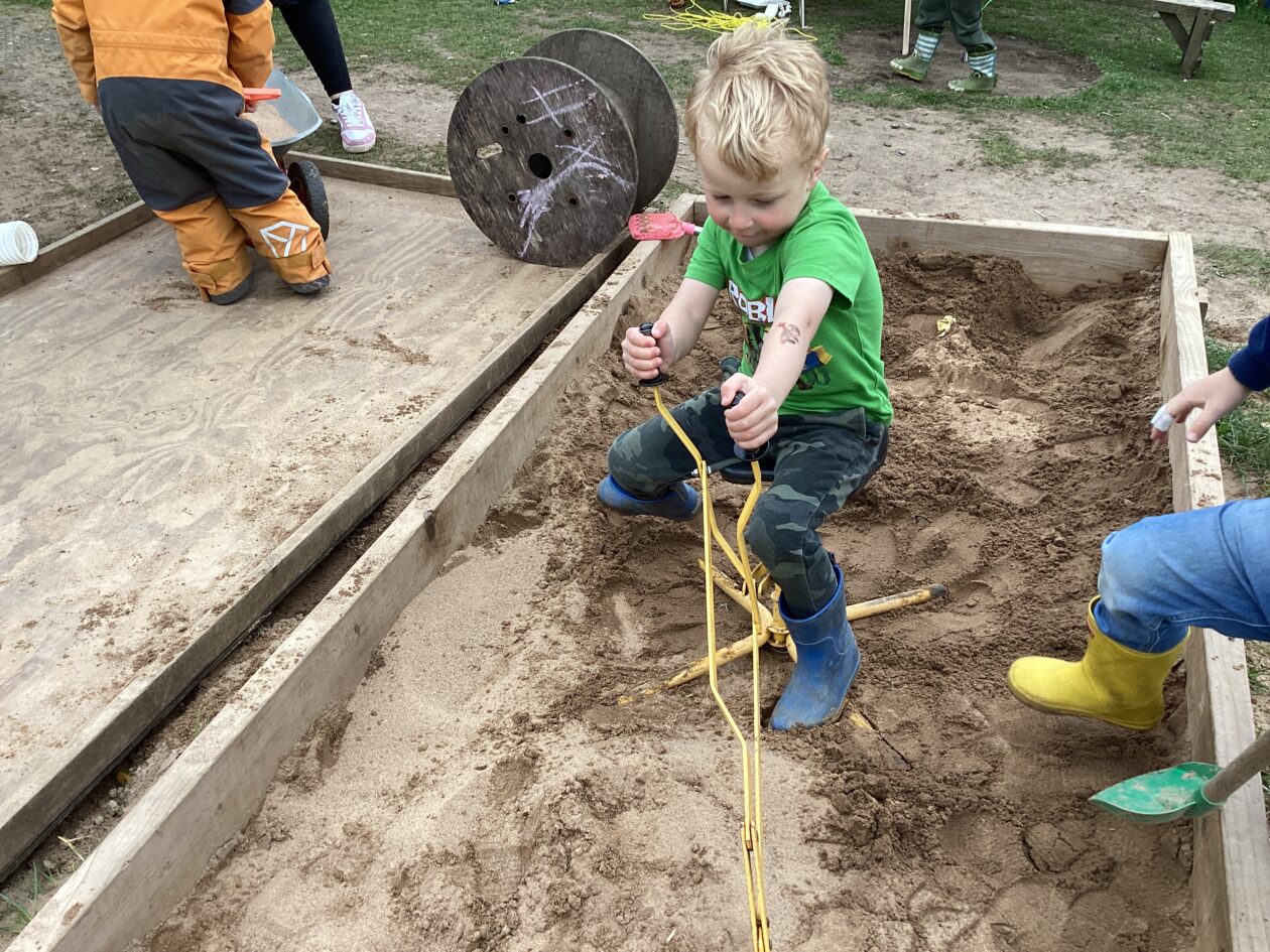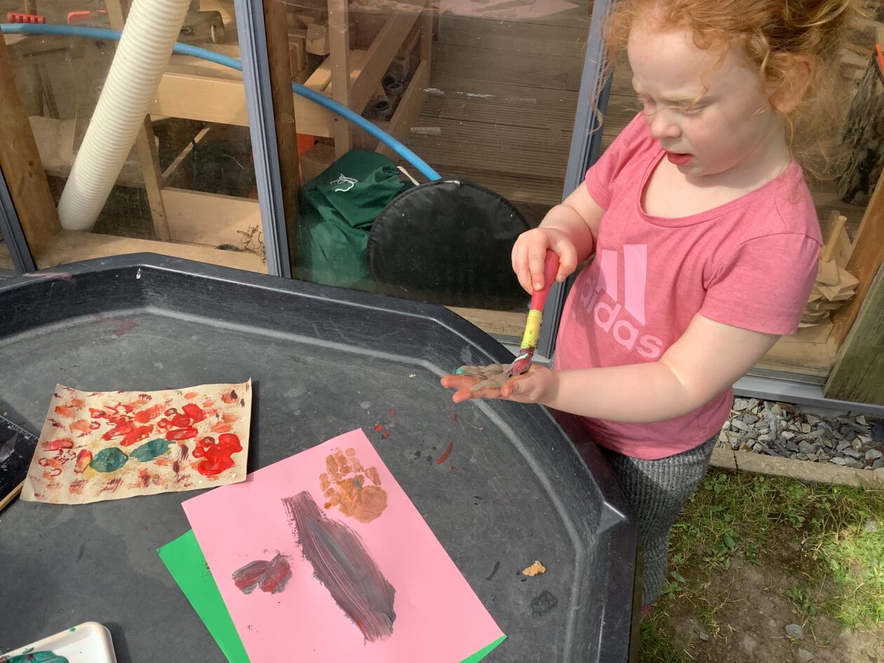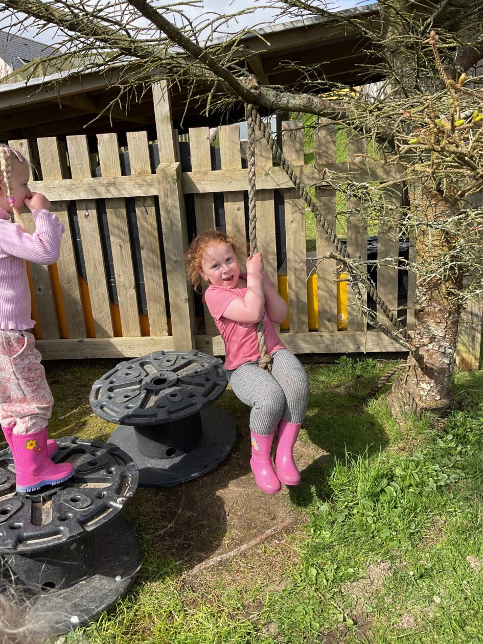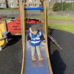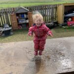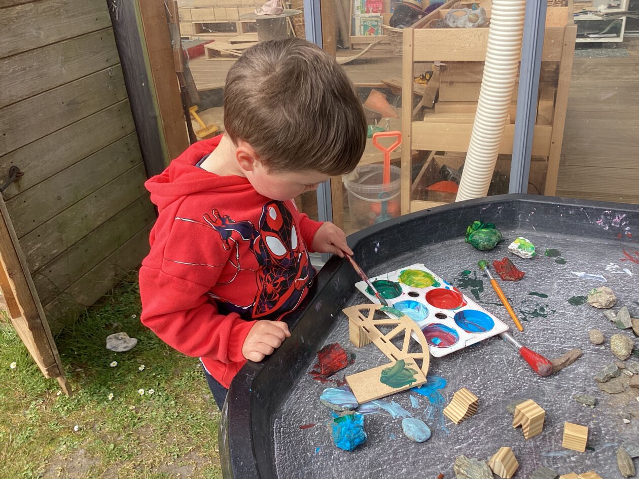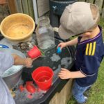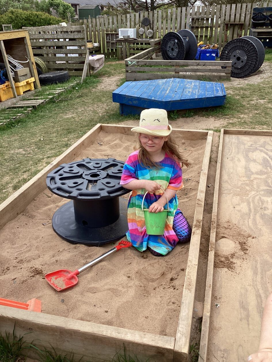 The bairns have been experimenting with different ways to slide down the steep hill in the garden. They have used cardboard, cushions, carpet tiles and slithery breeks! We have also seen lots of engagement with water play and managed to get the solar fountain working as the sun made a bit of a reappearance. We headed to the playpark one afternoon too and the bairns played chasing games, spun on the swings, tried to walk up the slide and got wobbly as jelly on a plate.
