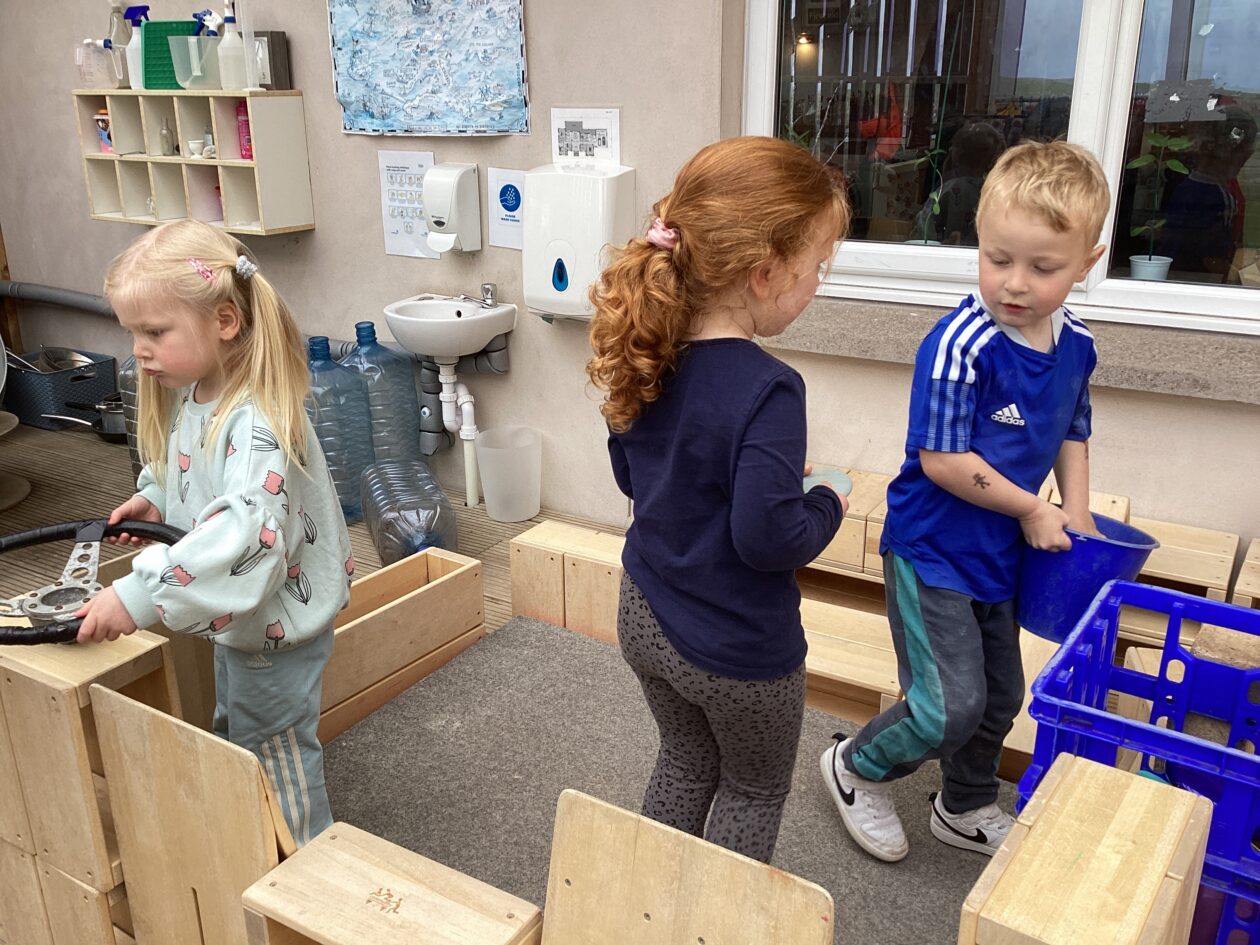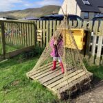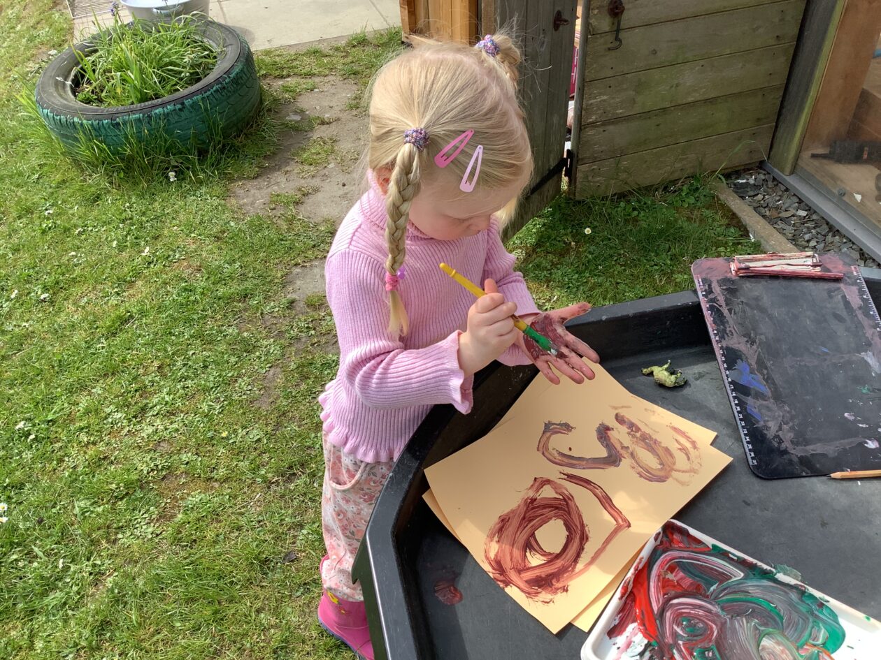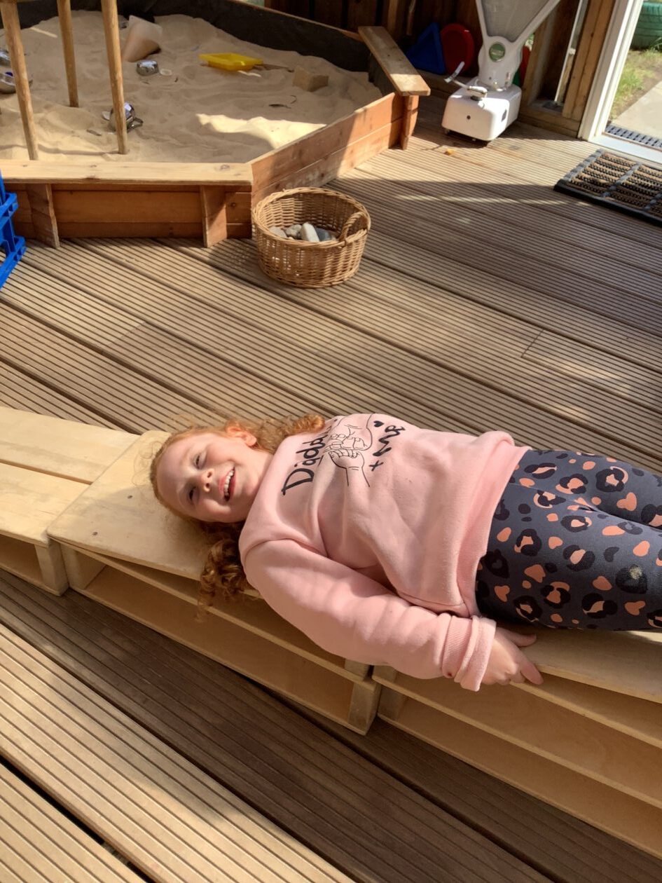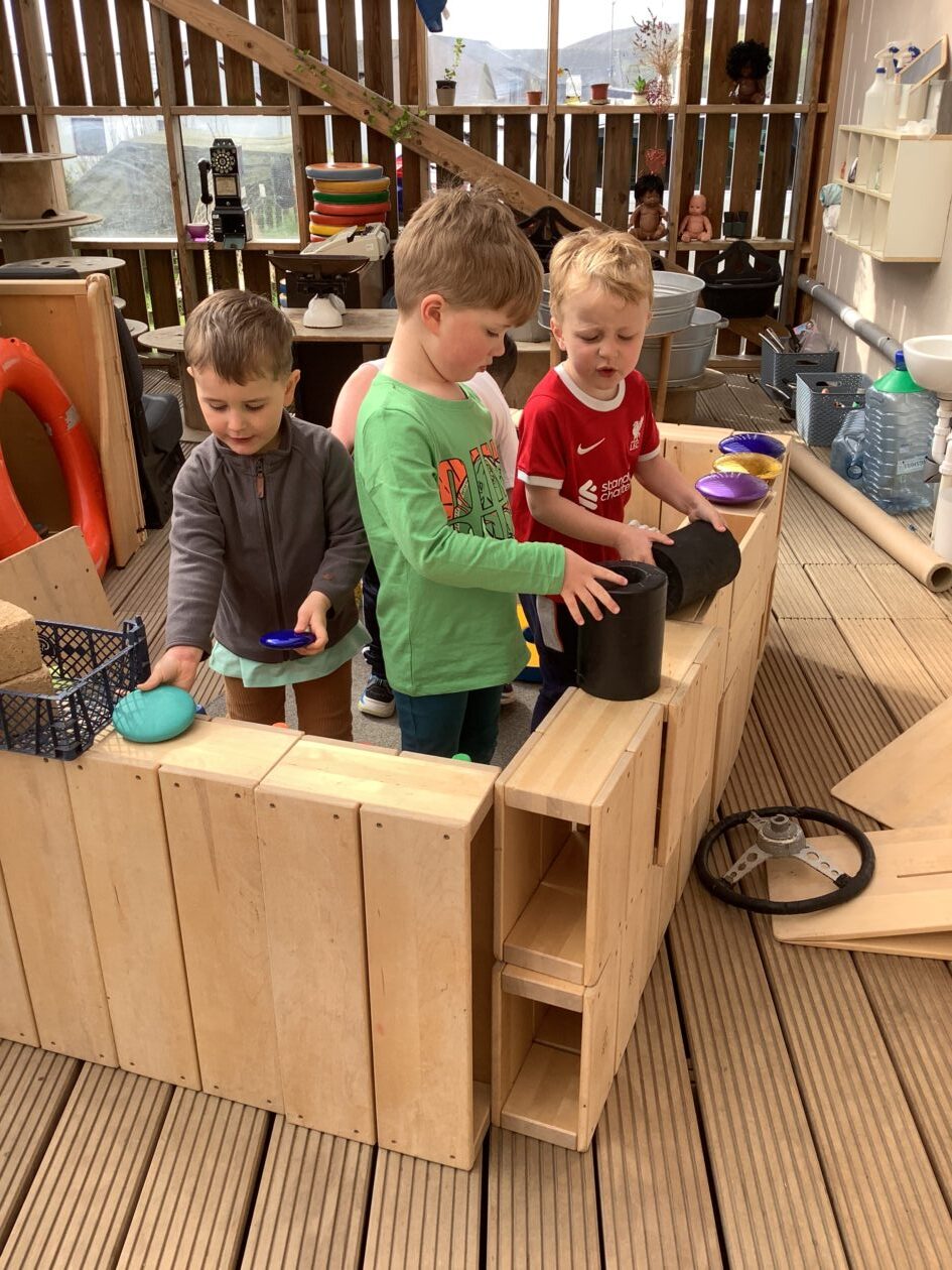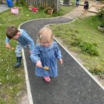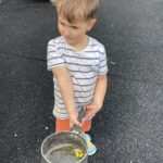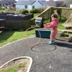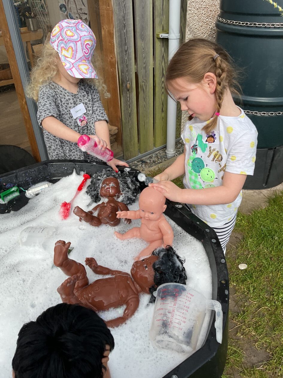 The bairns have been experimenting with different ways to slide down the steep hill in the garden. They have used cardboard, cushions, carpet tiles and slithery breeks! We have also seen lots of engagement with water play and managed to get the solar fountain working as the sun made a bit of a reappearance. We headed to the playpark one afternoon too and the bairns played chasing games, spun on the swings, tried to walk up the slide and got wobbly as jelly on a plate.