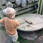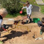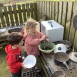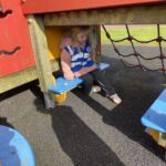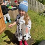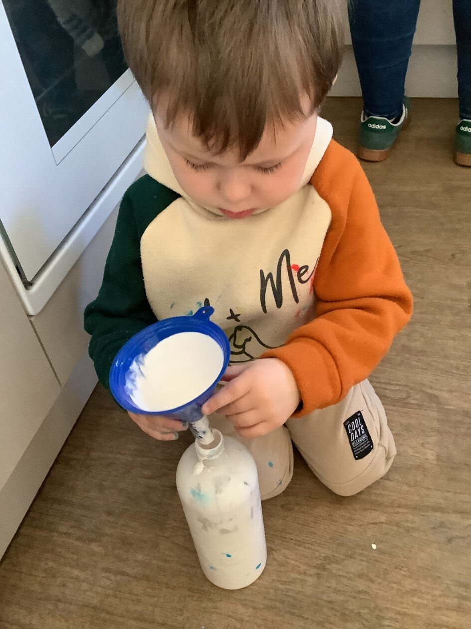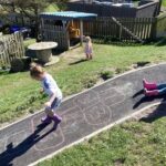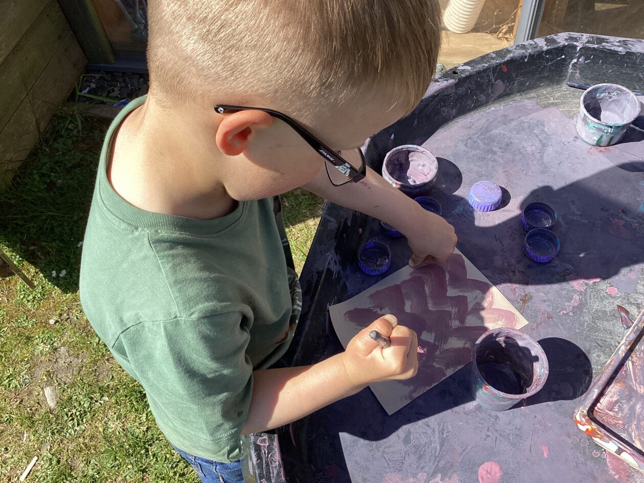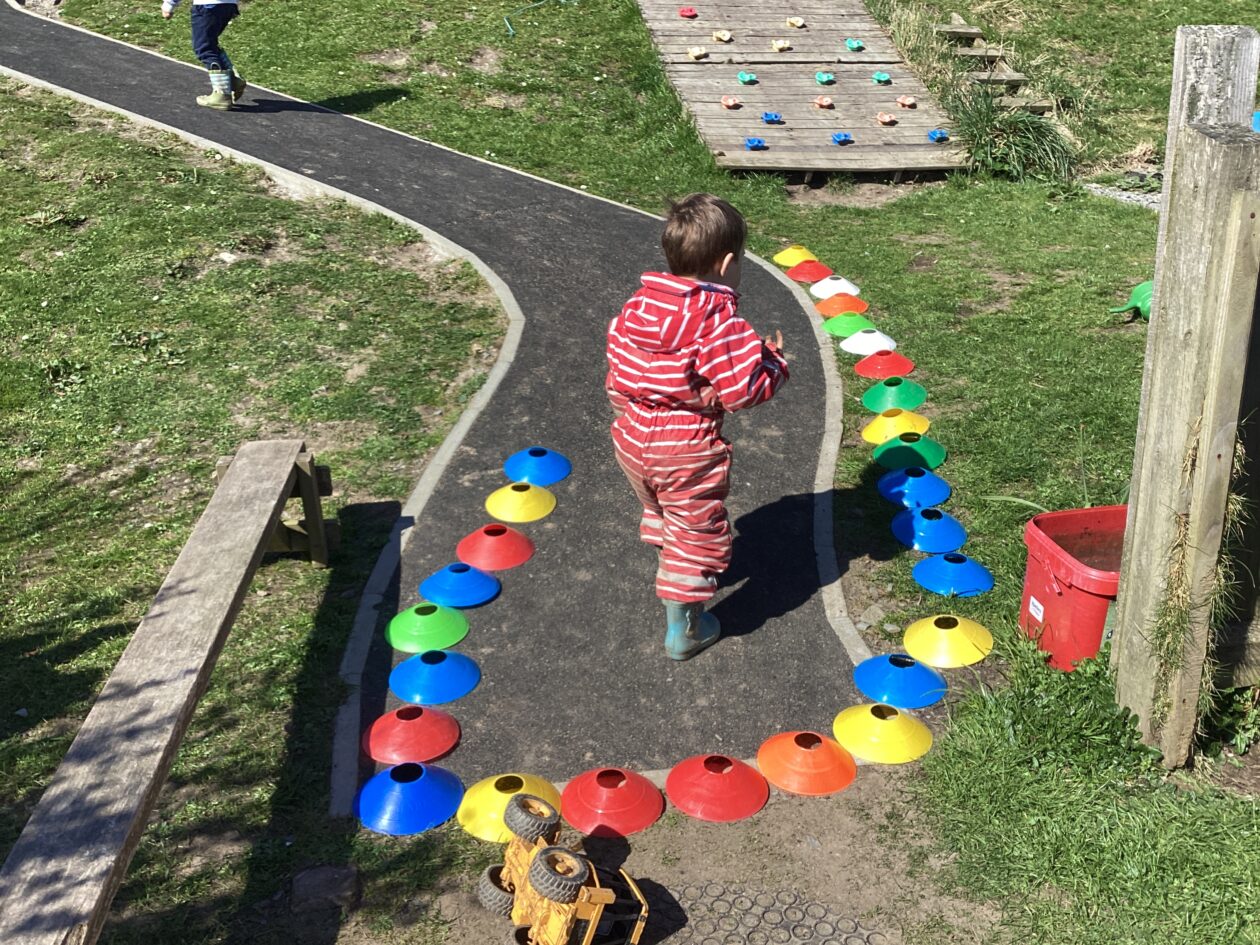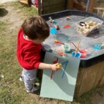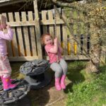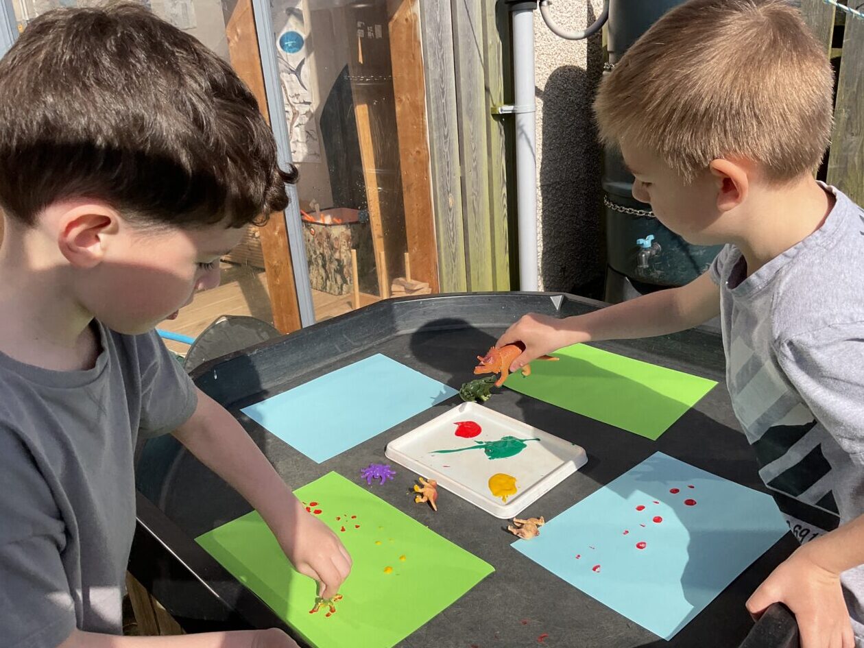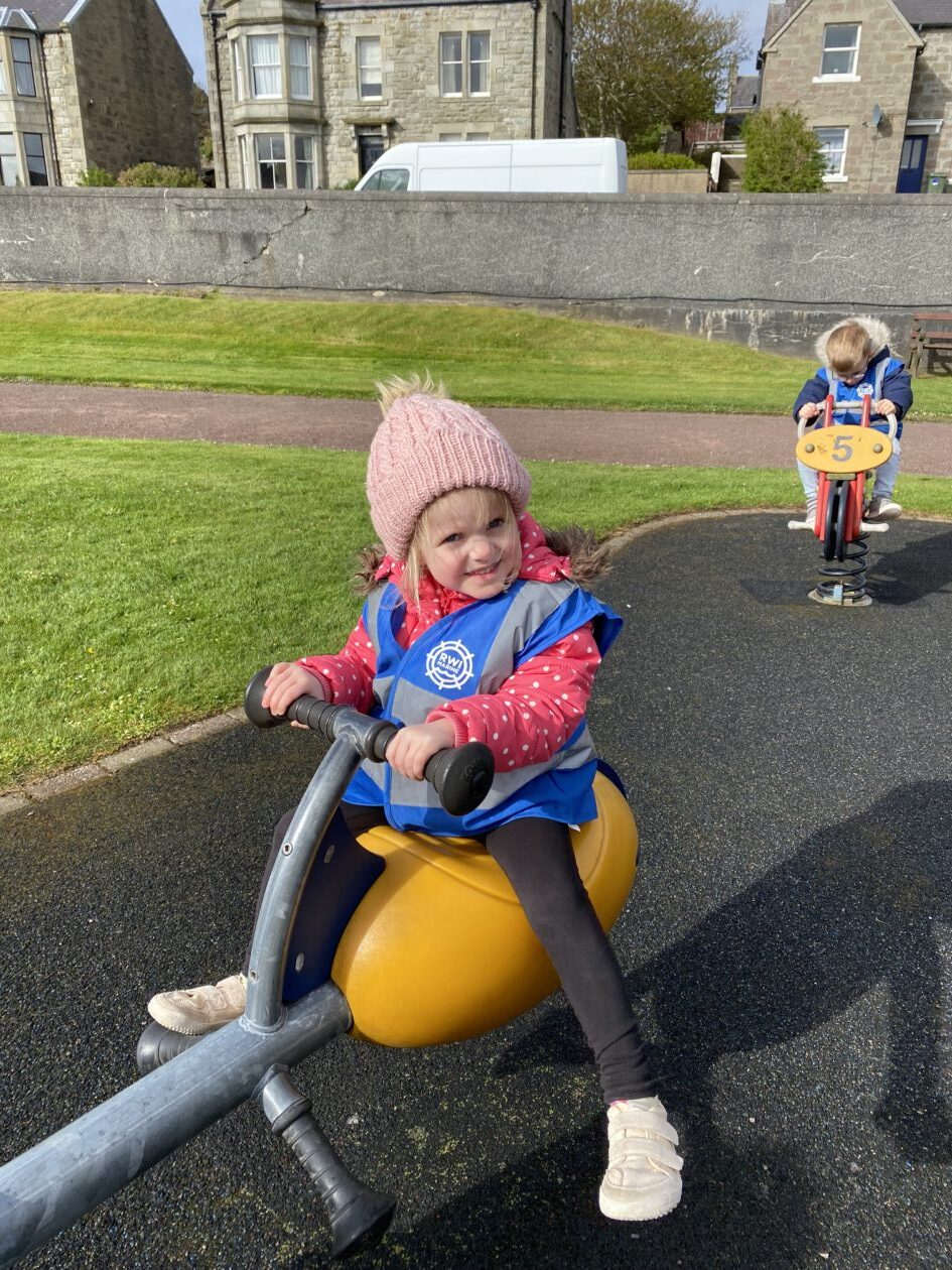 The bairns have been experimenting with different ways to slide down the steep hill in the garden. They have used cardboard, cushions, carpet tiles and slithery breeks! We have also seen lots of engagement with water play and managed to get the solar fountain working as the sun made a bit of a reappearance. We headed to the playpark one afternoon too and the bairns played chasing games, spun on the swings, tried to walk up the slide and got wobbly as jelly on a plate.