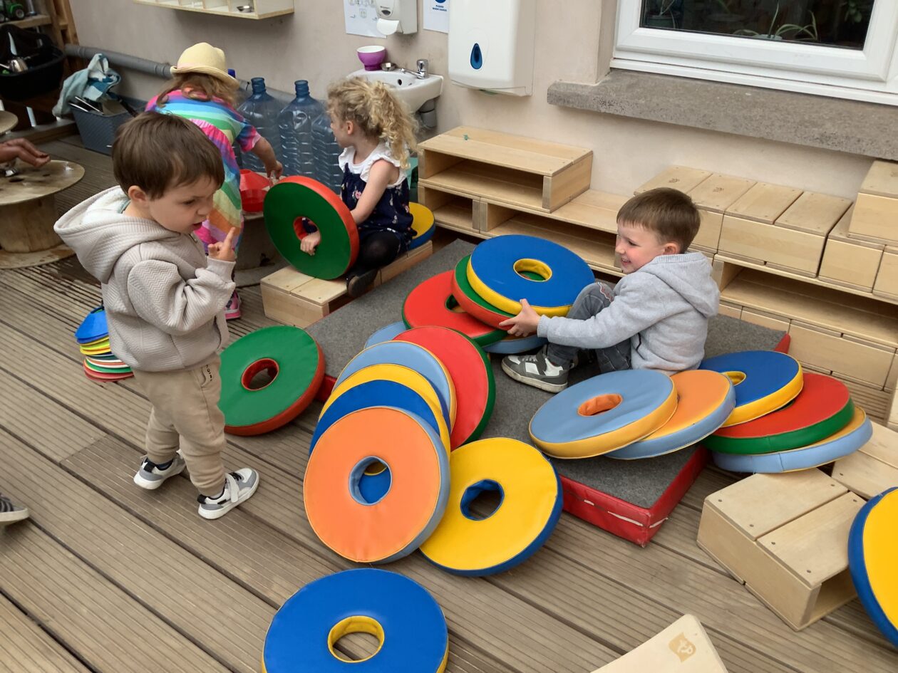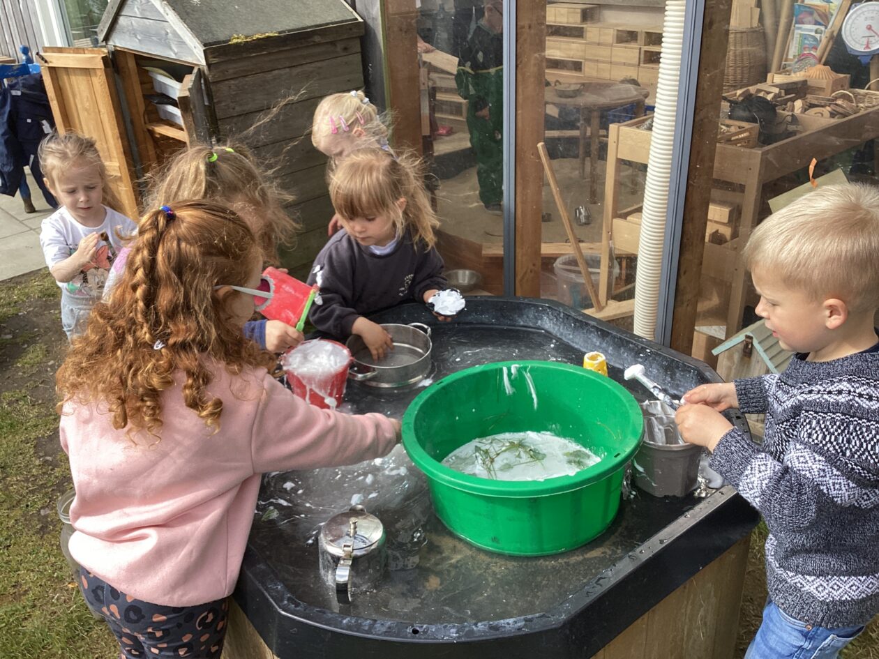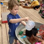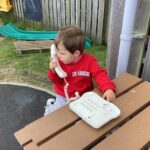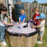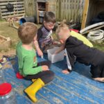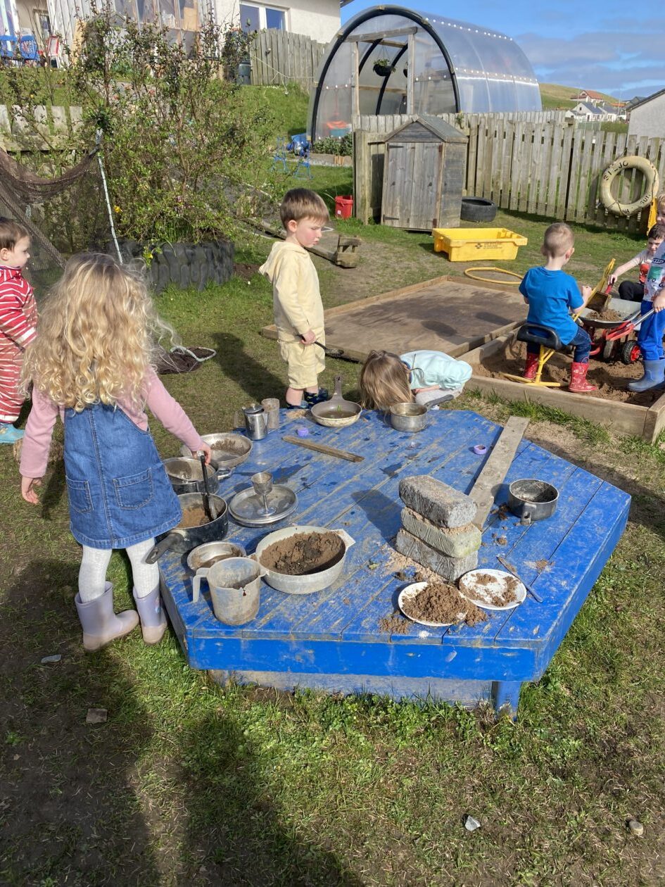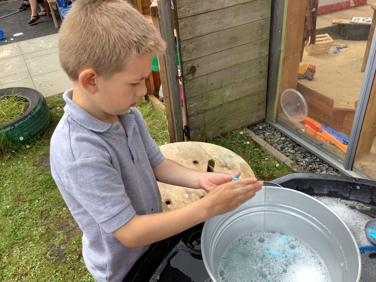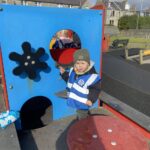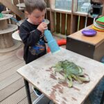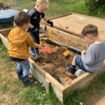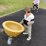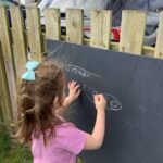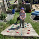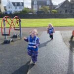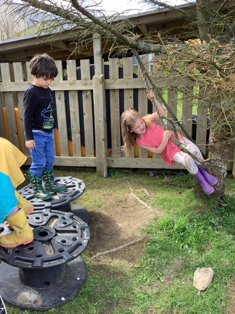 The bairns have been experimenting with different ways to slide down the steep hill in the garden. They have used cardboard, cushions, carpet tiles and slithery breeks! We have also seen lots of engagement with water play and managed to get the solar fountain working as the sun made a bit of a reappearance. We headed to the playpark one afternoon too and the bairns played chasing games, spun on the swings, tried to walk up the slide and got wobbly as jelly on a plate.
