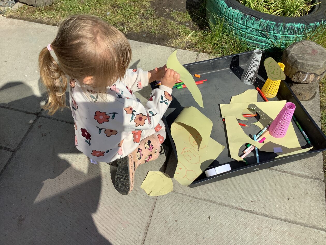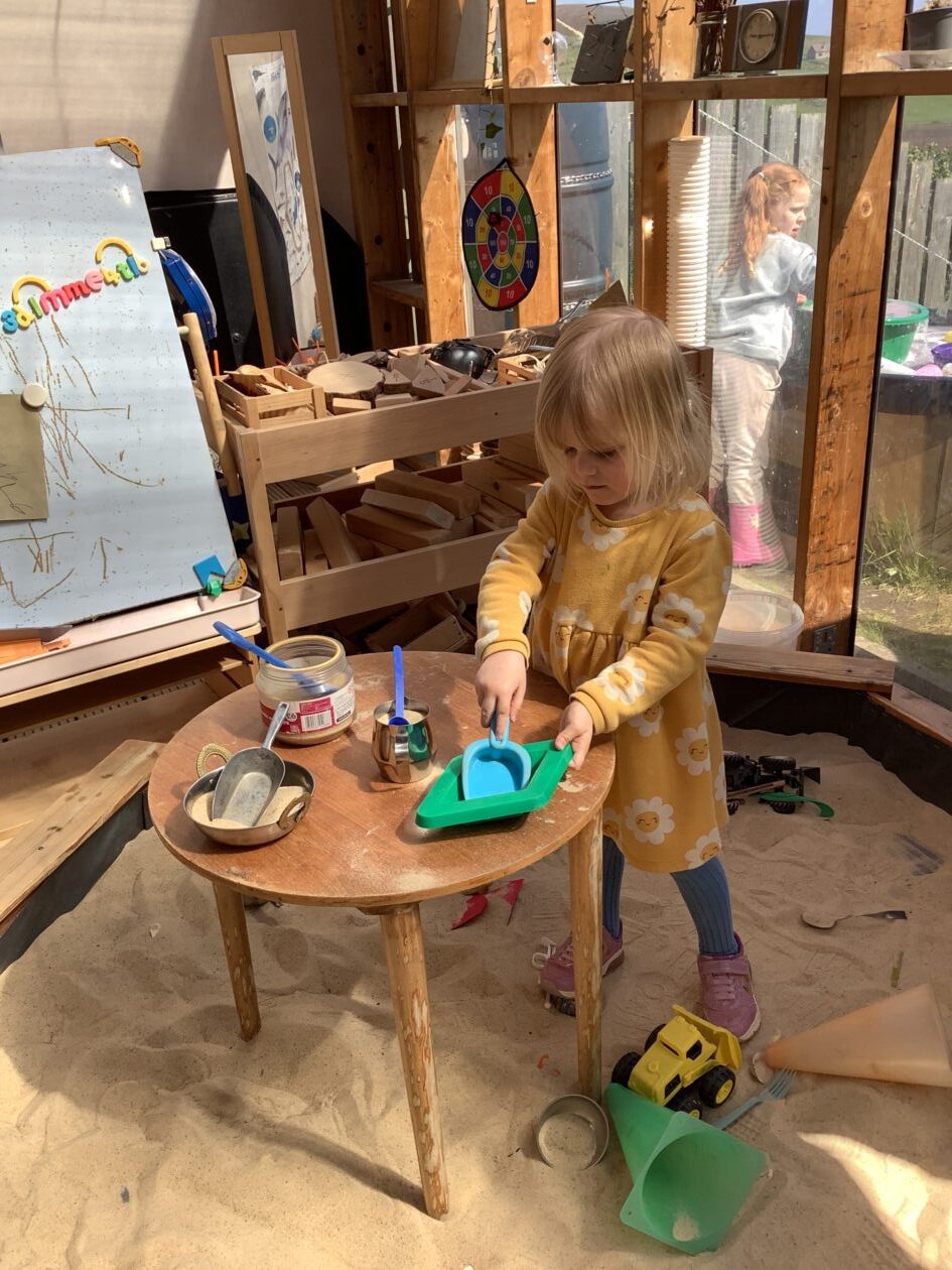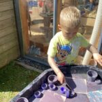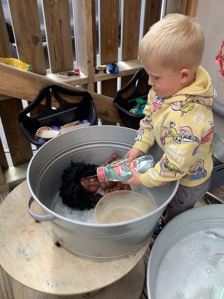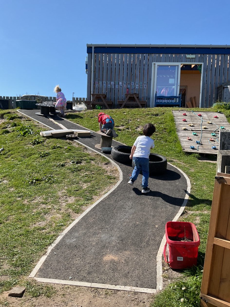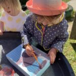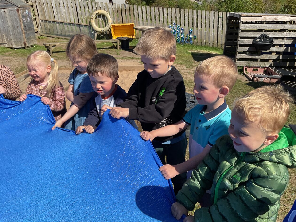 The bairns have been experimenting with different ways to slide down the steep hill in the garden. They have used cardboard, cushions, carpet tiles and slithery breeks! We have also seen lots of engagement with water play and managed to get the solar fountain working as the sun made a bit of a reappearance. We headed to the playpark one afternoon too and the bairns played chasing games, spun on the swings, tried to walk up the slide and got wobbly as jelly on a plate.