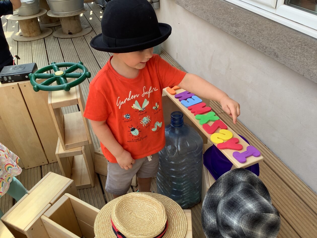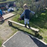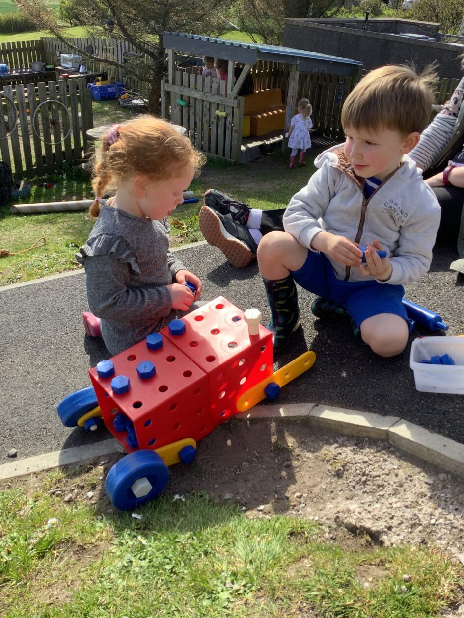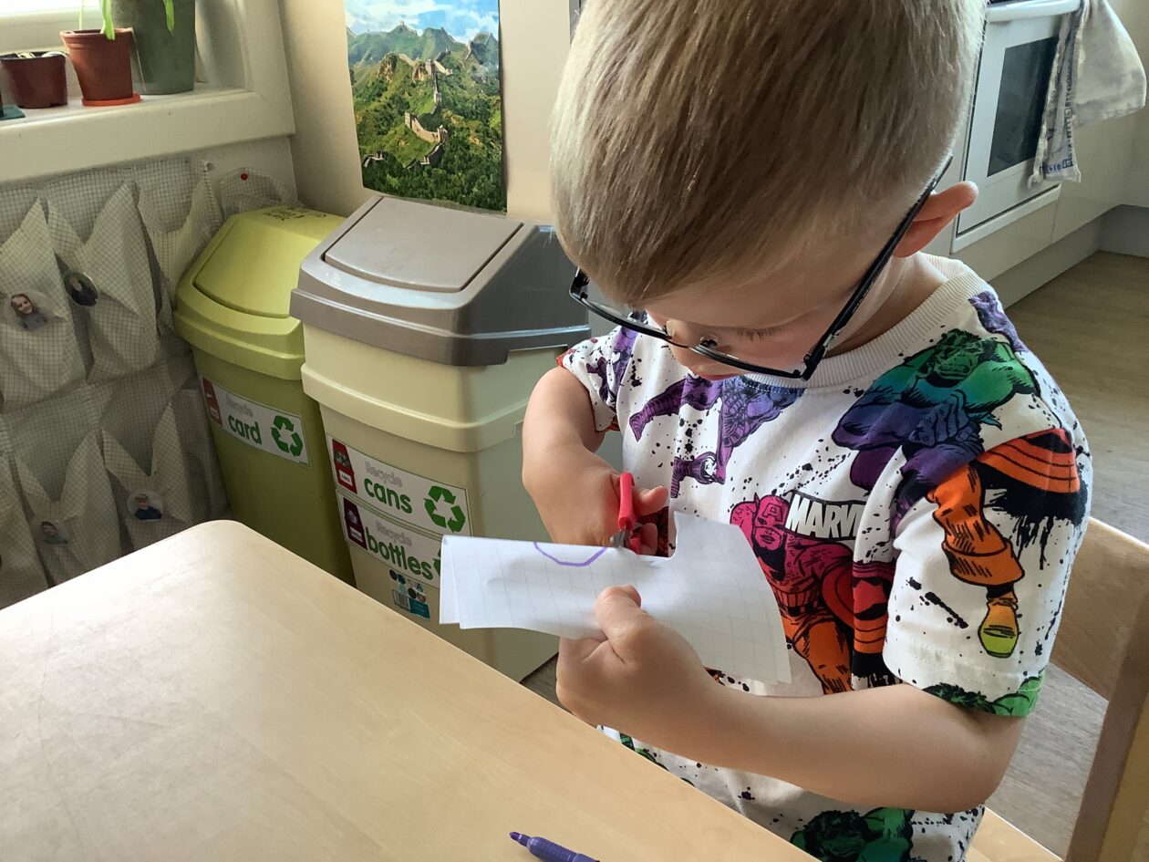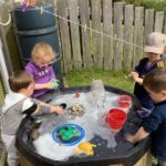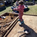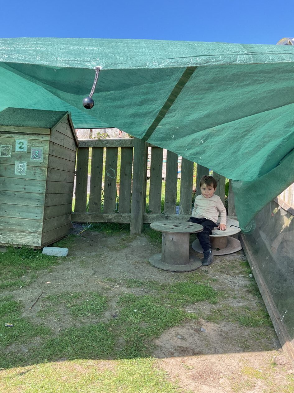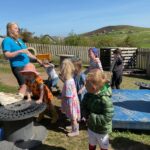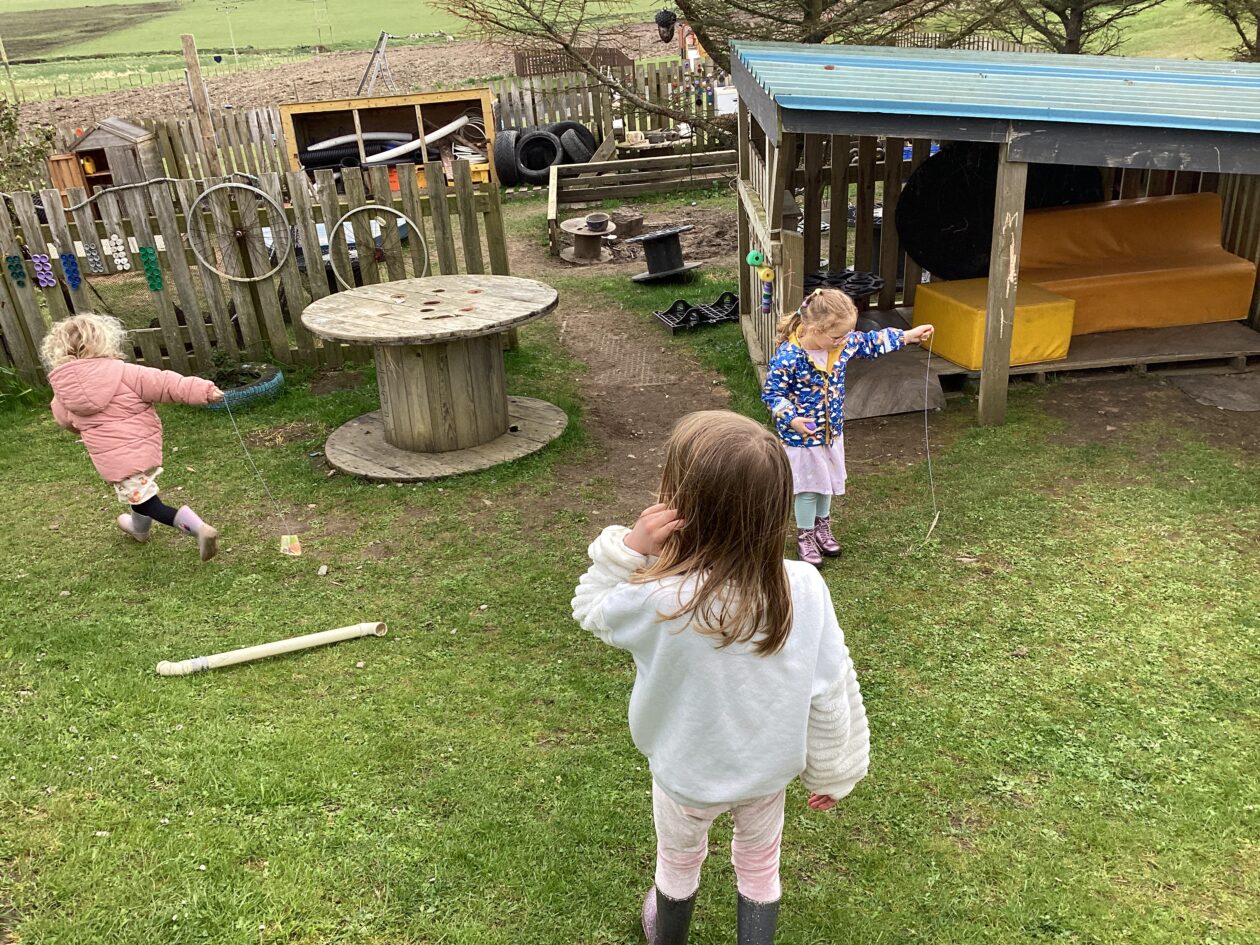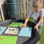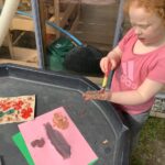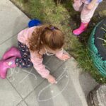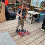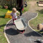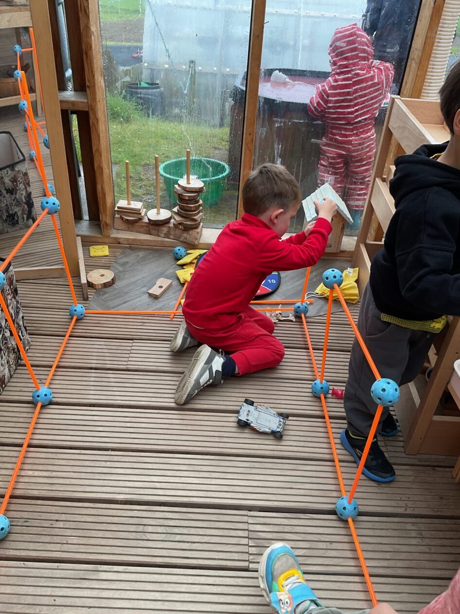 The bairns have been experimenting with different ways to slide down the steep hill in the garden. They have used cardboard, cushions, carpet tiles and slithery breeks! We have also seen lots of engagement with water play and managed to get the solar fountain working as the sun made a bit of a reappearance. We headed to the playpark one afternoon too and the bairns played chasing games, spun on the swings, tried to walk up the slide and got wobbly as jelly on a plate.