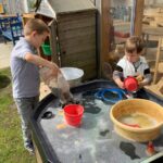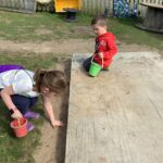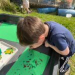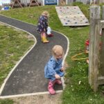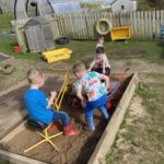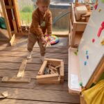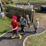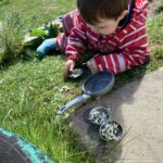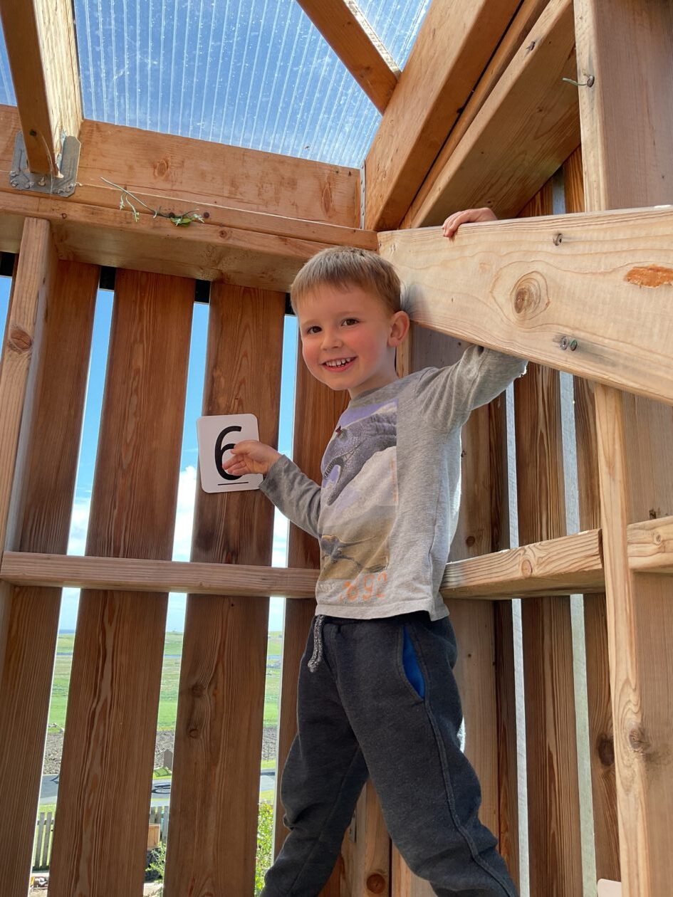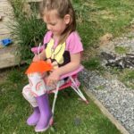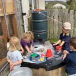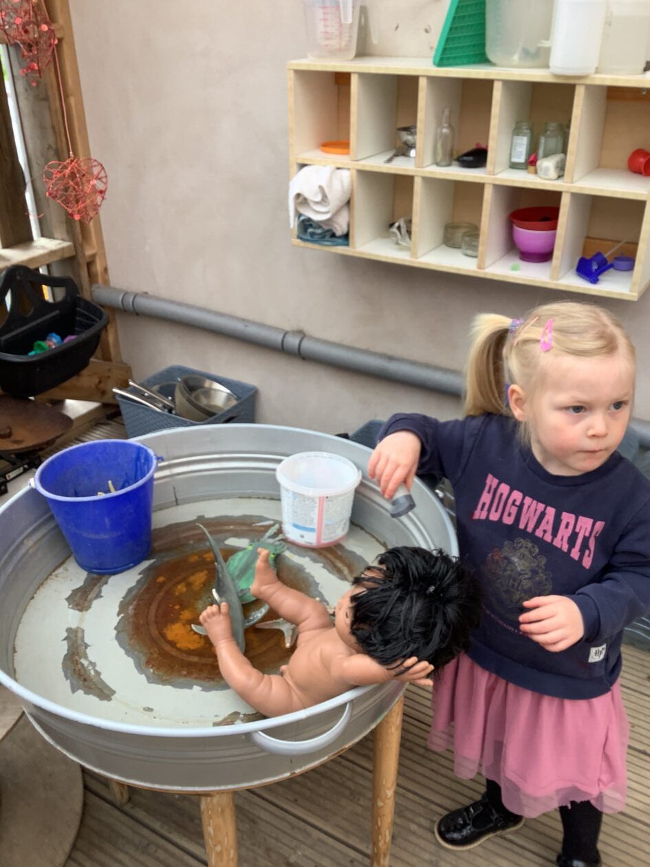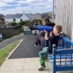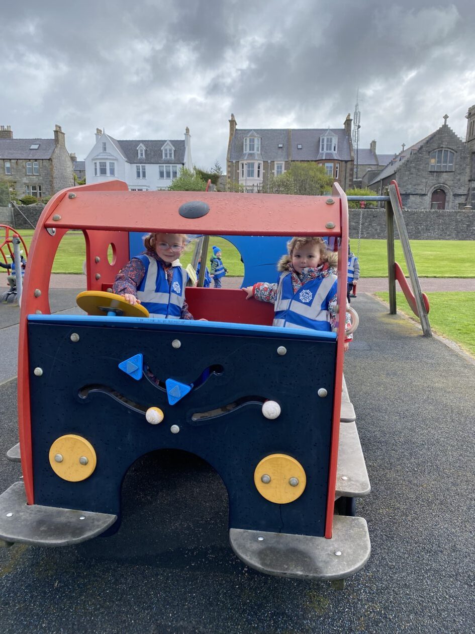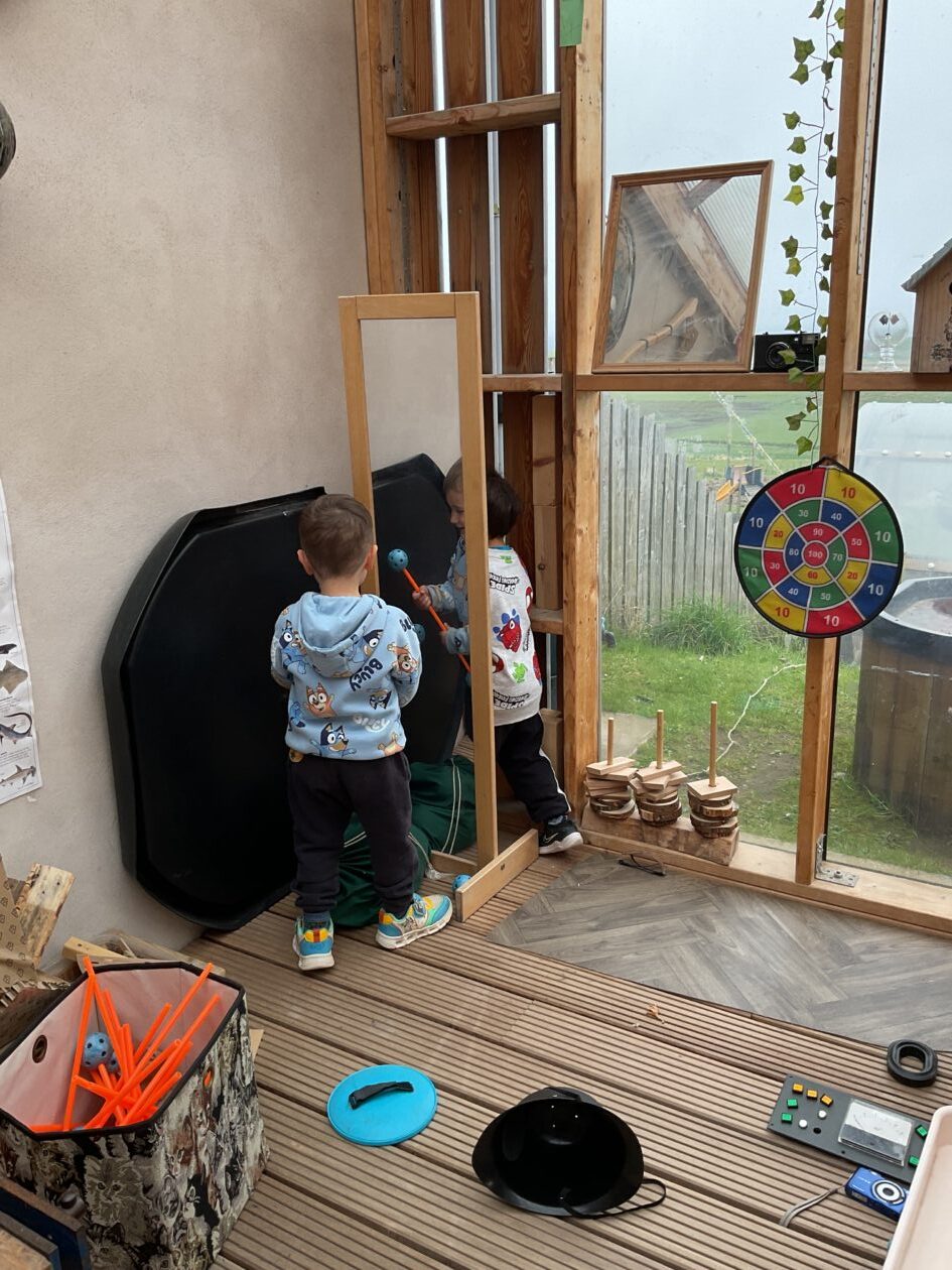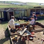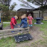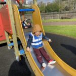 The bairns have been experimenting with different ways to slide down the steep hill in the garden. They have used cardboard, cushions, carpet tiles and slithery breeks! We have also seen lots of engagement with water play and managed to get the solar fountain working as the sun made a bit of a reappearance. We headed to the playpark one afternoon too and the bairns played chasing games, spun on the swings, tried to walk up the slide and got wobbly as jelly on a plate.