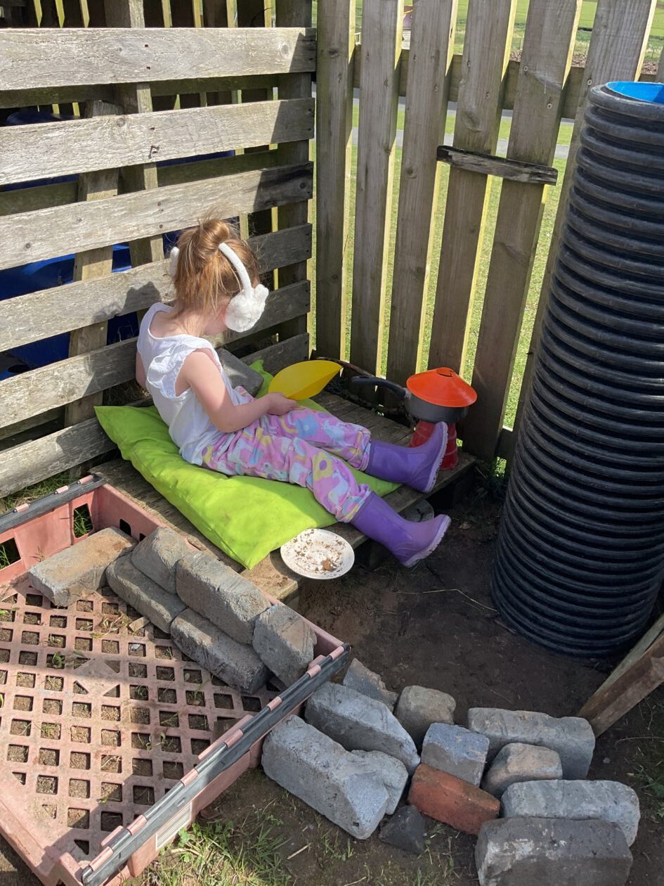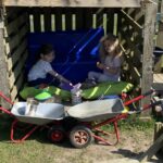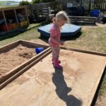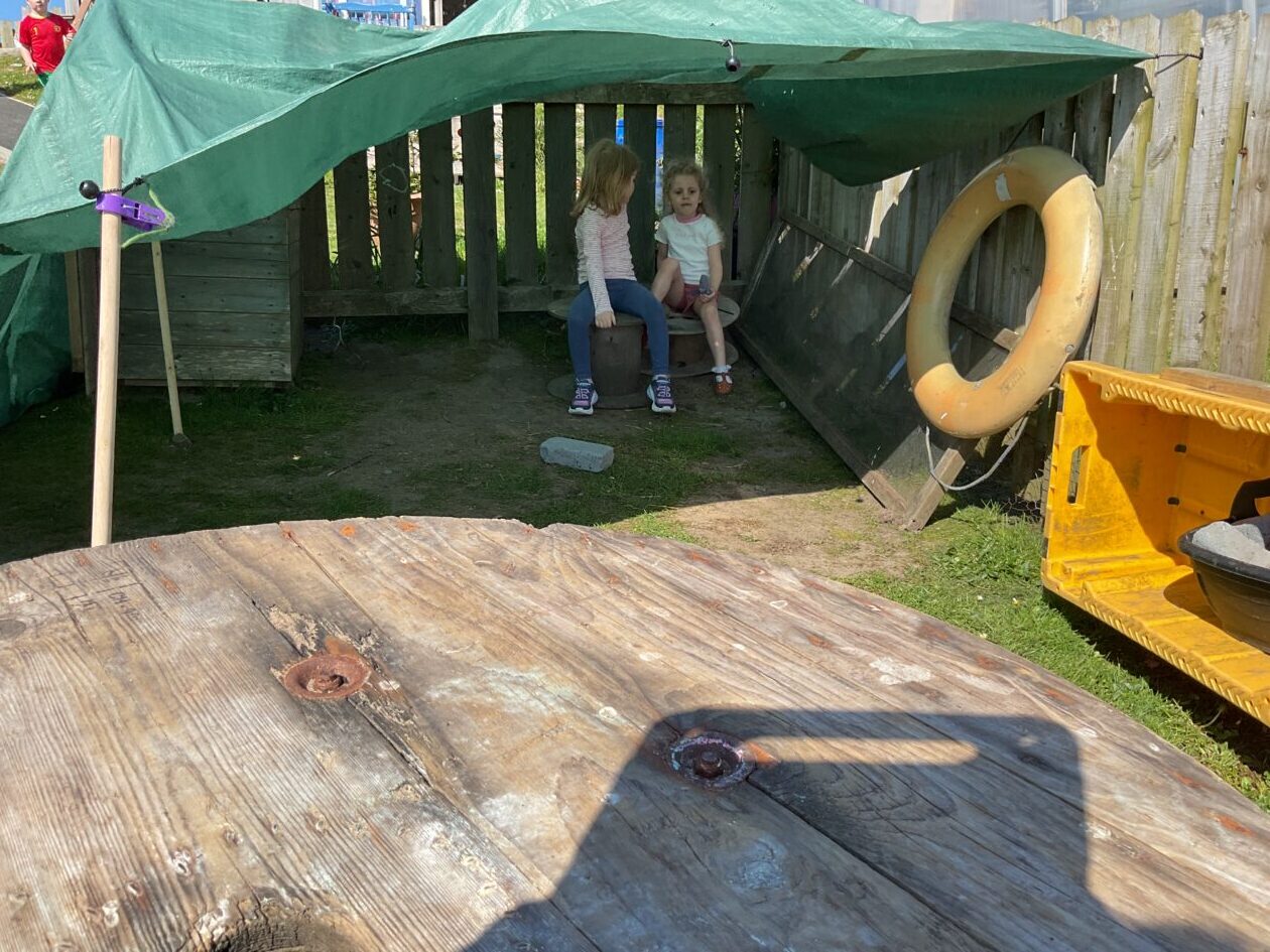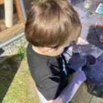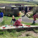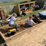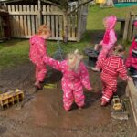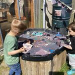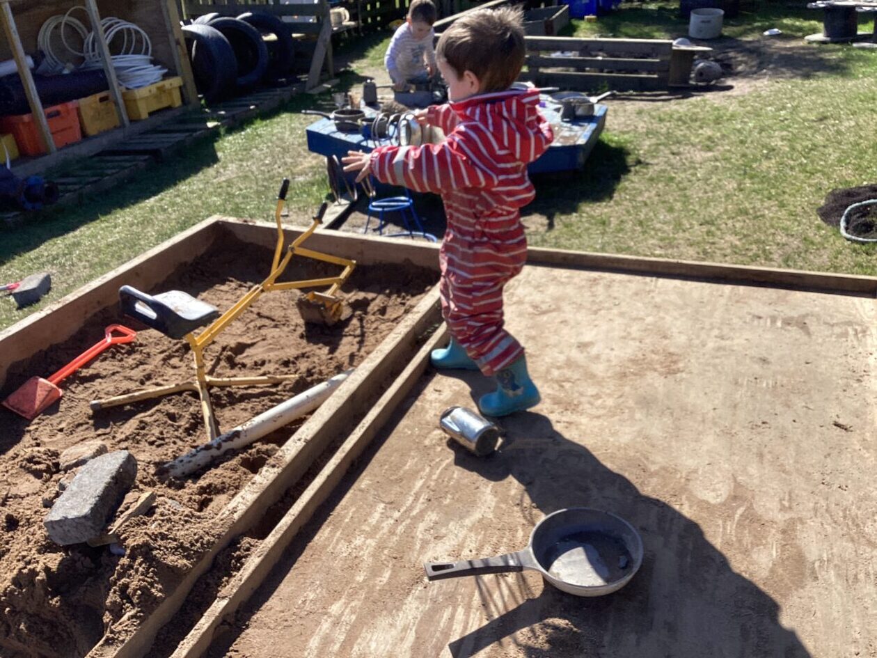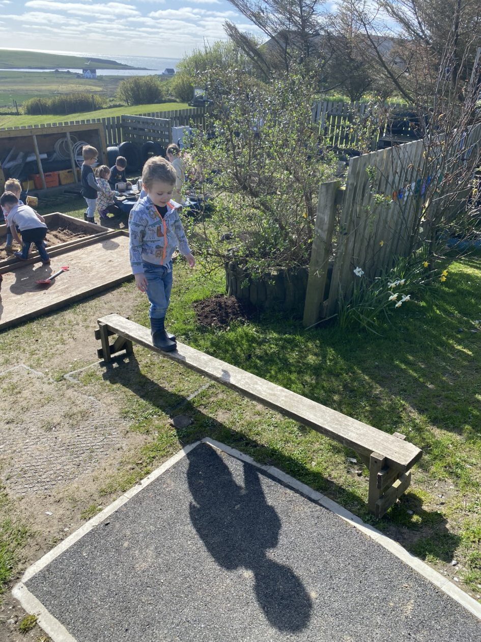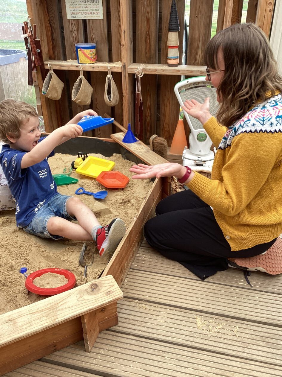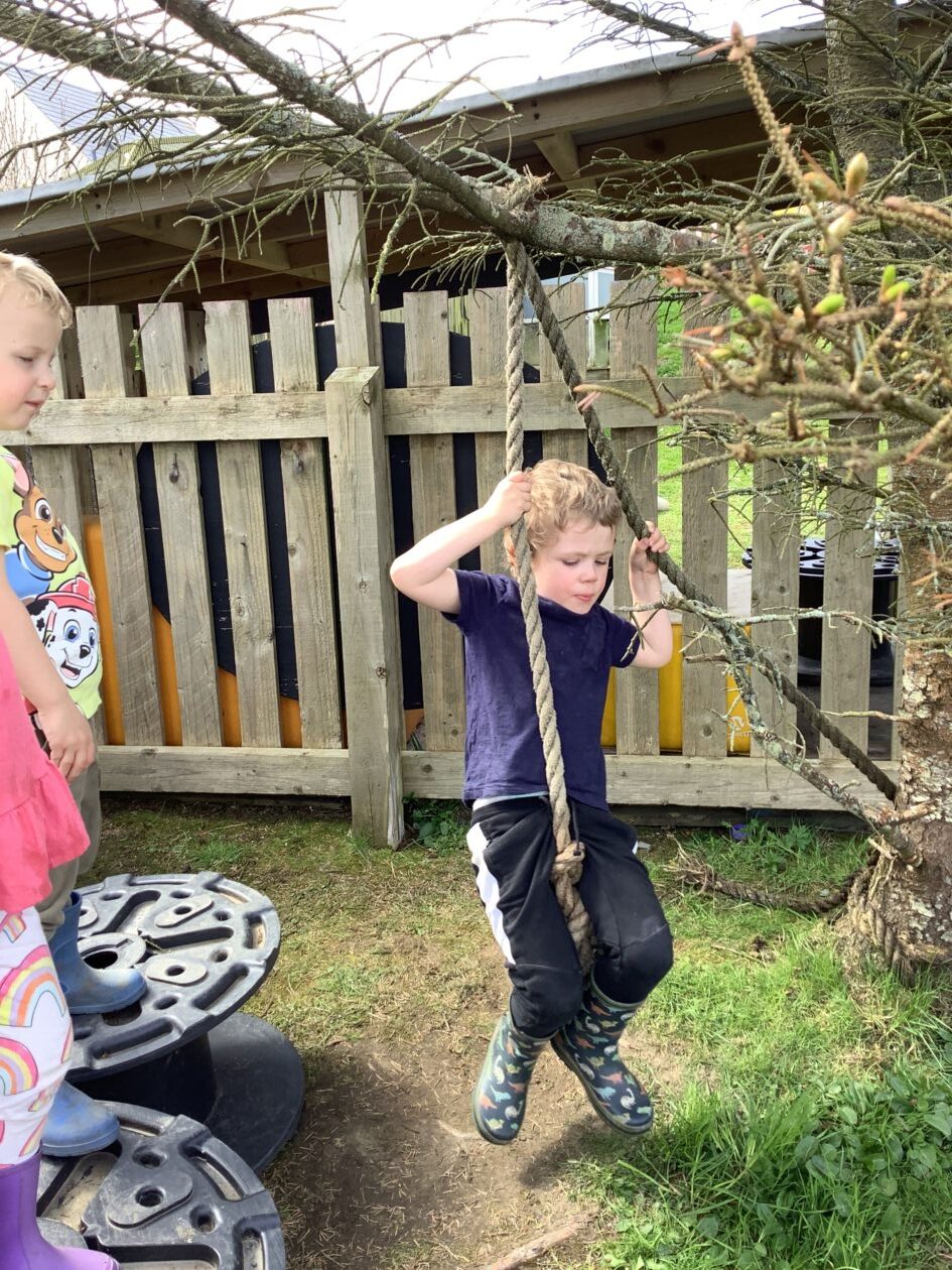 The bairns have been experimenting with different ways to slide down the steep hill in the garden. They have used cardboard, cushions, carpet tiles and slithery breeks! We have also seen lots of engagement with water play and managed to get the solar fountain working as the sun made a bit of a reappearance. We headed to the playpark one afternoon too and the bairns played chasing games, spun on the swings, tried to walk up the slide and got wobbly as jelly on a plate.