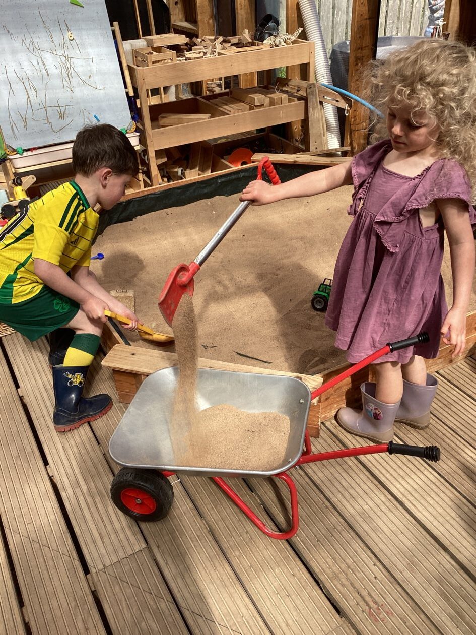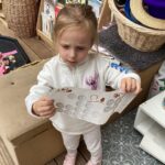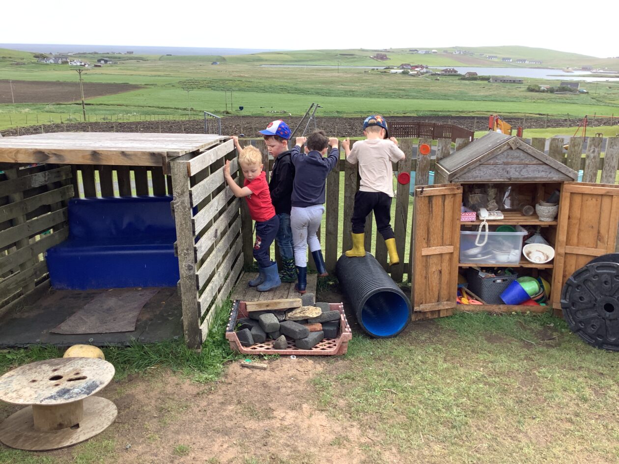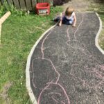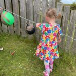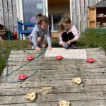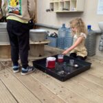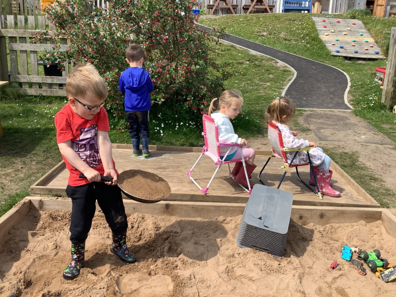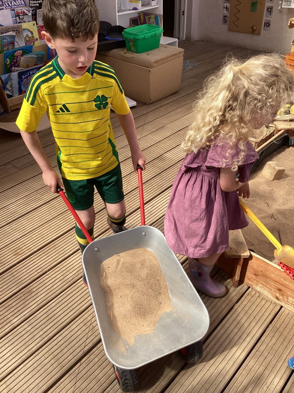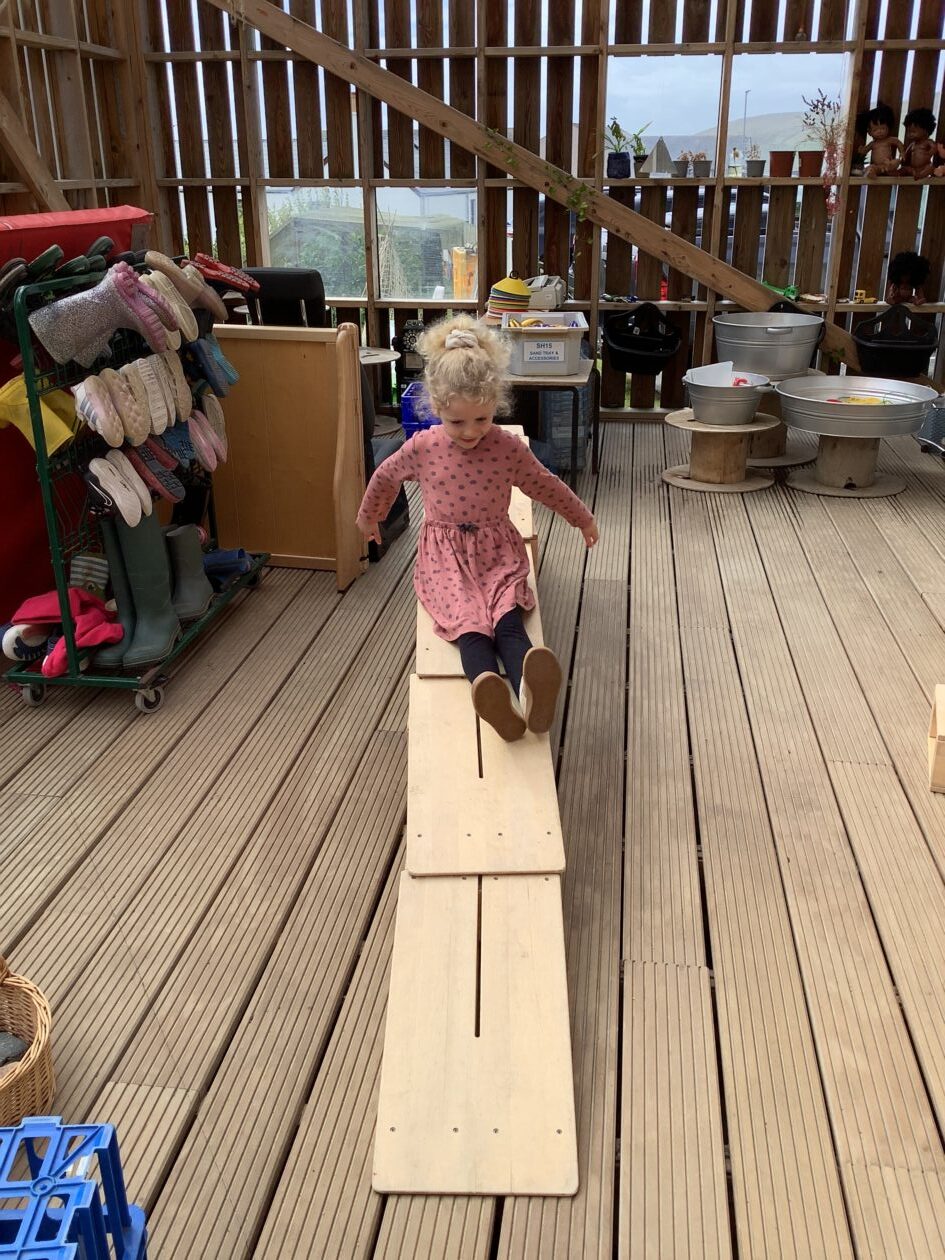 The bairns have been experimenting with different ways to slide down the steep hill in the garden. They have used cardboard, cushions, carpet tiles and slithery breeks! We have also seen lots of engagement with water play and managed to get the solar fountain working as the sun made a bit of a reappearance. We headed to the playpark one afternoon too and the bairns played chasing games, spun on the swings, tried to walk up the slide and got wobbly as jelly on a plate.