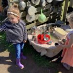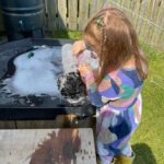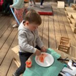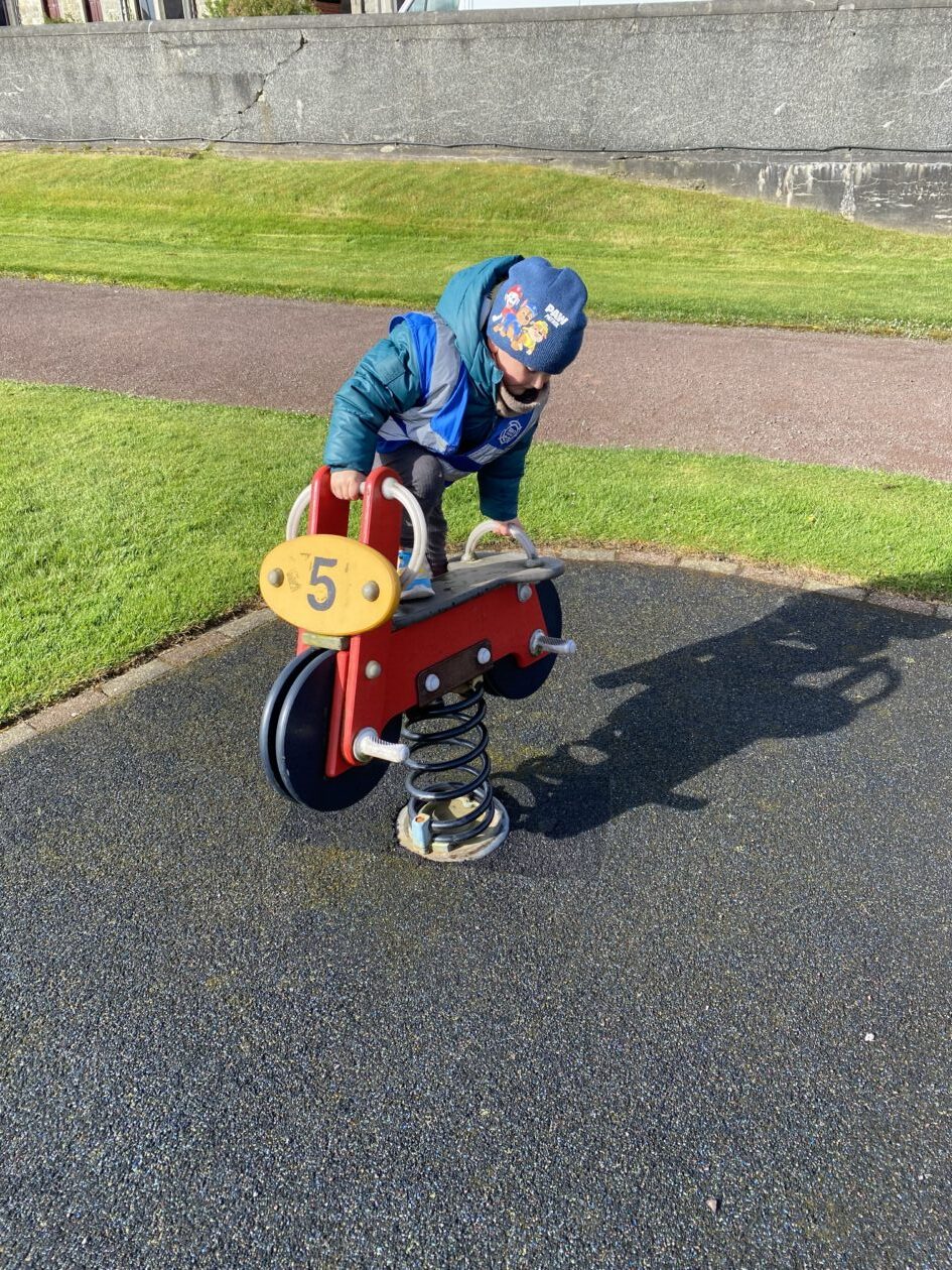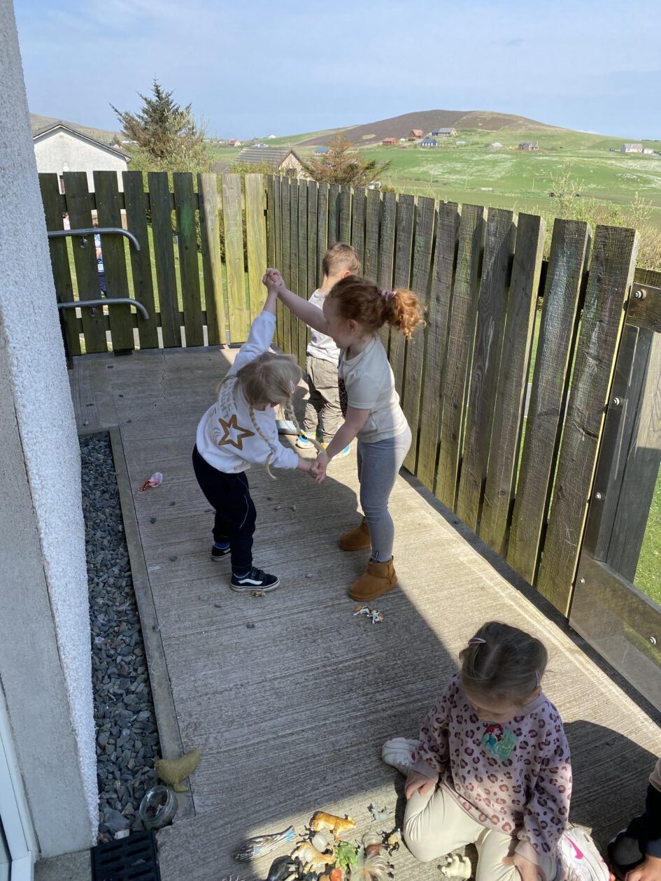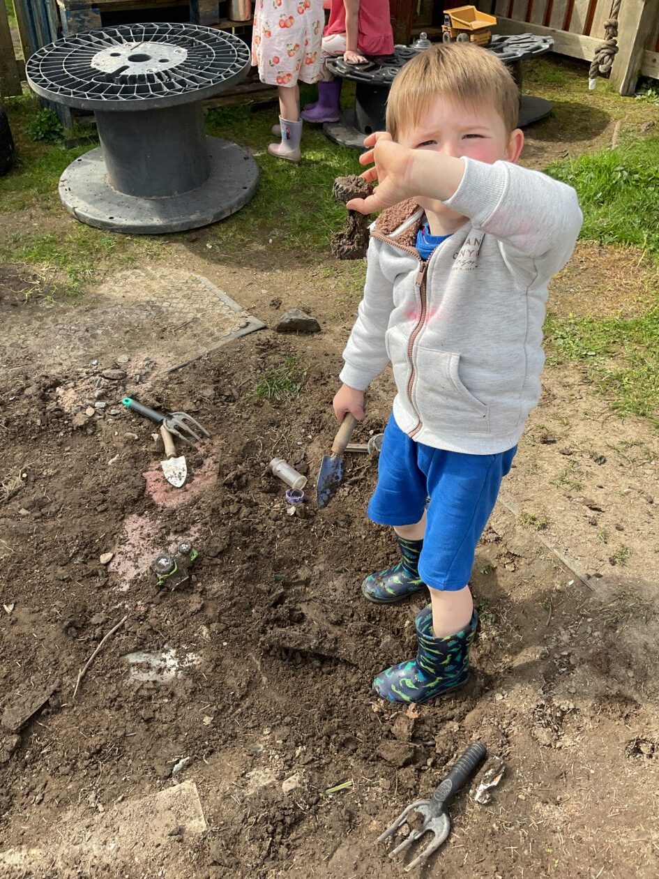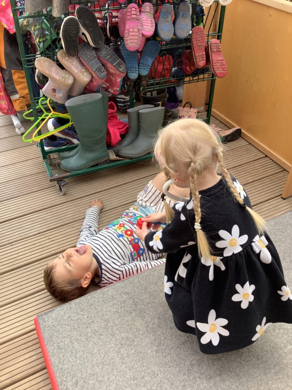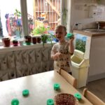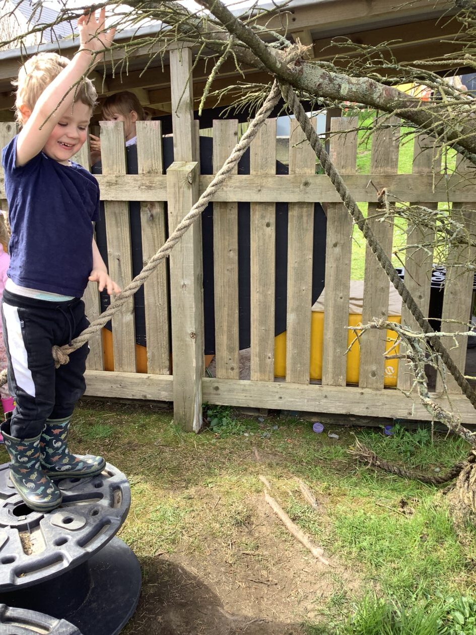 The bairns have been experimenting with different ways to slide down the steep hill in the garden. They have used cardboard, cushions, carpet tiles and slithery breeks! We have also seen lots of engagement with water play and managed to get the solar fountain working as the sun made a bit of a reappearance. We headed to the playpark one afternoon too and the bairns played chasing games, spun on the swings, tried to walk up the slide and got wobbly as jelly on a plate.
