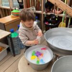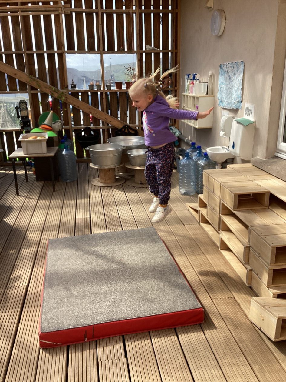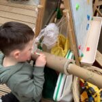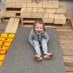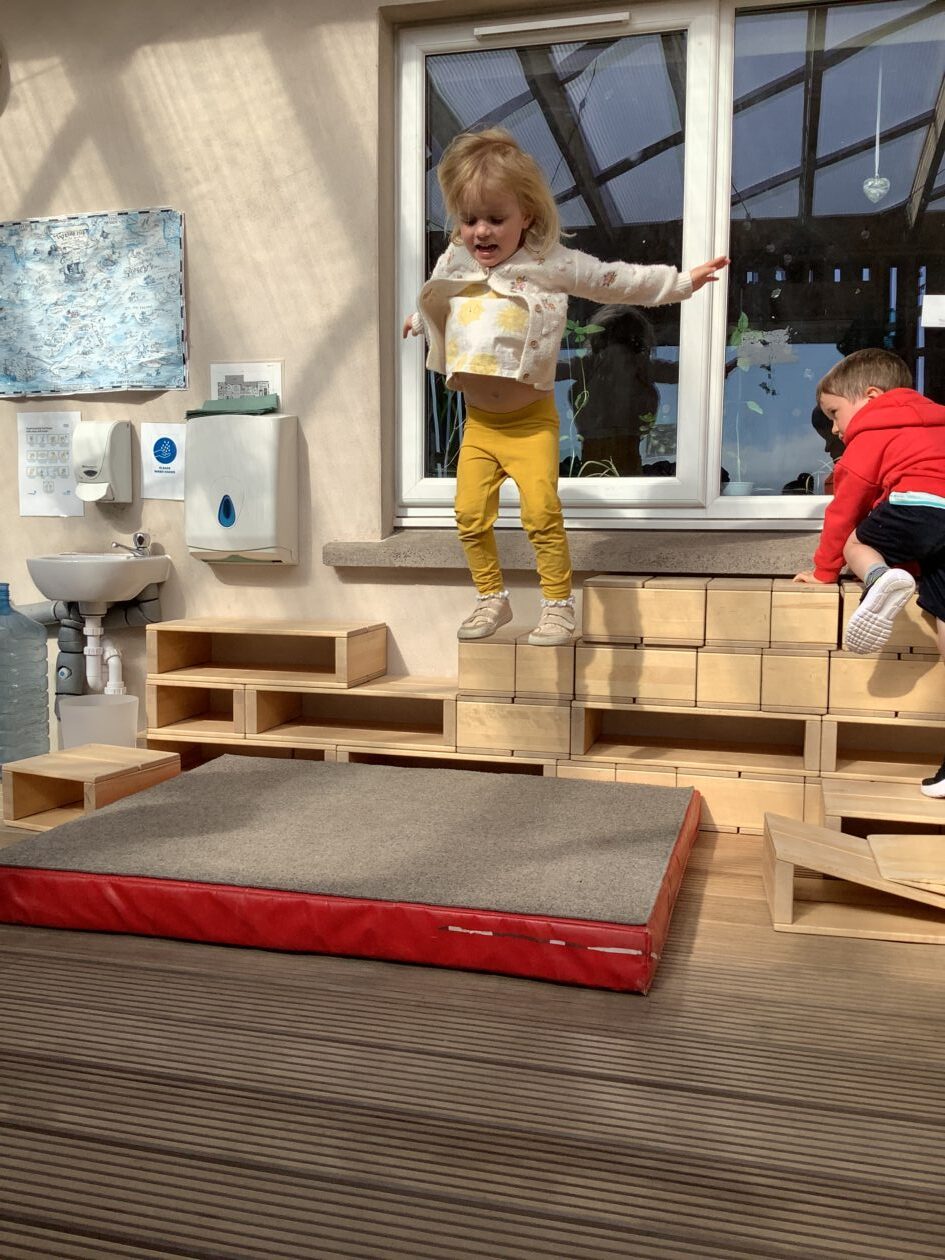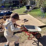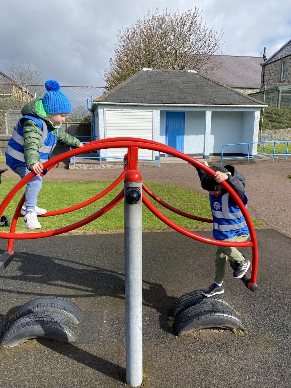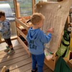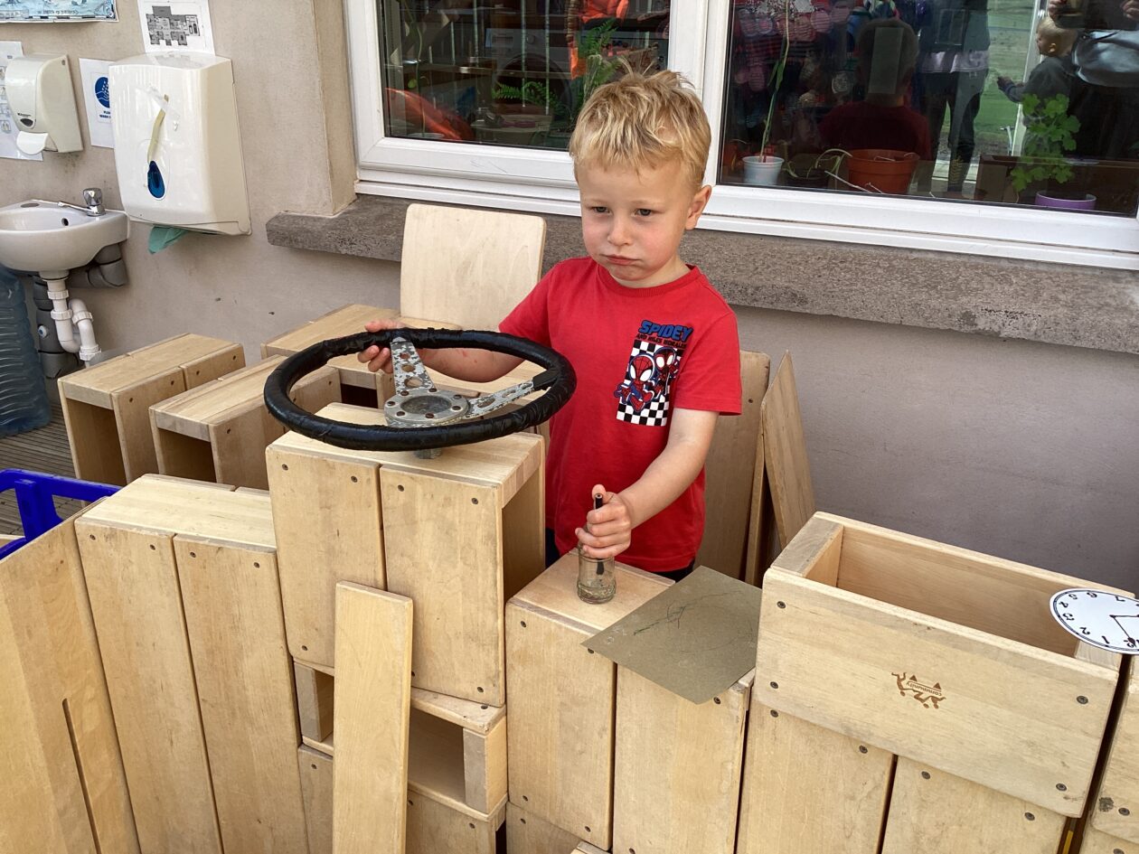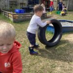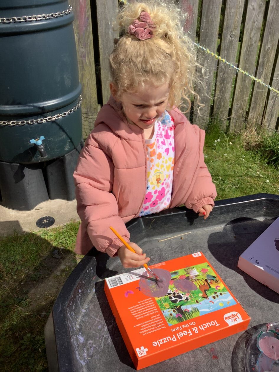 The bairns have been experimenting with different ways to slide down the steep hill in the garden. They have used cardboard, cushions, carpet tiles and slithery breeks! We have also seen lots of engagement with water play and managed to get the solar fountain working as the sun made a bit of a reappearance. We headed to the playpark one afternoon too and the bairns played chasing games, spun on the swings, tried to walk up the slide and got wobbly as jelly on a plate.