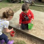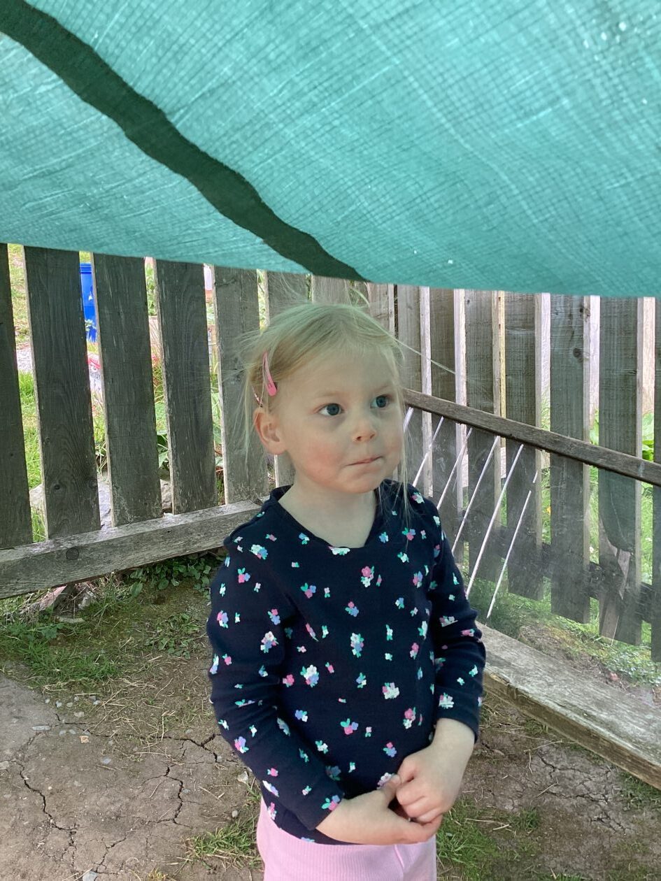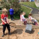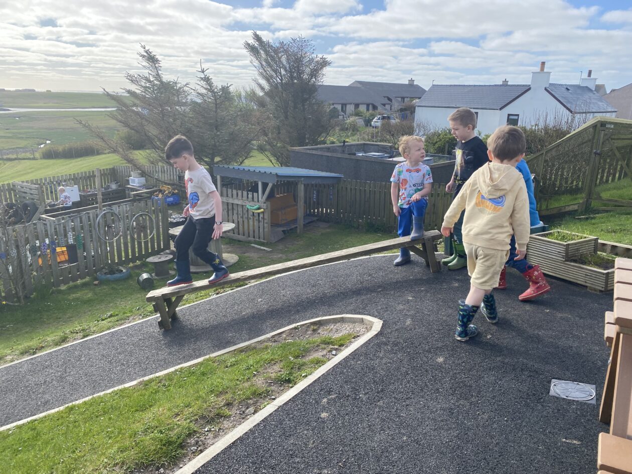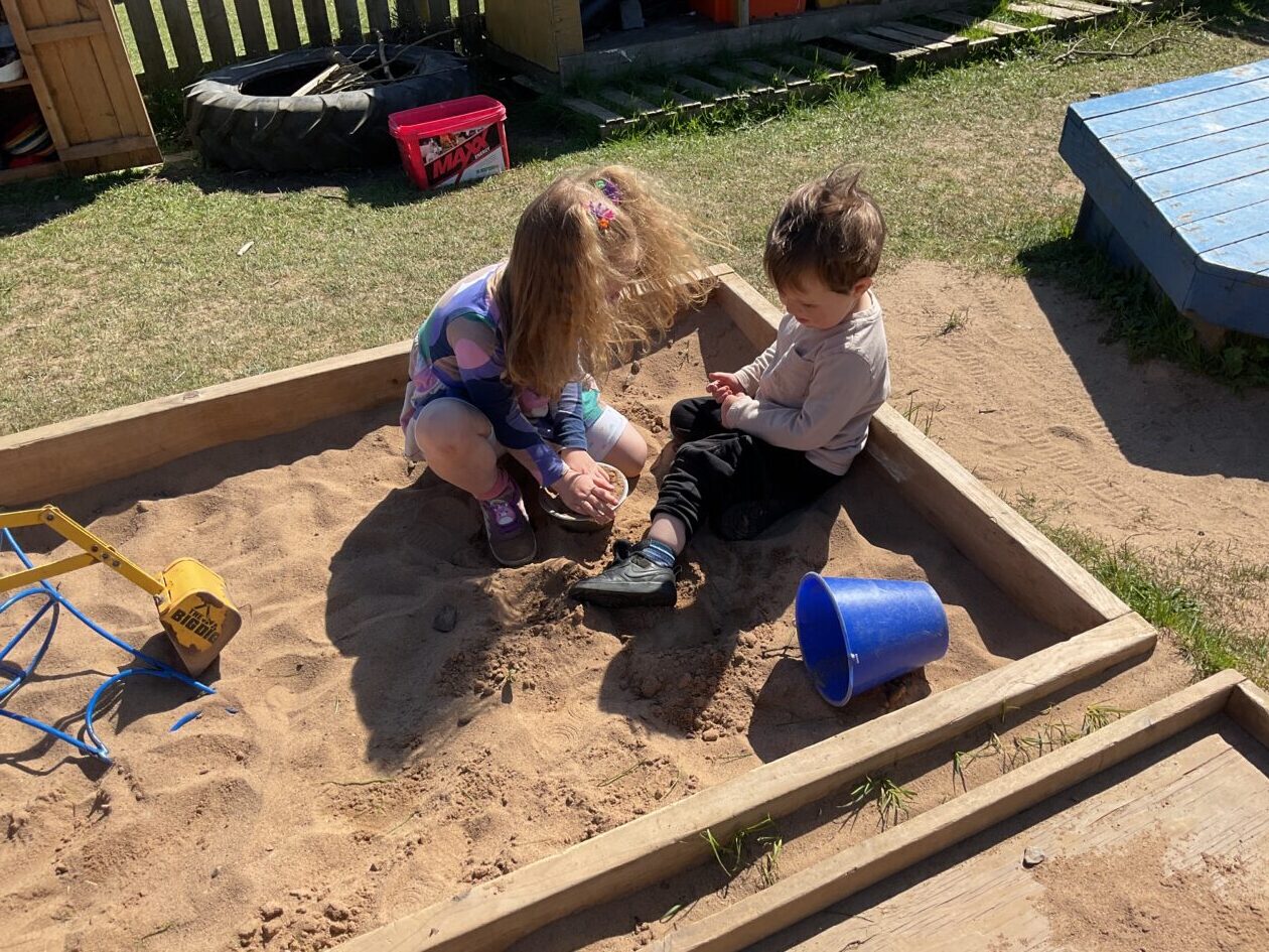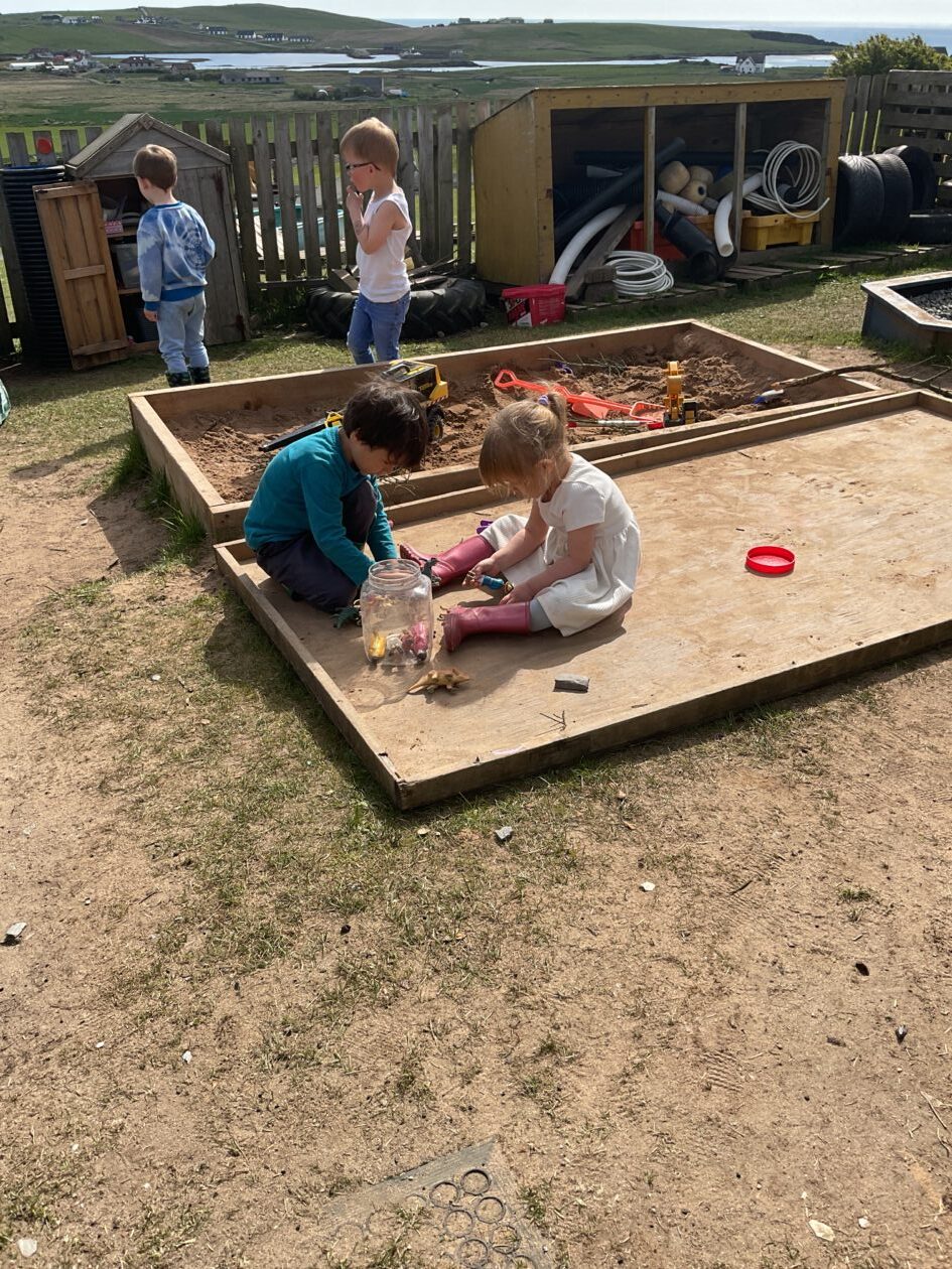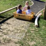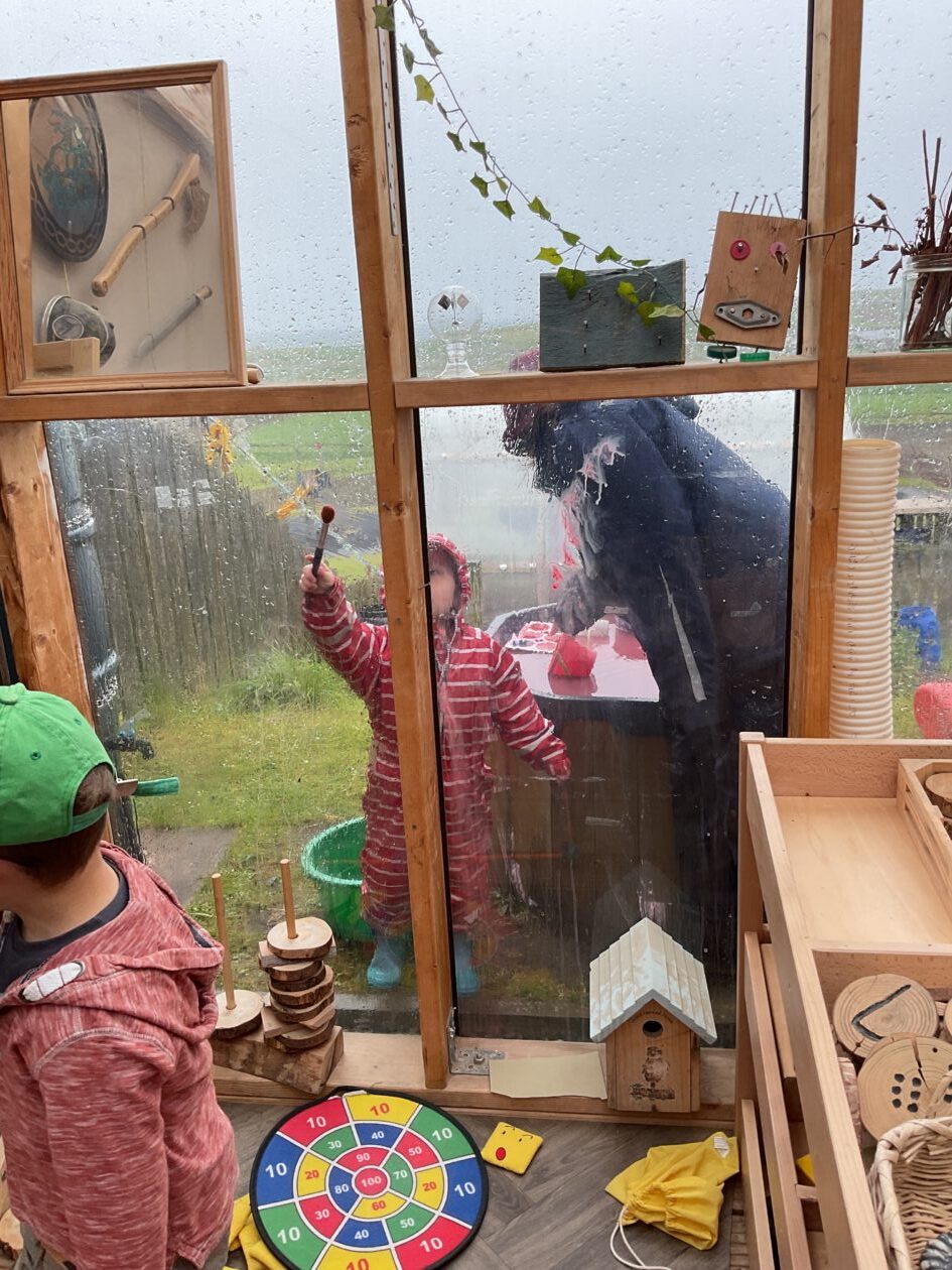 The bairns have been experimenting with different ways to slide down the steep hill in the garden. They have used cardboard, cushions, carpet tiles and slithery breeks! We have also seen lots of engagement with water play and managed to get the solar fountain working as the sun made a bit of a reappearance. We headed to the playpark one afternoon too and the bairns played chasing games, spun on the swings, tried to walk up the slide and got wobbly as jelly on a plate.