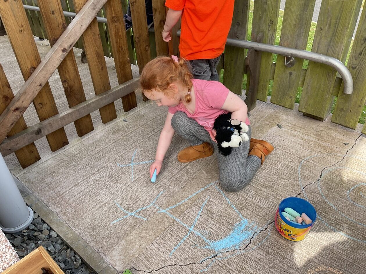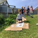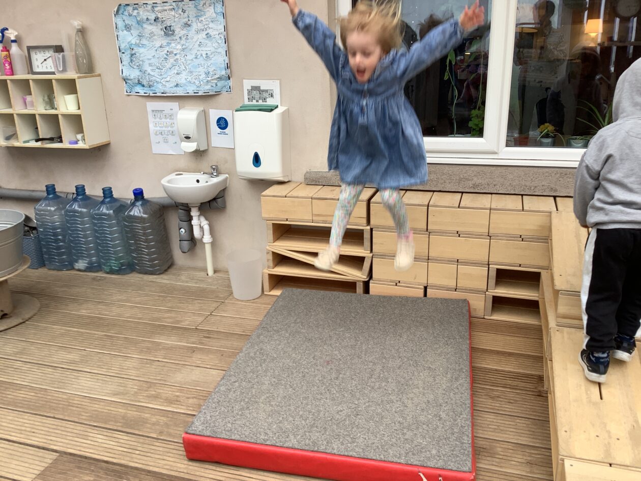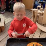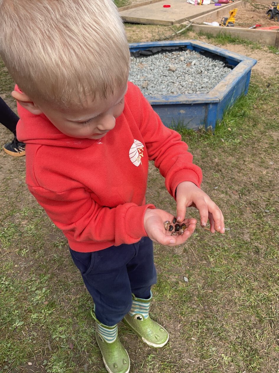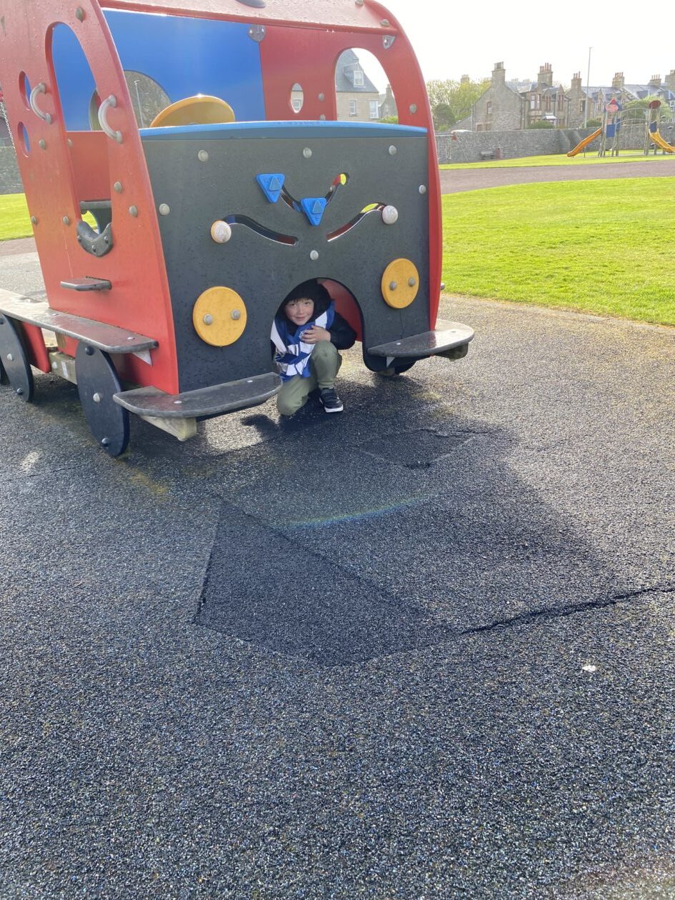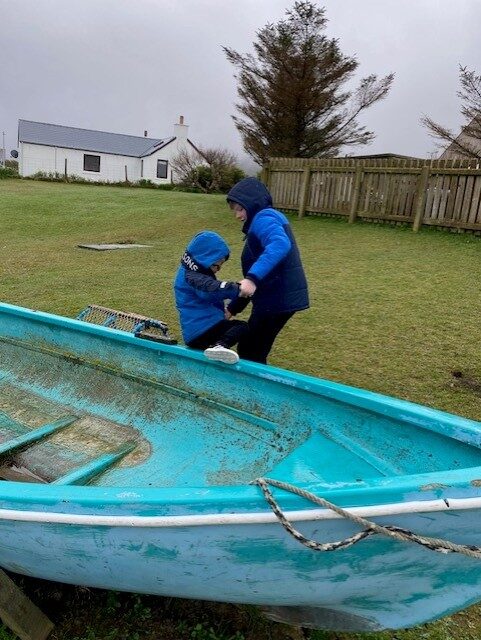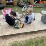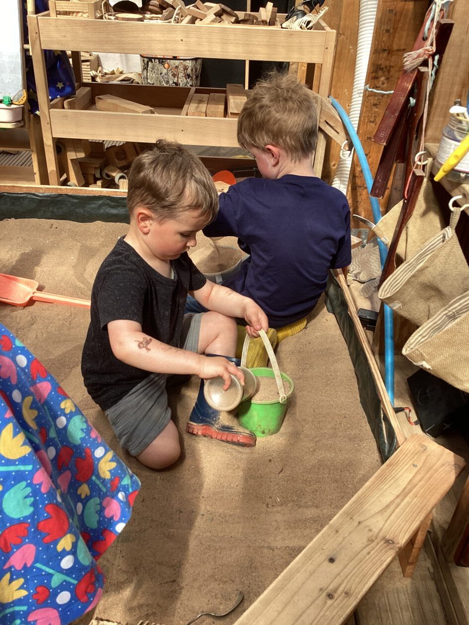 The bairns have been experimenting with different ways to slide down the steep hill in the garden. They have used cardboard, cushions, carpet tiles and slithery breeks! We have also seen lots of engagement with water play and managed to get the solar fountain working as the sun made a bit of a reappearance. We headed to the playpark one afternoon too and the bairns played chasing games, spun on the swings, tried to walk up the slide and got wobbly as jelly on a plate.