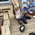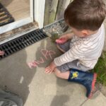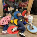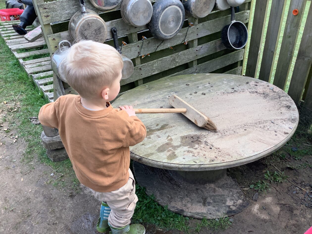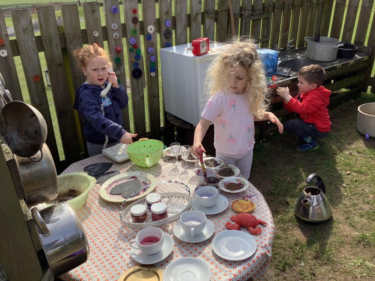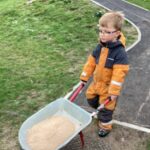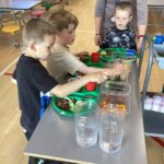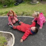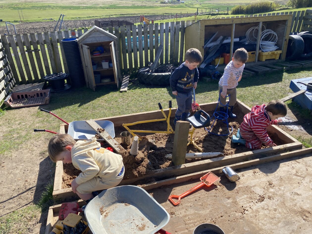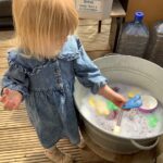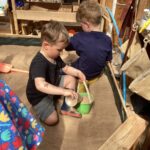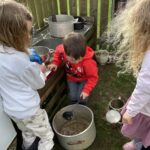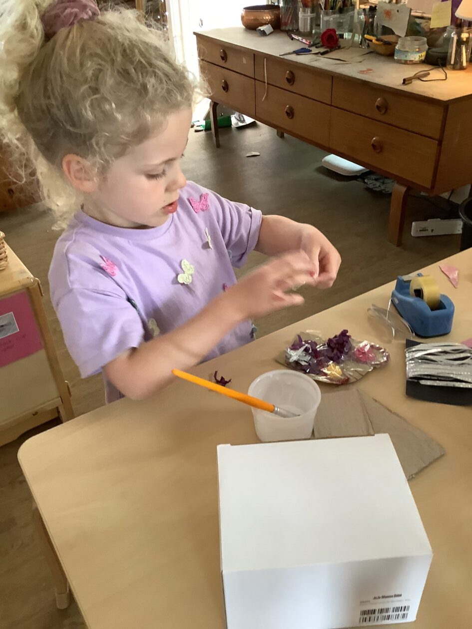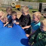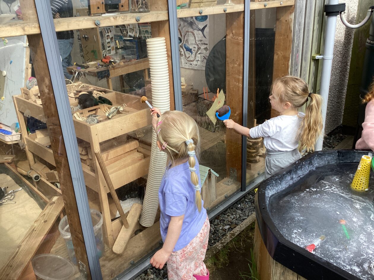 The bairns have been experimenting with different ways to slide down the steep hill in the garden. They have used cardboard, cushions, carpet tiles and slithery breeks! We have also seen lots of engagement with water play and managed to get the solar fountain working as the sun made a bit of a reappearance. We headed to the playpark one afternoon too and the bairns played chasing games, spun on the swings, tried to walk up the slide and got wobbly as jelly on a plate.