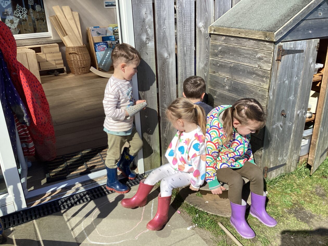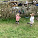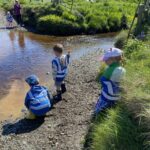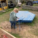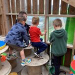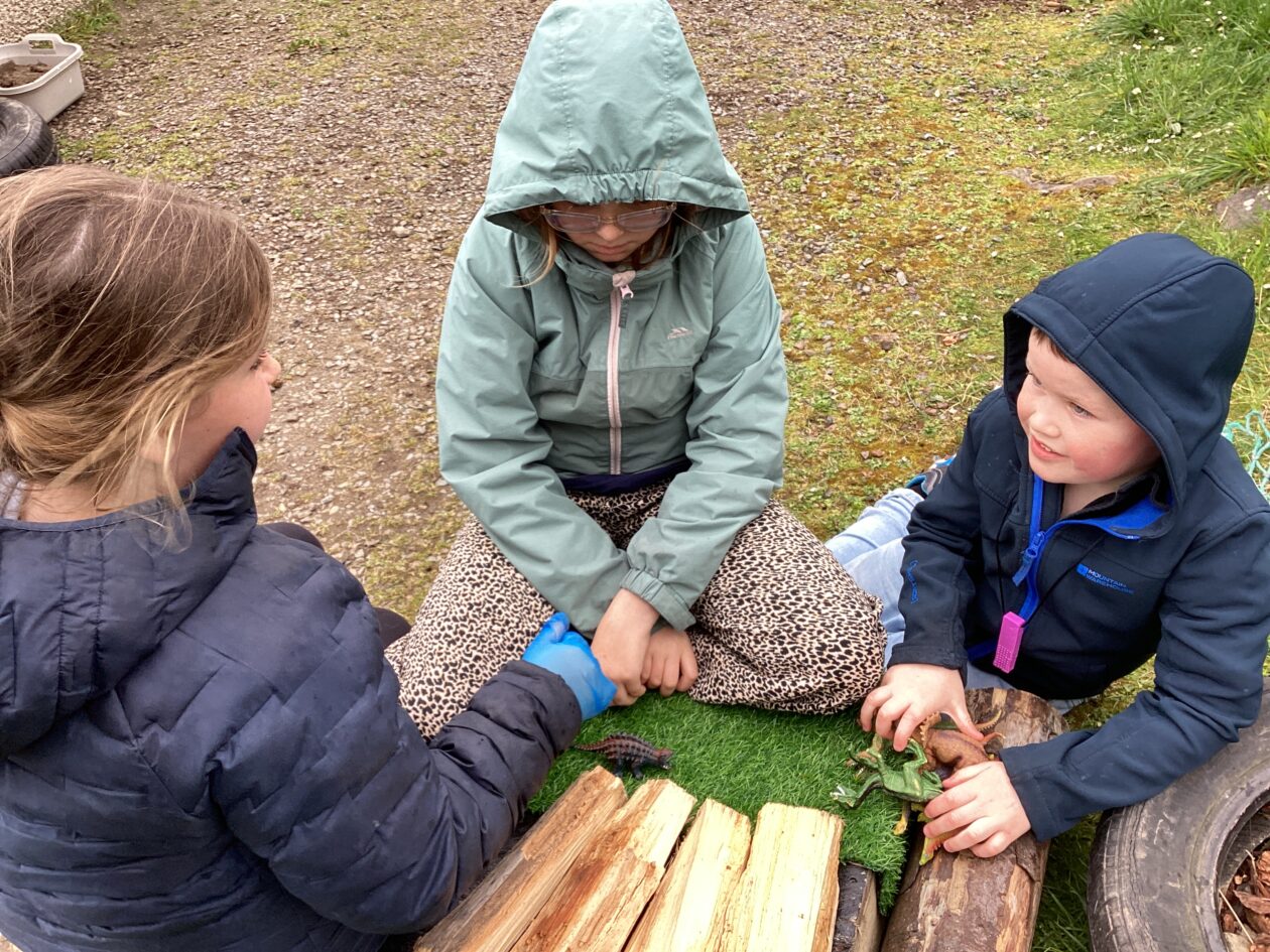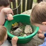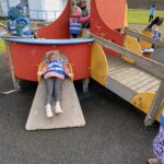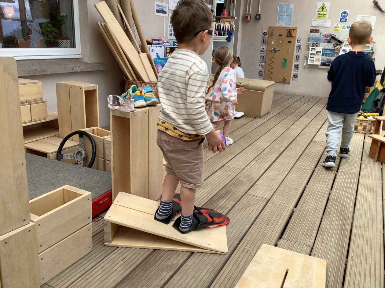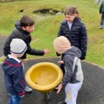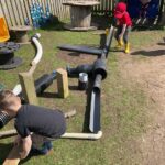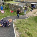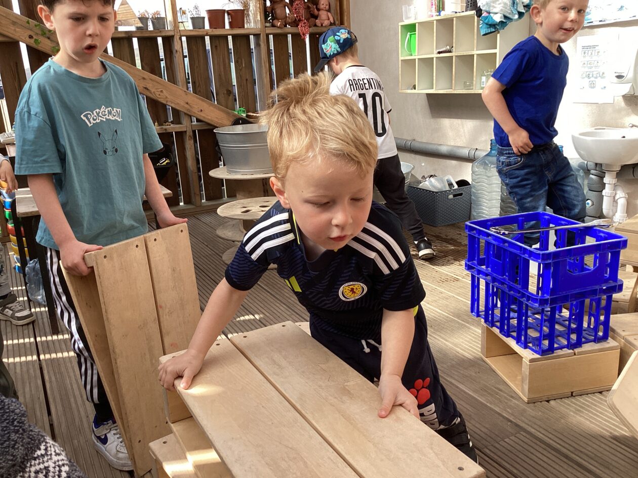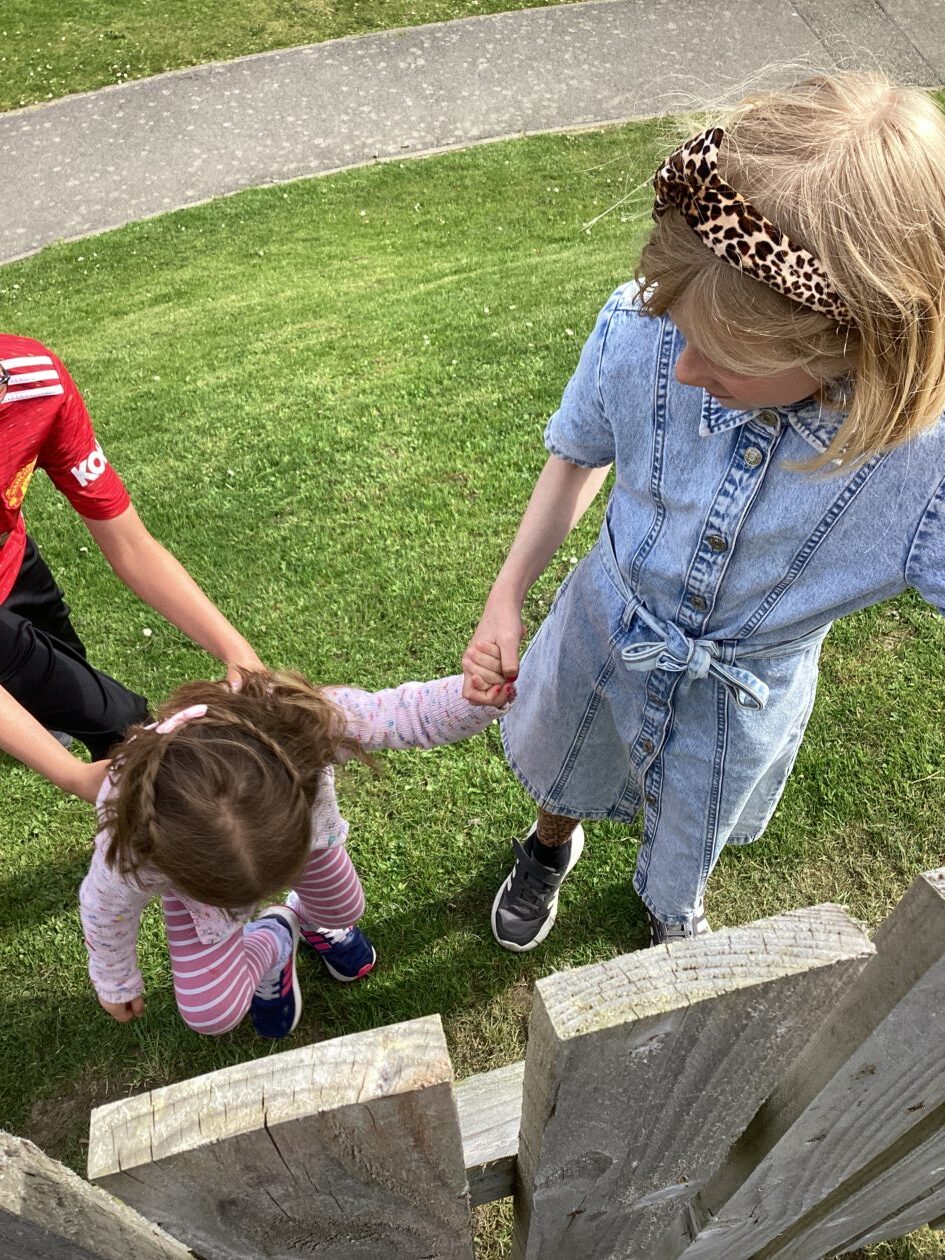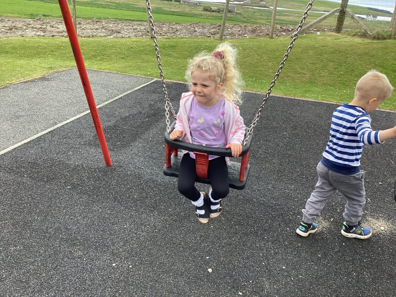 The bairns have been experimenting with different ways to slide down the steep hill in the garden. They have used cardboard, cushions, carpet tiles and slithery breeks! We have also seen lots of engagement with water play and managed to get the solar fountain working as the sun made a bit of a reappearance. We headed to the playpark one afternoon too and the bairns played chasing games, spun on the swings, tried to walk up the slide and got wobbly as jelly on a plate.
