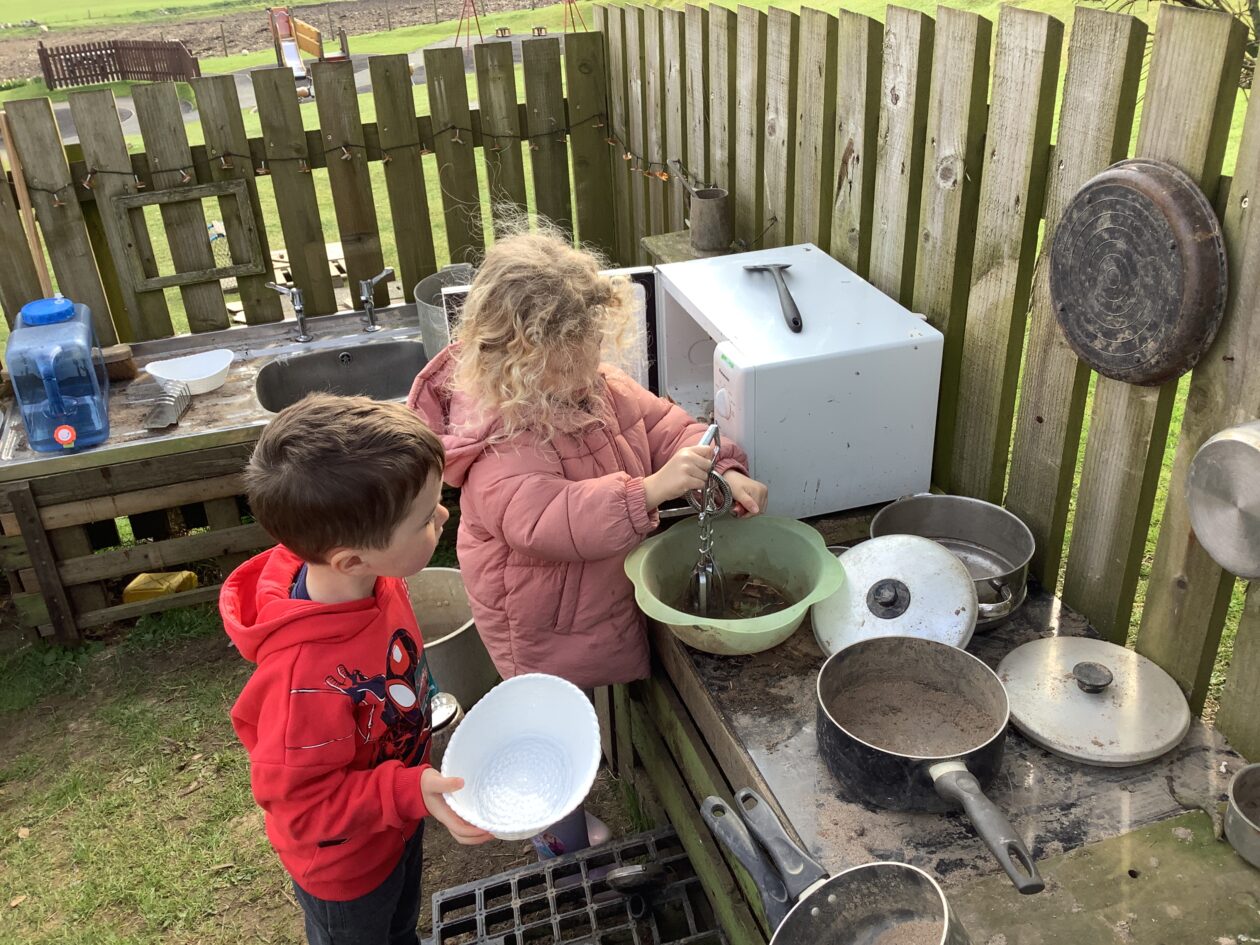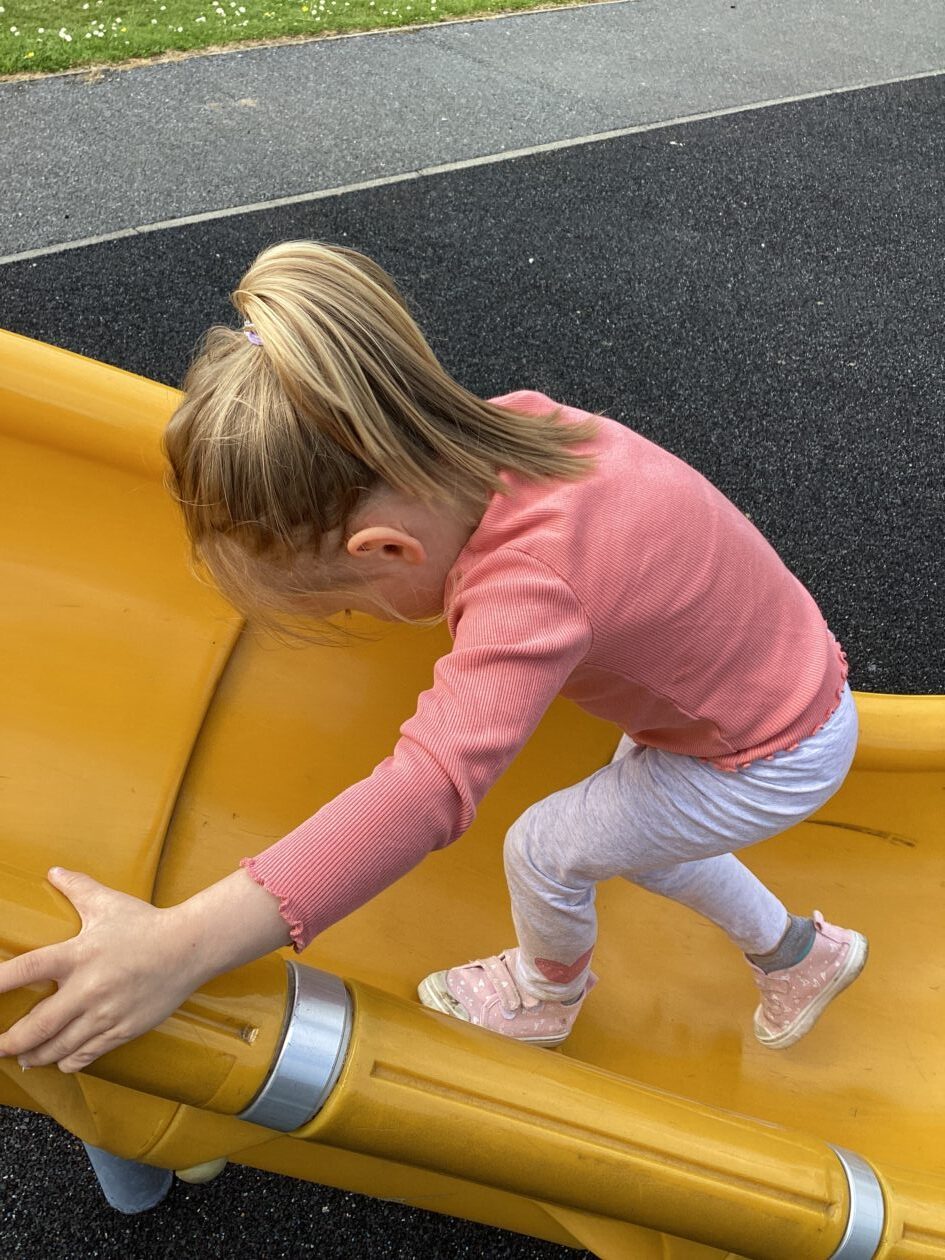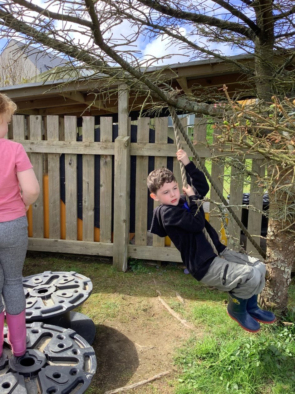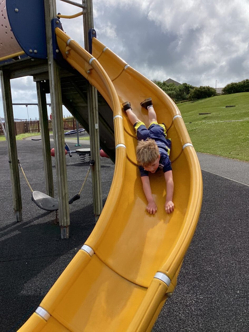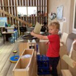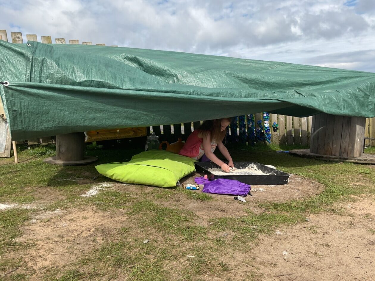 The bairns have been experimenting with different ways to slide down the steep hill in the garden. They have used cardboard, cushions, carpet tiles and slithery breeks! We have also seen lots of engagement with water play and managed to get the solar fountain working as the sun made a bit of a reappearance. We headed to the playpark one afternoon too and the bairns played chasing games, spun on the swings, tried to walk up the slide and got wobbly as jelly on a plate.