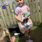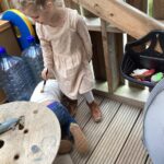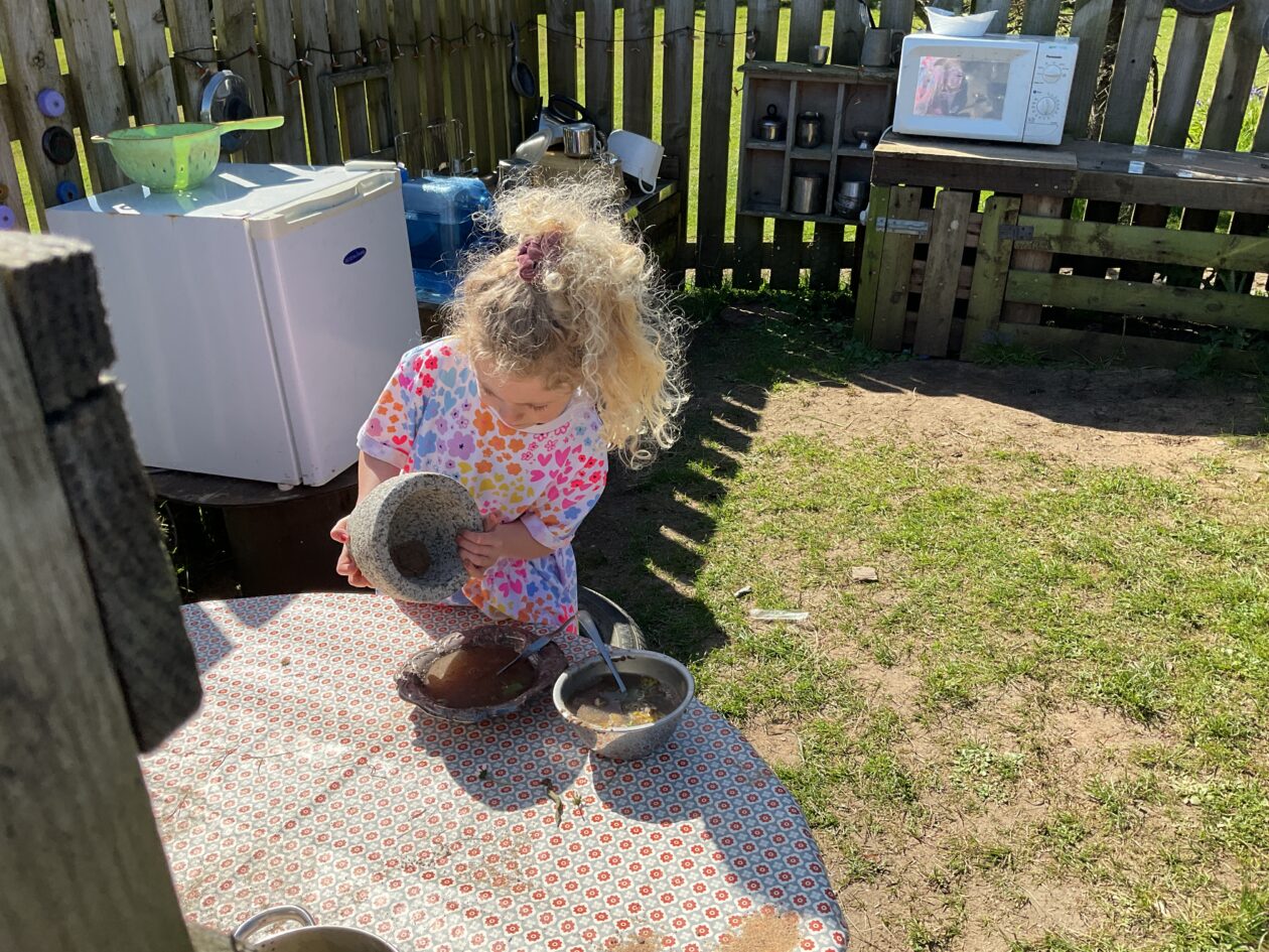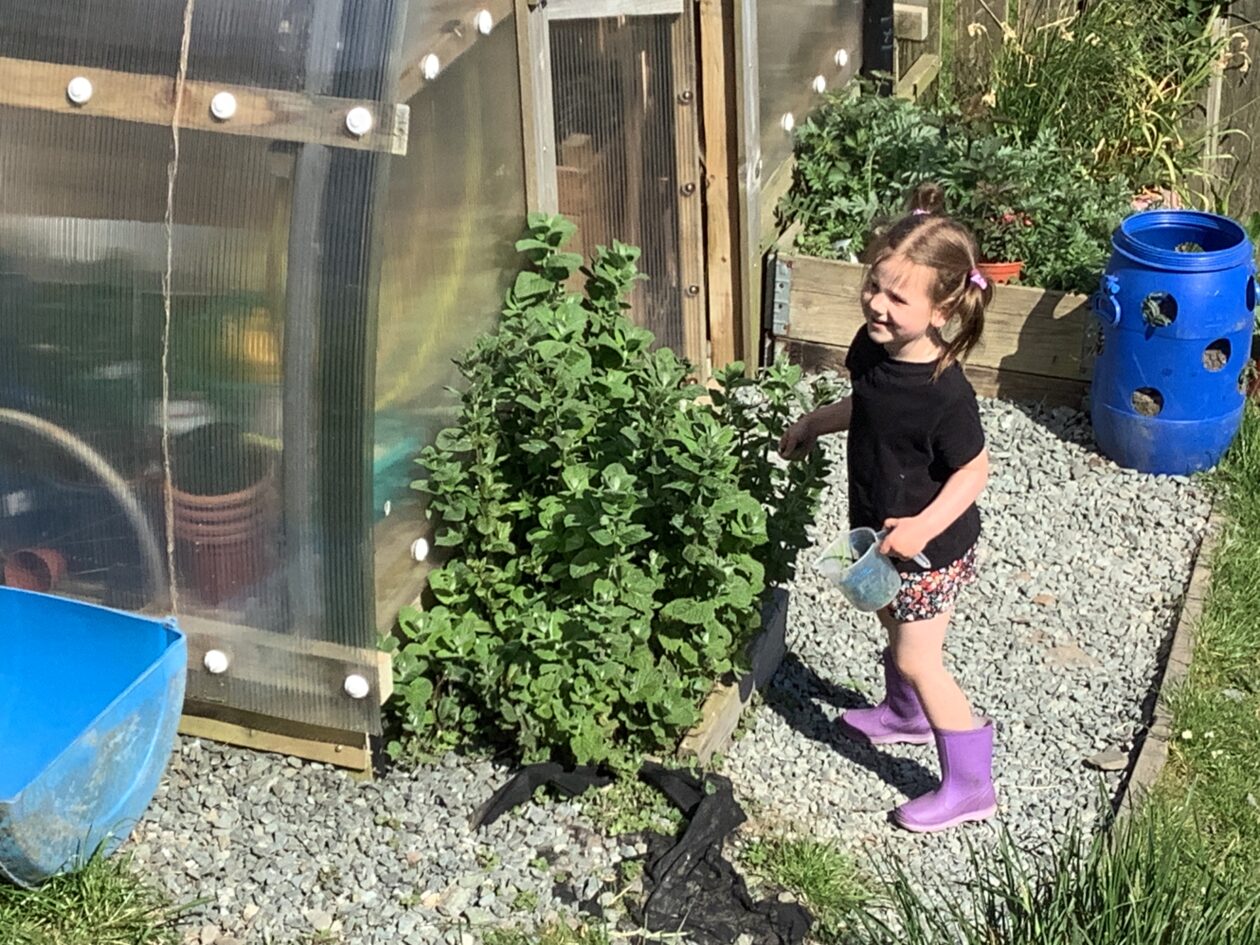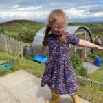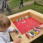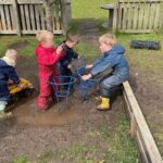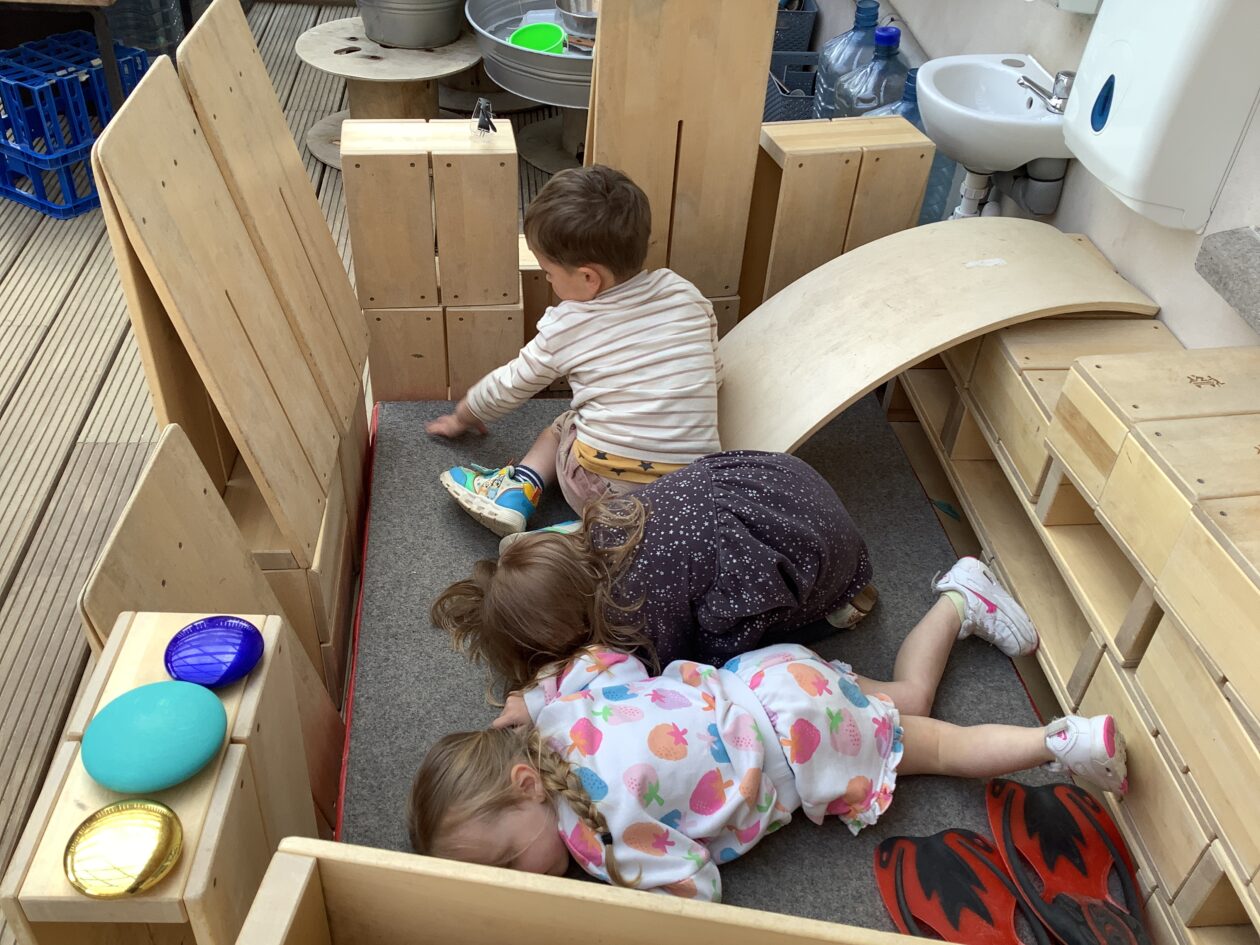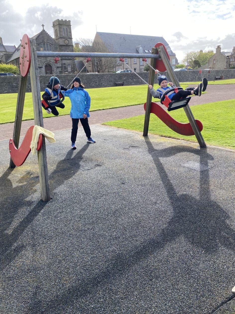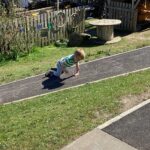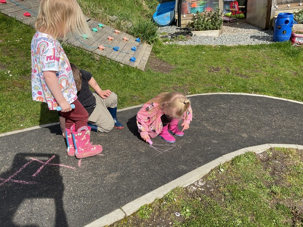 The bairns have been experimenting with different ways to slide down the steep hill in the garden. They have used cardboard, cushions, carpet tiles and slithery breeks! We have also seen lots of engagement with water play and managed to get the solar fountain working as the sun made a bit of a reappearance. We headed to the playpark one afternoon too and the bairns played chasing games, spun on the swings, tried to walk up the slide and got wobbly as jelly on a plate.