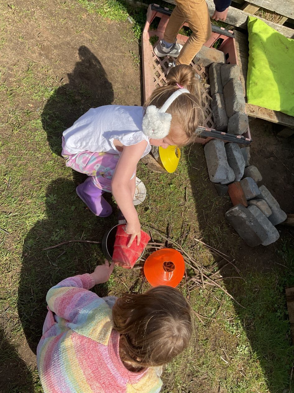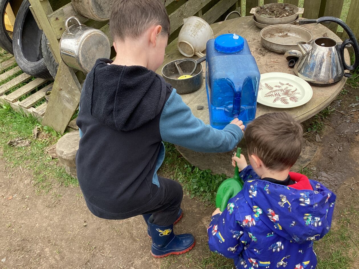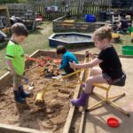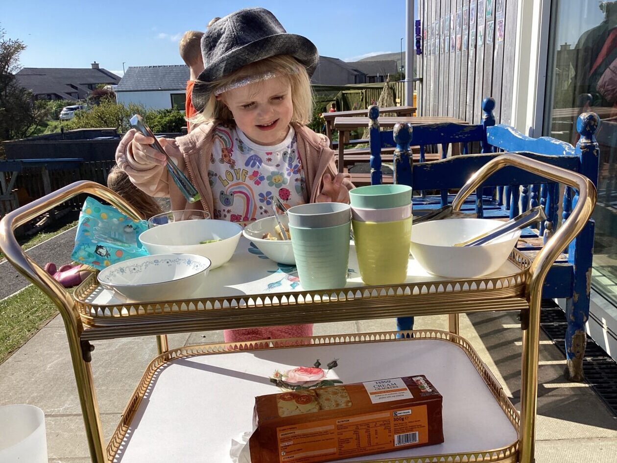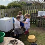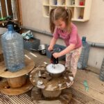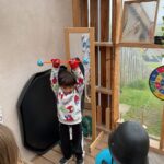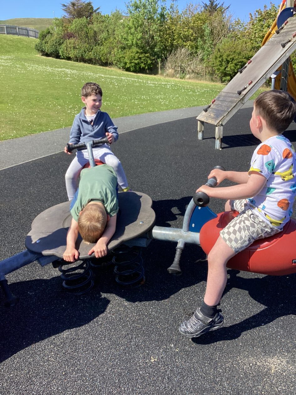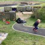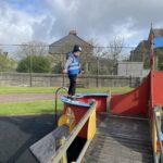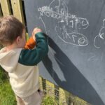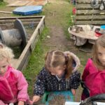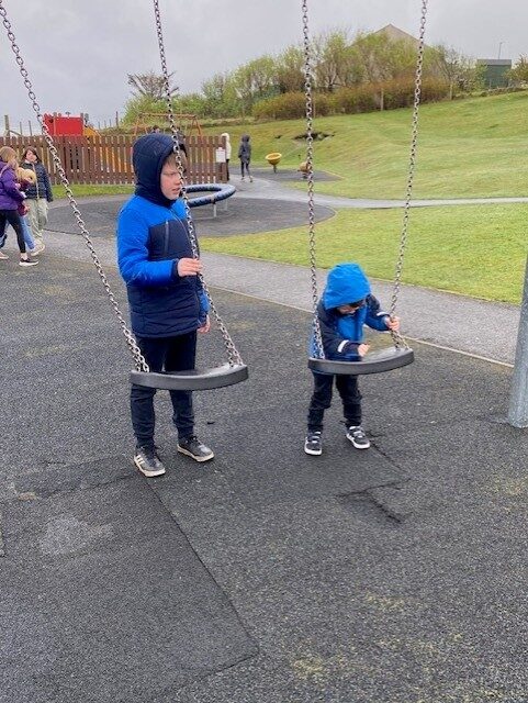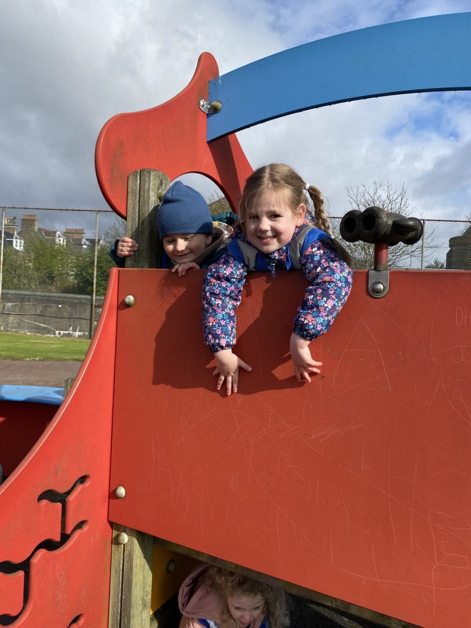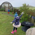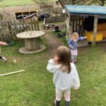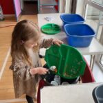 The bairns have been experimenting with different ways to slide down the steep hill in the garden. They have used cardboard, cushions, carpet tiles and slithery breeks! We have also seen lots of engagement with water play and managed to get the solar fountain working as the sun made a bit of a reappearance. We headed to the playpark one afternoon too and the bairns played chasing games, spun on the swings, tried to walk up the slide and got wobbly as jelly on a plate.