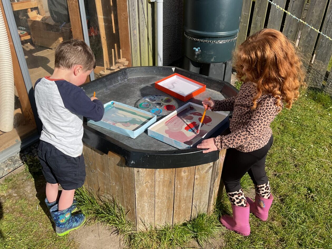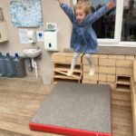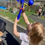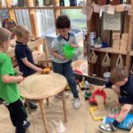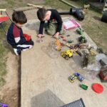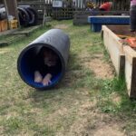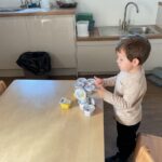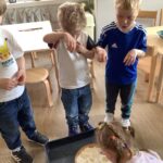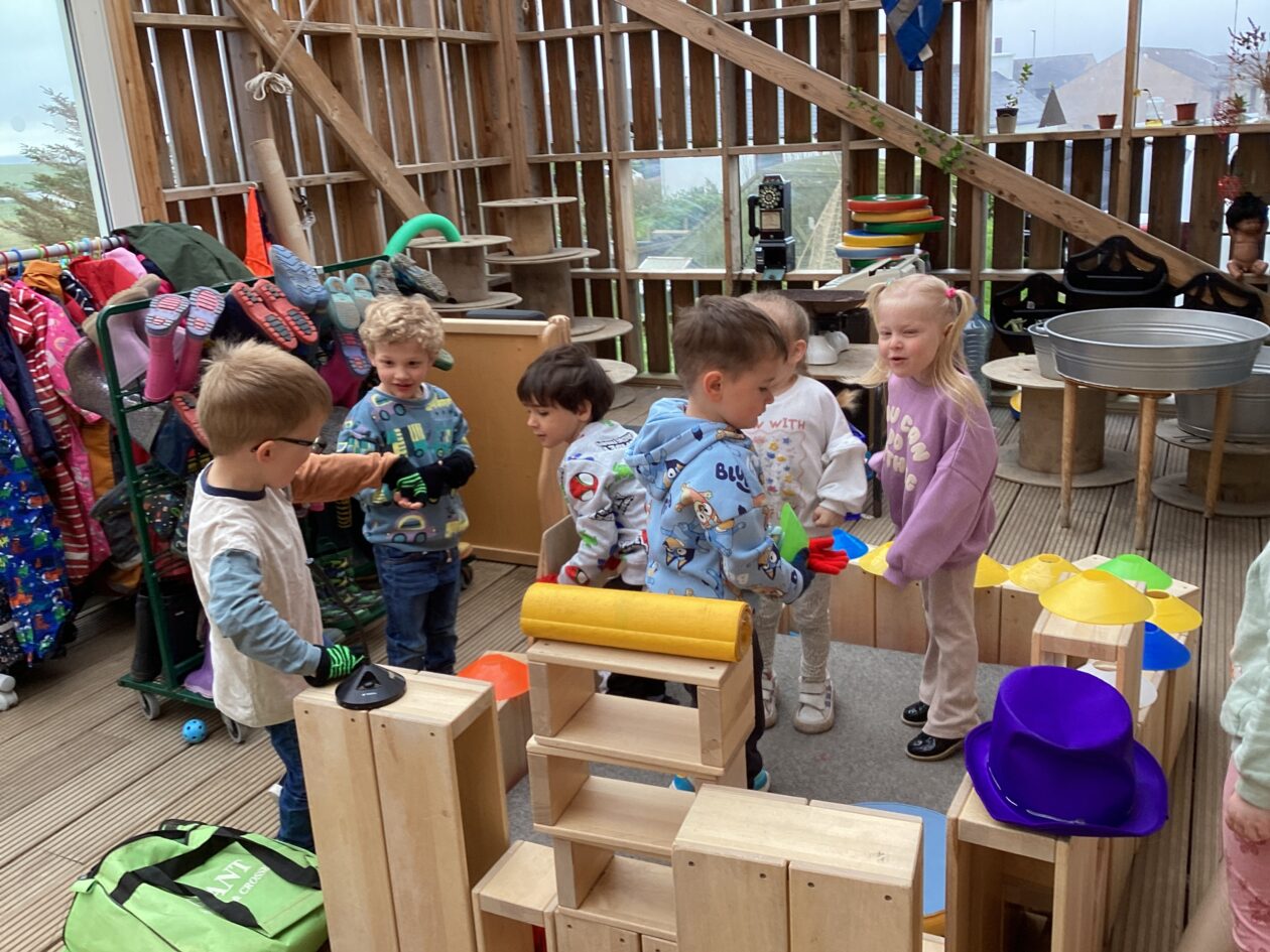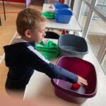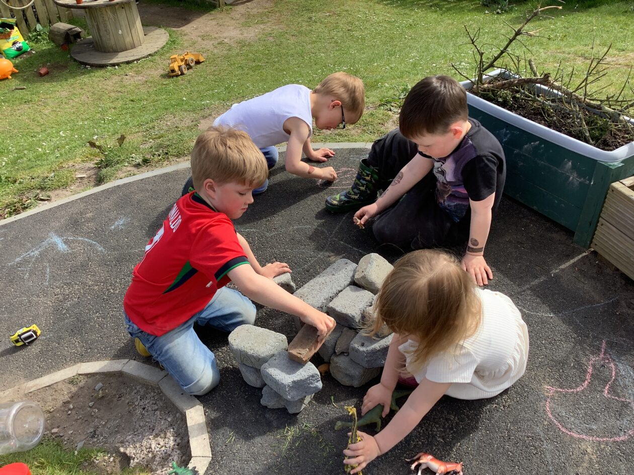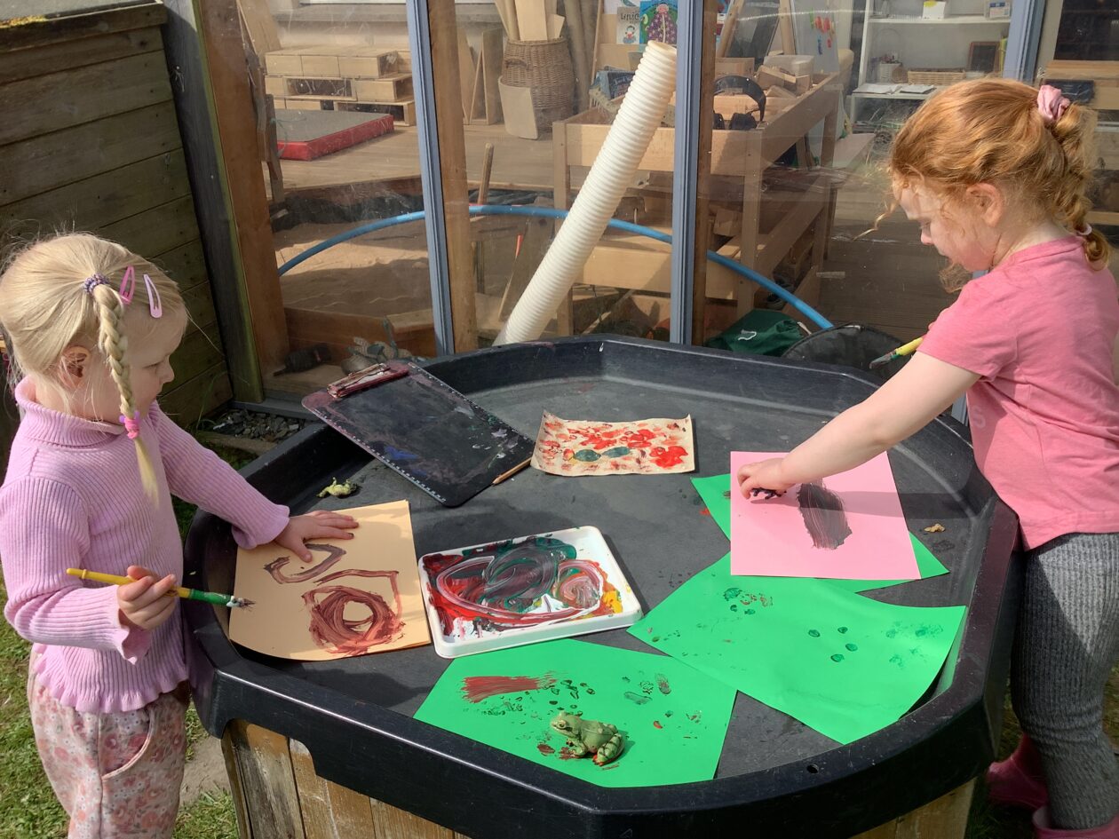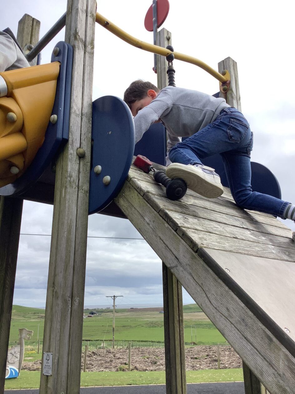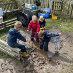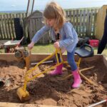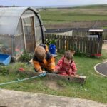 The bairns have been experimenting with different ways to slide down the steep hill in the garden. They have used cardboard, cushions, carpet tiles and slithery breeks! We have also seen lots of engagement with water play and managed to get the solar fountain working as the sun made a bit of a reappearance. We headed to the playpark one afternoon too and the bairns played chasing games, spun on the swings, tried to walk up the slide and got wobbly as jelly on a plate.