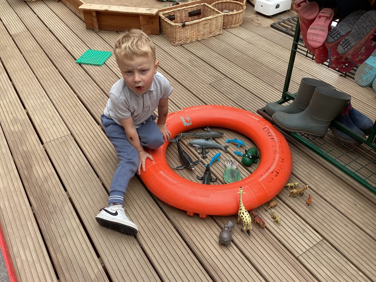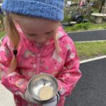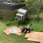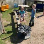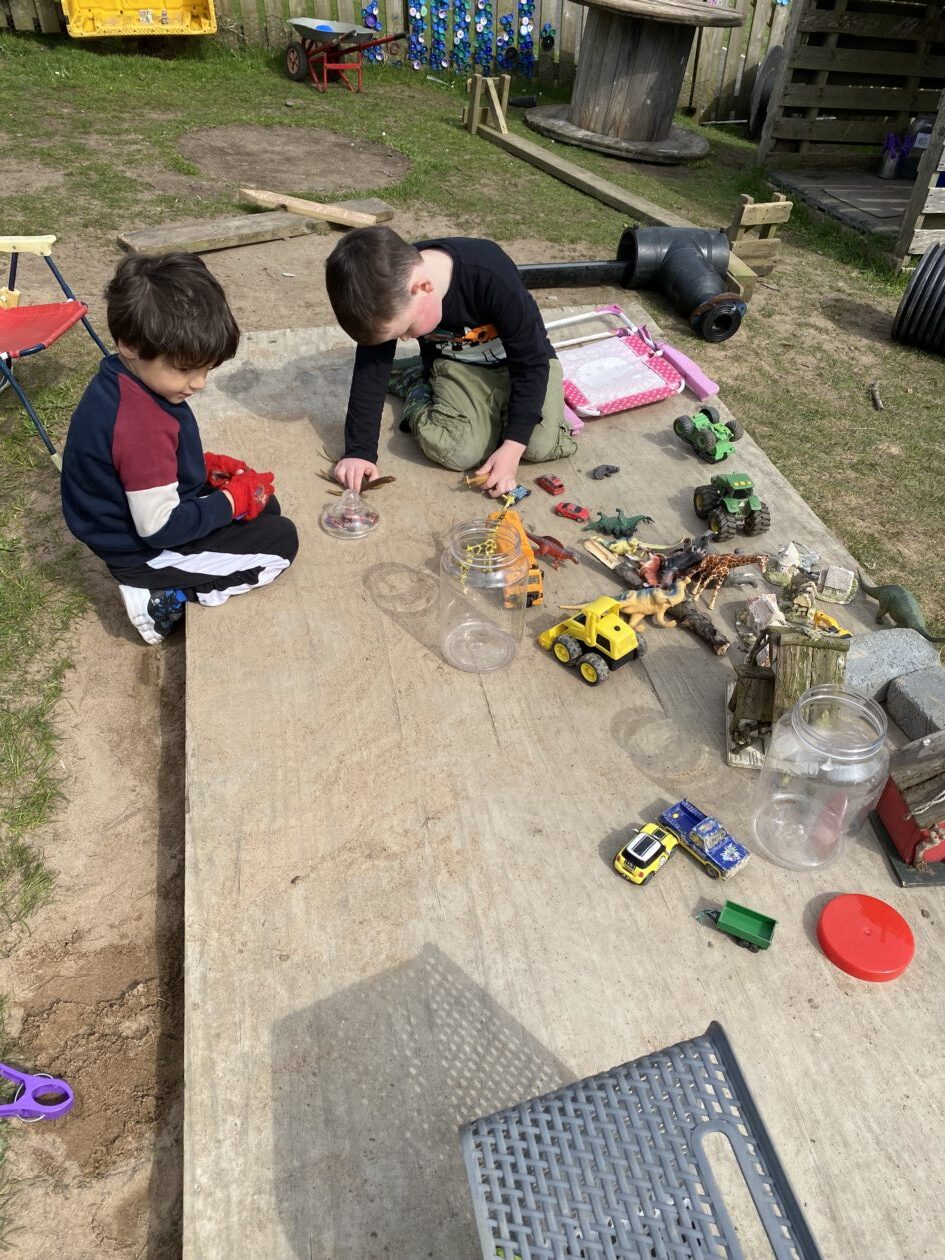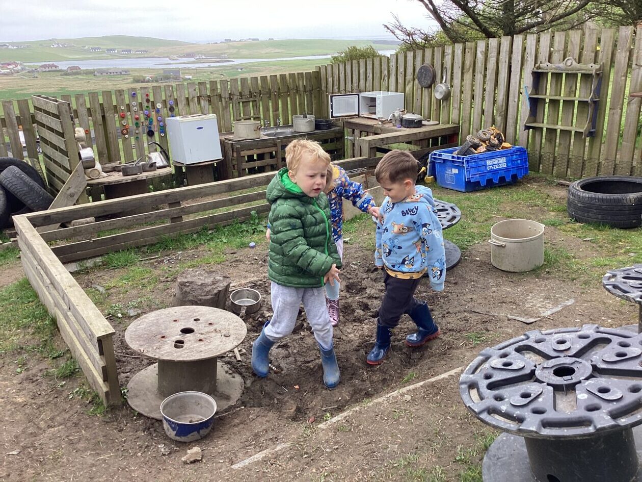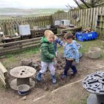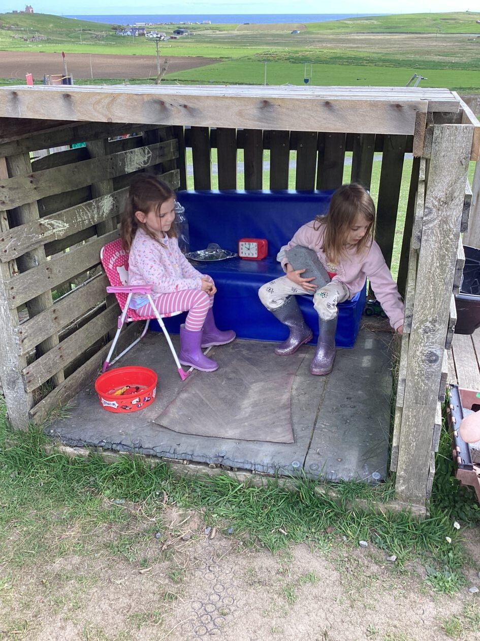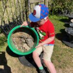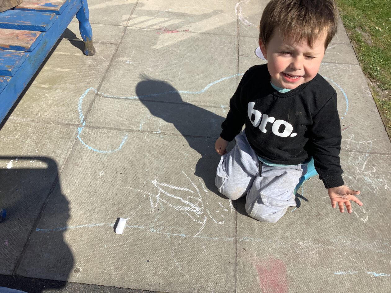 The bairns have been experimenting with different ways to slide down the steep hill in the garden. They have used cardboard, cushions, carpet tiles and slithery breeks! We have also seen lots of engagement with water play and managed to get the solar fountain working as the sun made a bit of a reappearance. We headed to the playpark one afternoon too and the bairns played chasing games, spun on the swings, tried to walk up the slide and got wobbly as jelly on a plate.