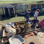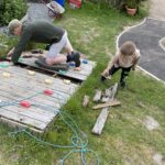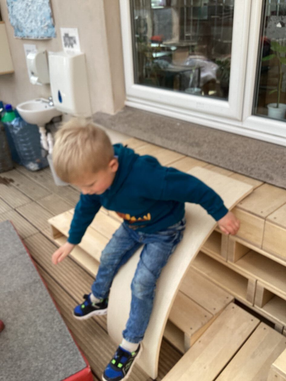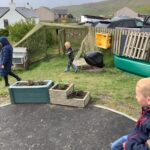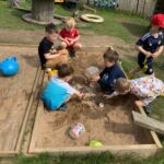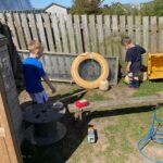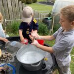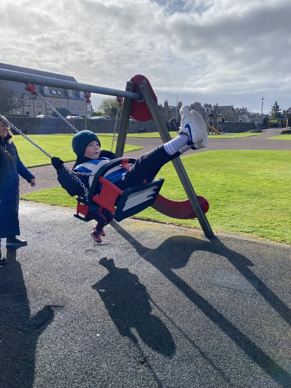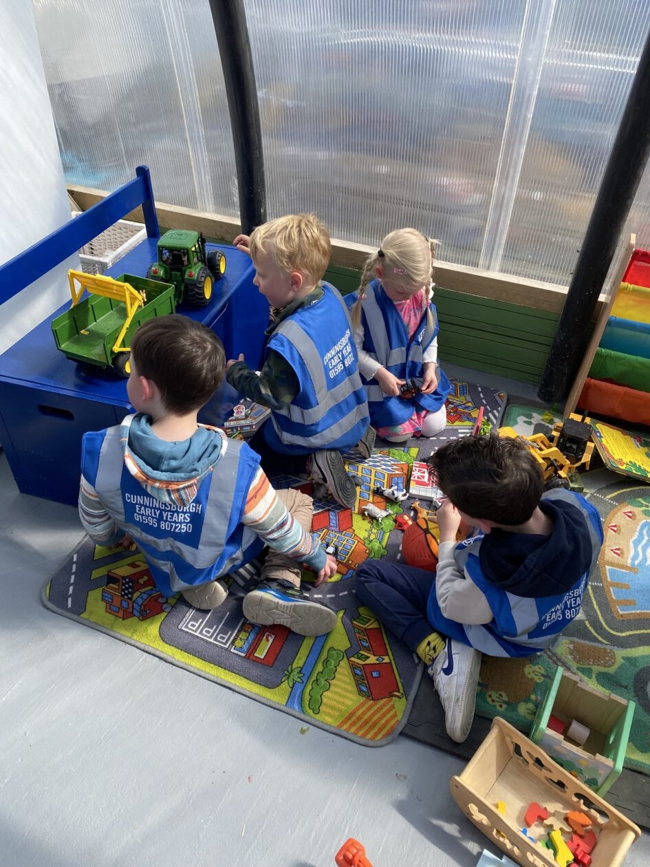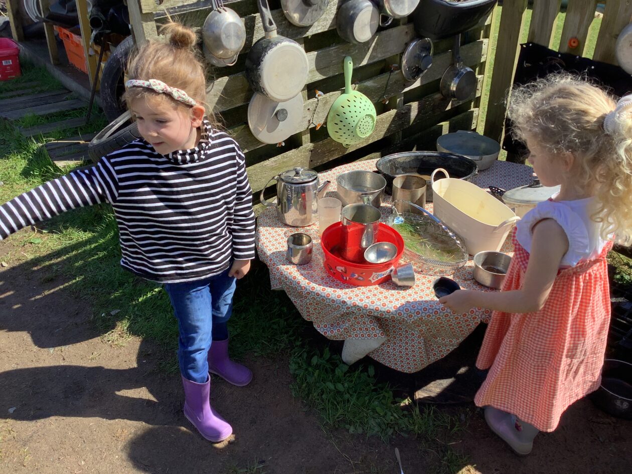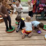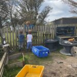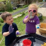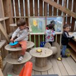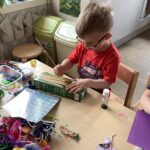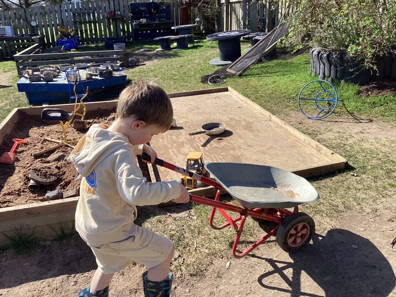 The bairns have been experimenting with different ways to slide down the steep hill in the garden. They have used cardboard, cushions, carpet tiles and slithery breeks! We have also seen lots of engagement with water play and managed to get the solar fountain working as the sun made a bit of a reappearance. We headed to the playpark one afternoon too and the bairns played chasing games, spun on the swings, tried to walk up the slide and got wobbly as jelly on a plate.