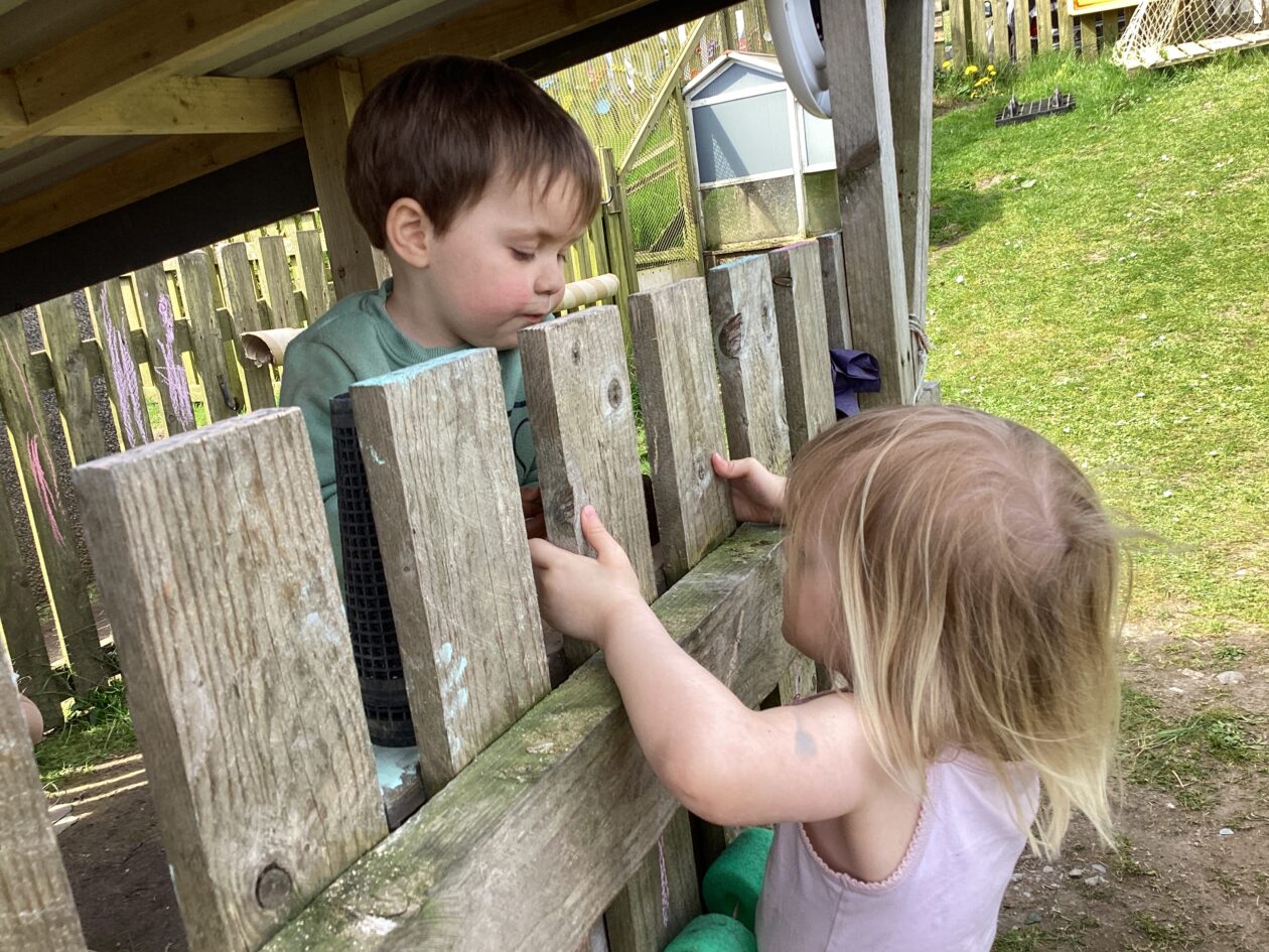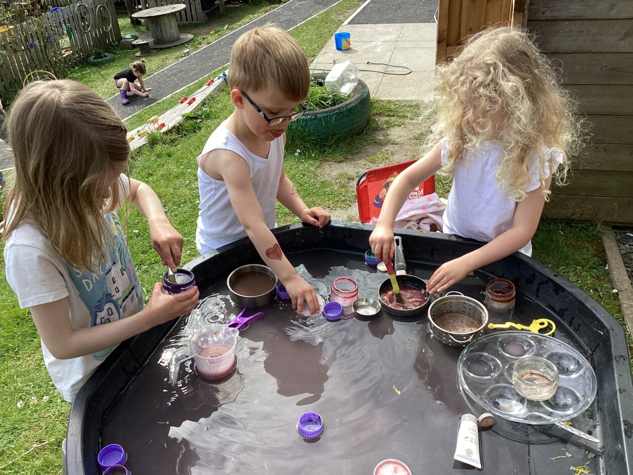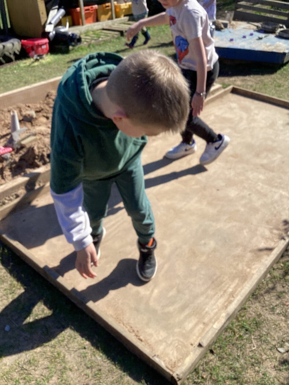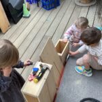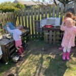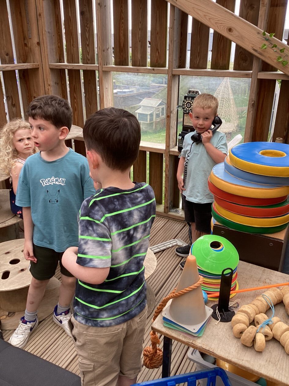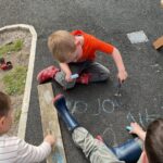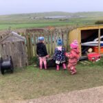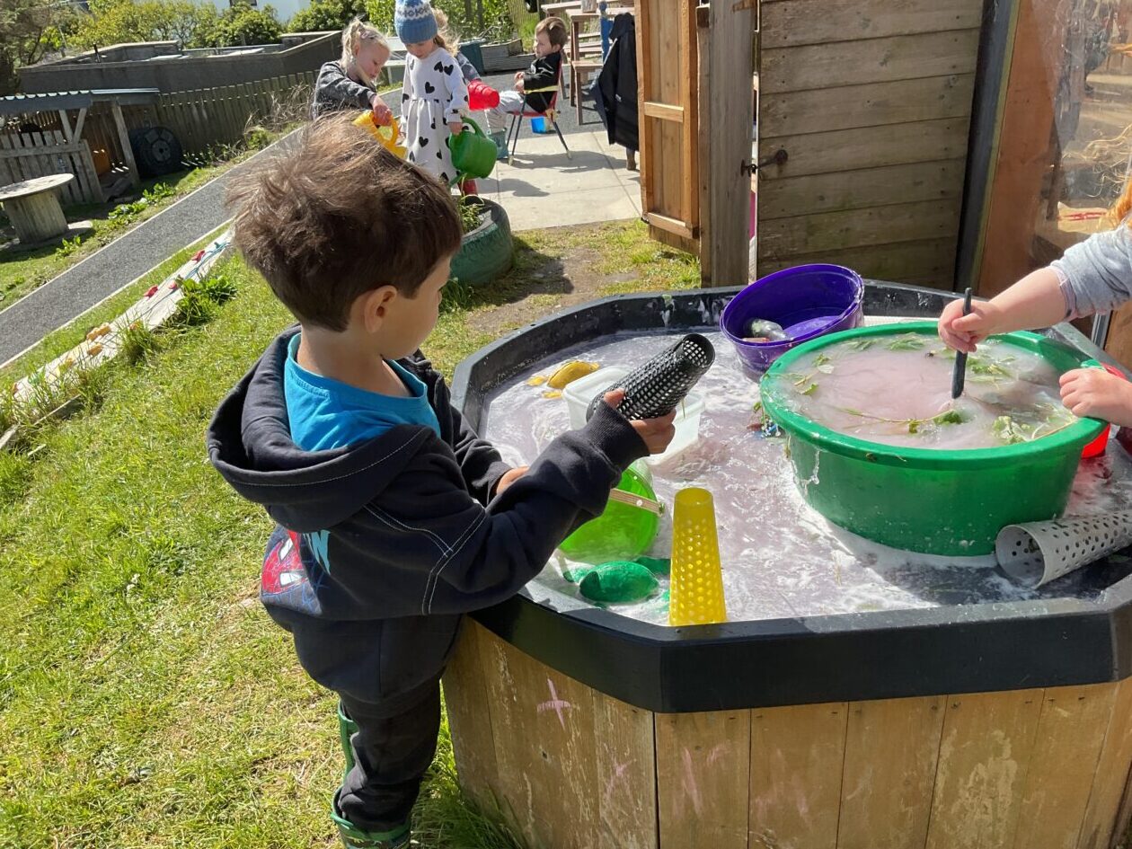 The bairns have been experimenting with different ways to slide down the steep hill in the garden. They have used cardboard, cushions, carpet tiles and slithery breeks! We have also seen lots of engagement with water play and managed to get the solar fountain working as the sun made a bit of a reappearance. We headed to the playpark one afternoon too and the bairns played chasing games, spun on the swings, tried to walk up the slide and got wobbly as jelly on a plate.