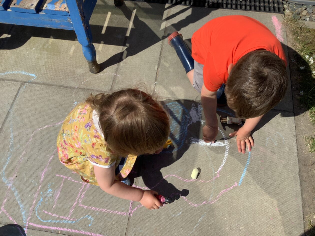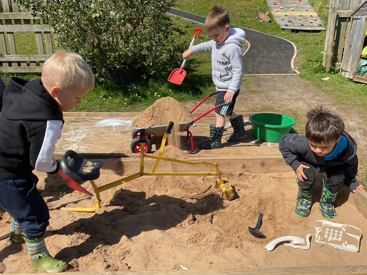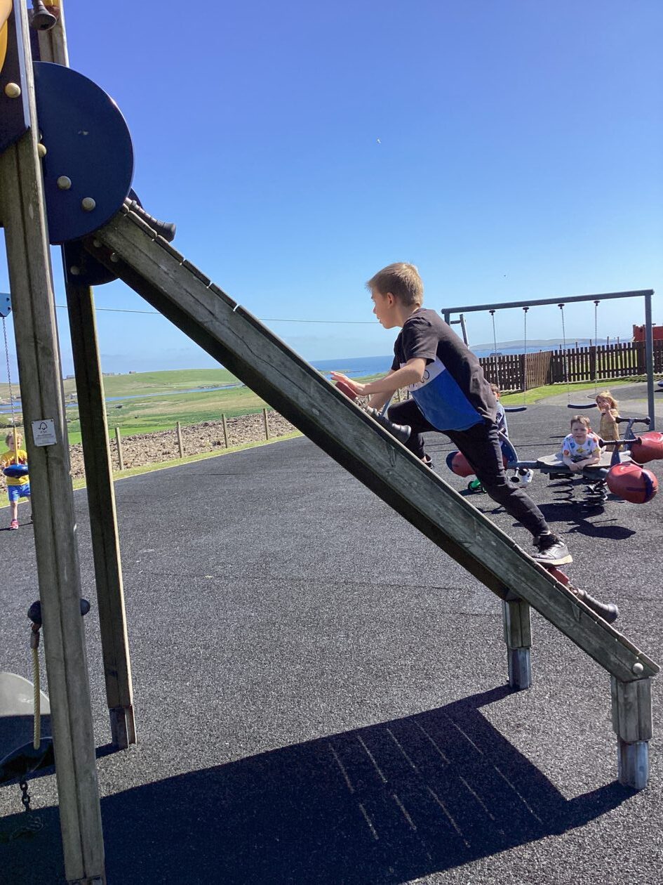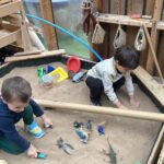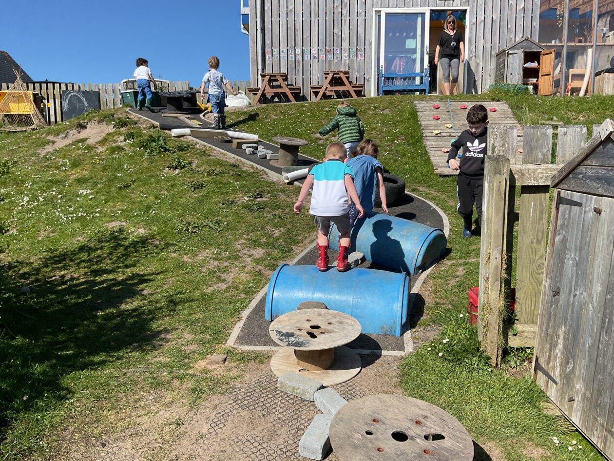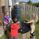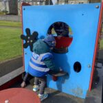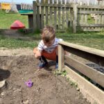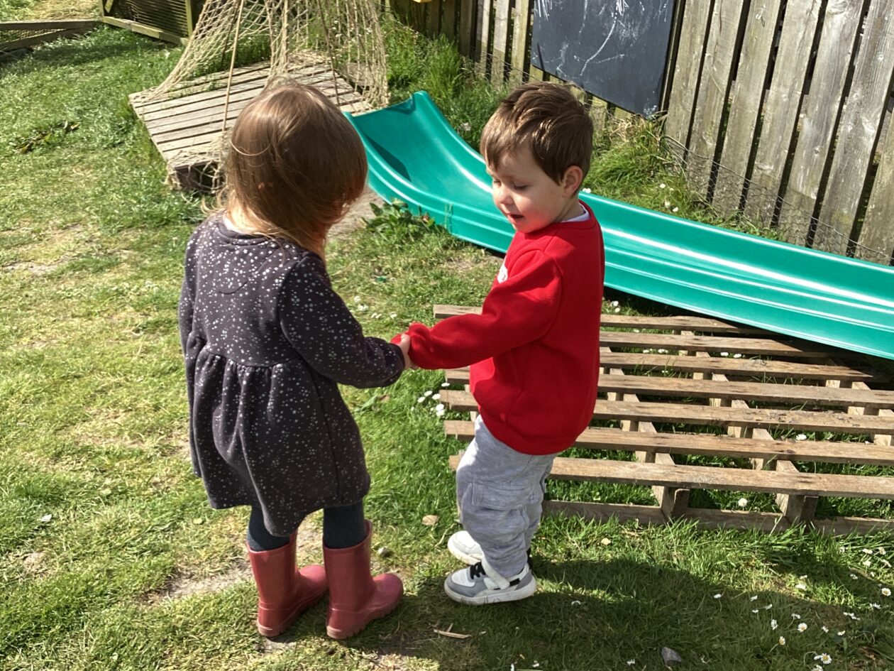 The bairns have been experimenting with different ways to slide down the steep hill in the garden. They have used cardboard, cushions, carpet tiles and slithery breeks! We have also seen lots of engagement with water play and managed to get the solar fountain working as the sun made a bit of a reappearance. We headed to the playpark one afternoon too and the bairns played chasing games, spun on the swings, tried to walk up the slide and got wobbly as jelly on a plate.