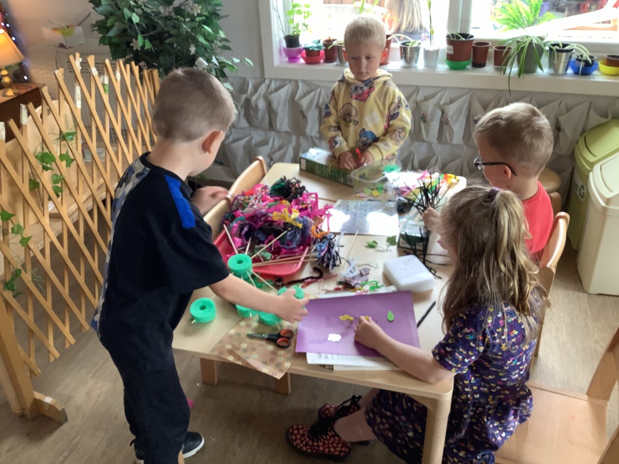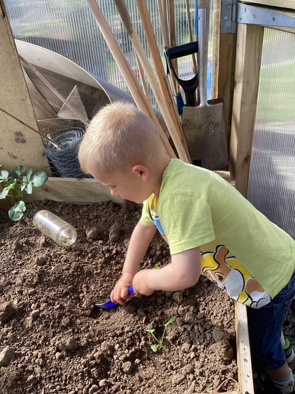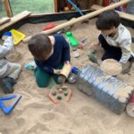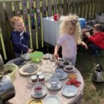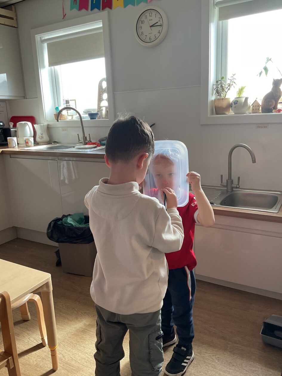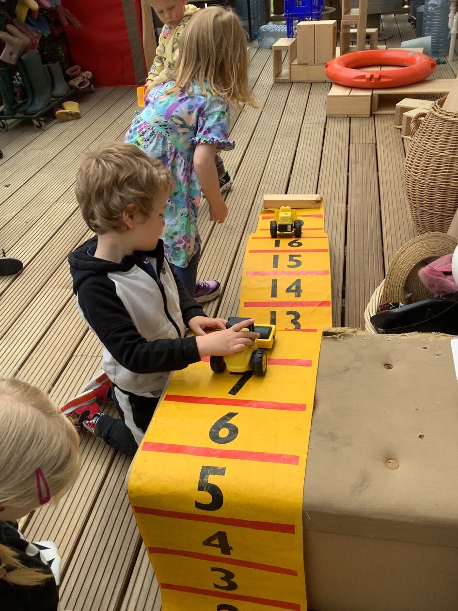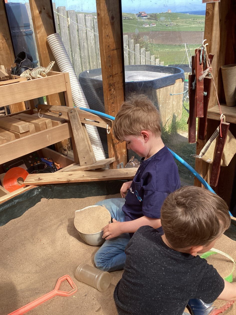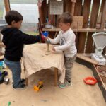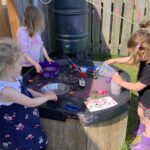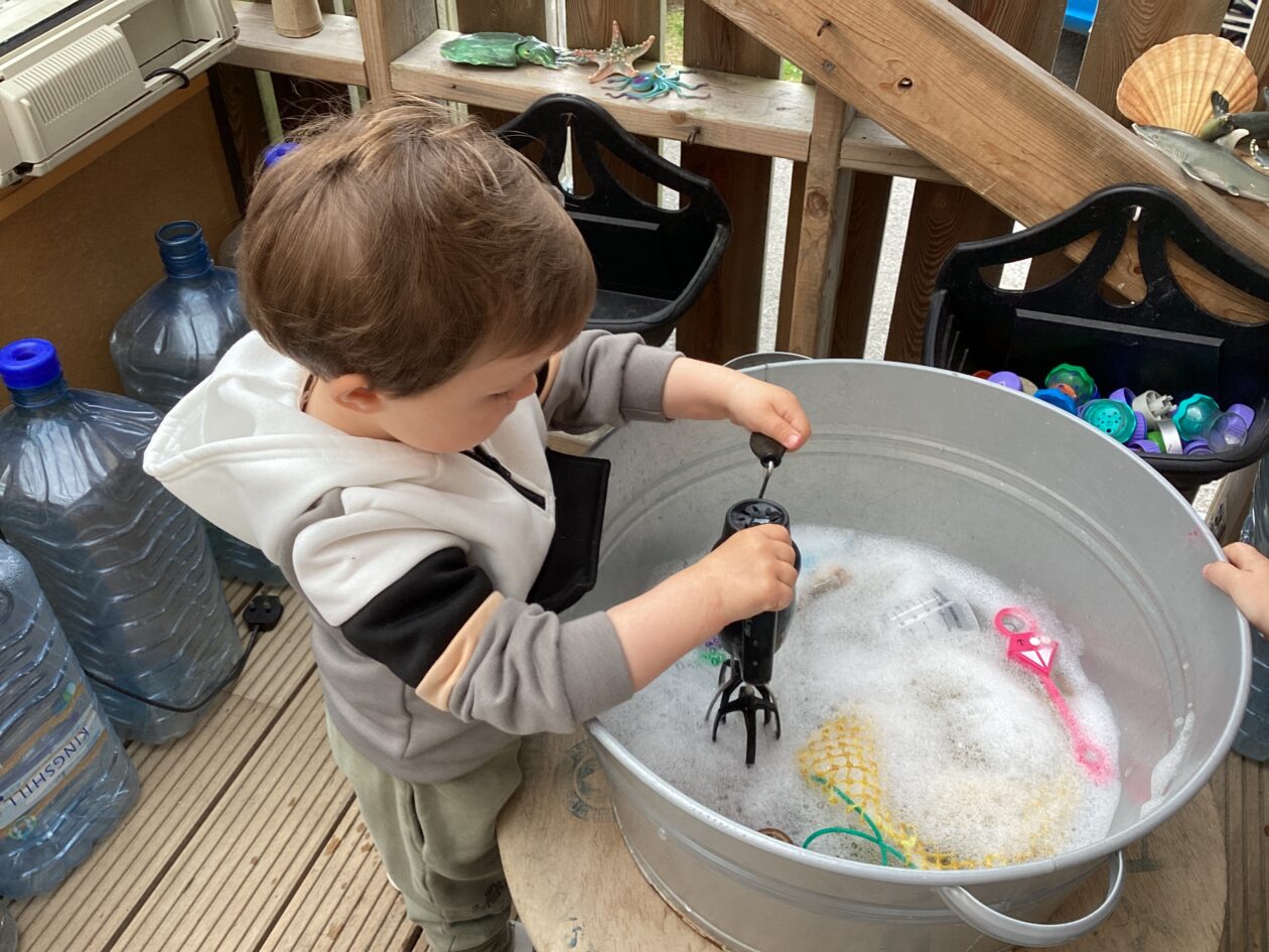 The bairns have been experimenting with different ways to slide down the steep hill in the garden. They have used cardboard, cushions, carpet tiles and slithery breeks! We have also seen lots of engagement with water play and managed to get the solar fountain working as the sun made a bit of a reappearance. We headed to the playpark one afternoon too and the bairns played chasing games, spun on the swings, tried to walk up the slide and got wobbly as jelly on a plate.