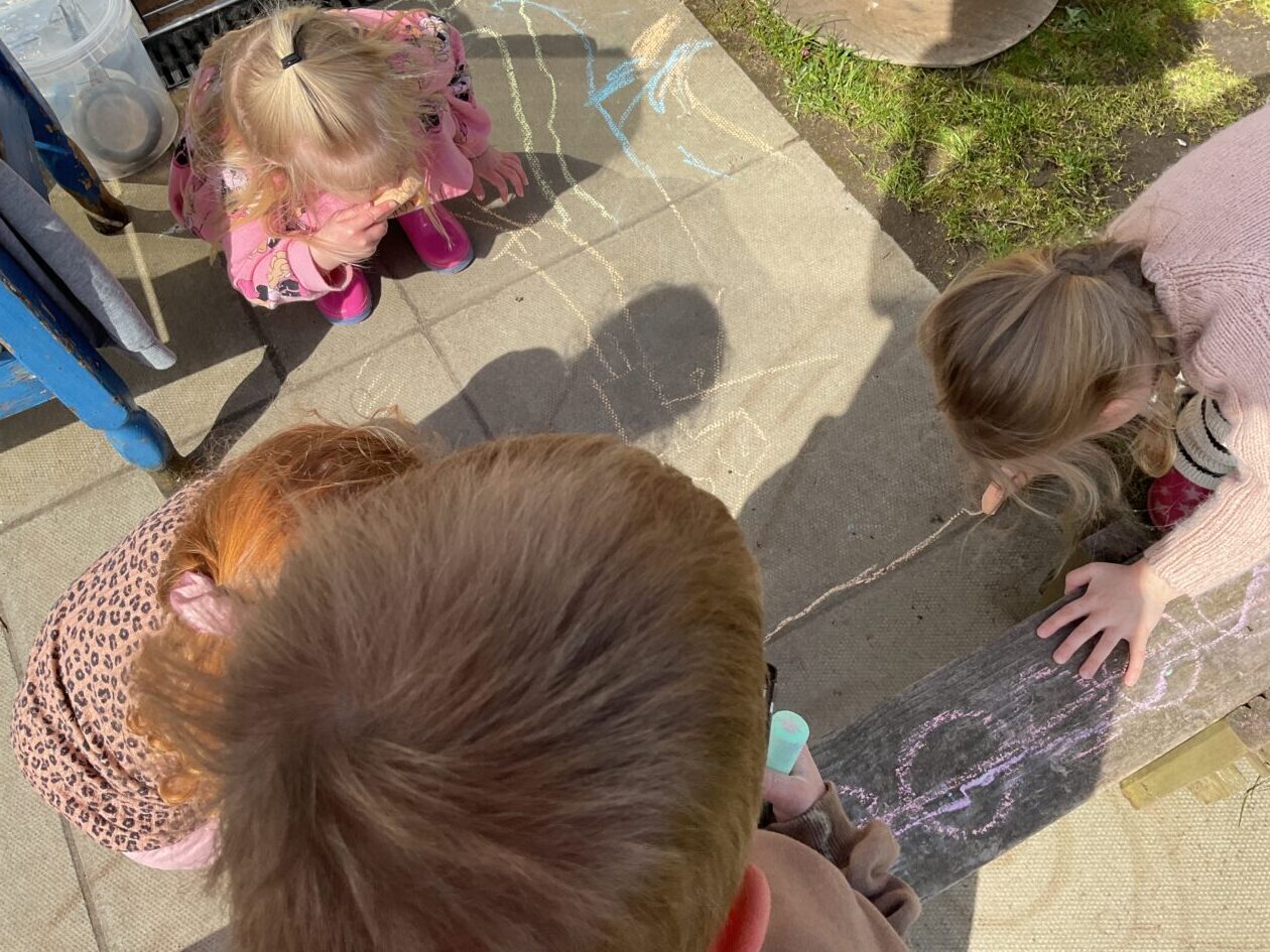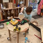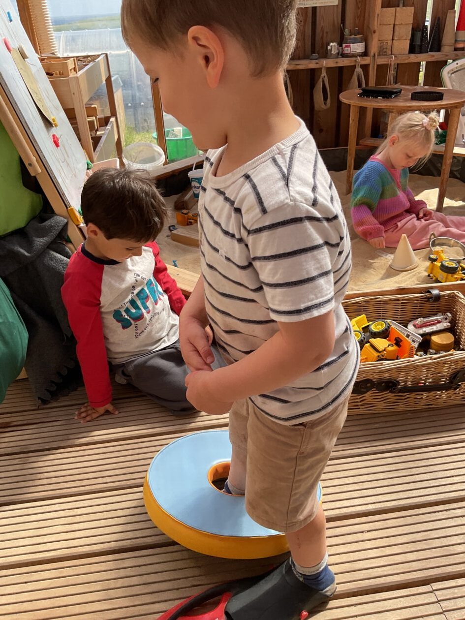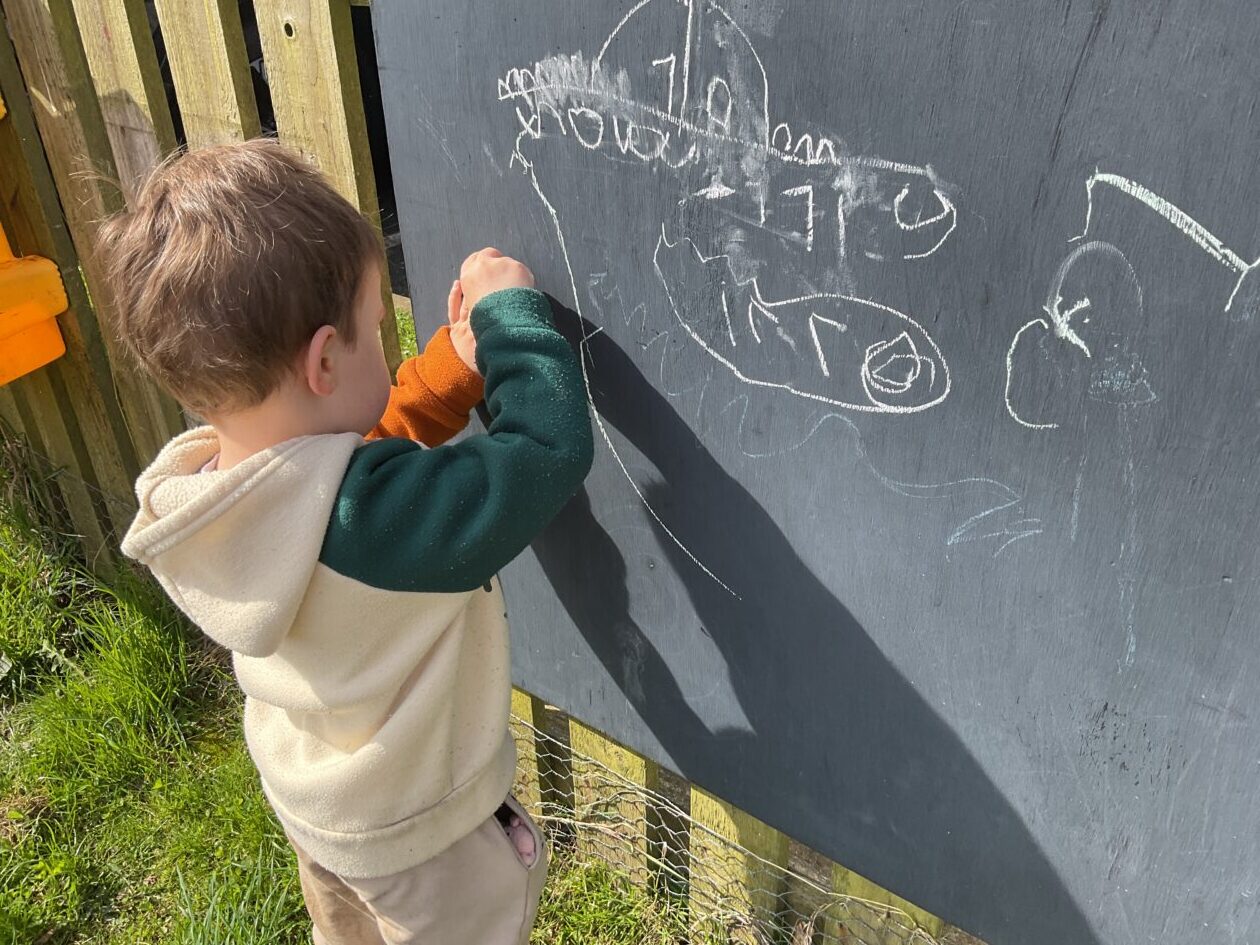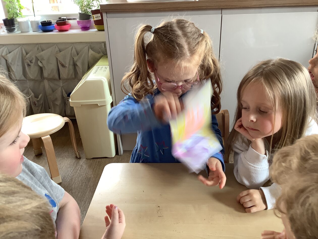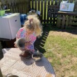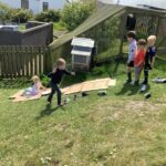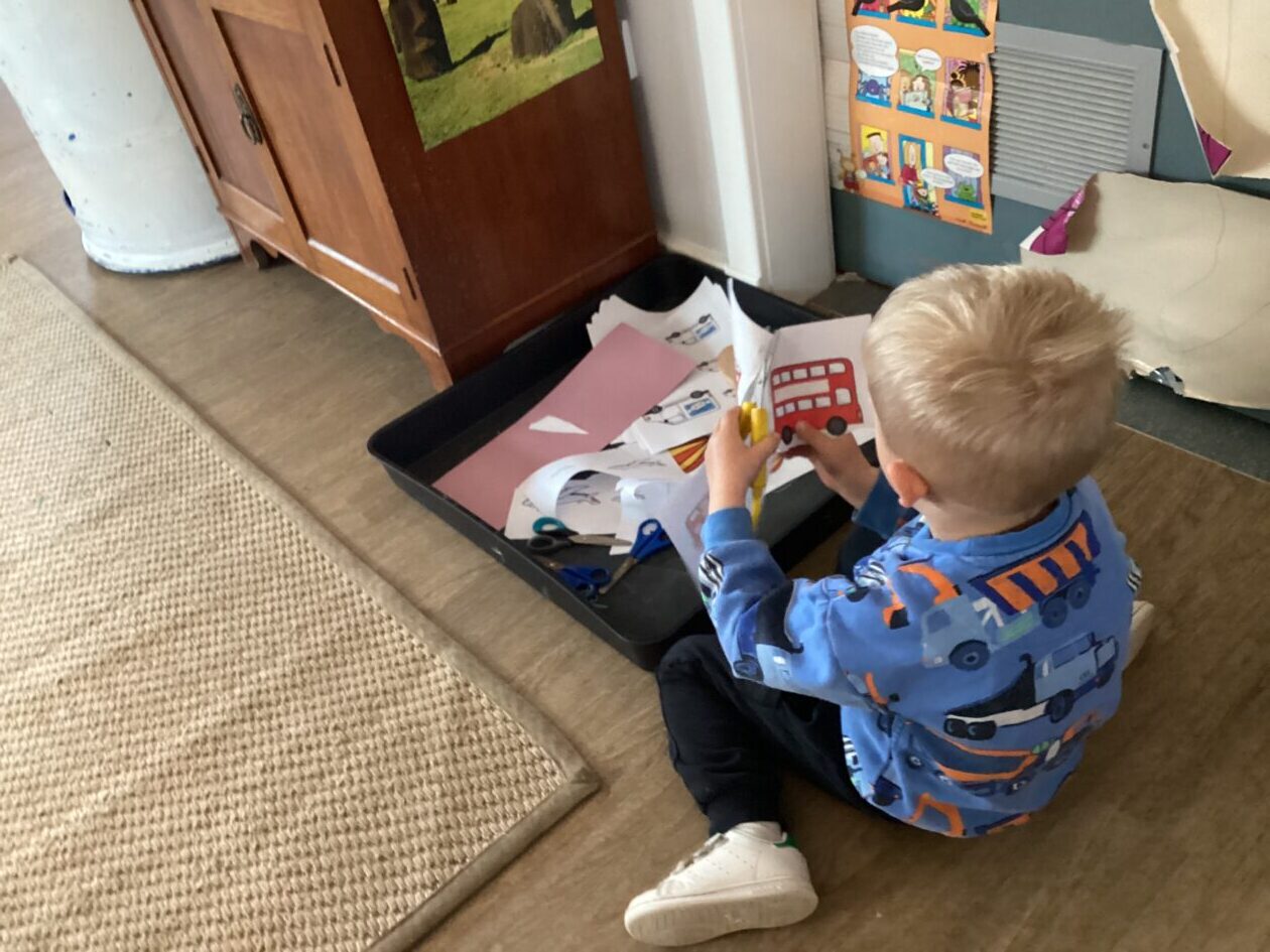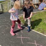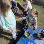 The bairns have been experimenting with different ways to slide down the steep hill in the garden. They have used cardboard, cushions, carpet tiles and slithery breeks! We have also seen lots of engagement with water play and managed to get the solar fountain working as the sun made a bit of a reappearance. We headed to the playpark one afternoon too and the bairns played chasing games, spun on the swings, tried to walk up the slide and got wobbly as jelly on a plate.