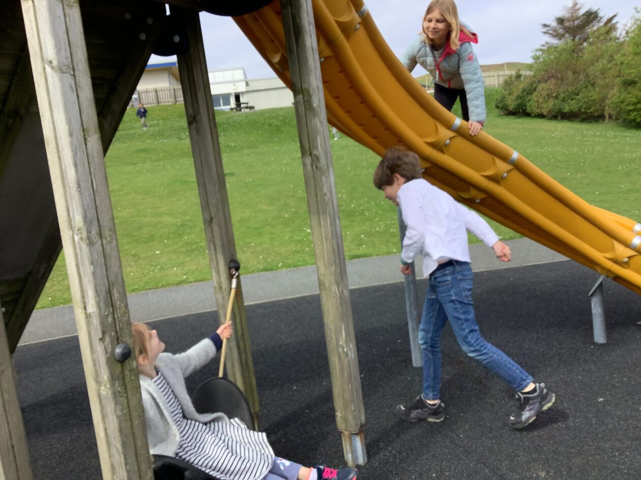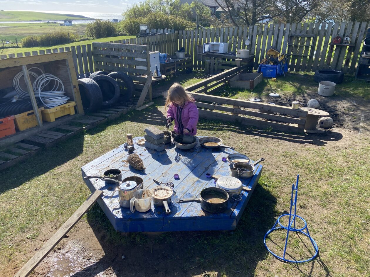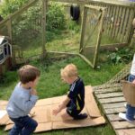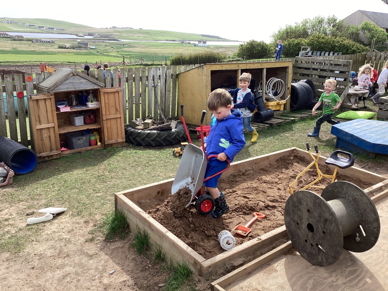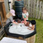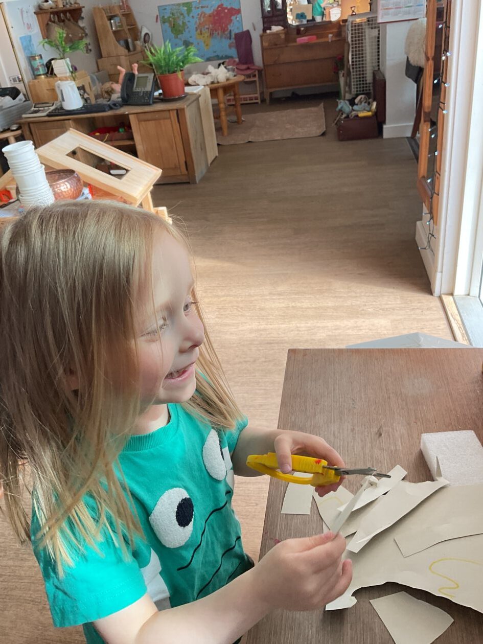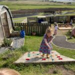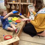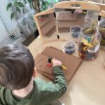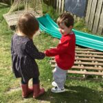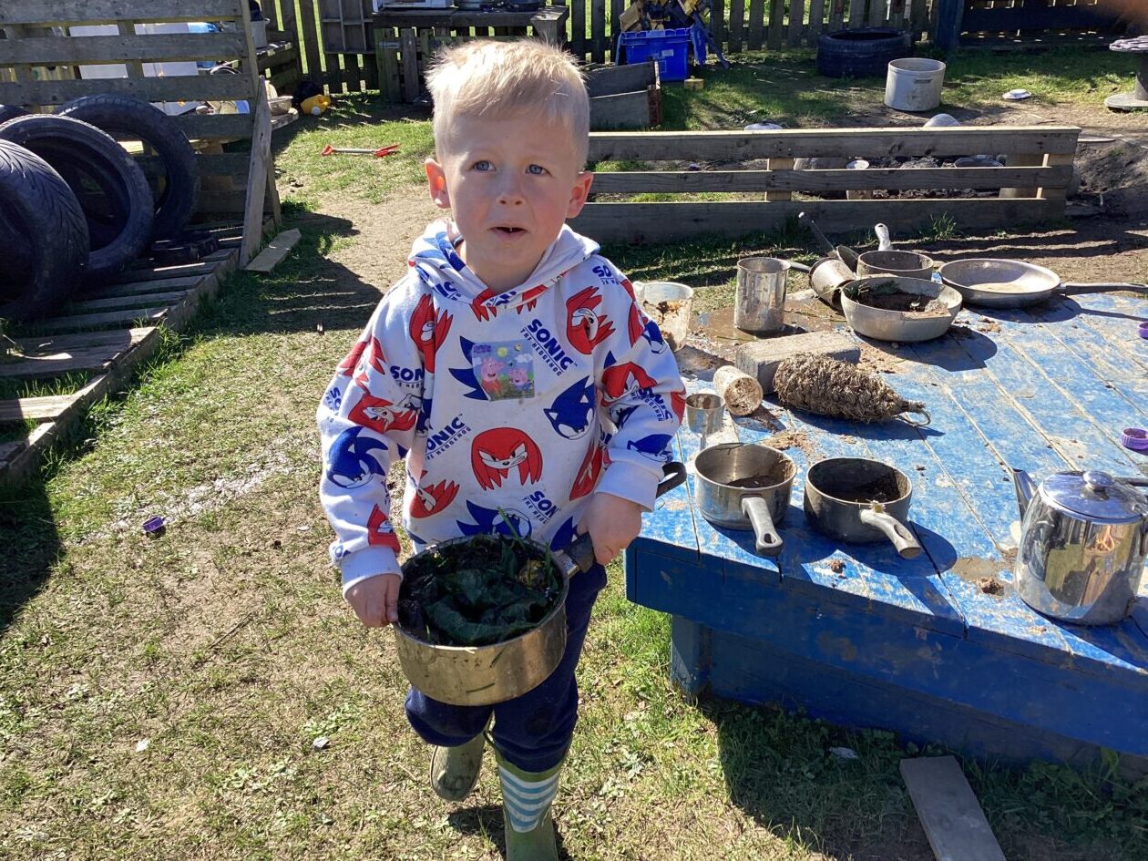 The bairns have been experimenting with different ways to slide down the steep hill in the garden. They have used cardboard, cushions, carpet tiles and slithery breeks! We have also seen lots of engagement with water play and managed to get the solar fountain working as the sun made a bit of a reappearance. We headed to the playpark one afternoon too and the bairns played chasing games, spun on the swings, tried to walk up the slide and got wobbly as jelly on a plate.