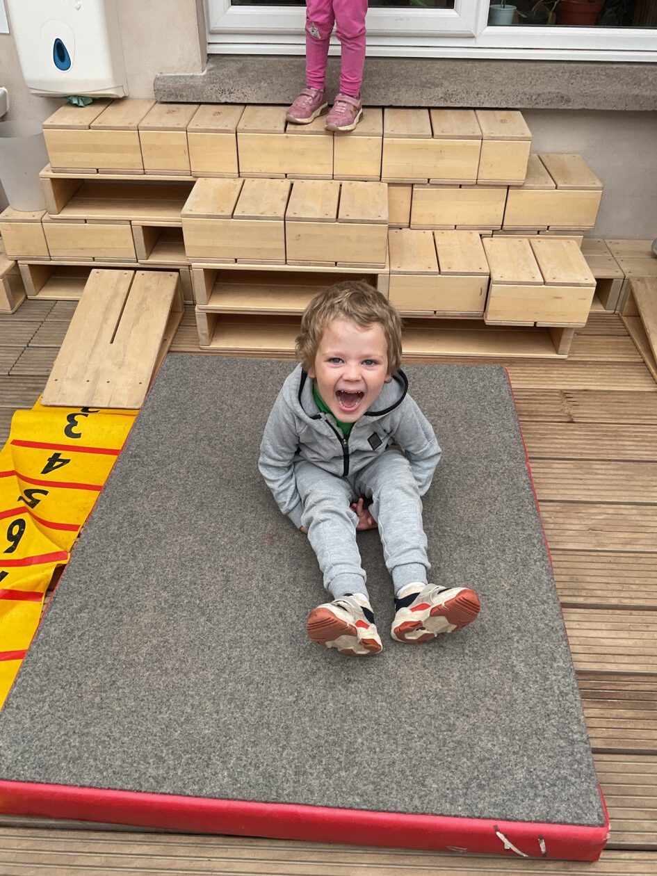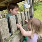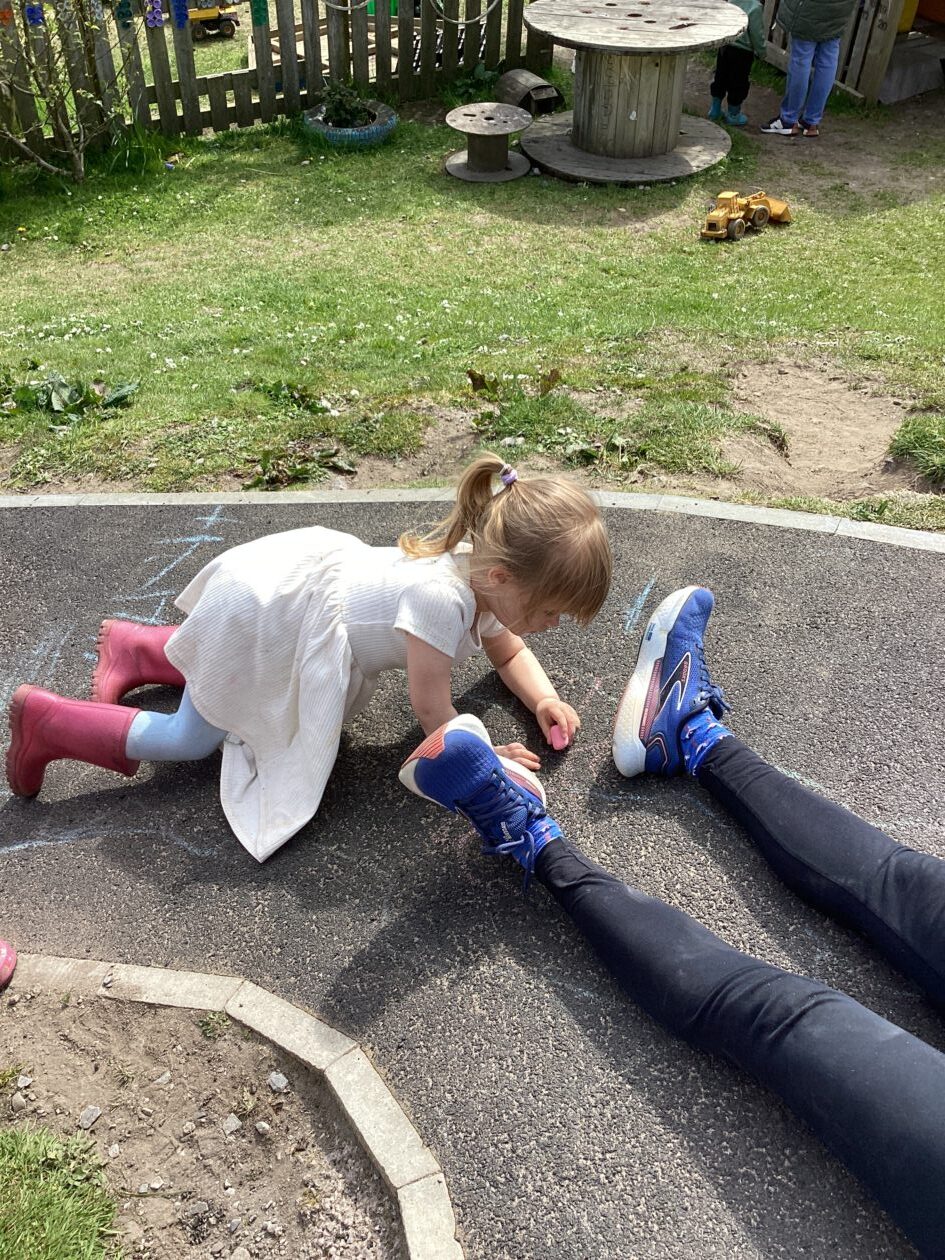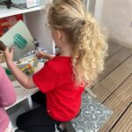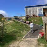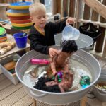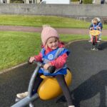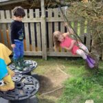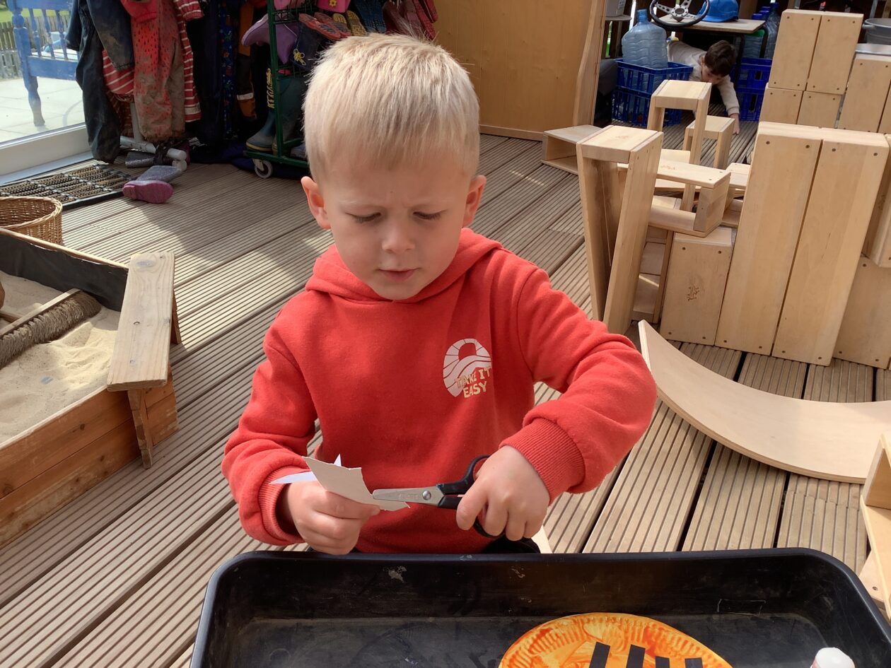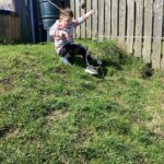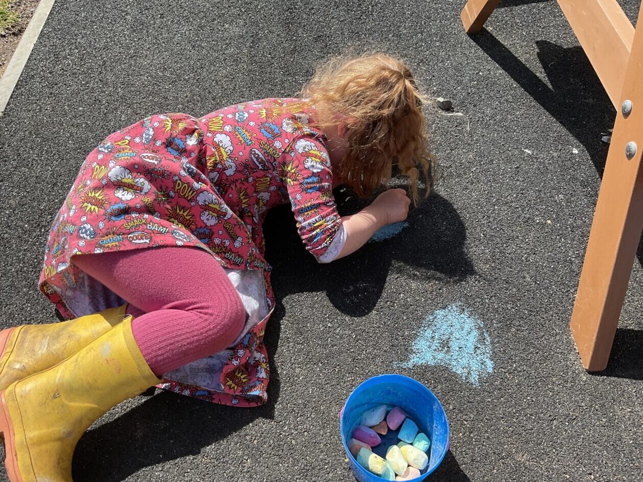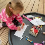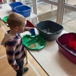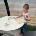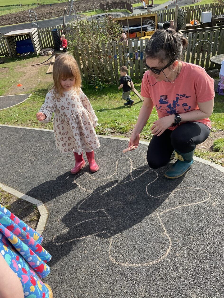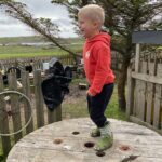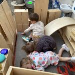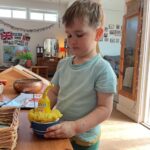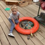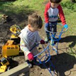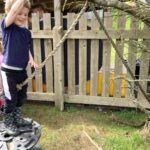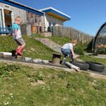 The bairns have been experimenting with different ways to slide down the steep hill in the garden. They have used cardboard, cushions, carpet tiles and slithery breeks! We have also seen lots of engagement with water play and managed to get the solar fountain working as the sun made a bit of a reappearance. We headed to the playpark one afternoon too and the bairns played chasing games, spun on the swings, tried to walk up the slide and got wobbly as jelly on a plate.