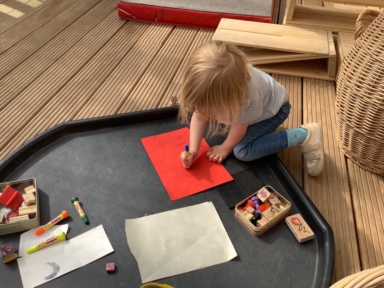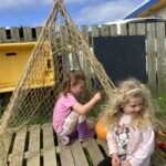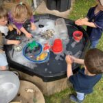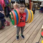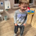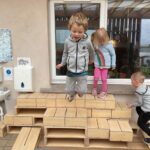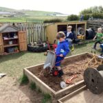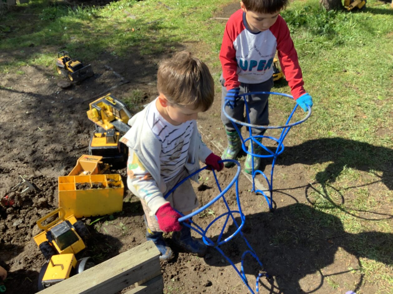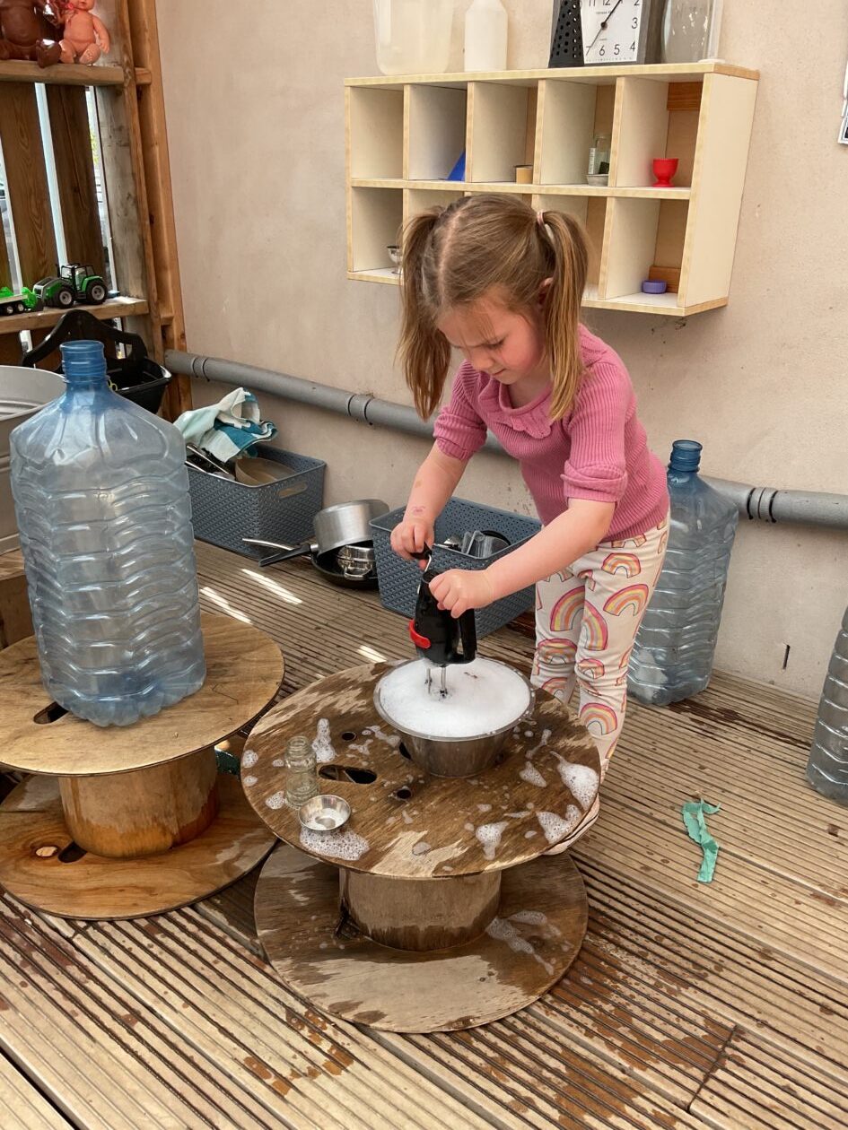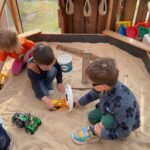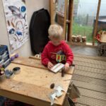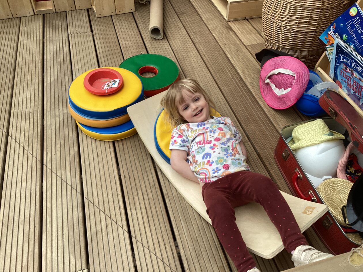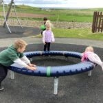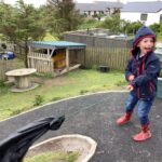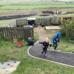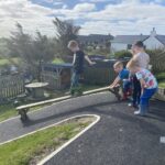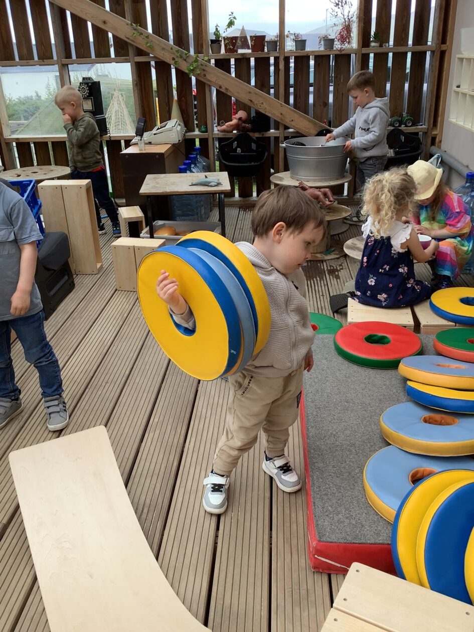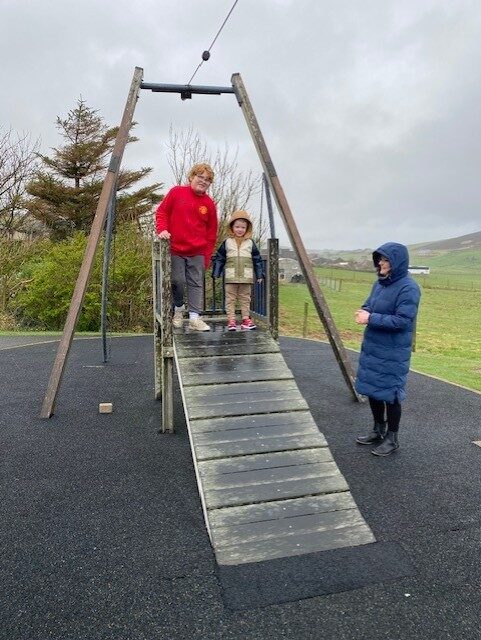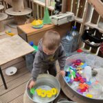 The bairns have been experimenting with different ways to slide down the steep hill in the garden. They have used cardboard, cushions, carpet tiles and slithery breeks! We have also seen lots of engagement with water play and managed to get the solar fountain working as the sun made a bit of a reappearance. We headed to the playpark one afternoon too and the bairns played chasing games, spun on the swings, tried to walk up the slide and got wobbly as jelly on a plate.