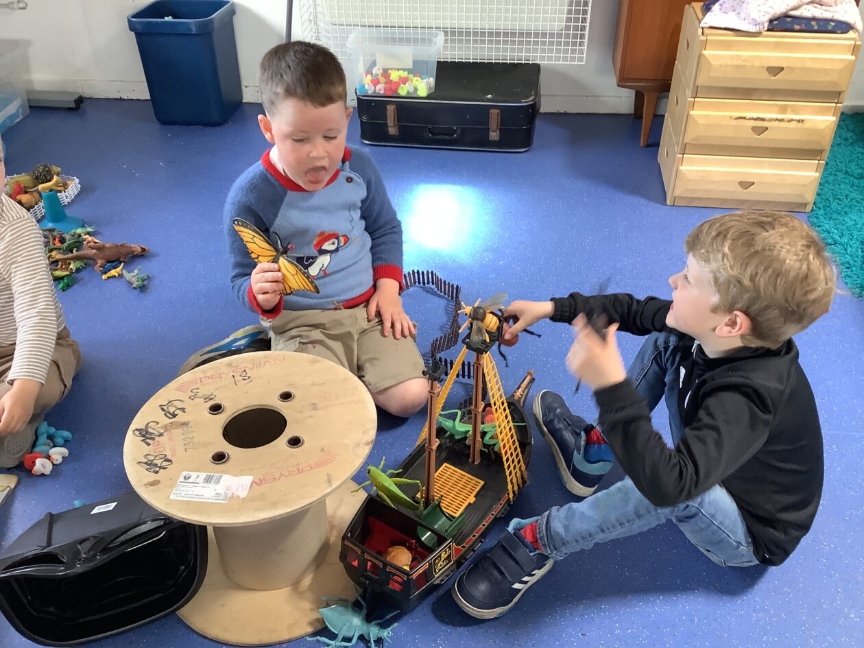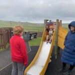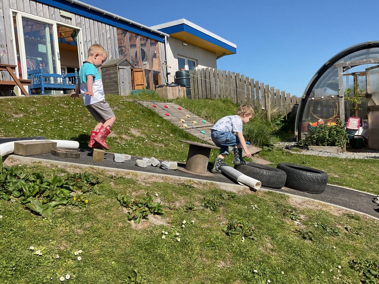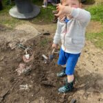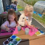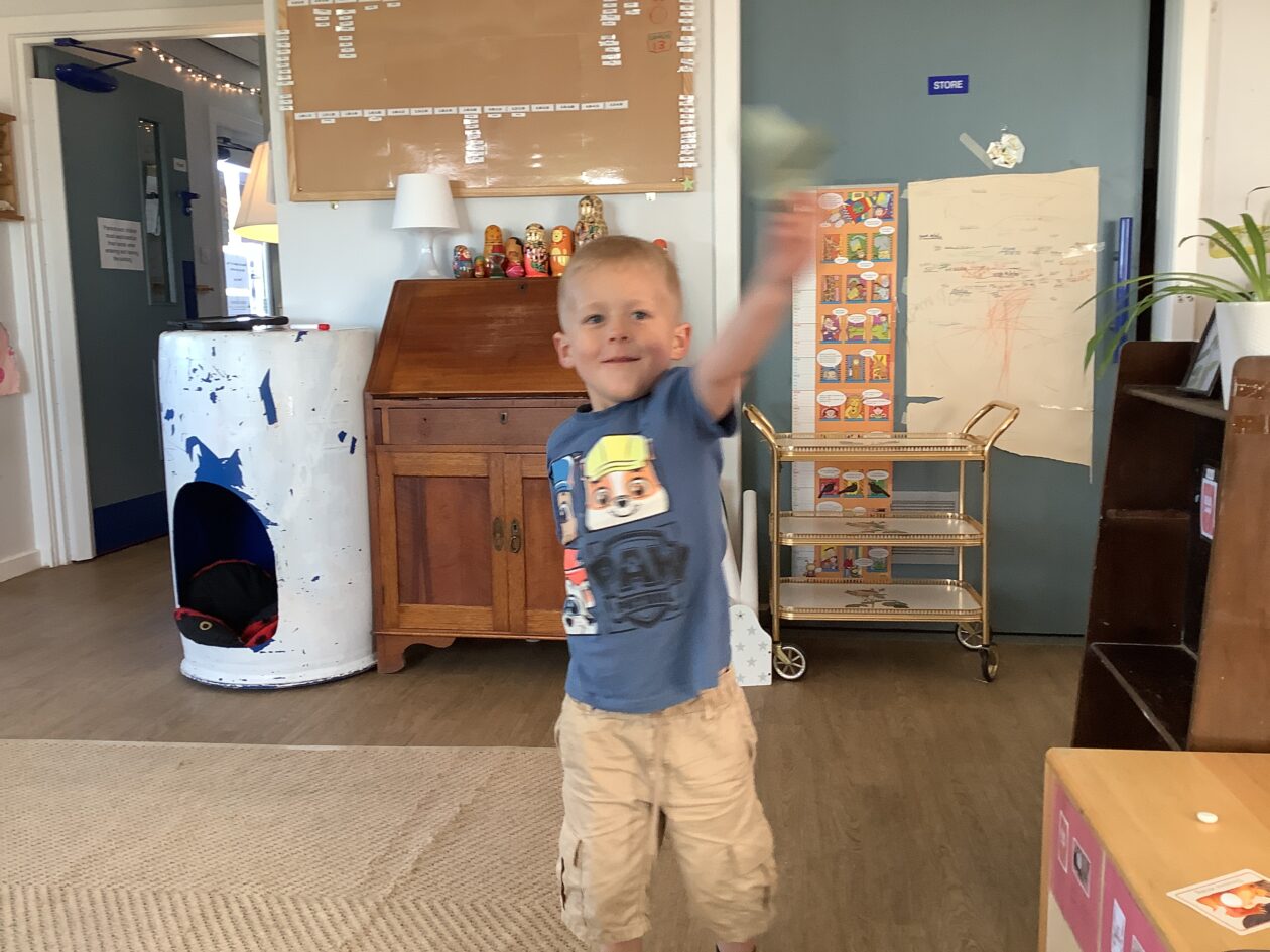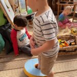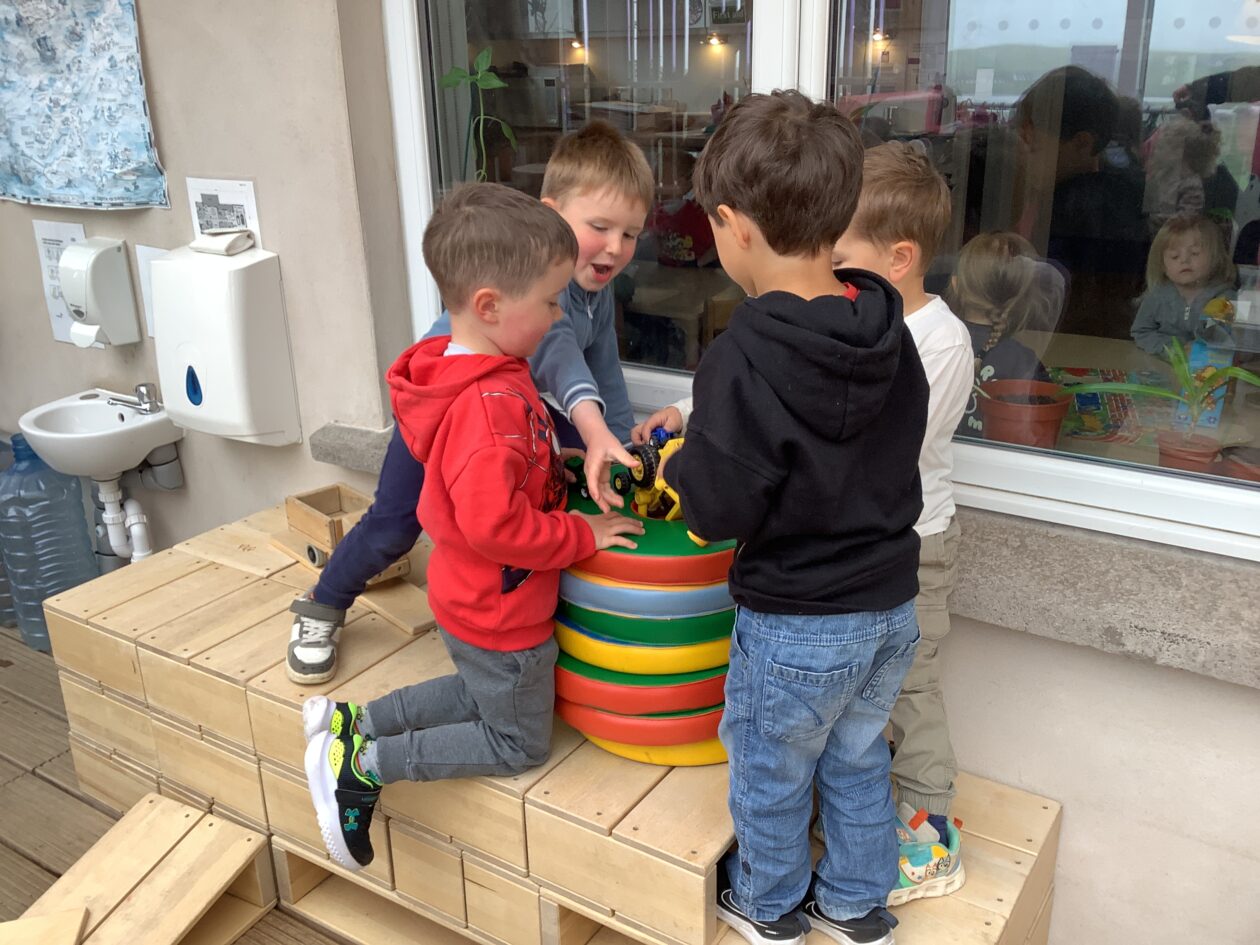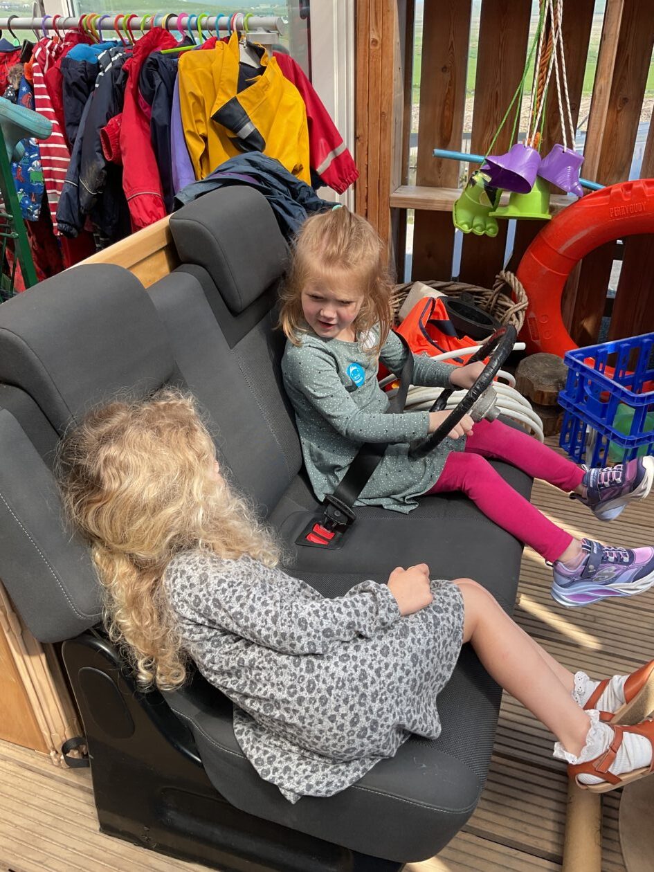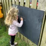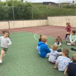 The bairns have been experimenting with different ways to slide down the steep hill in the garden. They have used cardboard, cushions, carpet tiles and slithery breeks! We have also seen lots of engagement with water play and managed to get the solar fountain working as the sun made a bit of a reappearance. We headed to the playpark one afternoon too and the bairns played chasing games, spun on the swings, tried to walk up the slide and got wobbly as jelly on a plate.