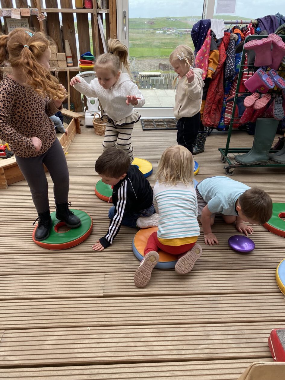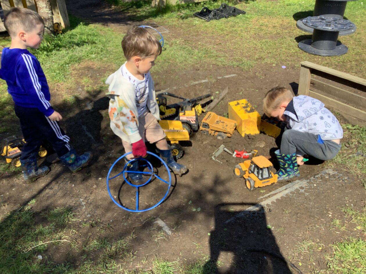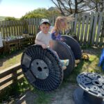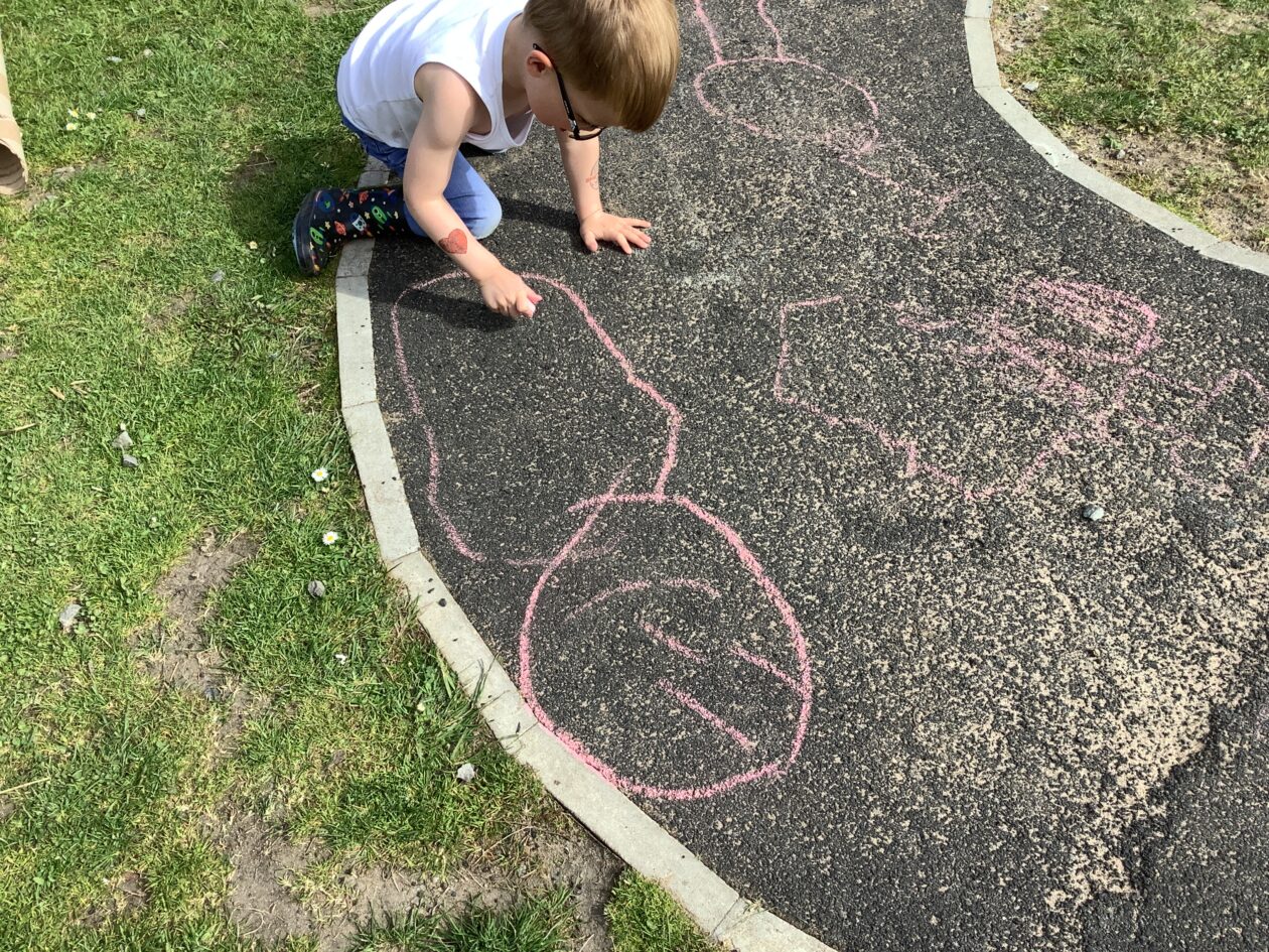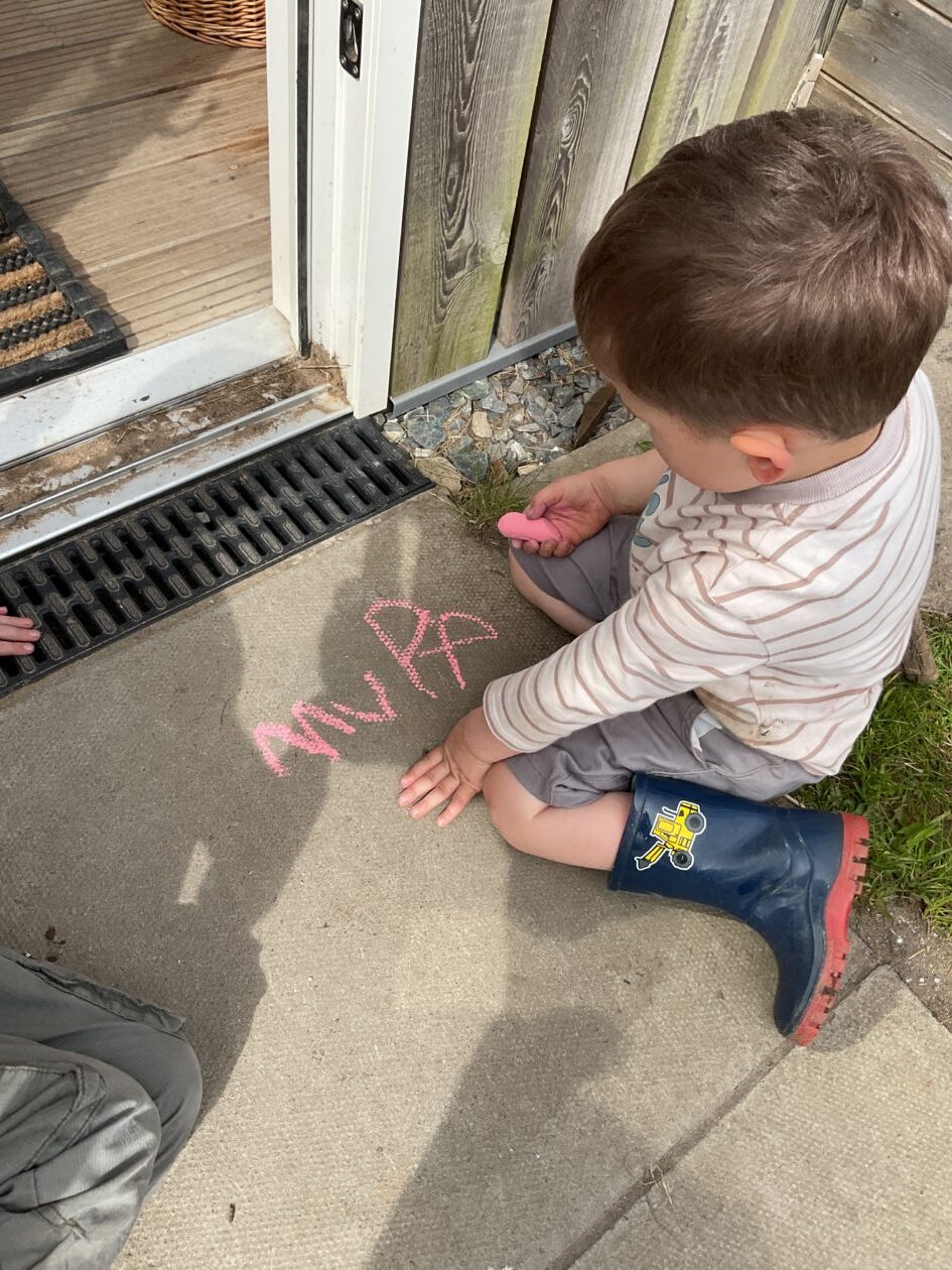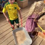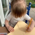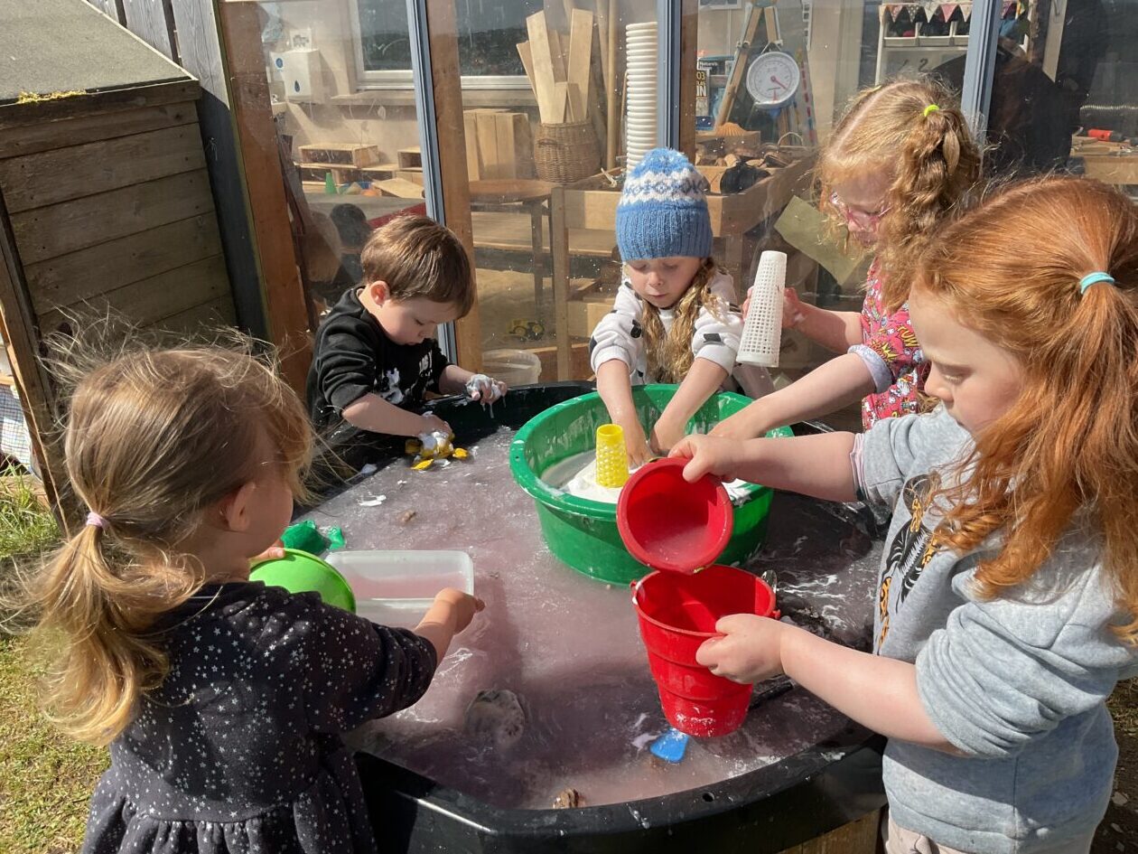 The bairns have been experimenting with different ways to slide down the steep hill in the garden. They have used cardboard, cushions, carpet tiles and slithery breeks! We have also seen lots of engagement with water play and managed to get the solar fountain working as the sun made a bit of a reappearance. We headed to the playpark one afternoon too and the bairns played chasing games, spun on the swings, tried to walk up the slide and got wobbly as jelly on a plate.