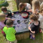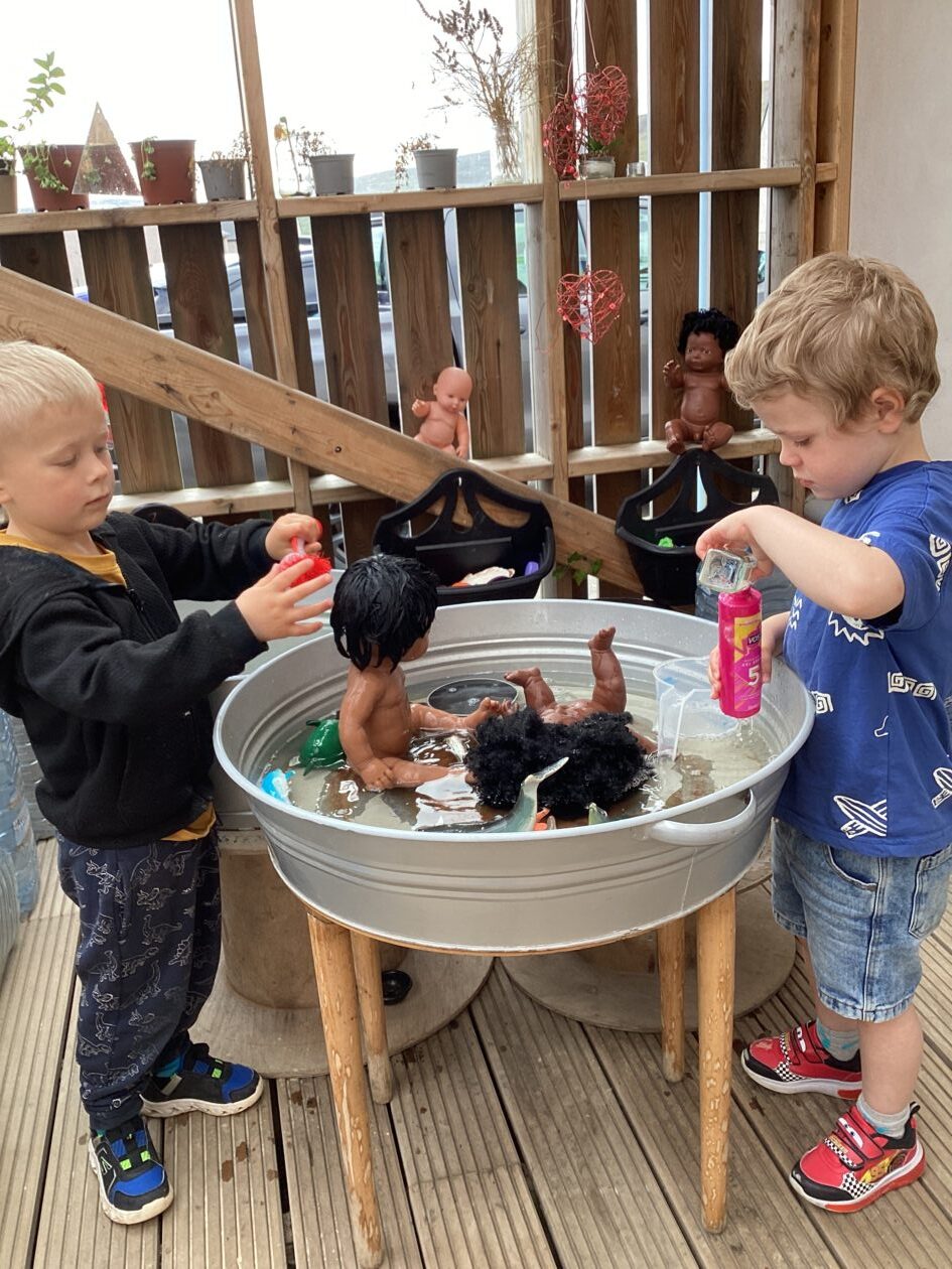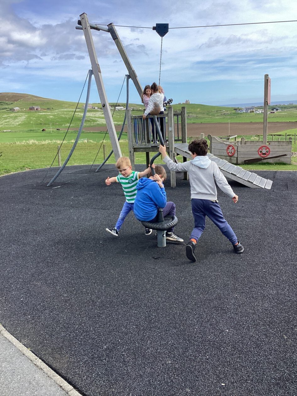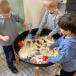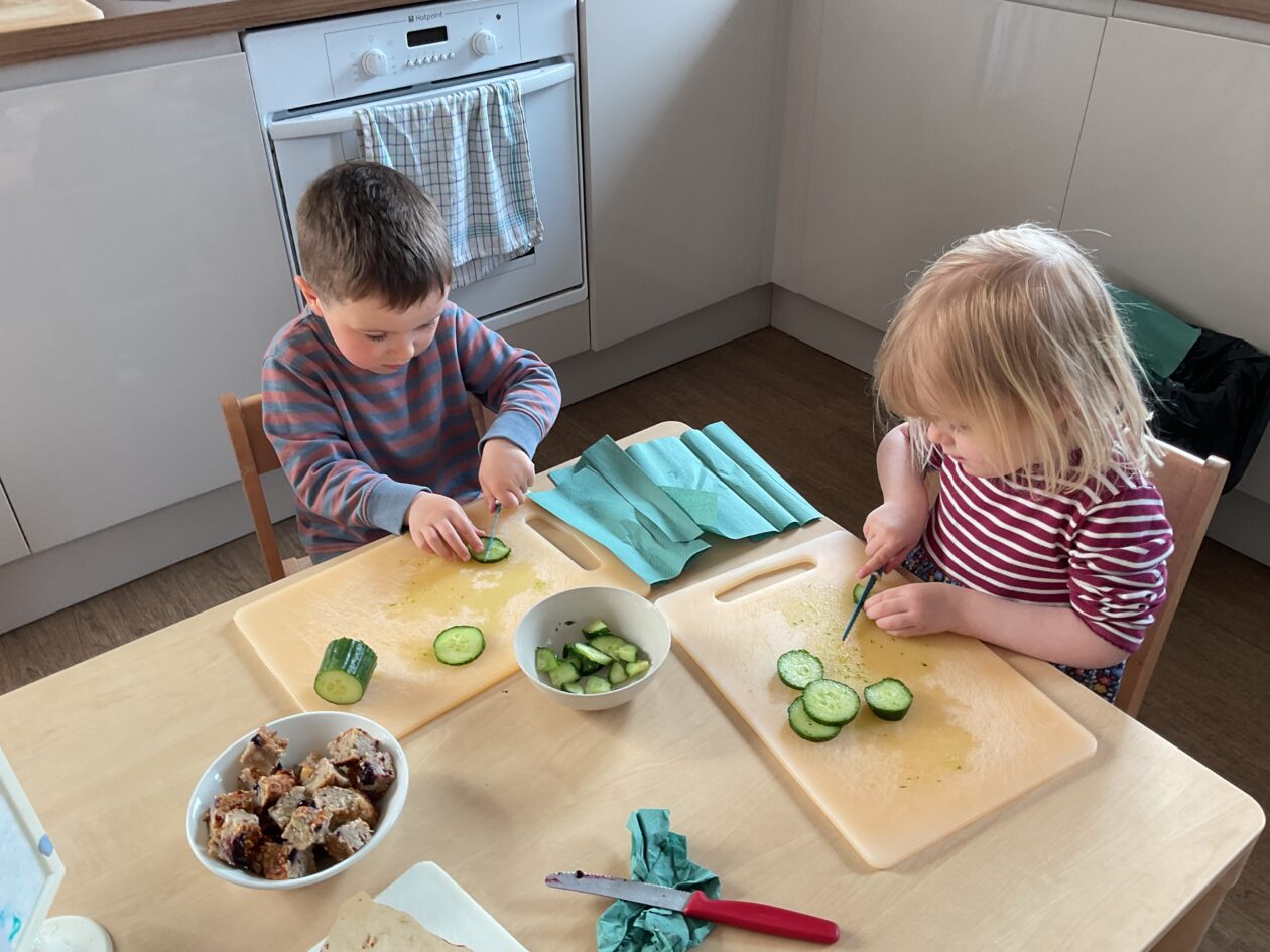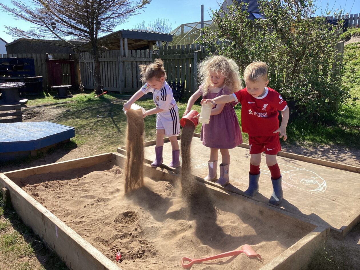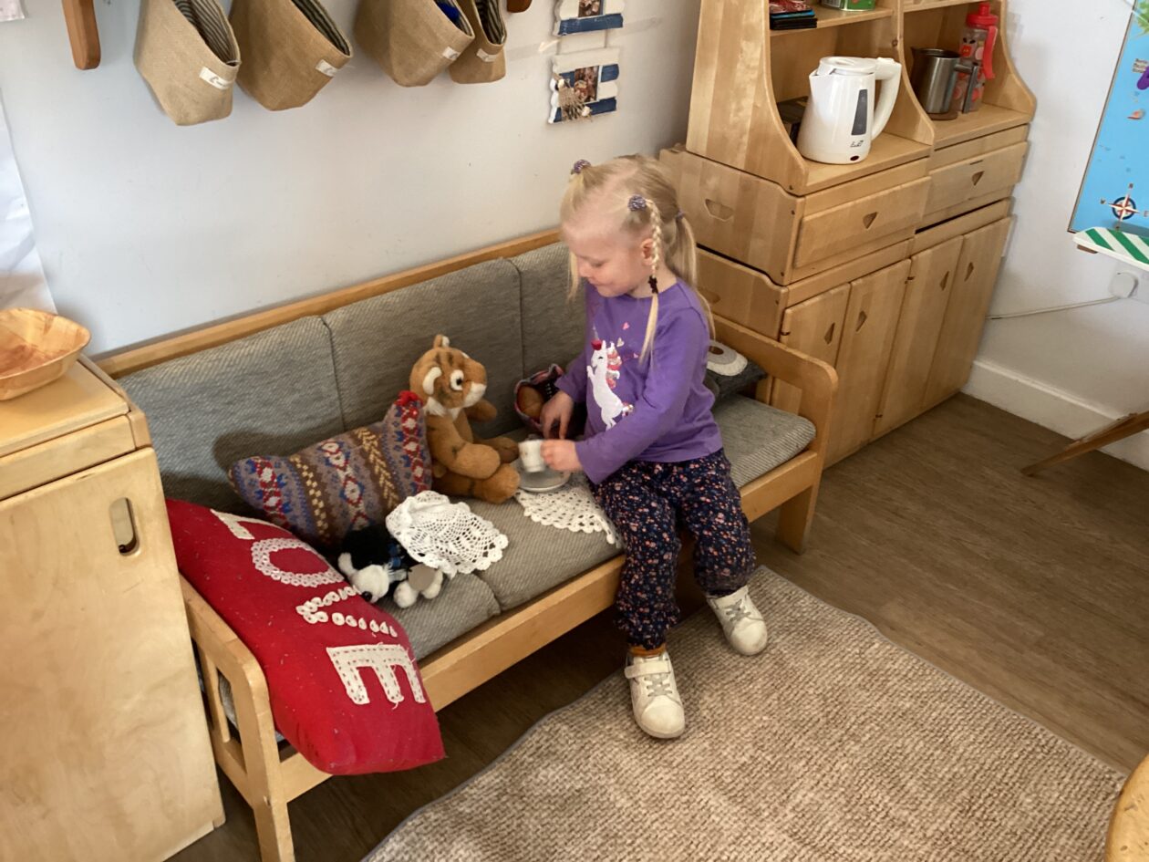 The bairns have been experimenting with different ways to slide down the steep hill in the garden. They have used cardboard, cushions, carpet tiles and slithery breeks! We have also seen lots of engagement with water play and managed to get the solar fountain working as the sun made a bit of a reappearance. We headed to the playpark one afternoon too and the bairns played chasing games, spun on the swings, tried to walk up the slide and got wobbly as jelly on a plate.