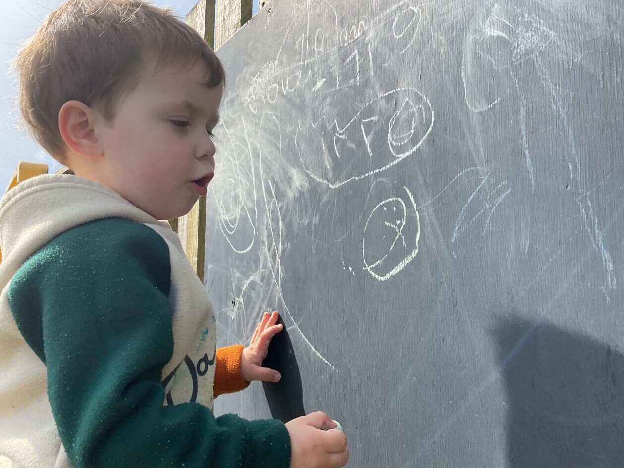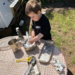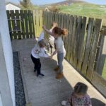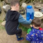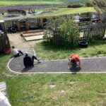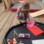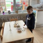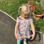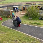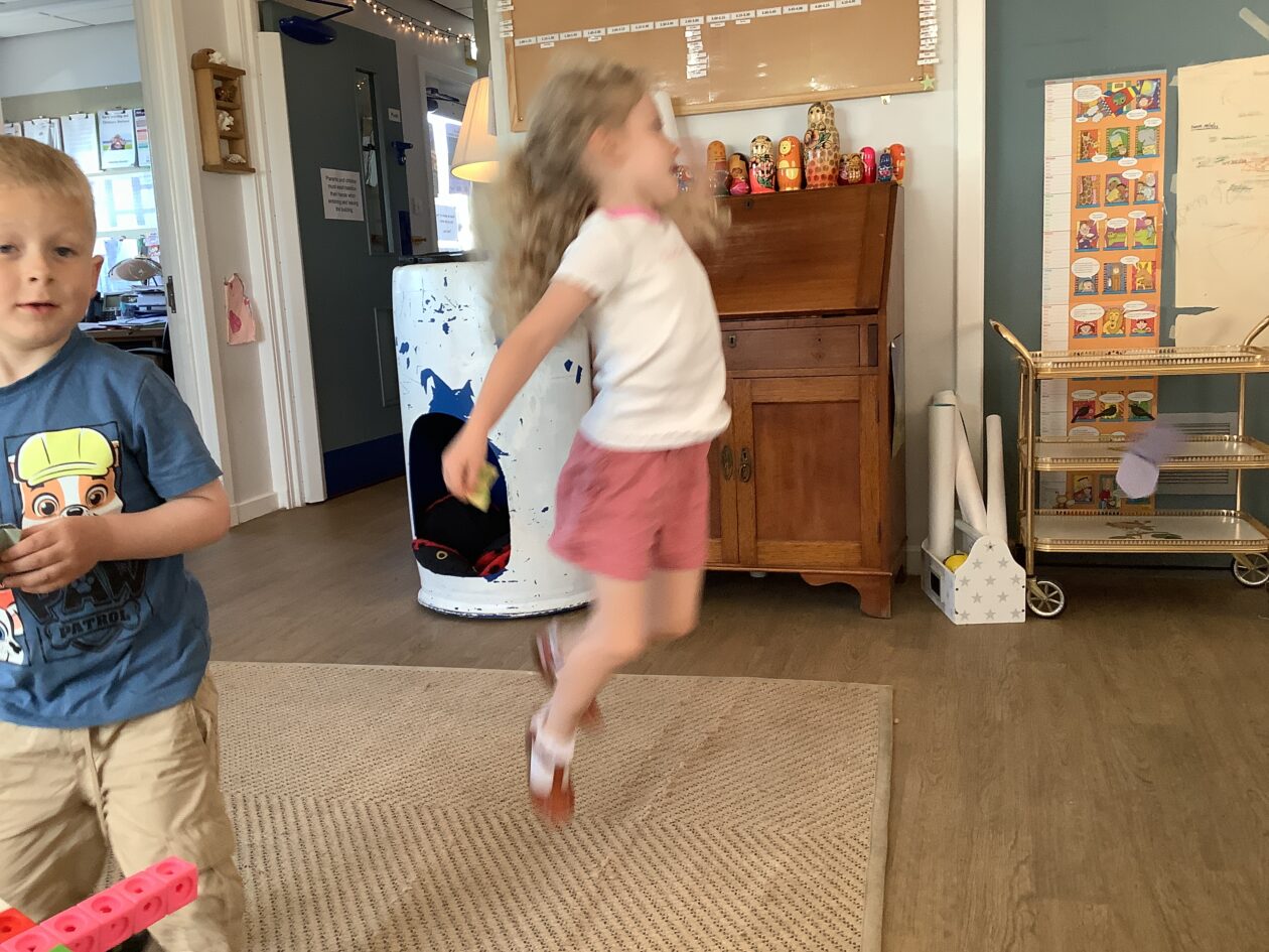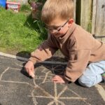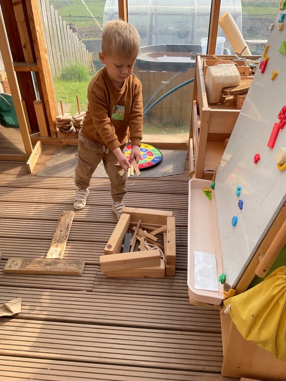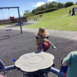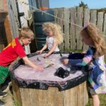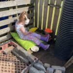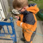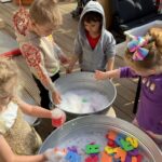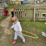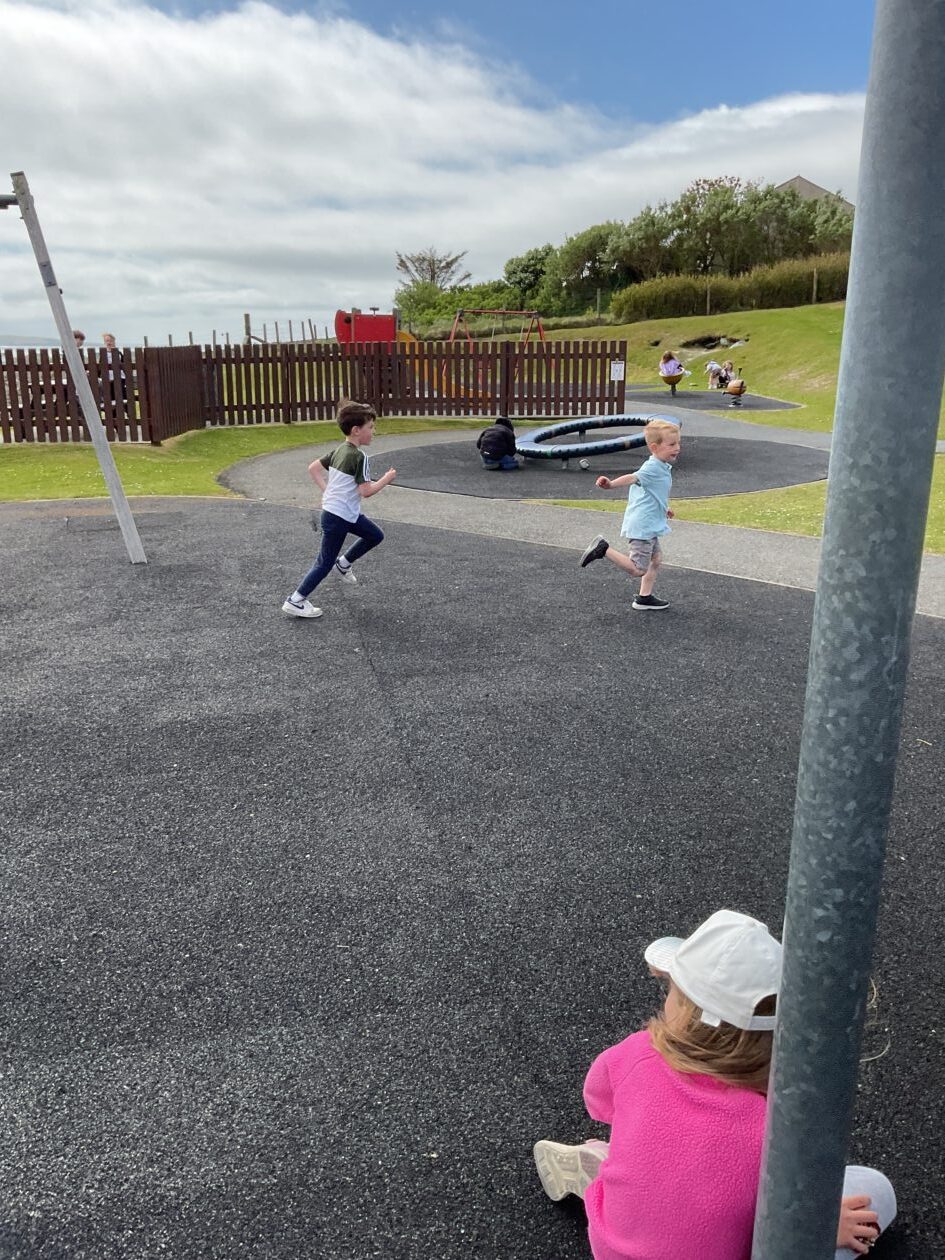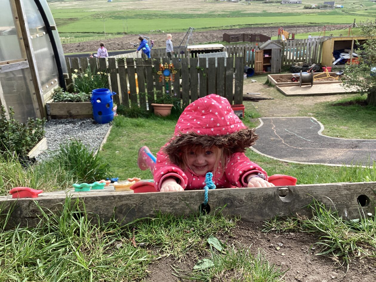 The bairns have been experimenting with different ways to slide down the steep hill in the garden. They have used cardboard, cushions, carpet tiles and slithery breeks! We have also seen lots of engagement with water play and managed to get the solar fountain working as the sun made a bit of a reappearance. We headed to the playpark one afternoon too and the bairns played chasing games, spun on the swings, tried to walk up the slide and got wobbly as jelly on a plate.