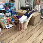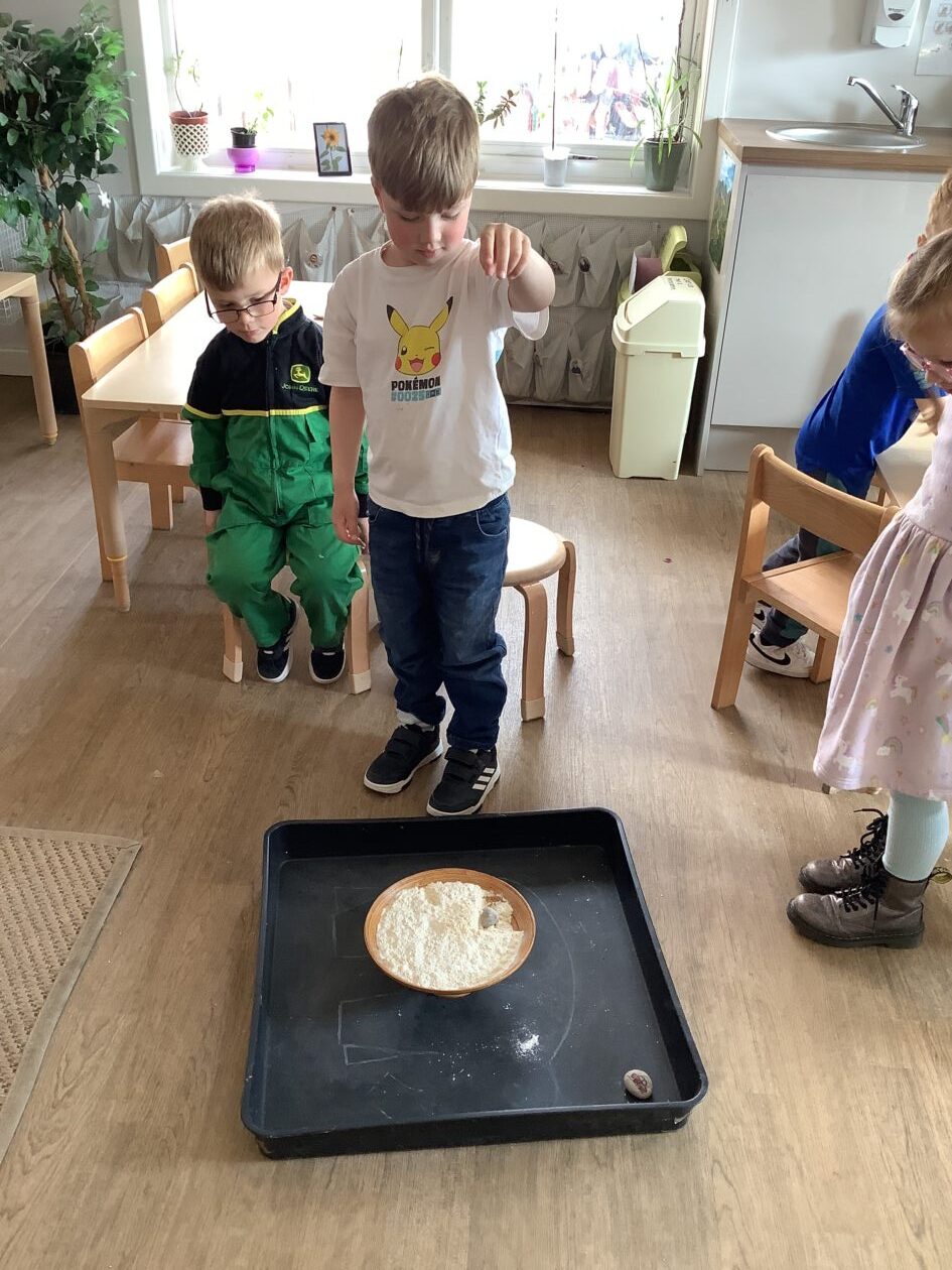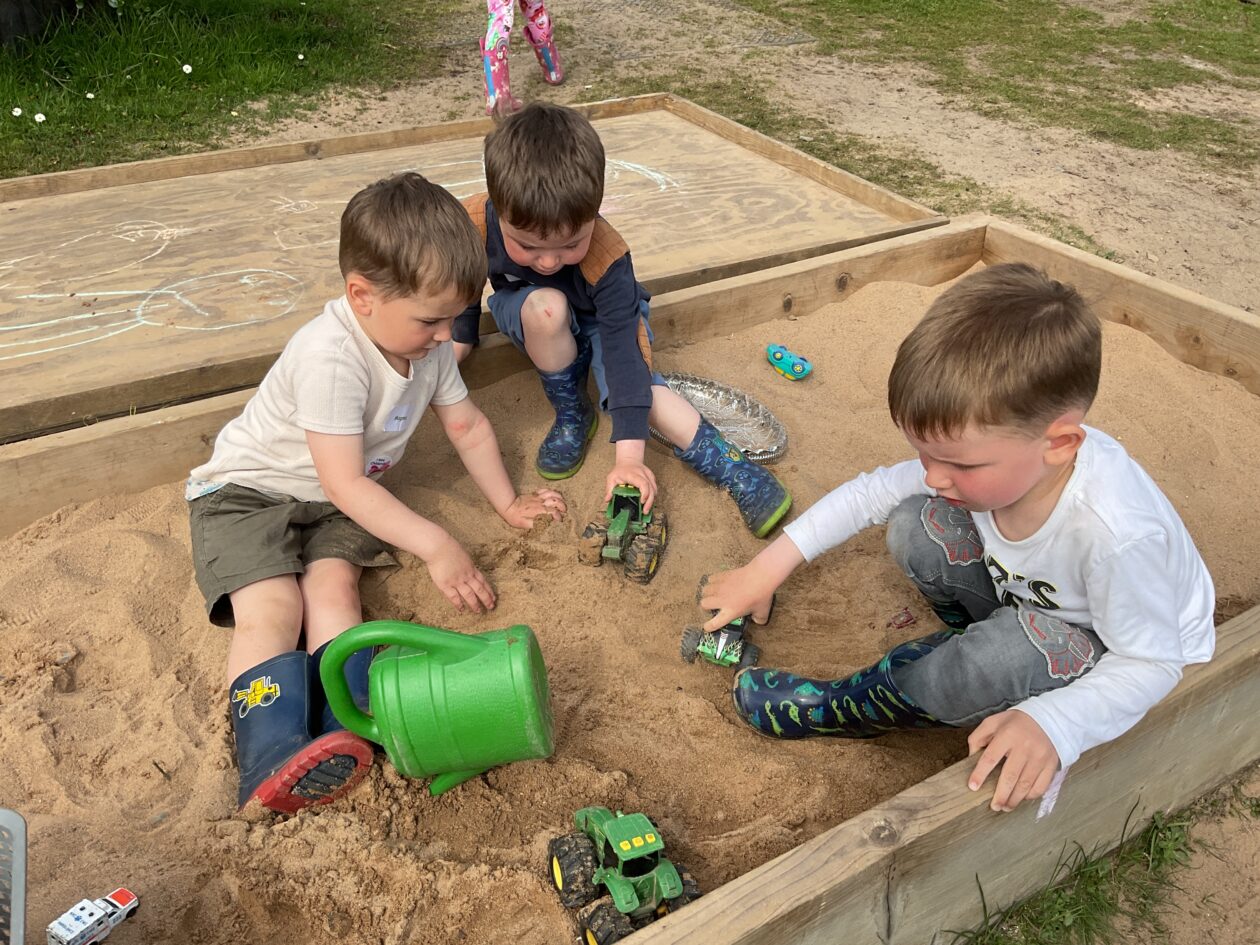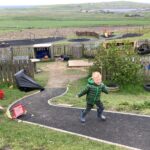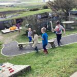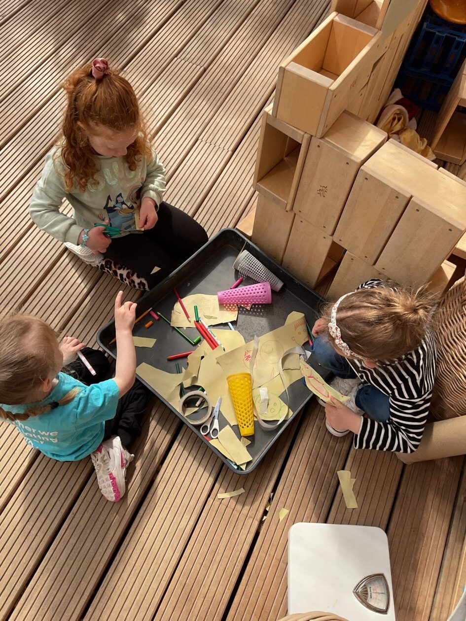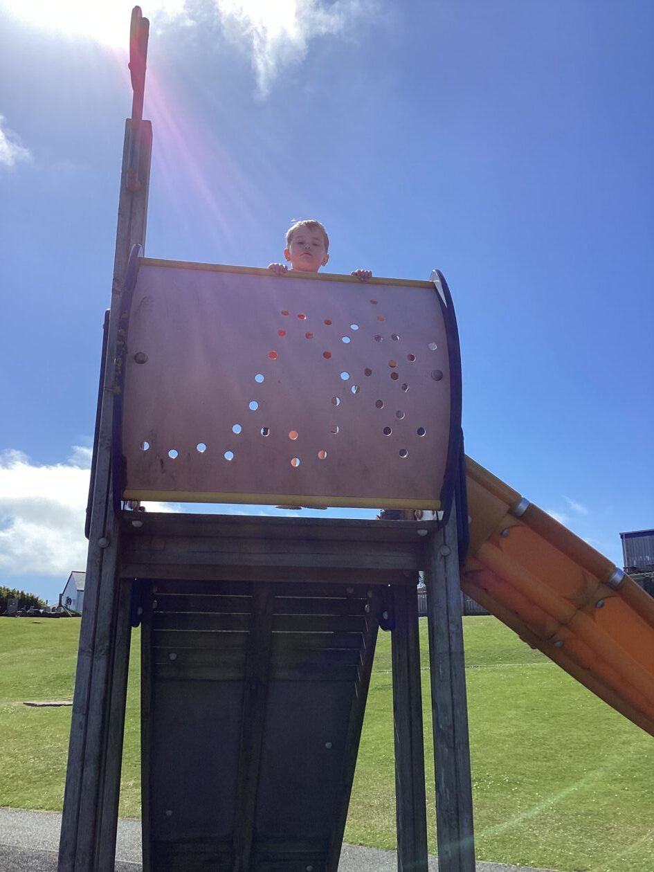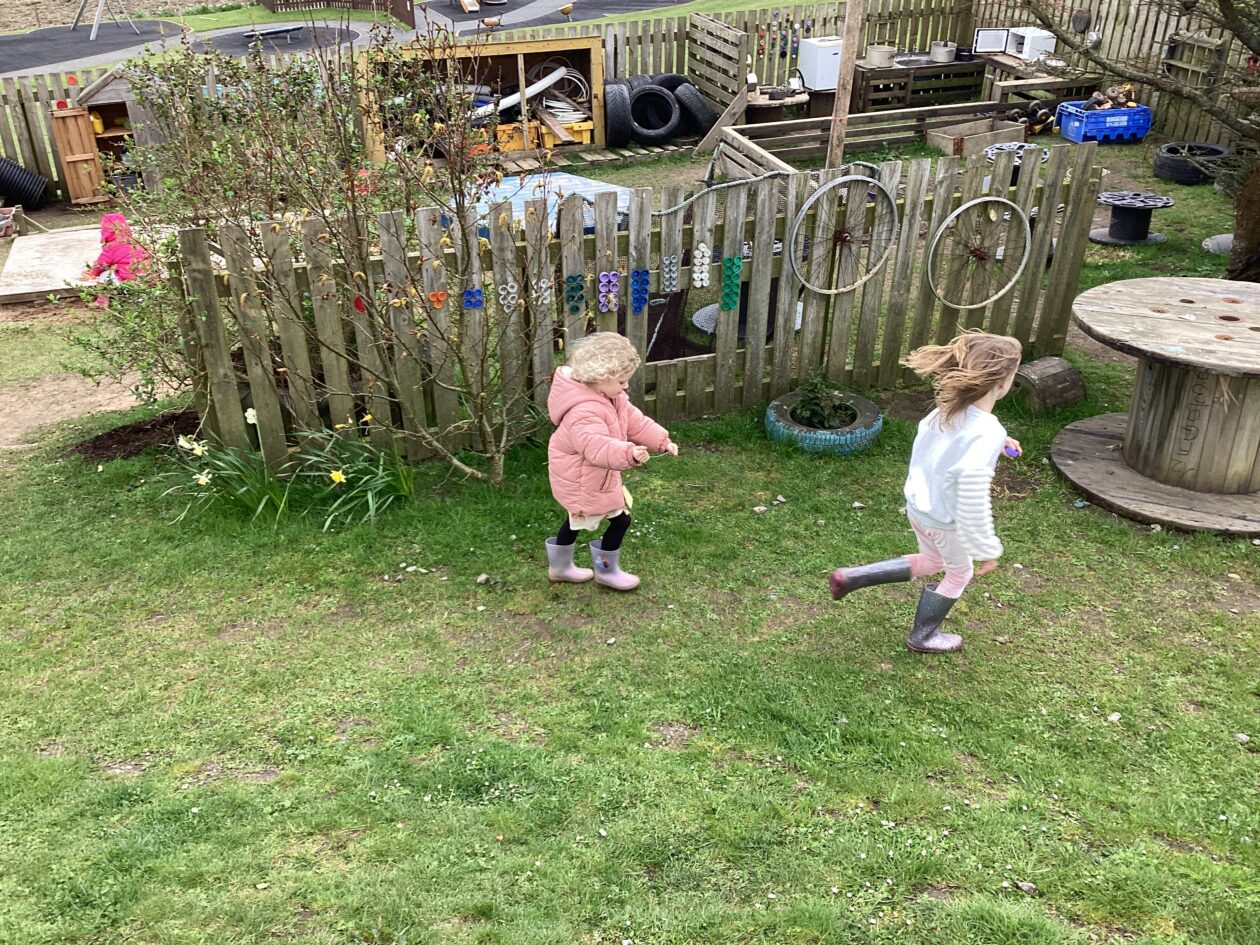 The bairns have been experimenting with different ways to slide down the steep hill in the garden. They have used cardboard, cushions, carpet tiles and slithery breeks! We have also seen lots of engagement with water play and managed to get the solar fountain working as the sun made a bit of a reappearance. We headed to the playpark one afternoon too and the bairns played chasing games, spun on the swings, tried to walk up the slide and got wobbly as jelly on a plate.