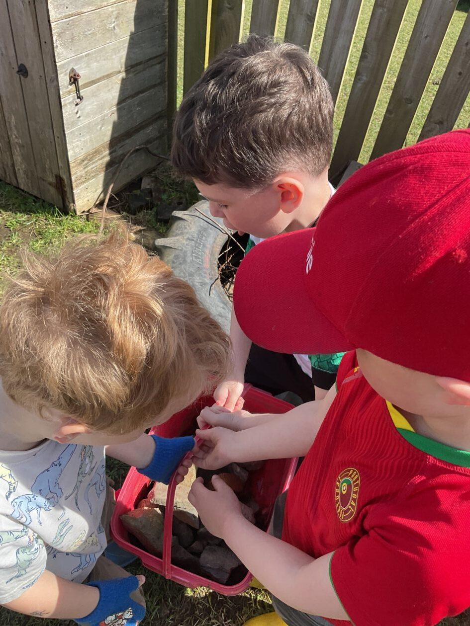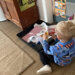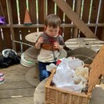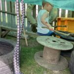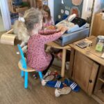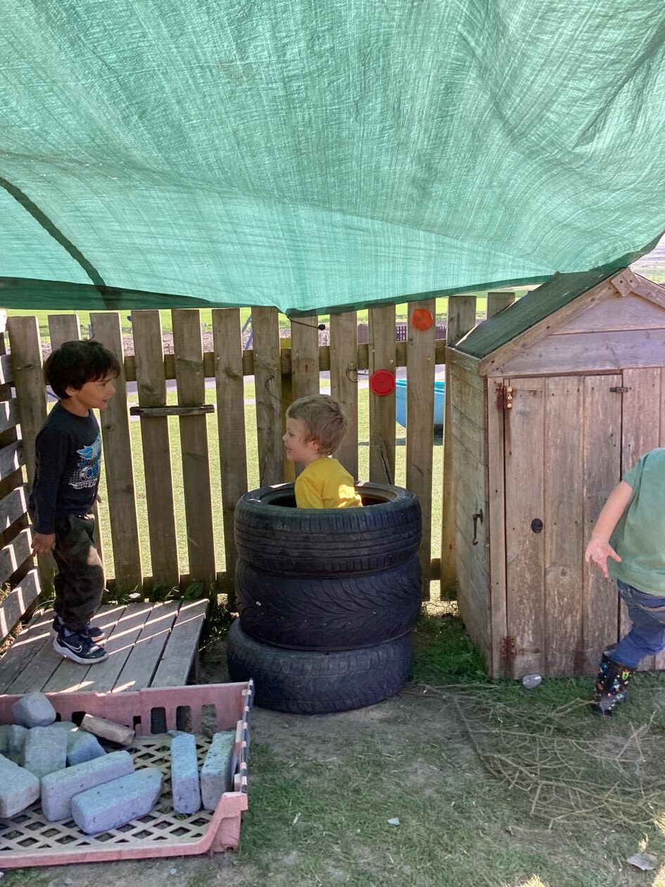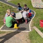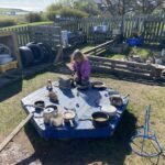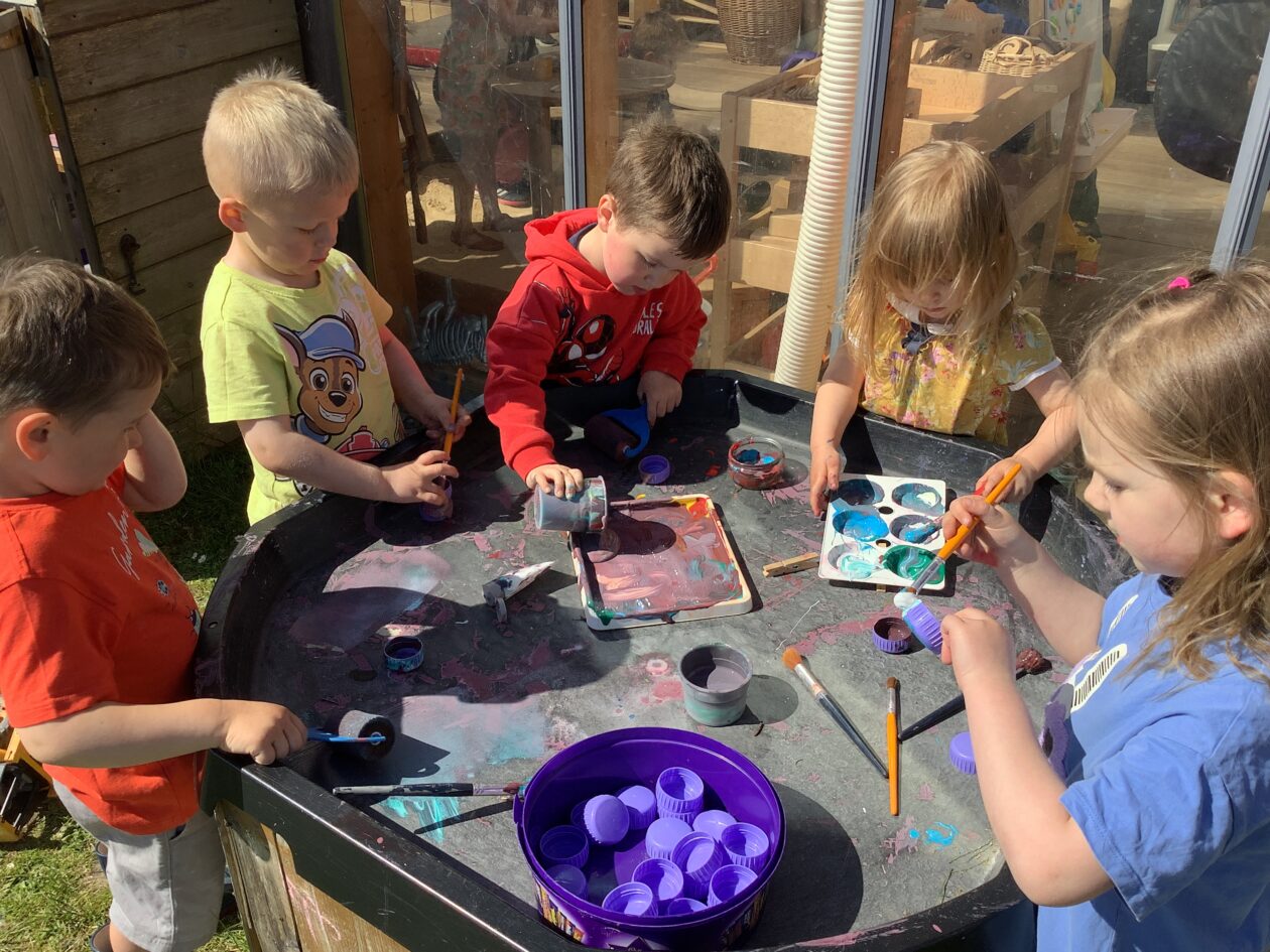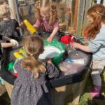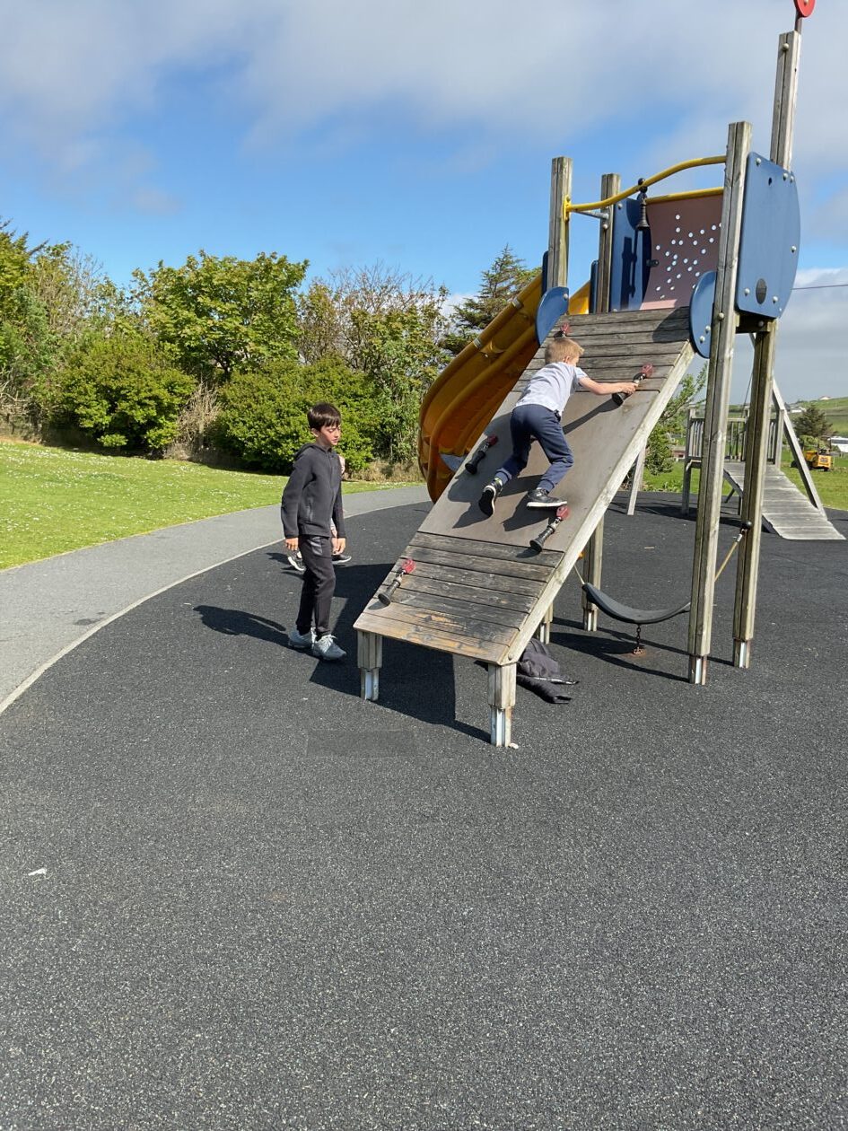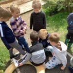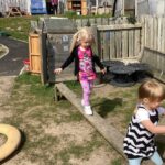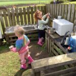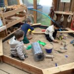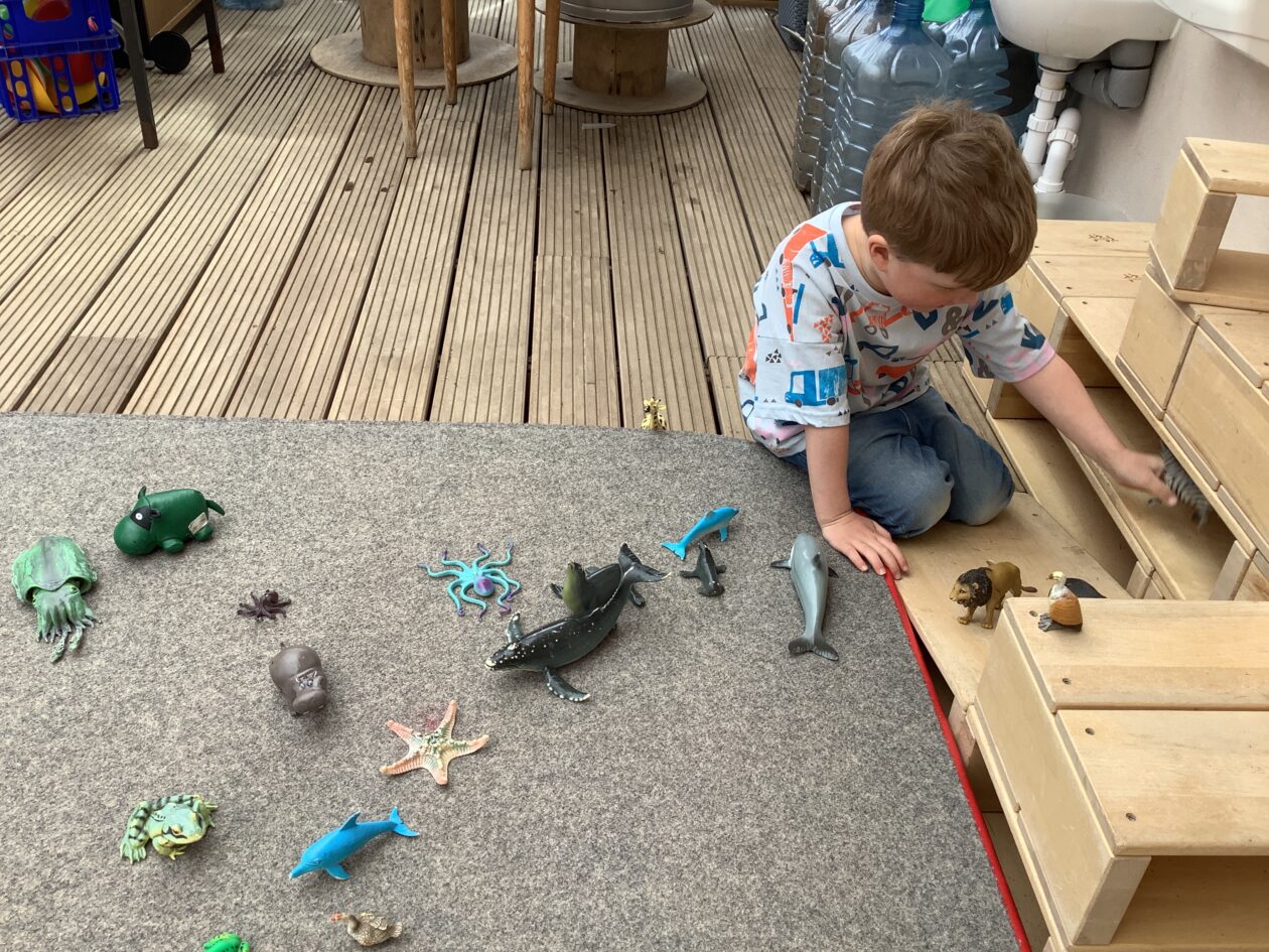 The bairns have been experimenting with different ways to slide down the steep hill in the garden. They have used cardboard, cushions, carpet tiles and slithery breeks! We have also seen lots of engagement with water play and managed to get the solar fountain working as the sun made a bit of a reappearance. We headed to the playpark one afternoon too and the bairns played chasing games, spun on the swings, tried to walk up the slide and got wobbly as jelly on a plate.