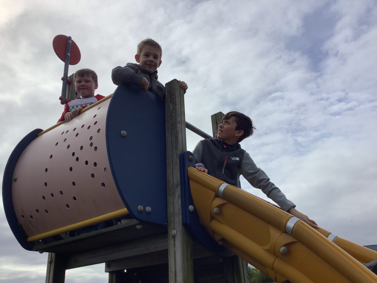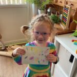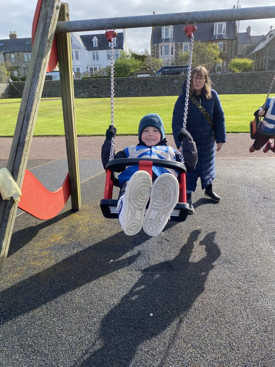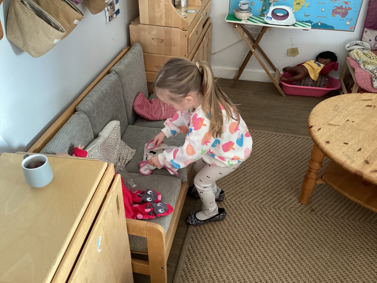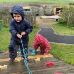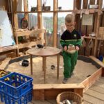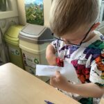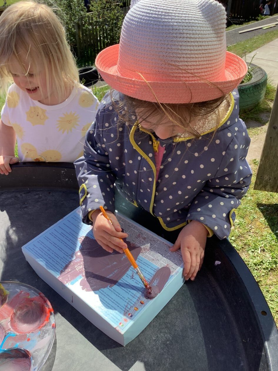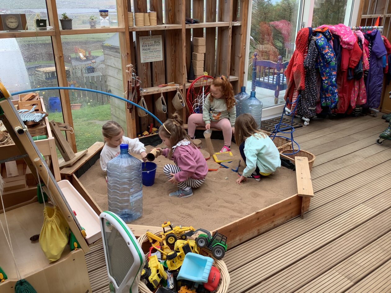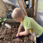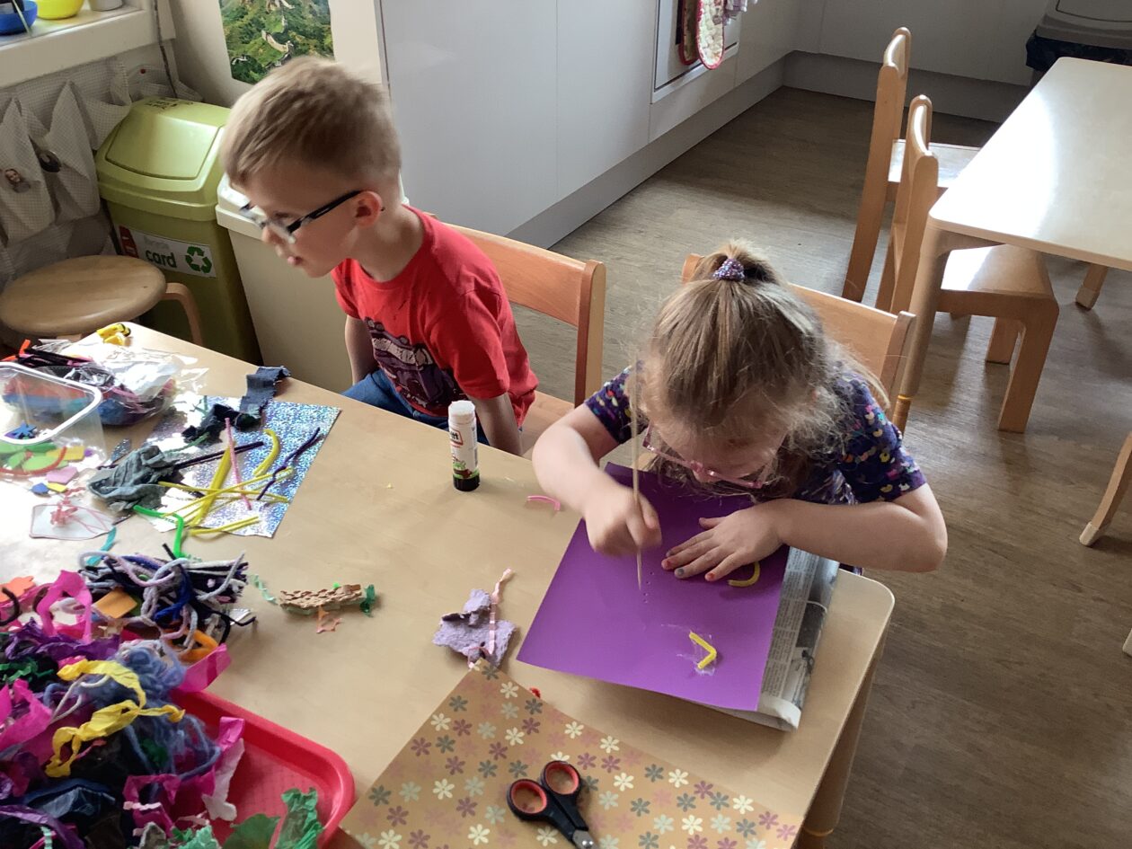 The bairns have been experimenting with different ways to slide down the steep hill in the garden. They have used cardboard, cushions, carpet tiles and slithery breeks! We have also seen lots of engagement with water play and managed to get the solar fountain working as the sun made a bit of a reappearance. We headed to the playpark one afternoon too and the bairns played chasing games, spun on the swings, tried to walk up the slide and got wobbly as jelly on a plate.