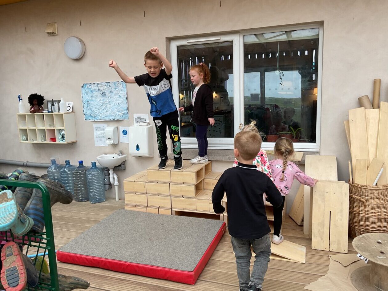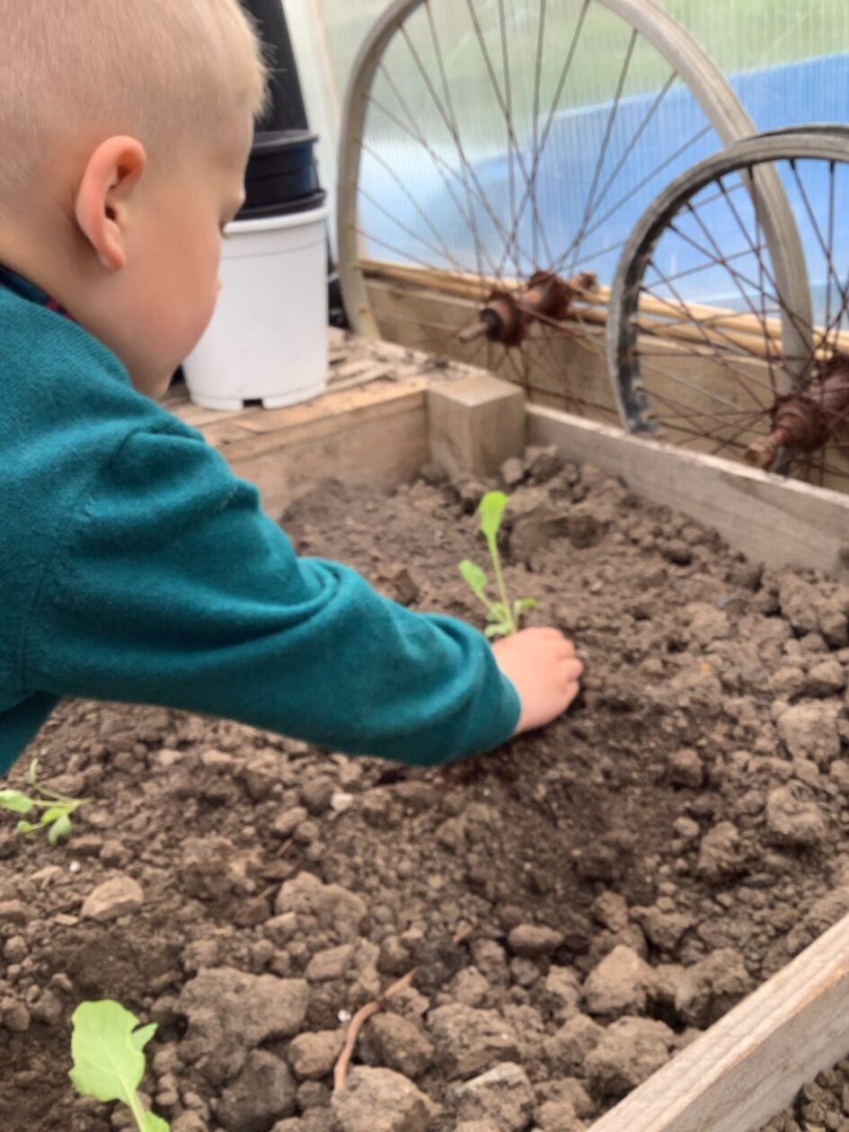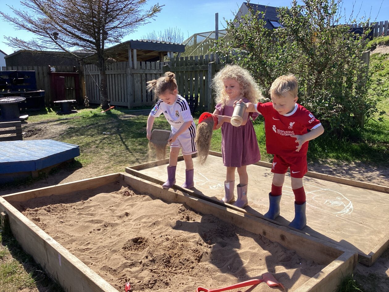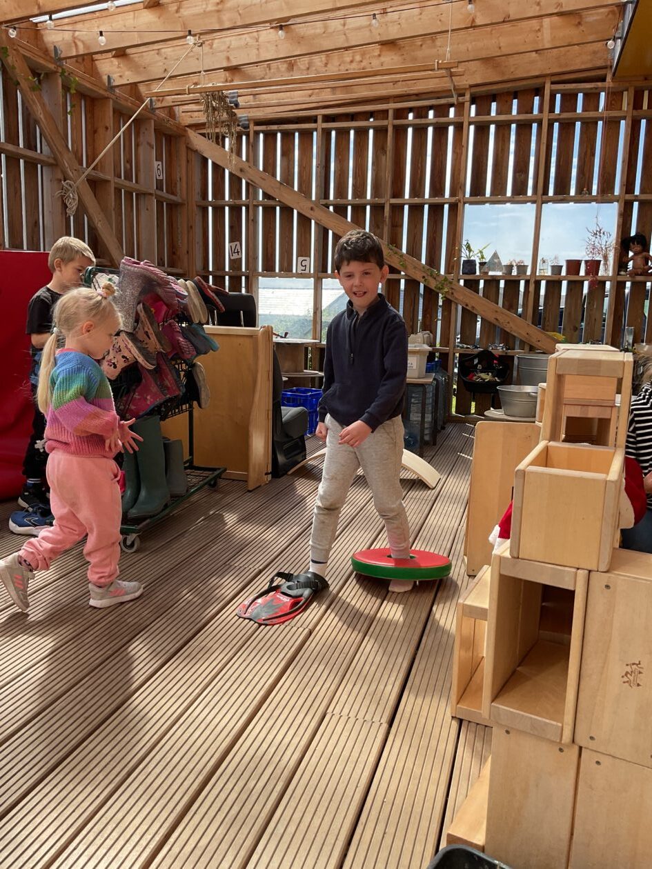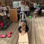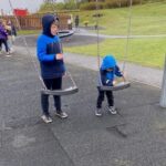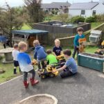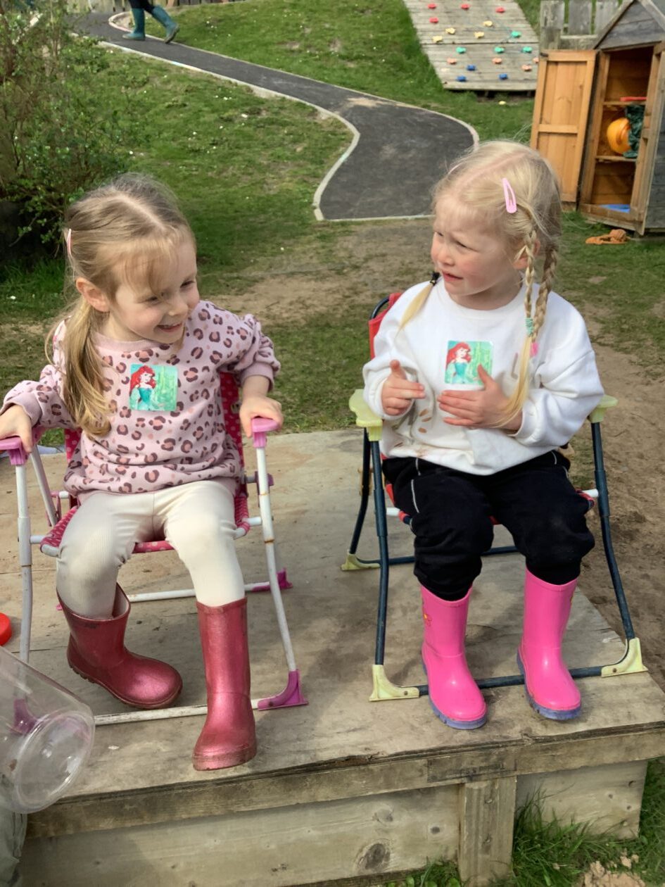 The bairns have been experimenting with different ways to slide down the steep hill in the garden. They have used cardboard, cushions, carpet tiles and slithery breeks! We have also seen lots of engagement with water play and managed to get the solar fountain working as the sun made a bit of a reappearance. We headed to the playpark one afternoon too and the bairns played chasing games, spun on the swings, tried to walk up the slide and got wobbly as jelly on a plate.