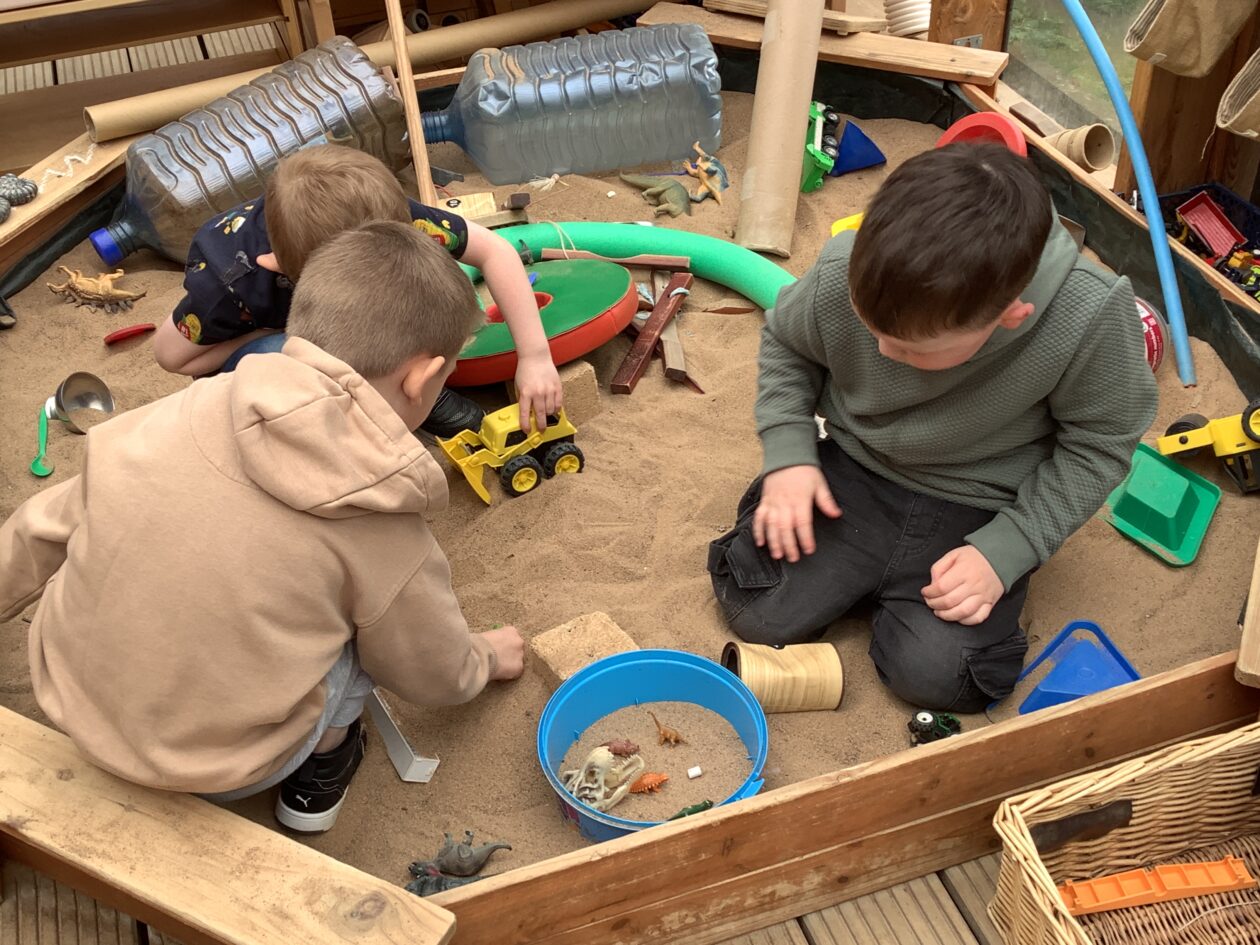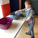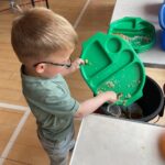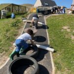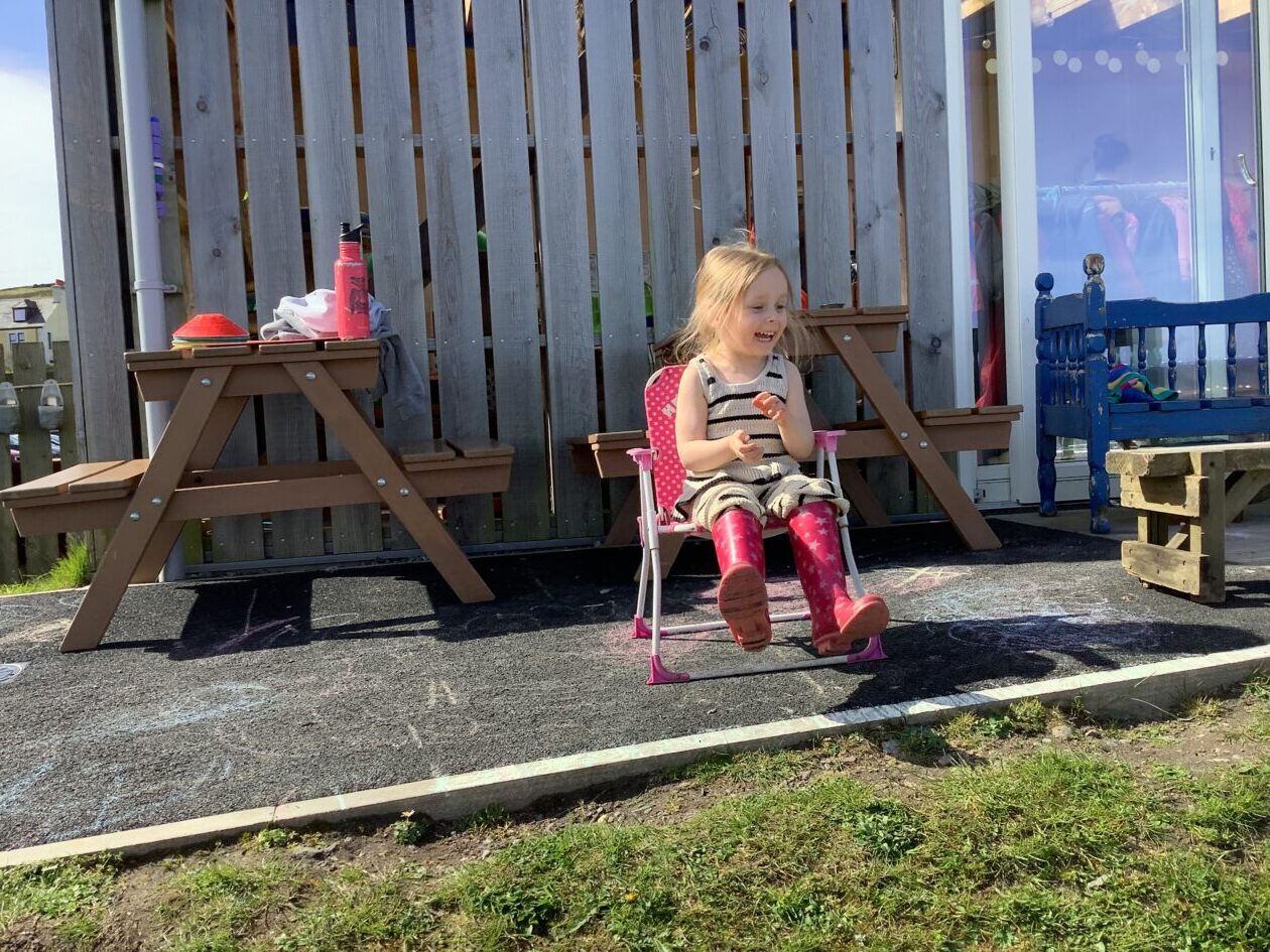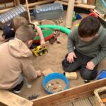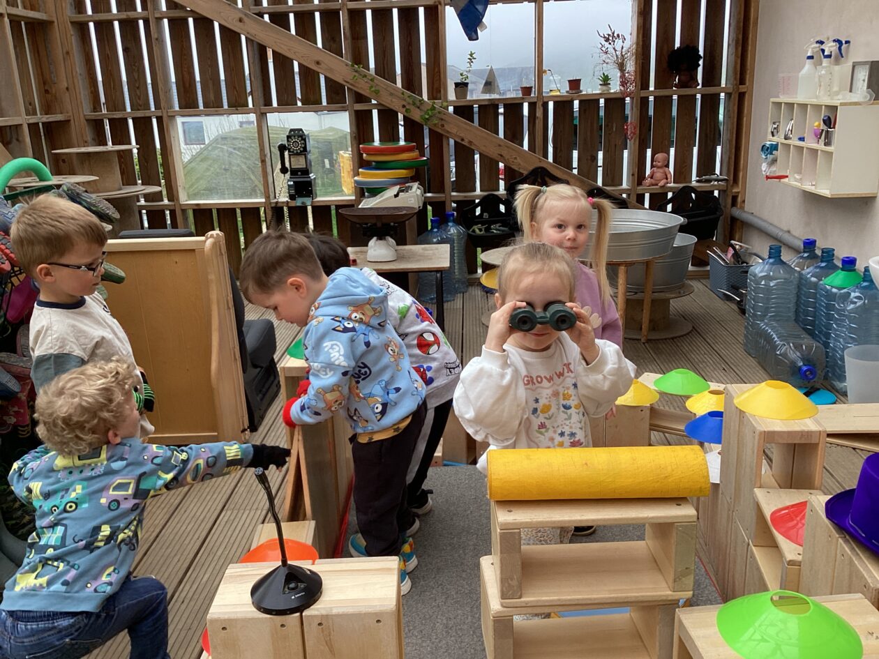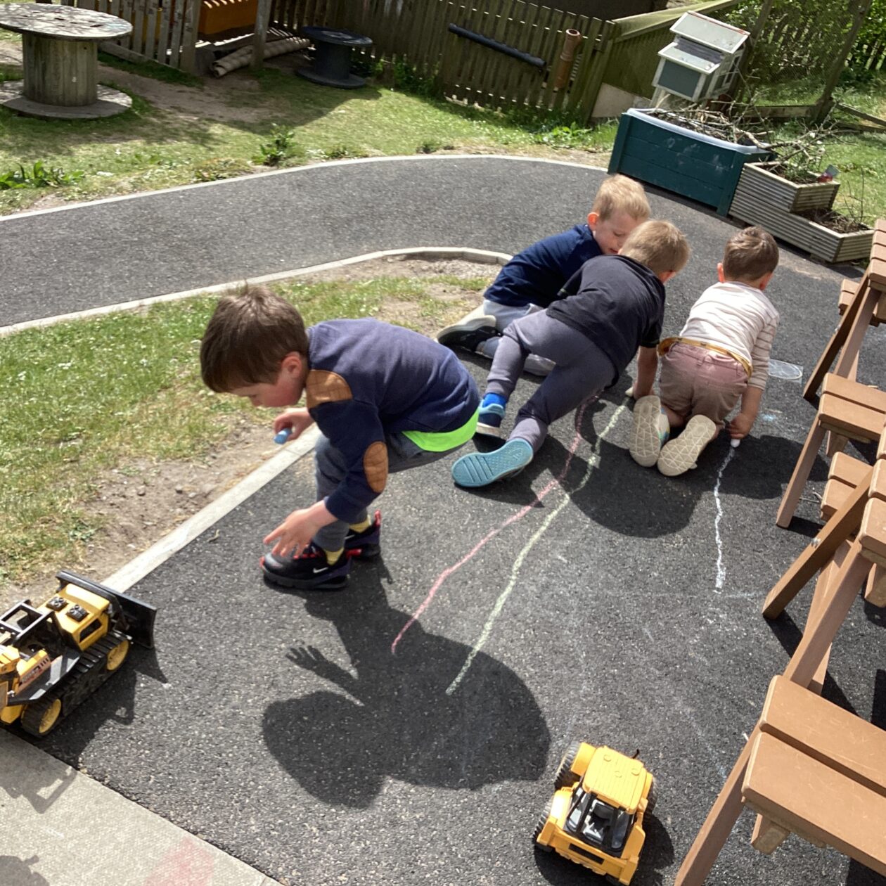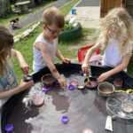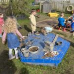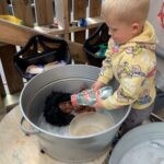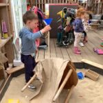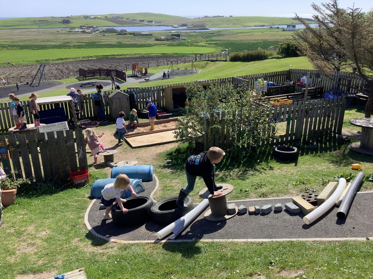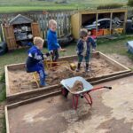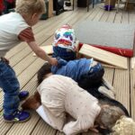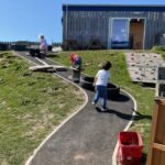 The bairns have been experimenting with different ways to slide down the steep hill in the garden. They have used cardboard, cushions, carpet tiles and slithery breeks! We have also seen lots of engagement with water play and managed to get the solar fountain working as the sun made a bit of a reappearance. We headed to the playpark one afternoon too and the bairns played chasing games, spun on the swings, tried to walk up the slide and got wobbly as jelly on a plate.