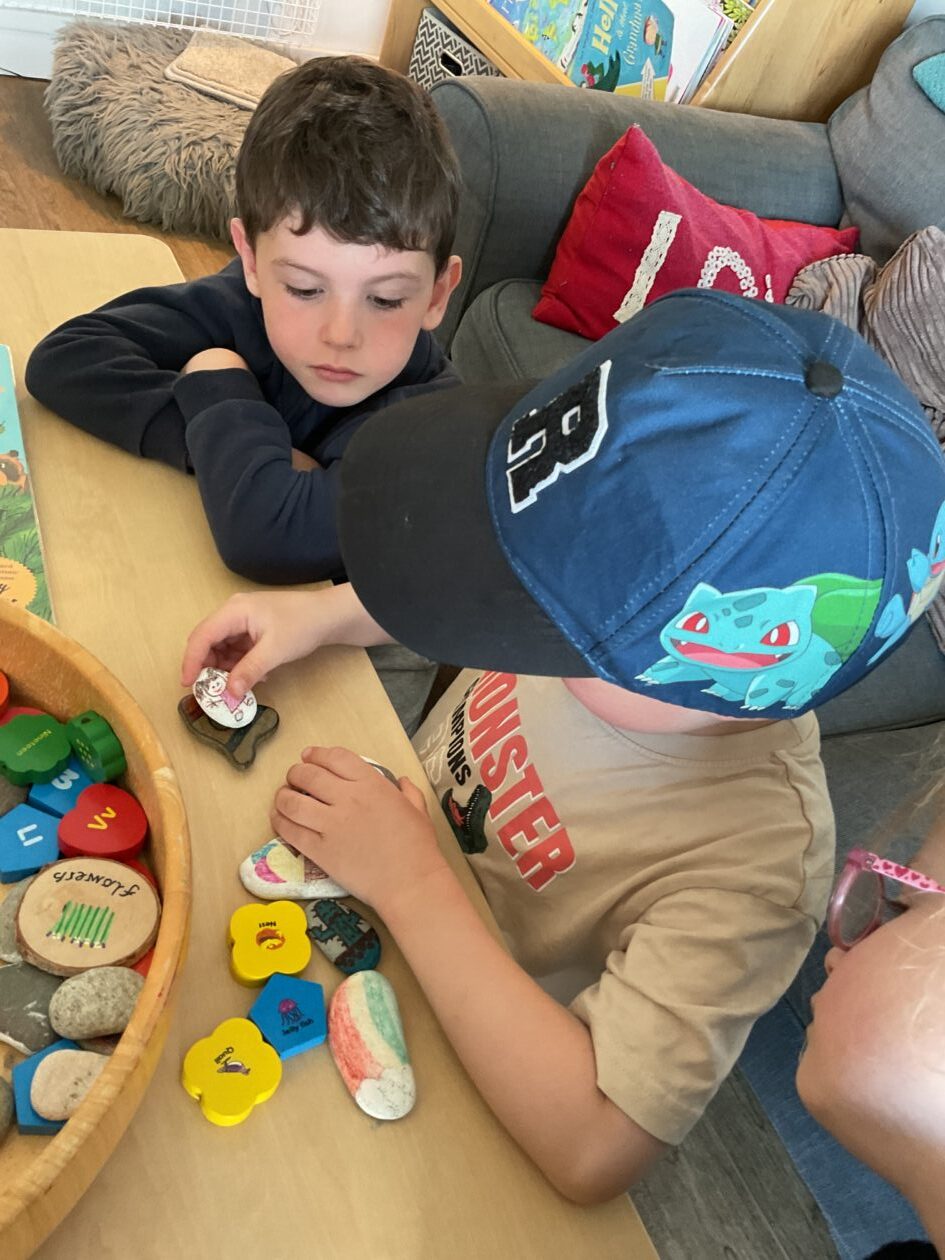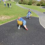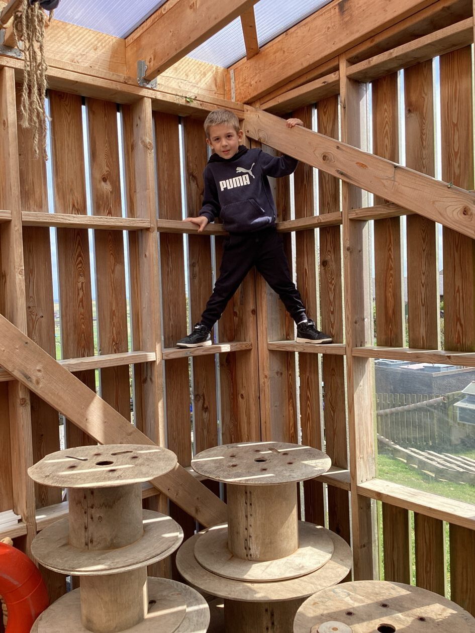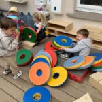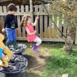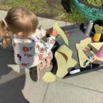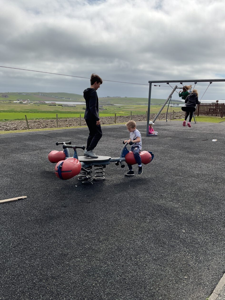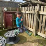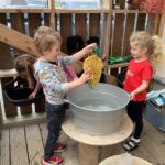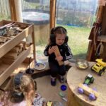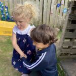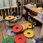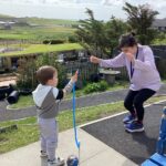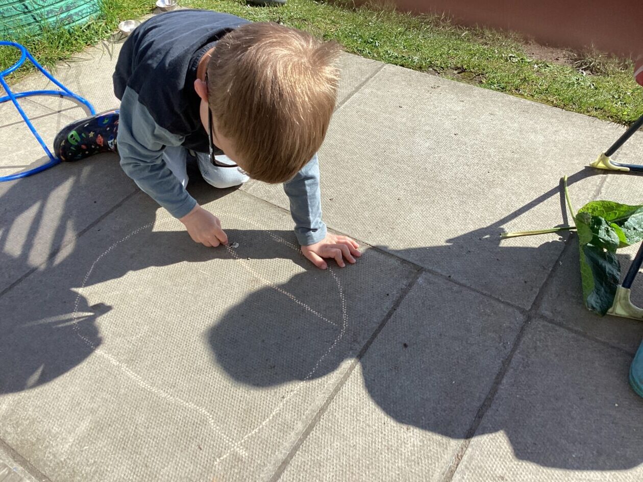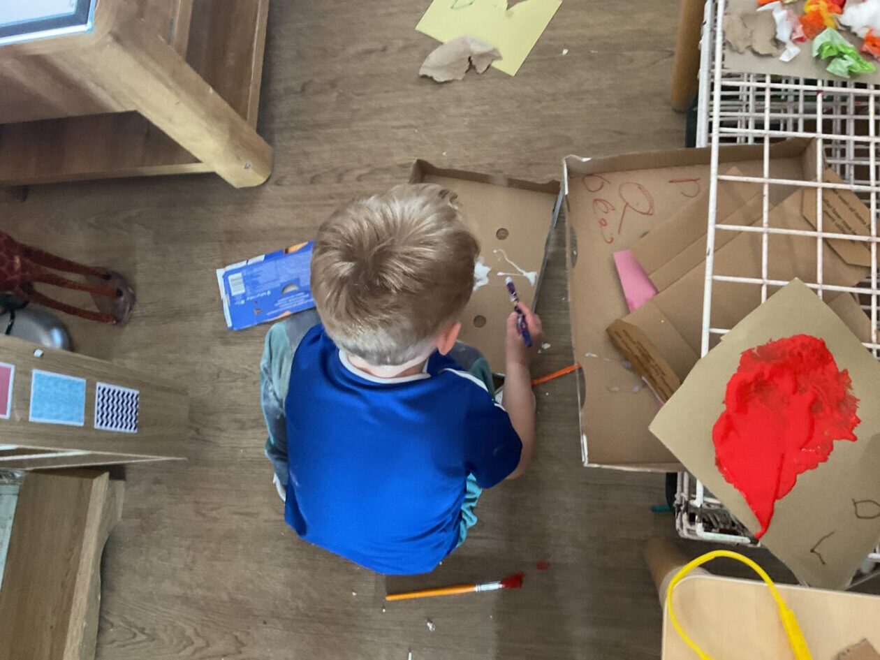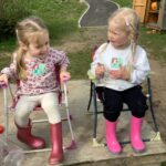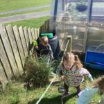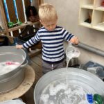 The bairns have been experimenting with different ways to slide down the steep hill in the garden. They have used cardboard, cushions, carpet tiles and slithery breeks! We have also seen lots of engagement with water play and managed to get the solar fountain working as the sun made a bit of a reappearance. We headed to the playpark one afternoon too and the bairns played chasing games, spun on the swings, tried to walk up the slide and got wobbly as jelly on a plate.
