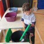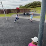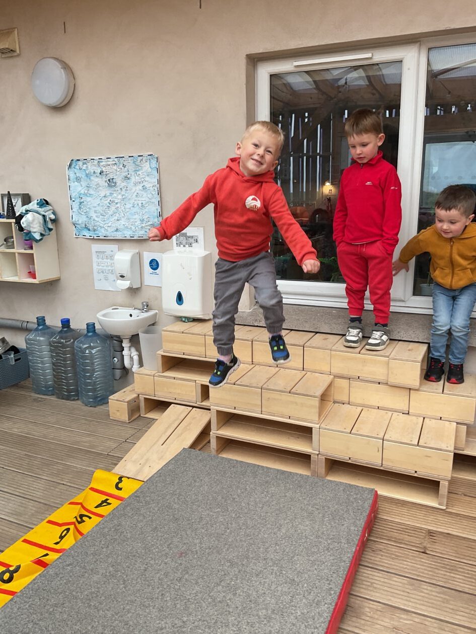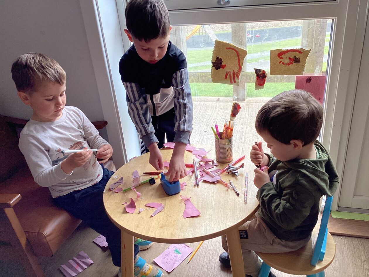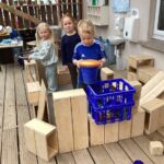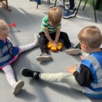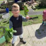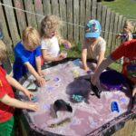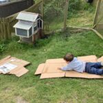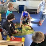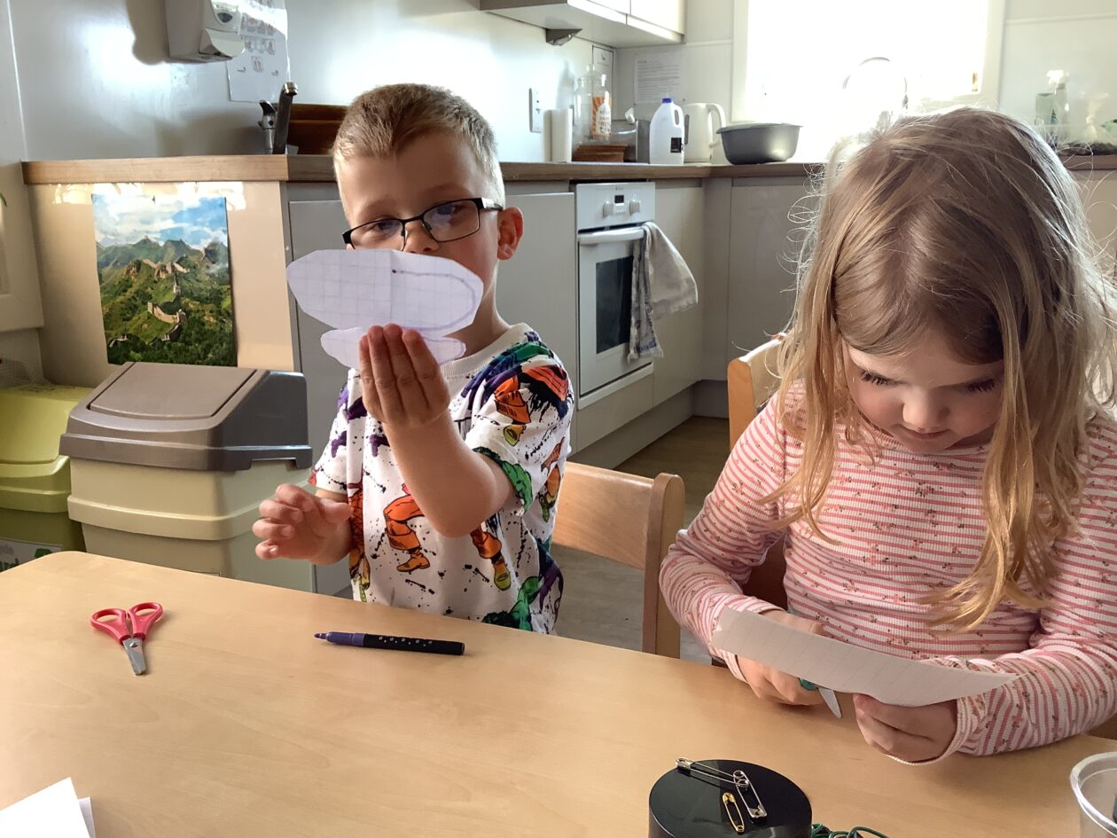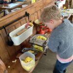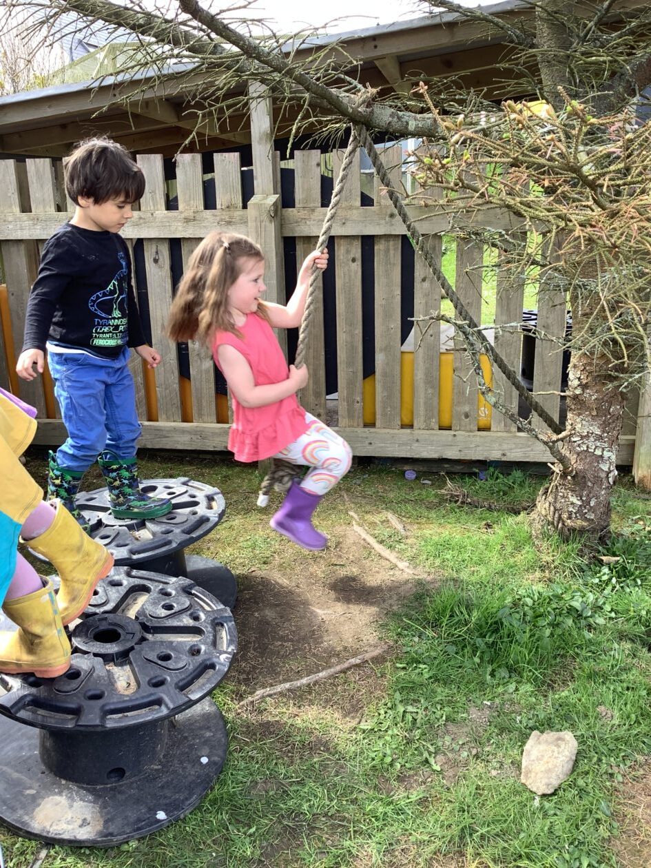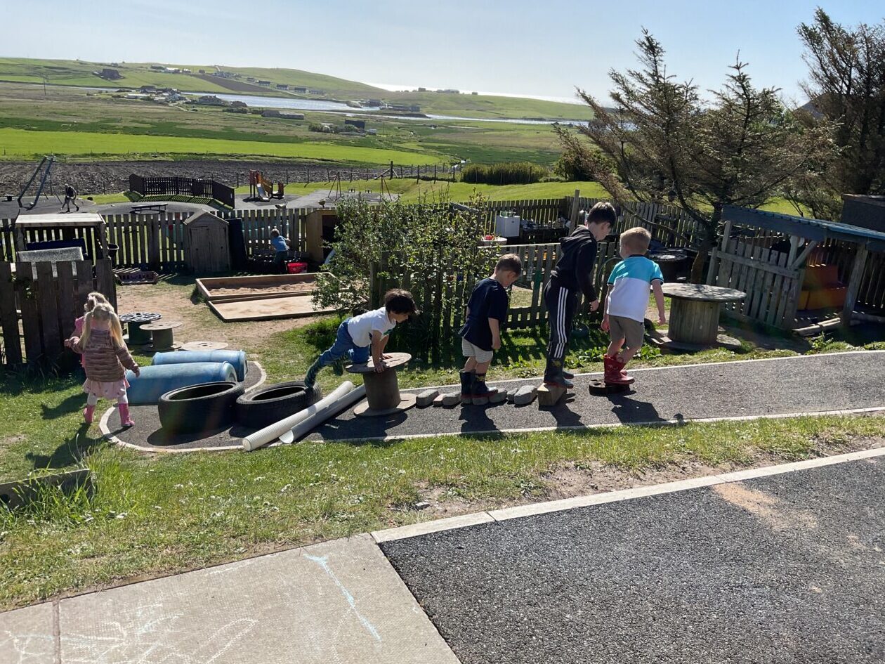 The bairns have been experimenting with different ways to slide down the steep hill in the garden. They have used cardboard, cushions, carpet tiles and slithery breeks! We have also seen lots of engagement with water play and managed to get the solar fountain working as the sun made a bit of a reappearance. We headed to the playpark one afternoon too and the bairns played chasing games, spun on the swings, tried to walk up the slide and got wobbly as jelly on a plate.