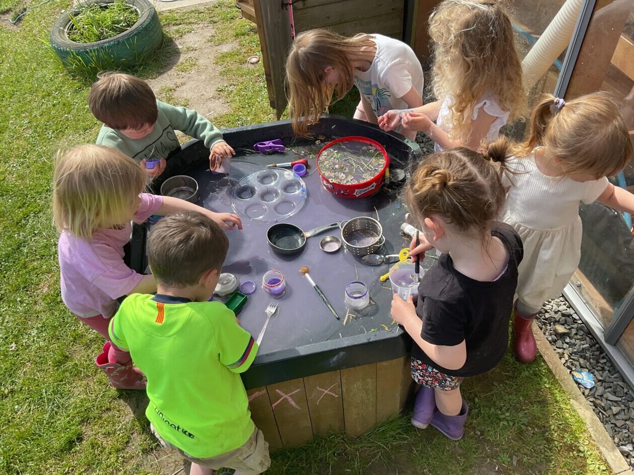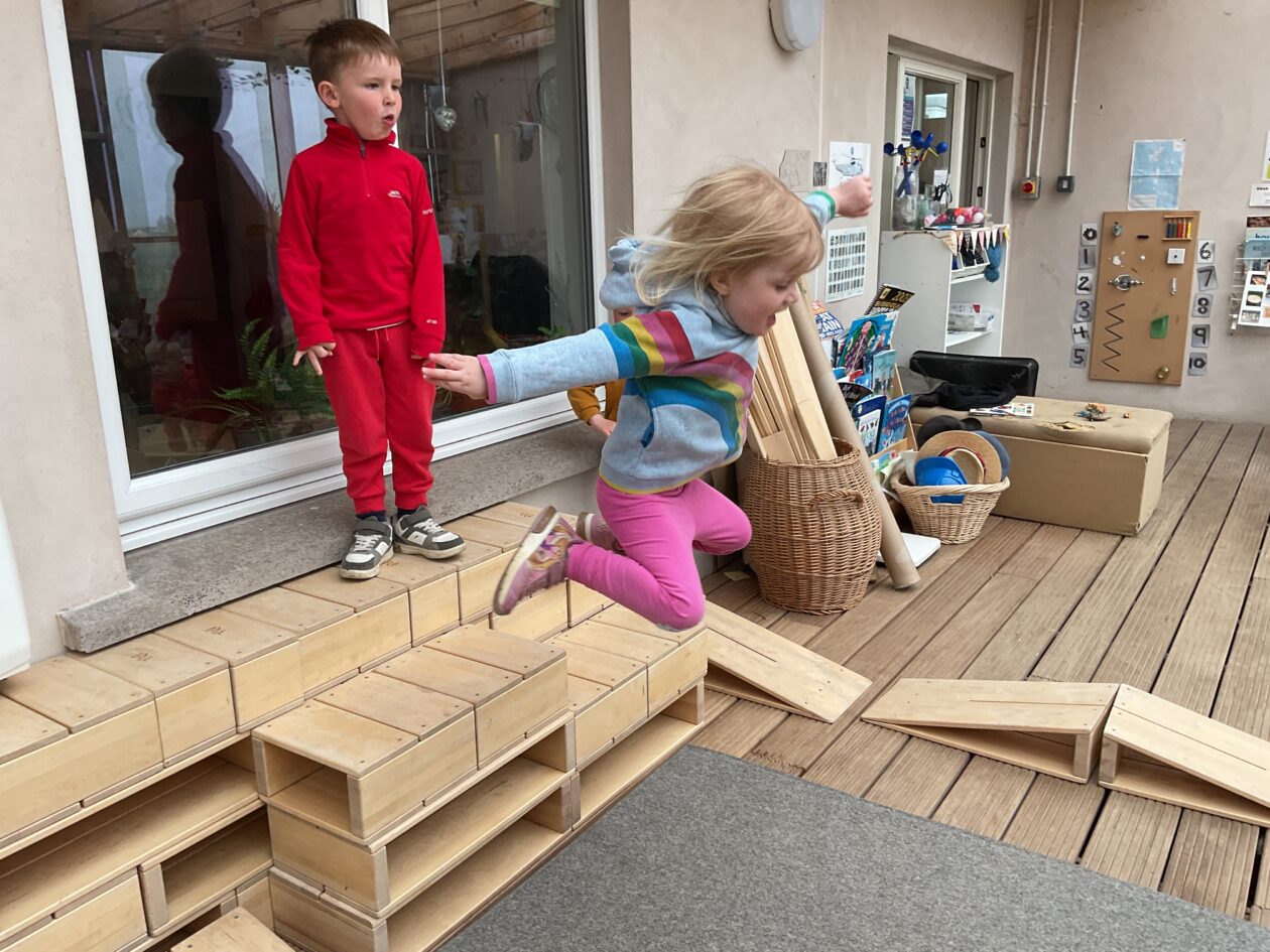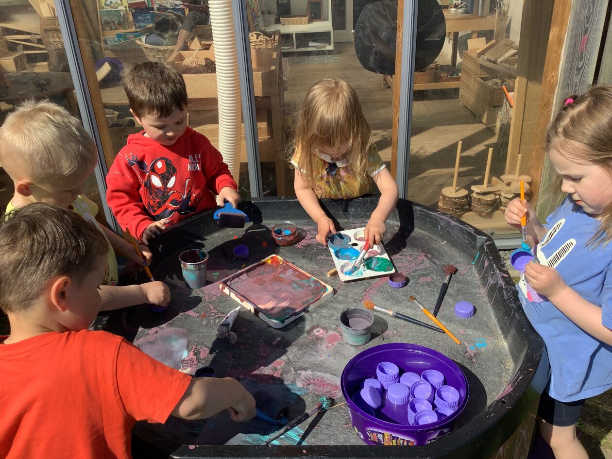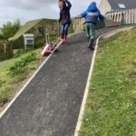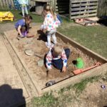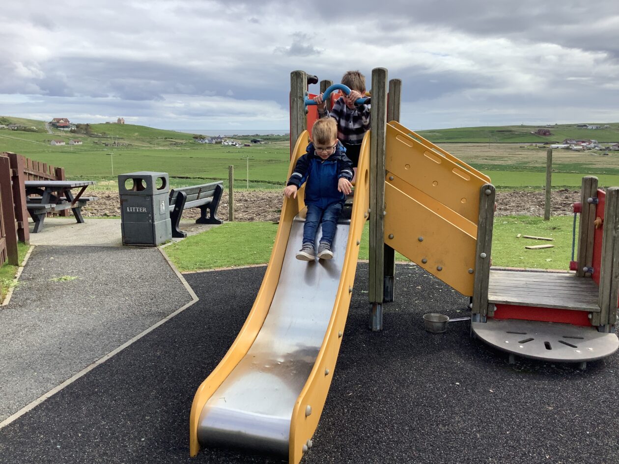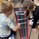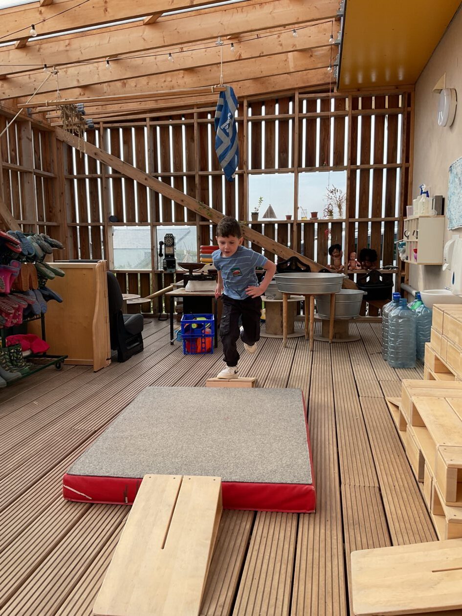 The bairns have been experimenting with different ways to slide down the steep hill in the garden. They have used cardboard, cushions, carpet tiles and slithery breeks! We have also seen lots of engagement with water play and managed to get the solar fountain working as the sun made a bit of a reappearance. We headed to the playpark one afternoon too and the bairns played chasing games, spun on the swings, tried to walk up the slide and got wobbly as jelly on a plate.